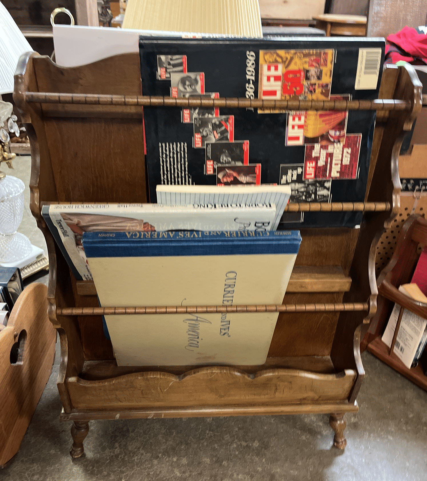 174 Wood magazine rack 29x22x11" with book assortment