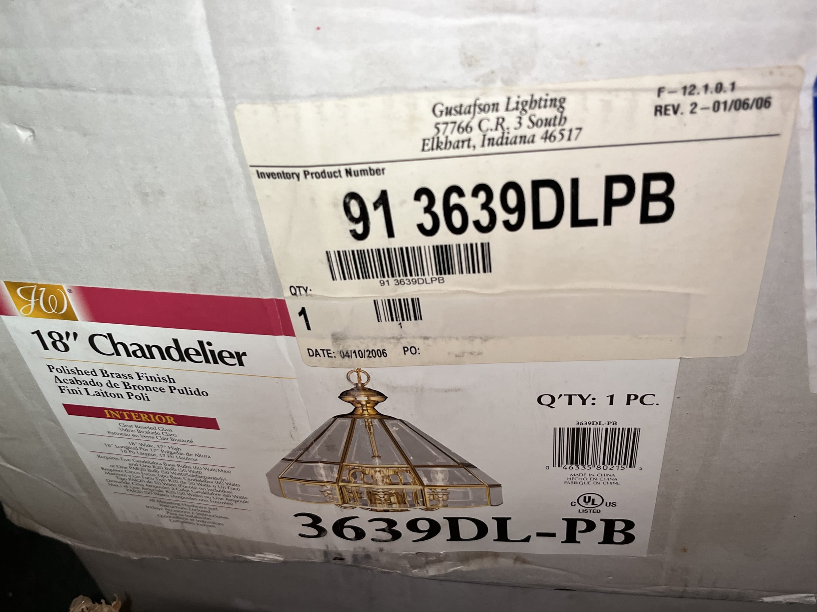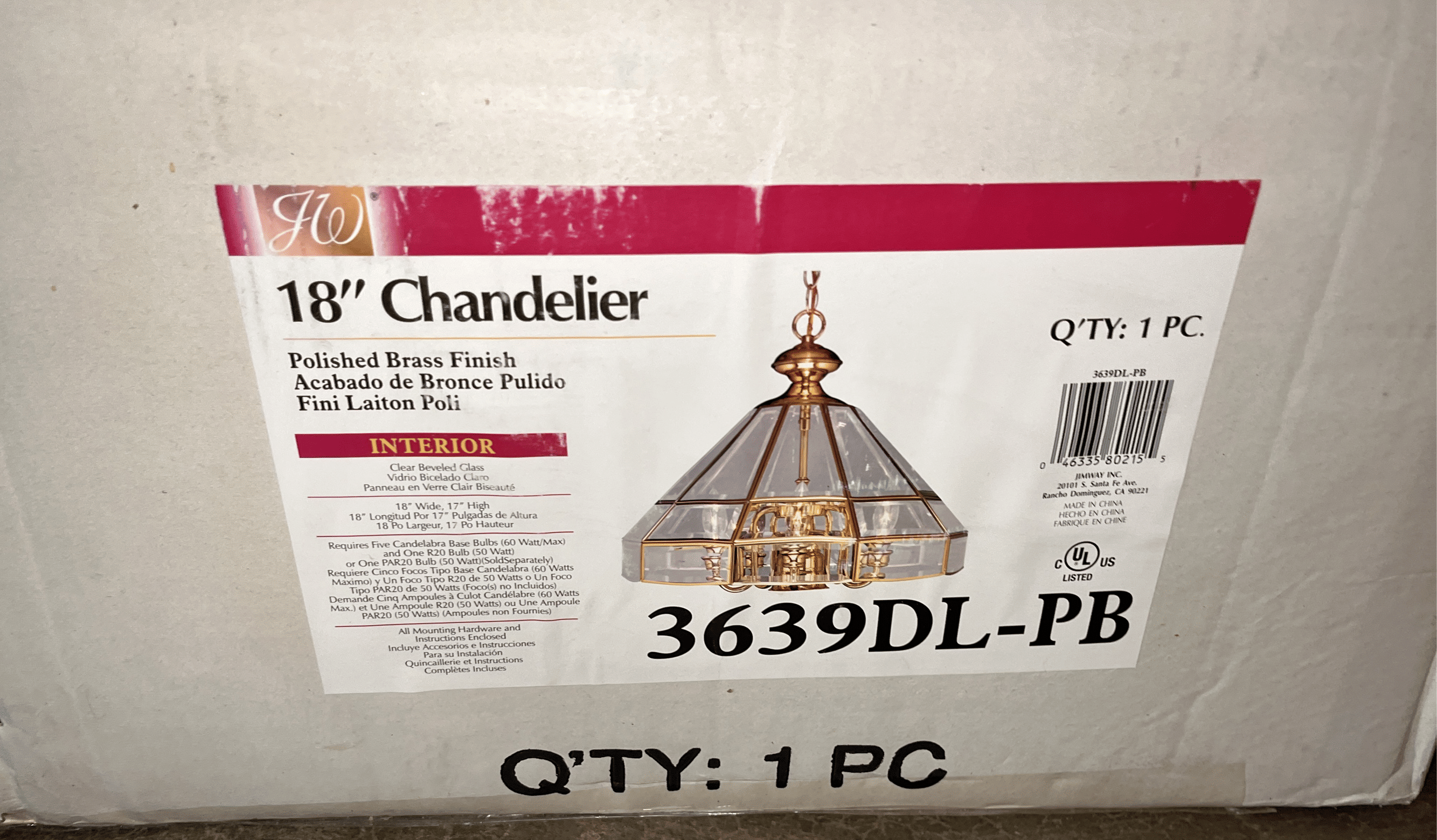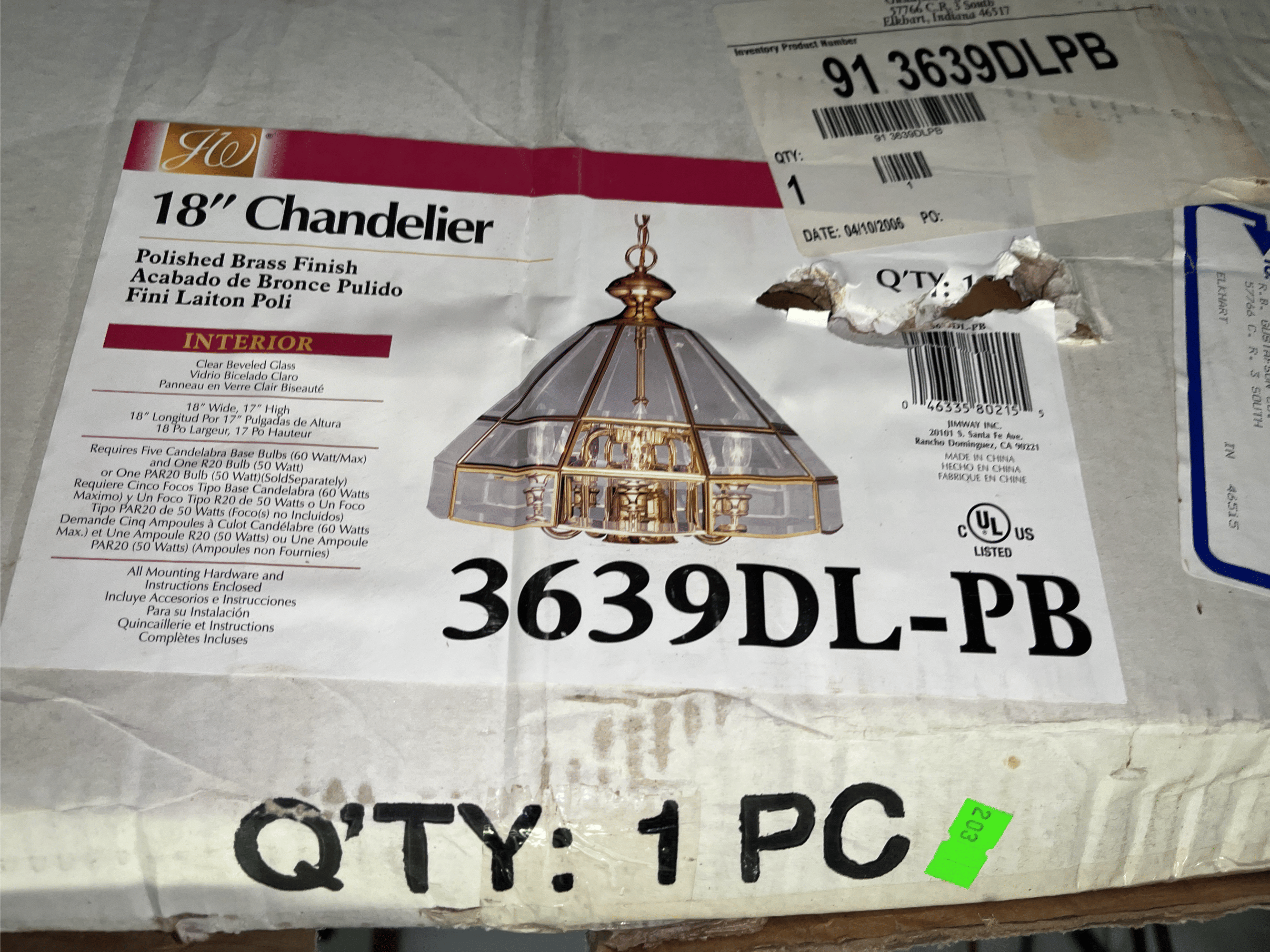 188 Polished brass hanging light fixture 3639DL-PL 18" (box is damaged, missing chain)