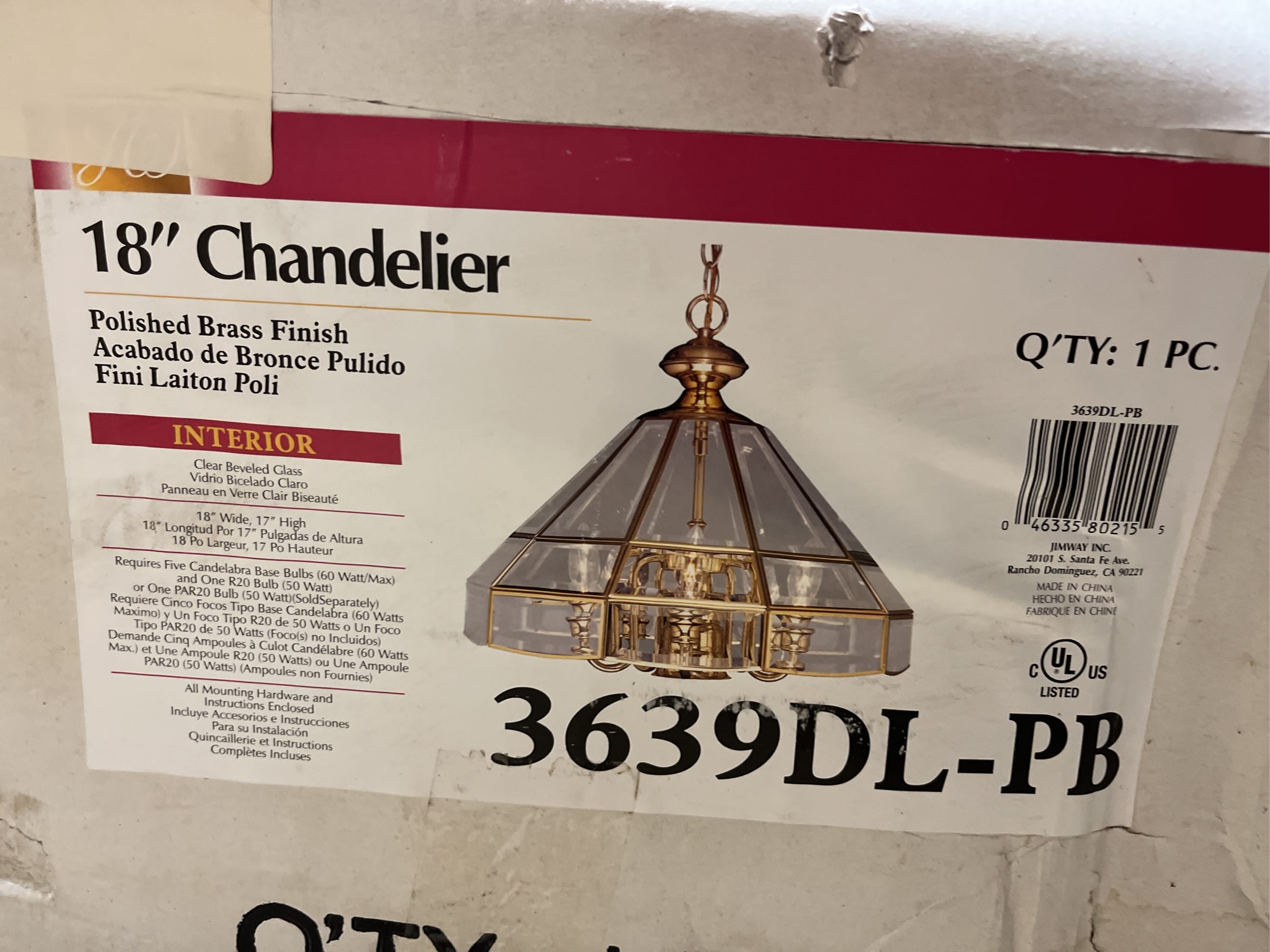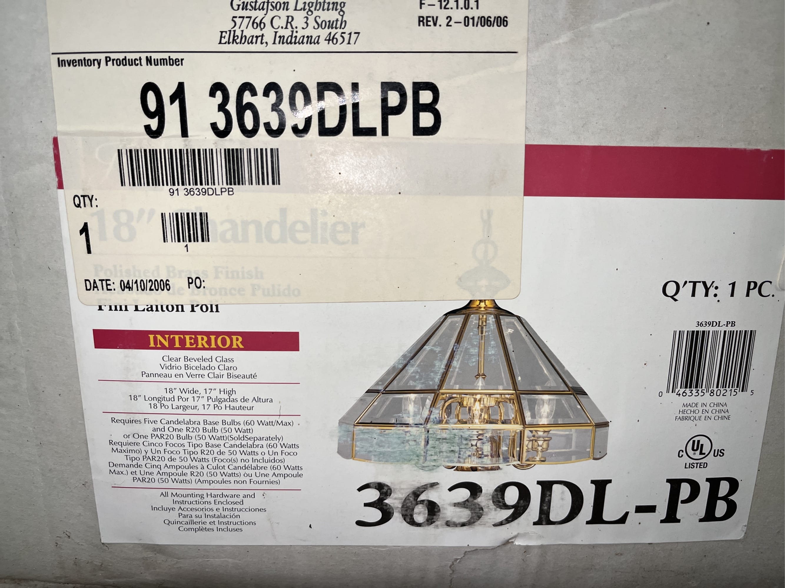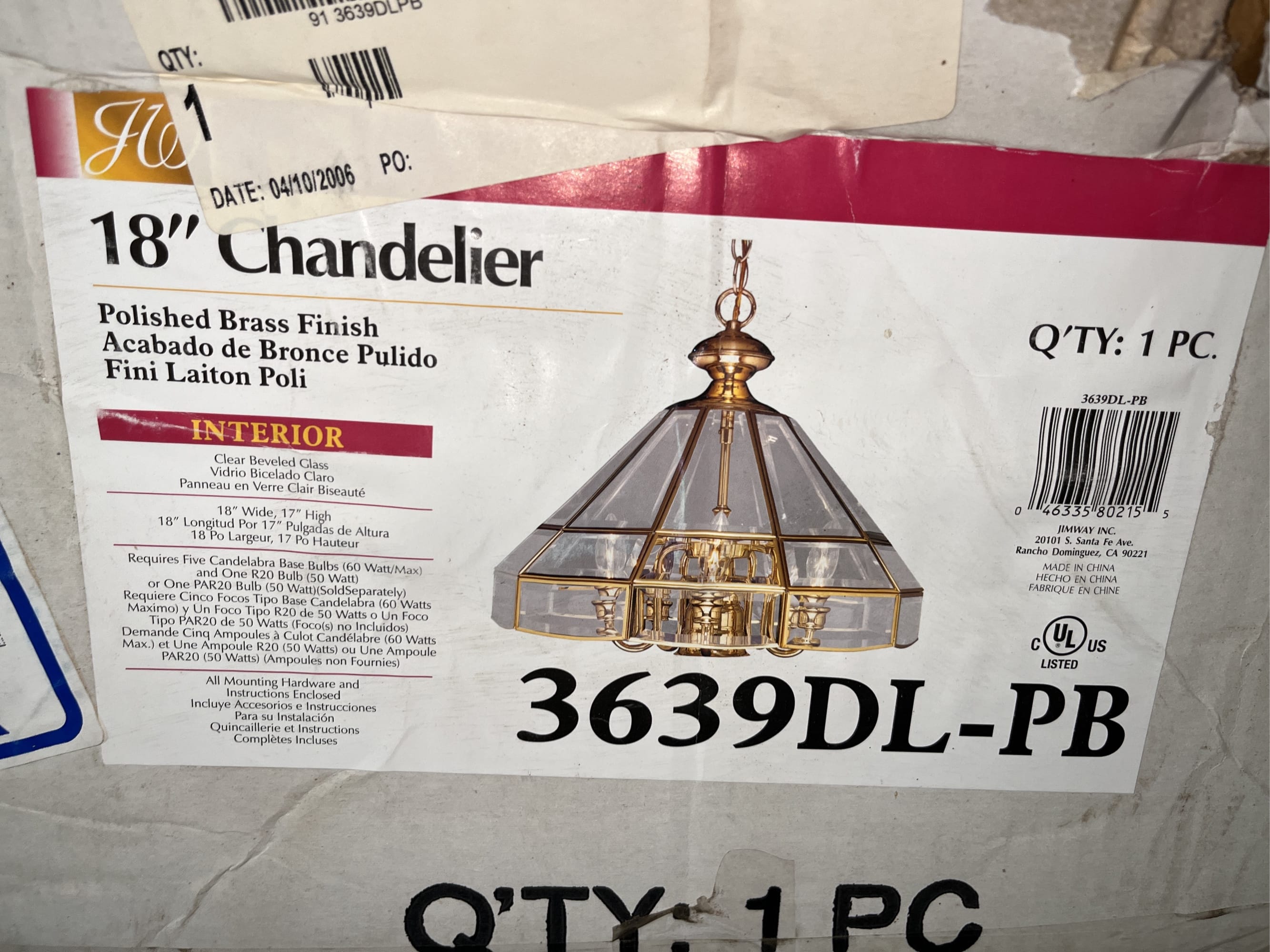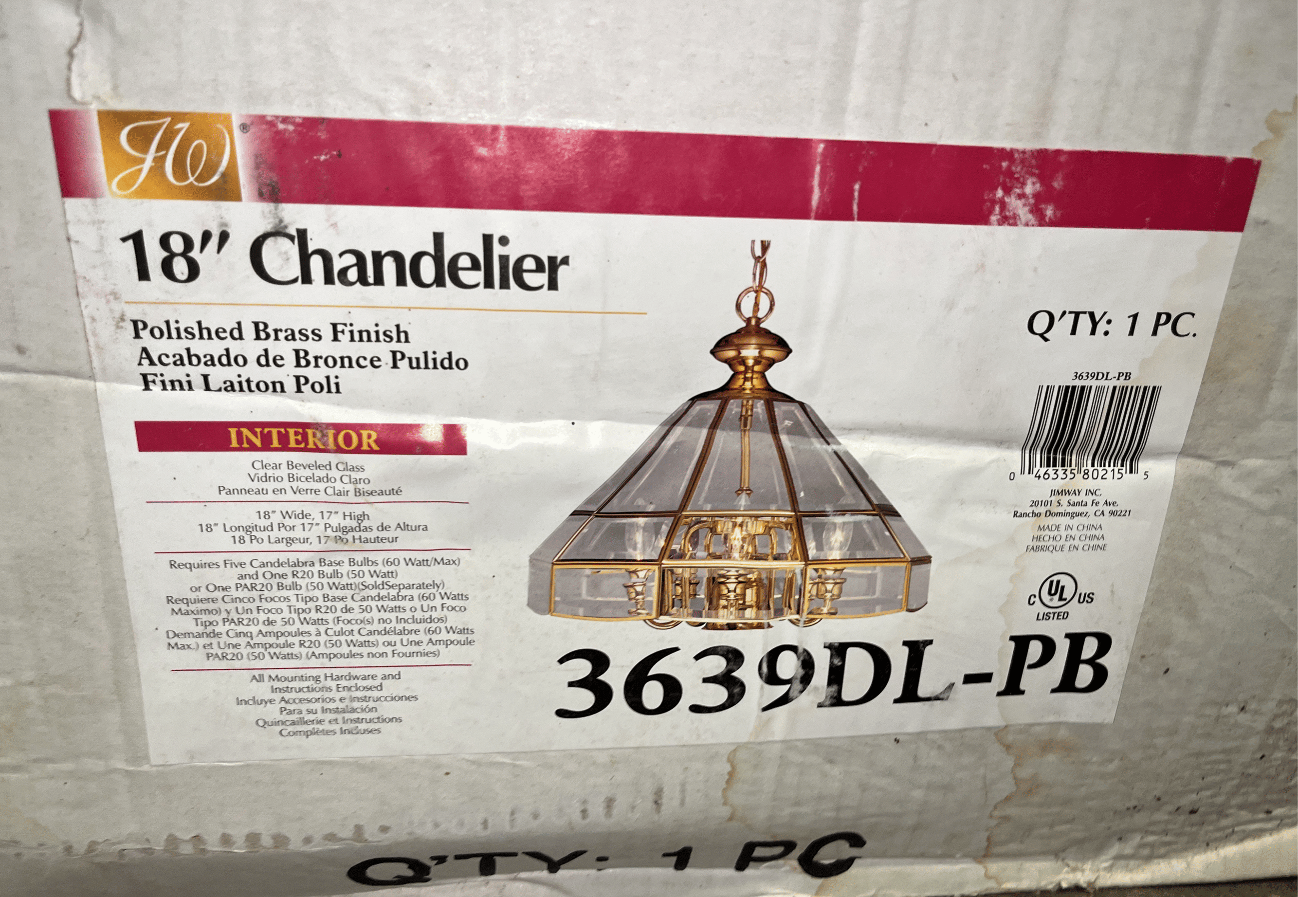 188 Polished brass hanging light fixture 3639DL-PL 18" (box is damaged, missing chain)