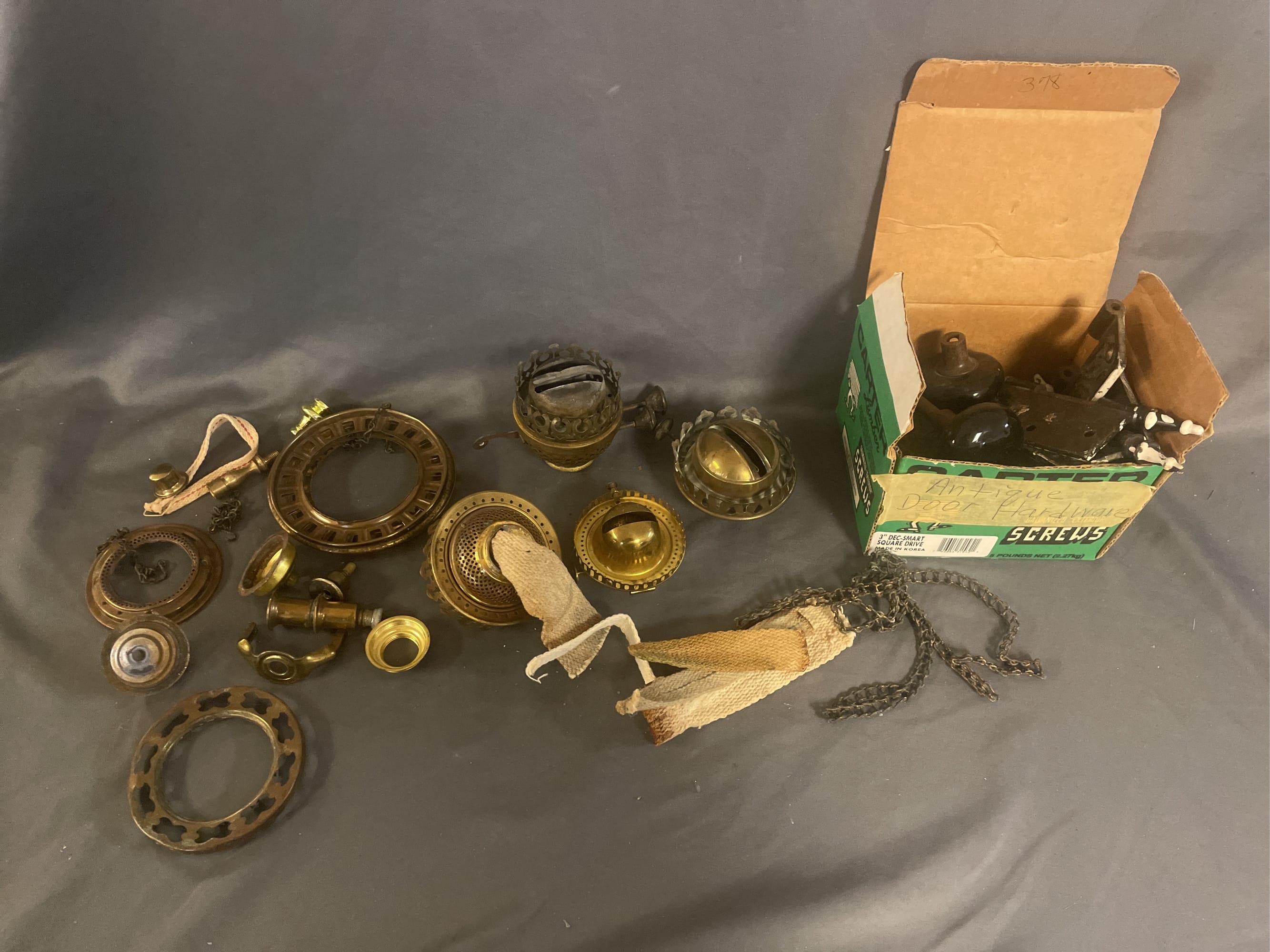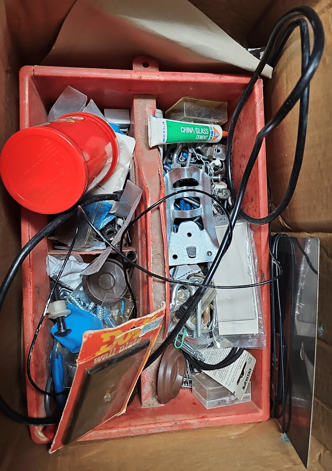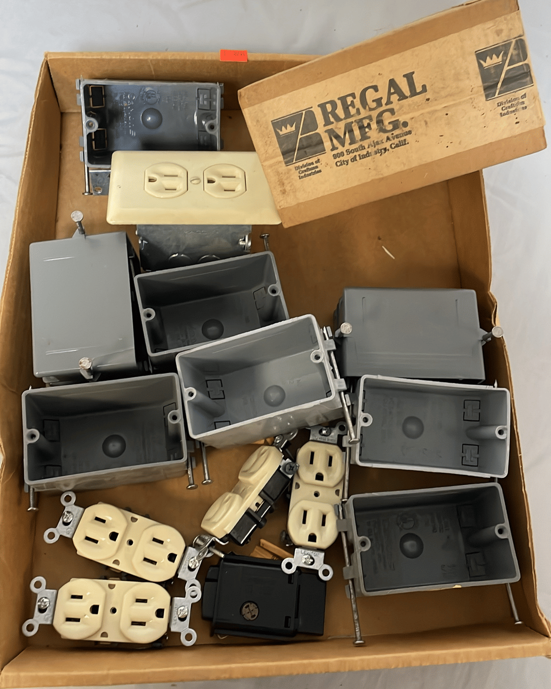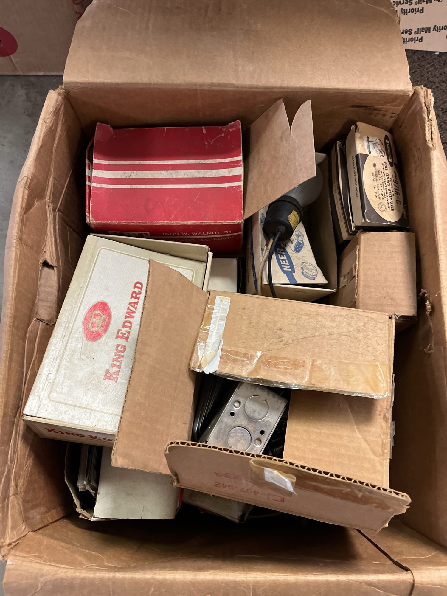 1713 King Edward Cigar Box, Raco Masonry Wall Box, Light Bulb, Leviton Porcelain Pull Ceiling Receptacle, Hinge Assortment, Etc.