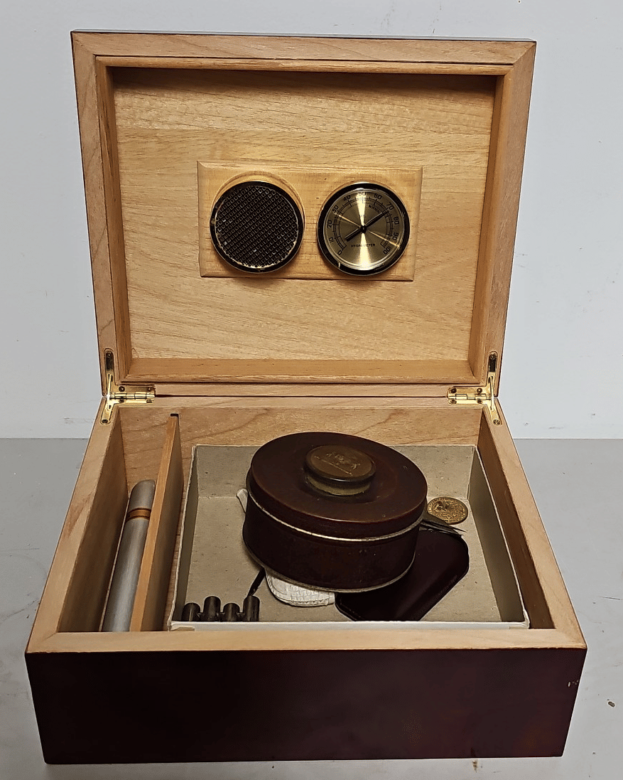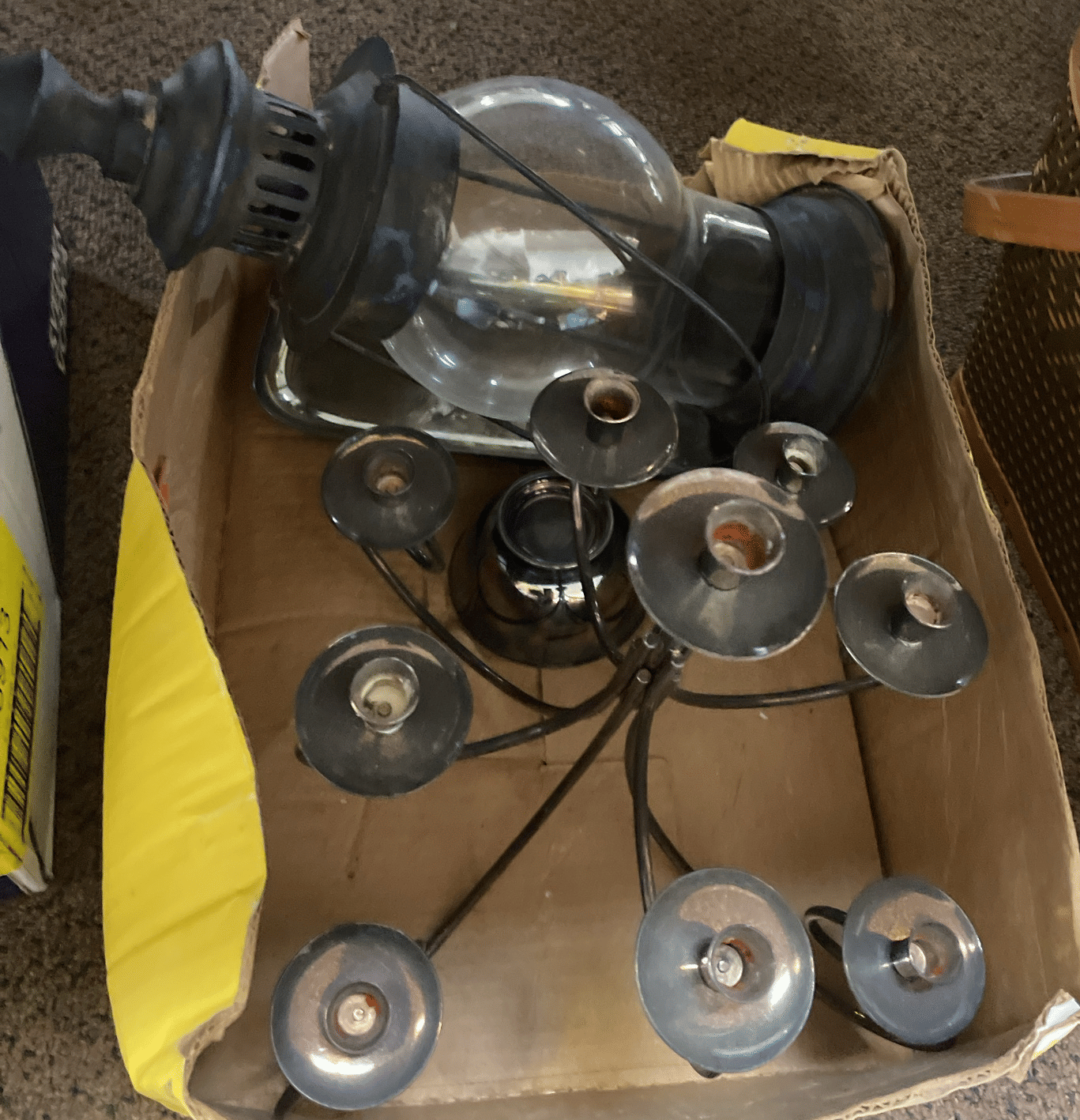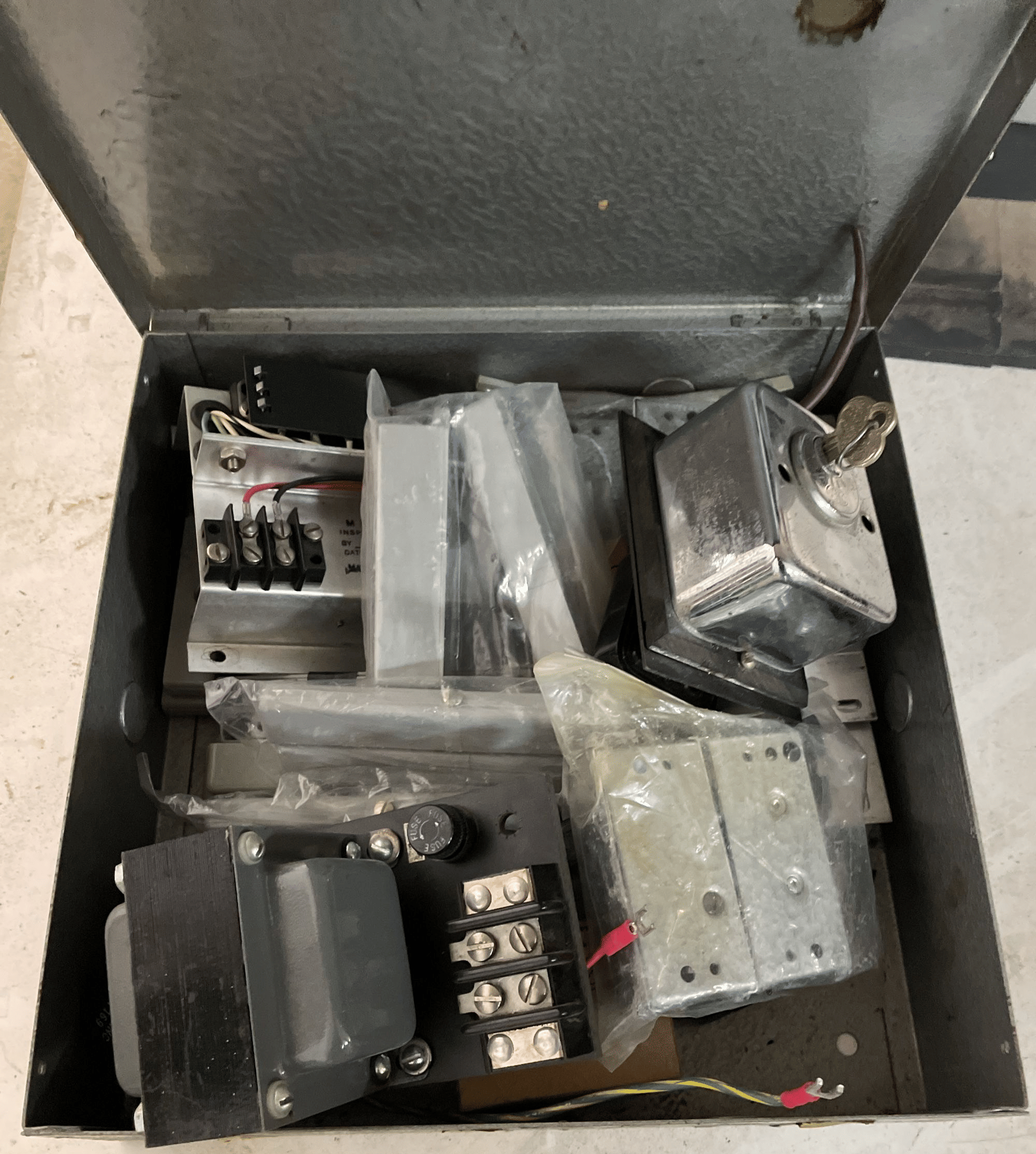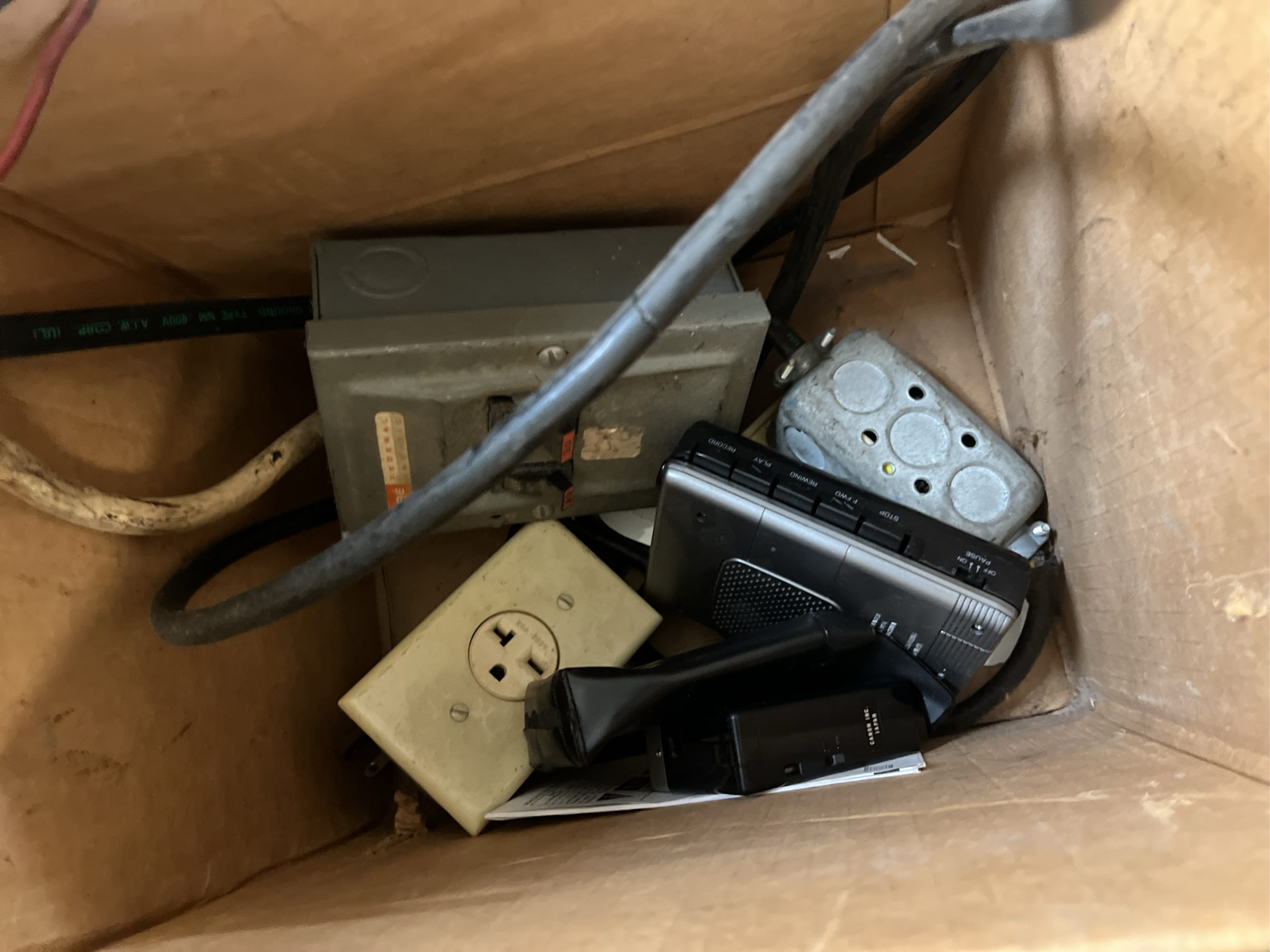 1713 King Edward Cigar Box, Raco Masonry Wall Box, Light Bulb, Leviton Porcelain Pull Ceiling Receptacle, Hinge Assortment, Etc.