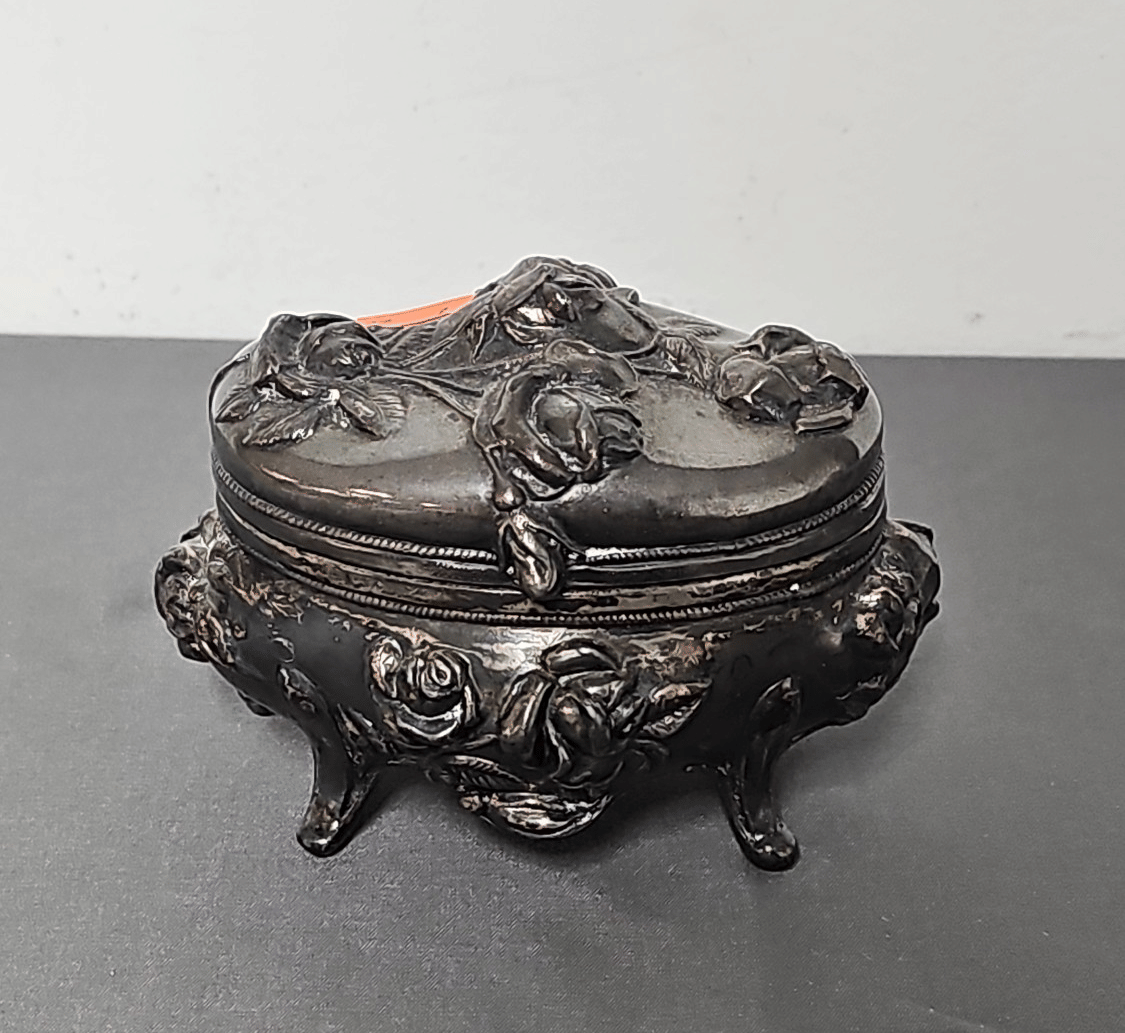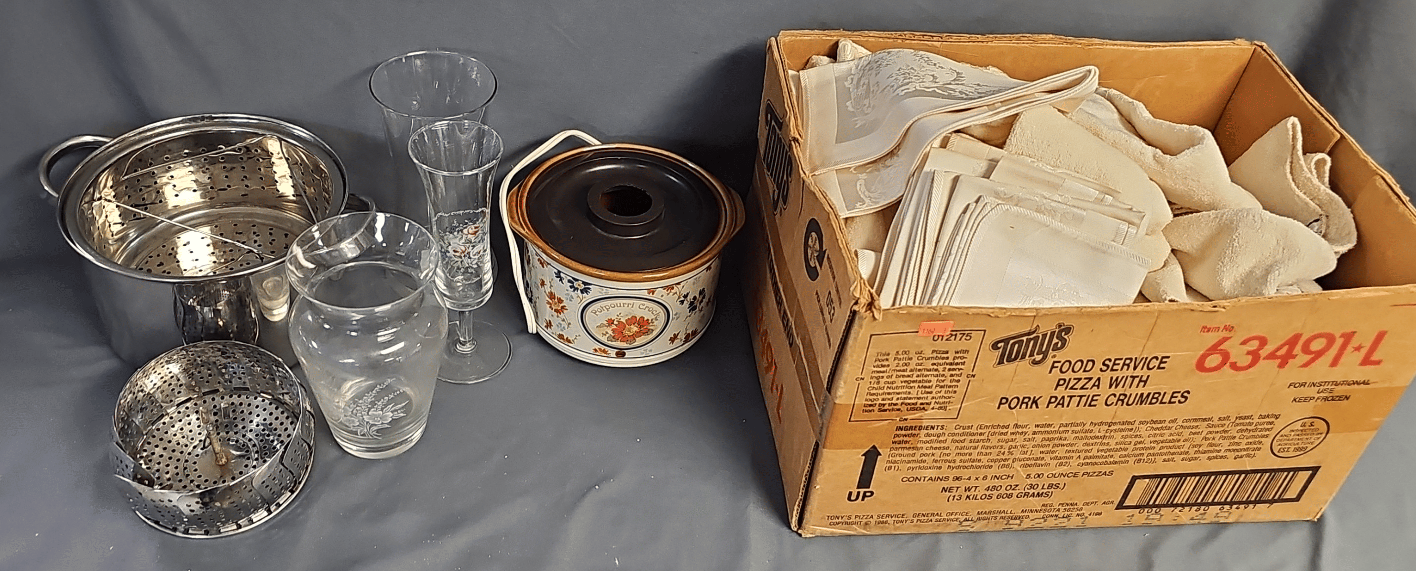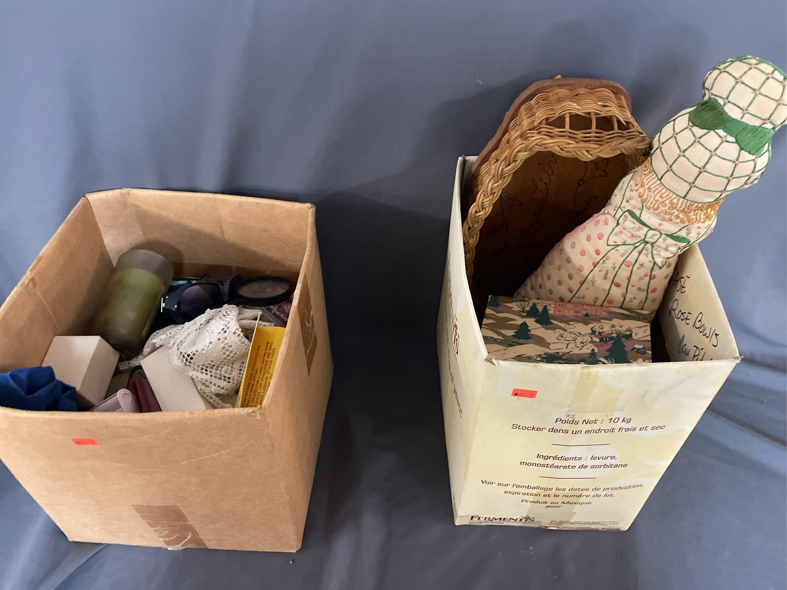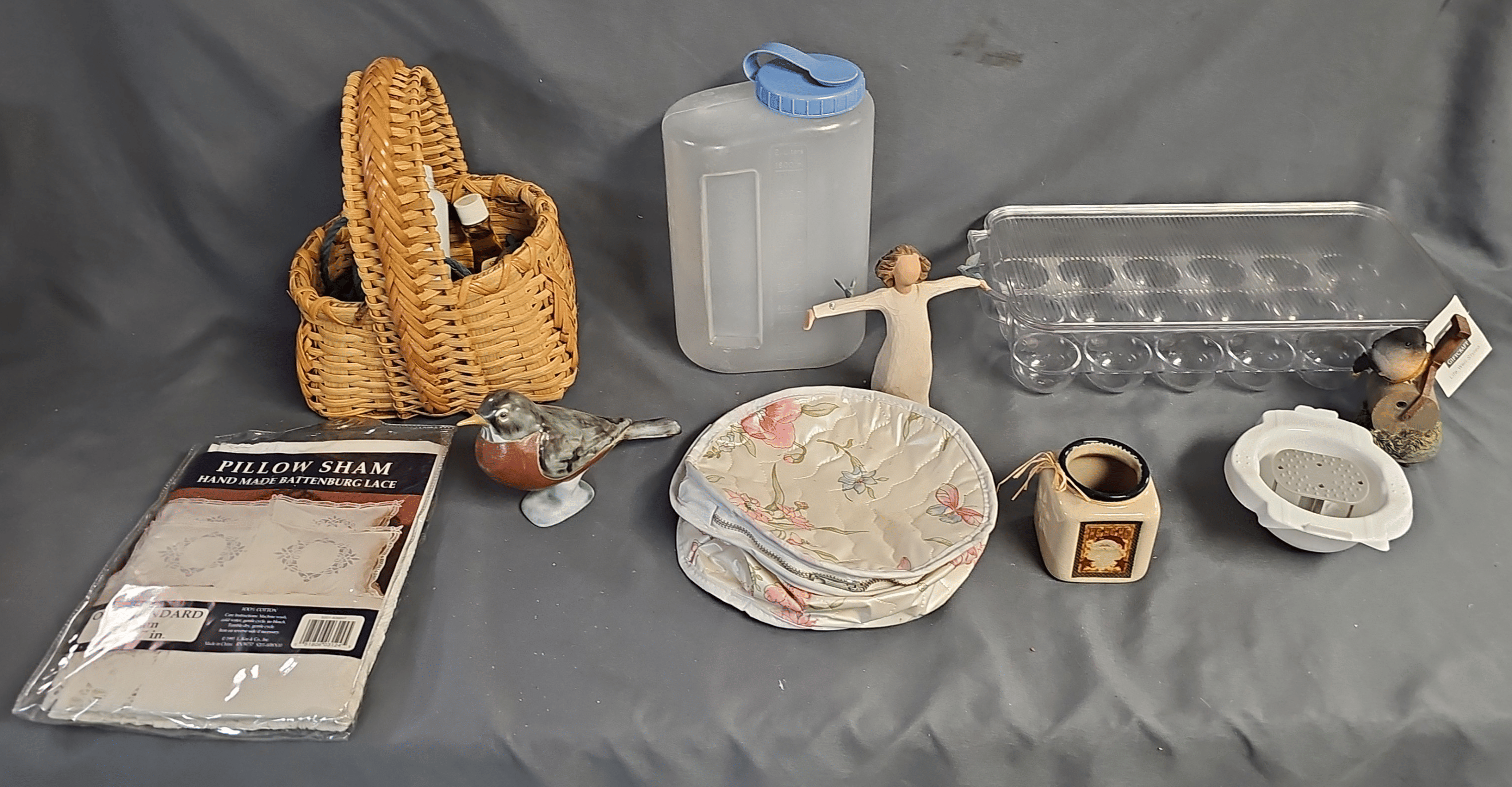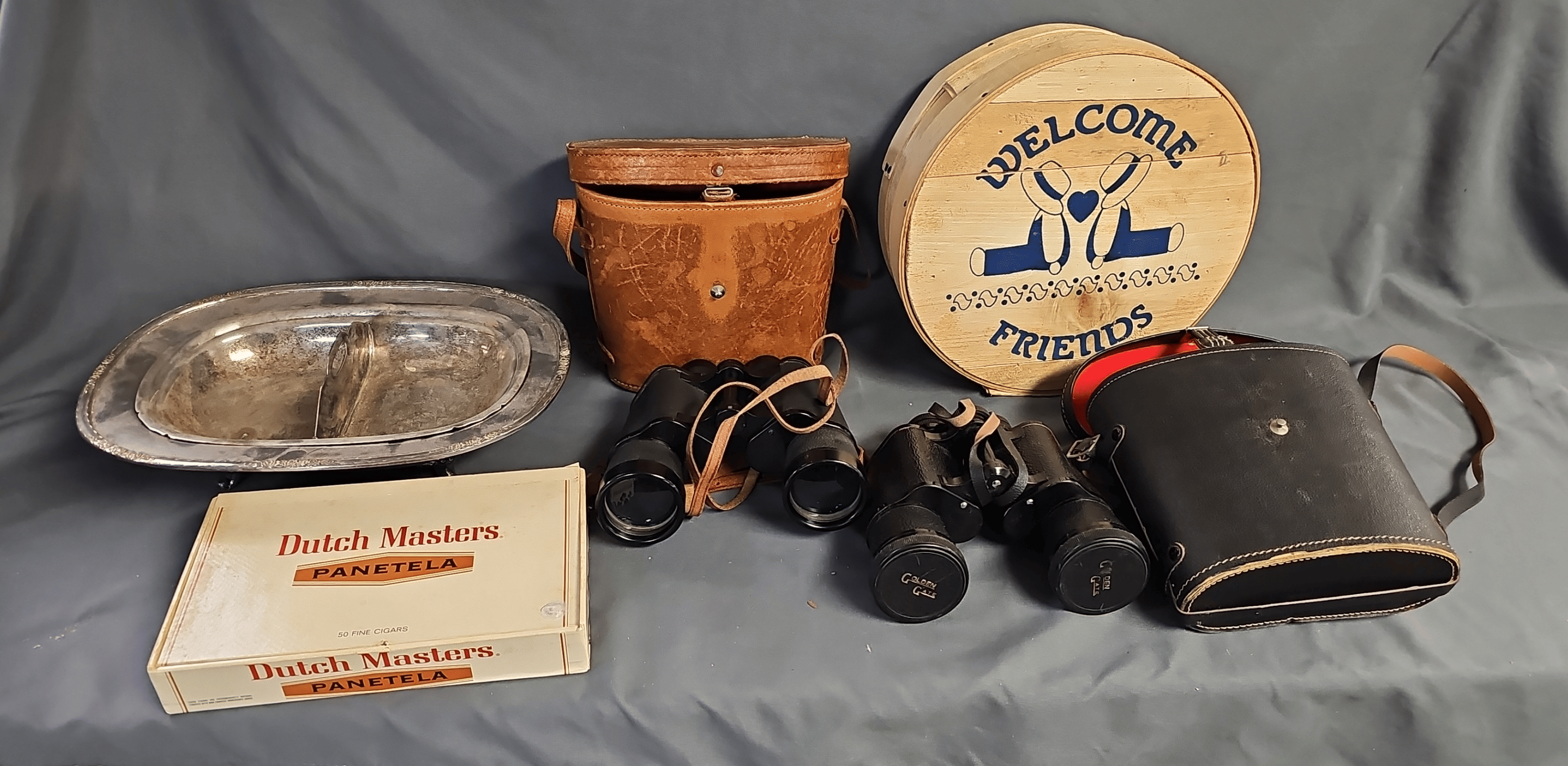 1875 Armor Silver Co Bowl, Gorham Silver Bowl, Doilies, Candles, Sunglasses, Wicker Basket, Etc