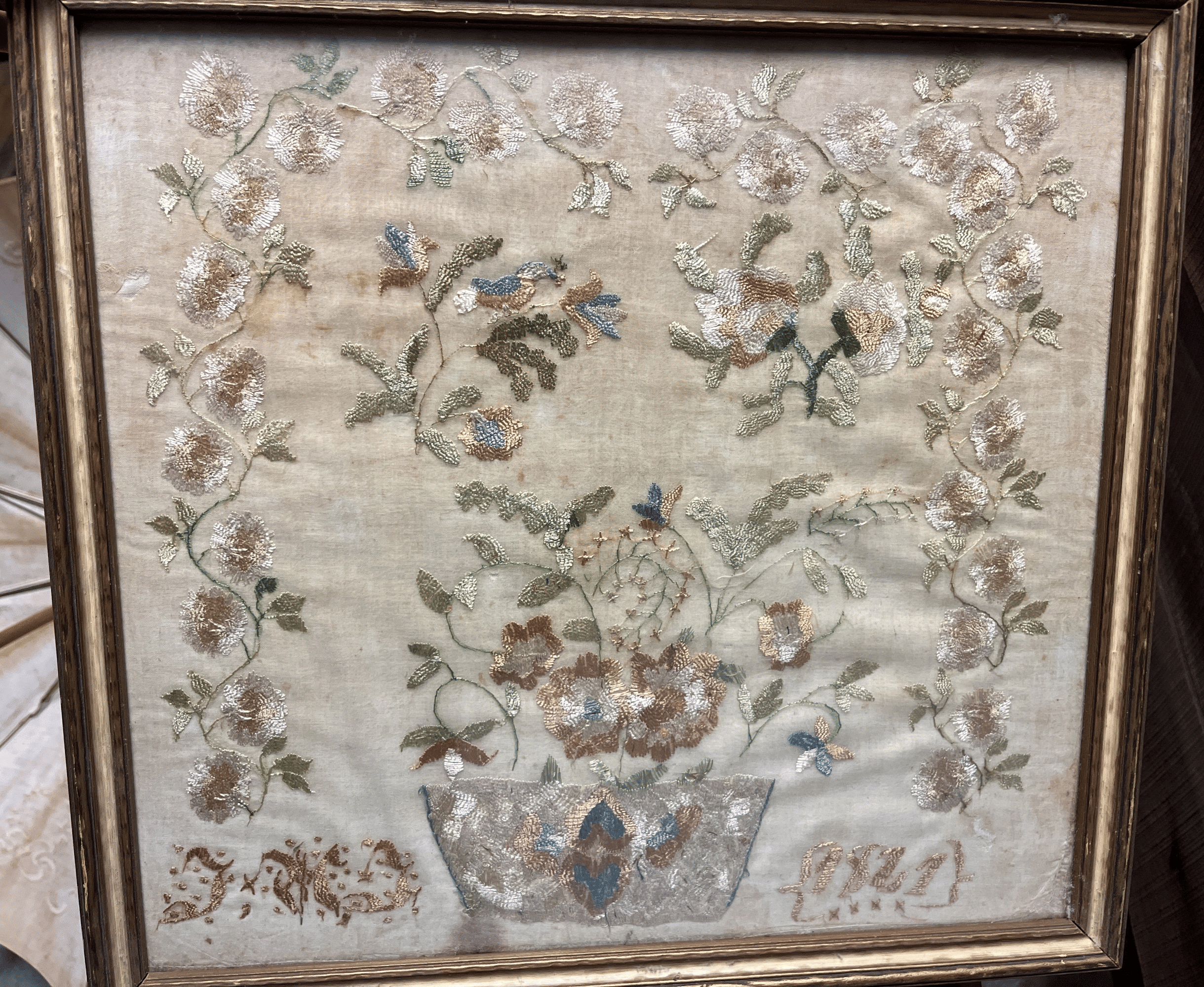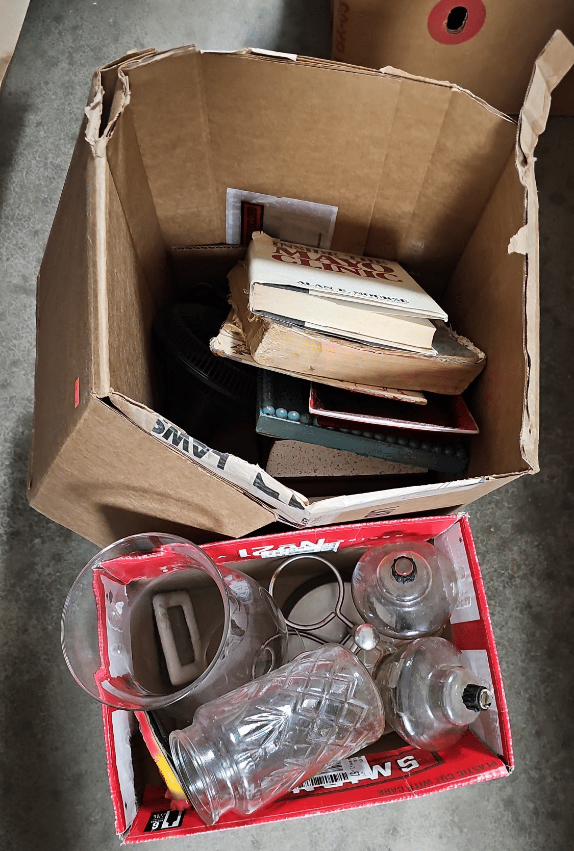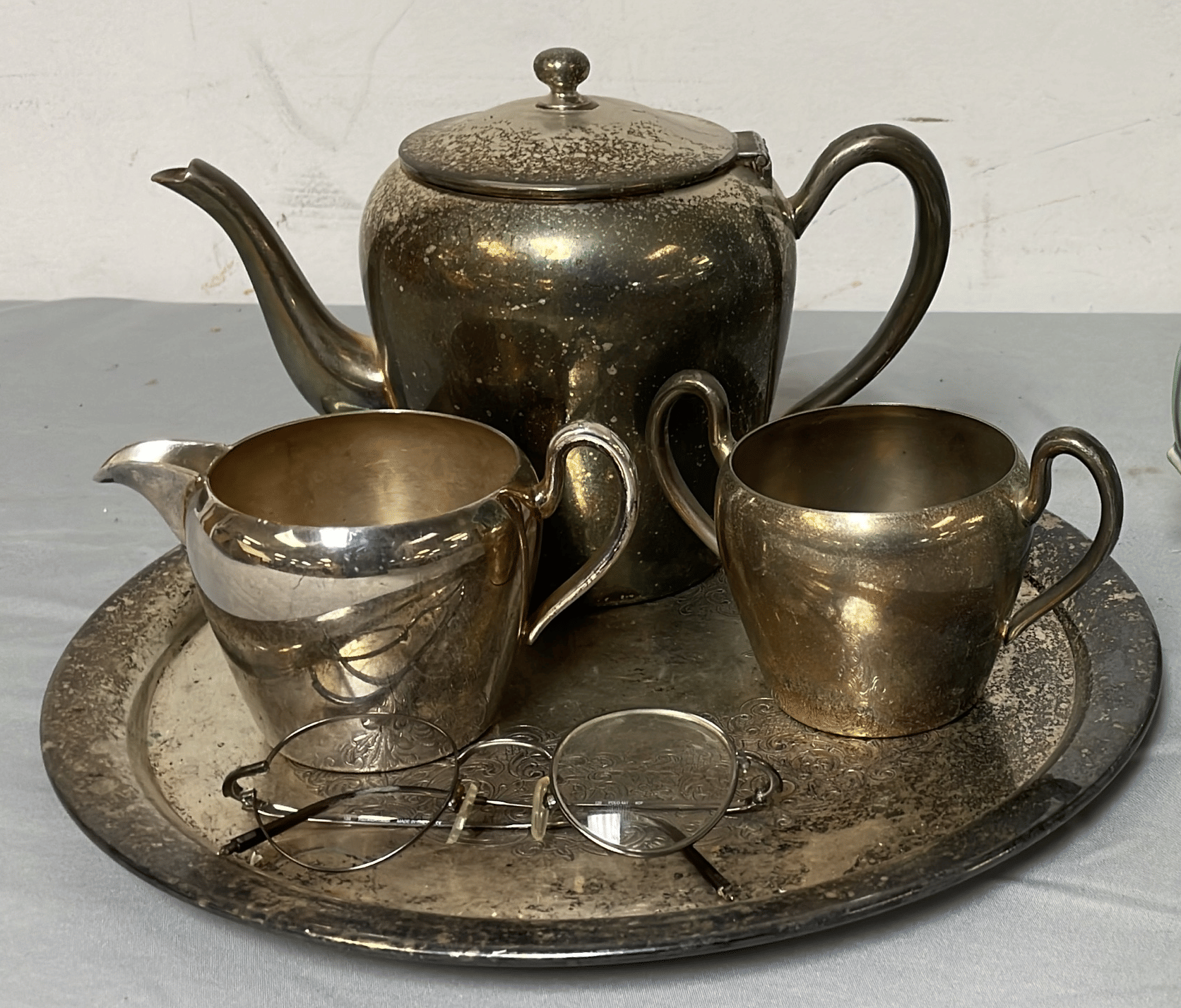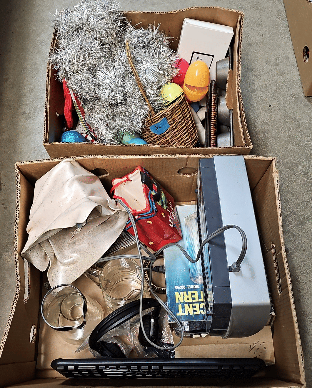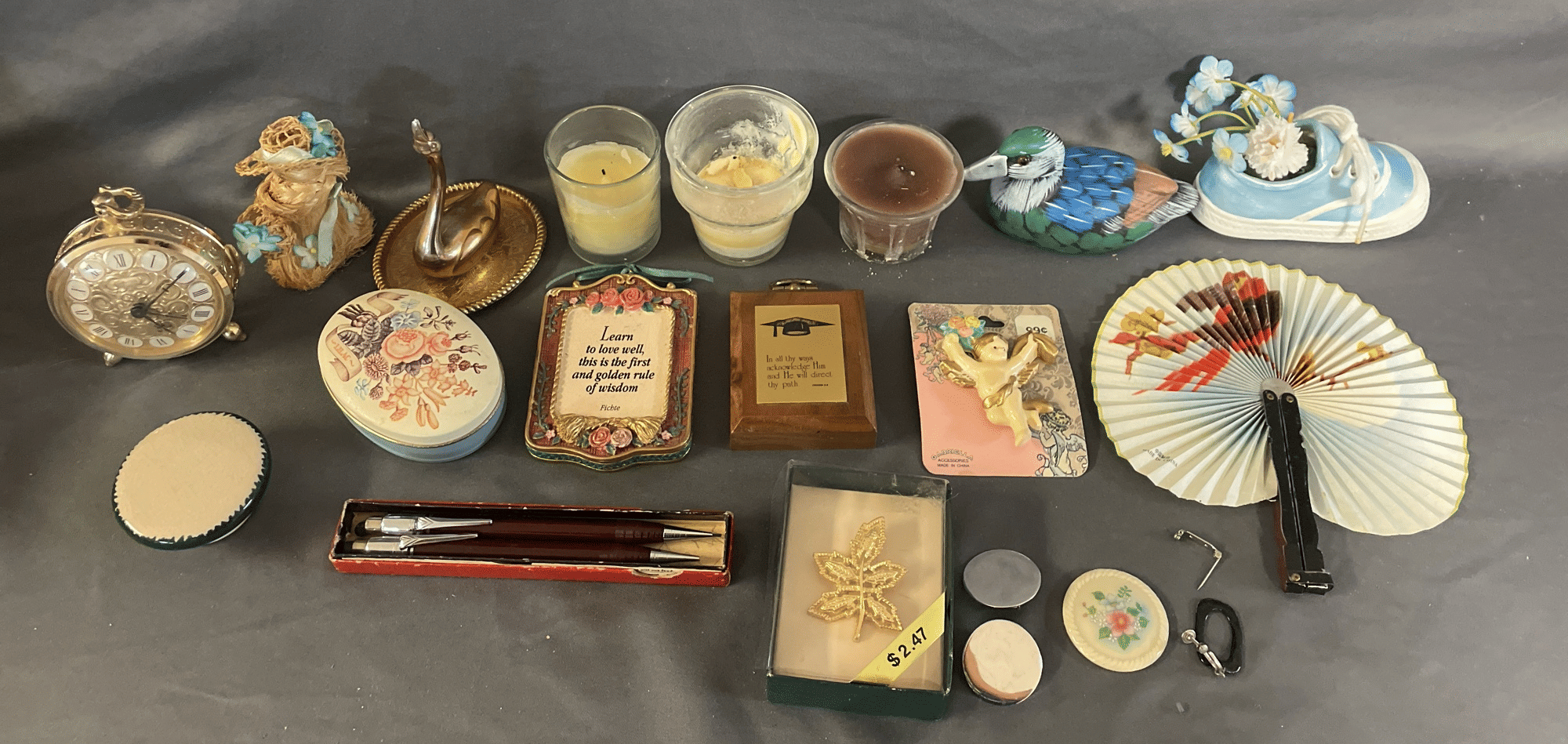 1875 Armor Silver Co Bowl, Gorham Silver Bowl, Doilies, Candles, Sunglasses, Wicker Basket, Etc