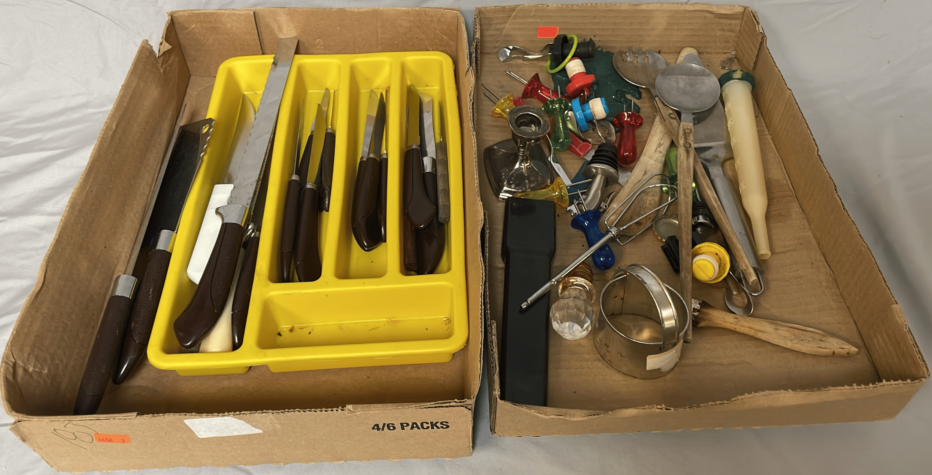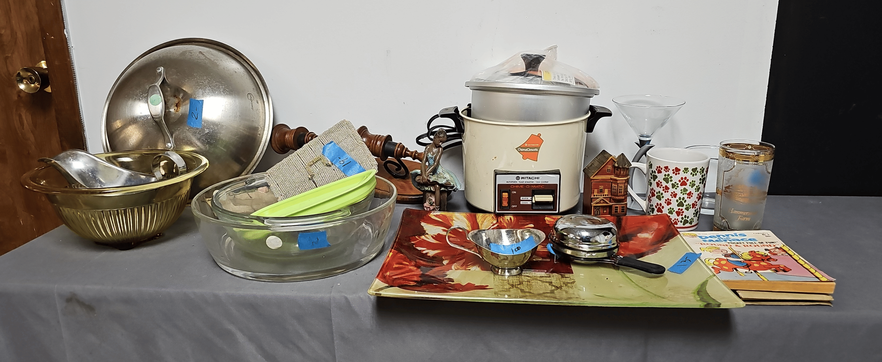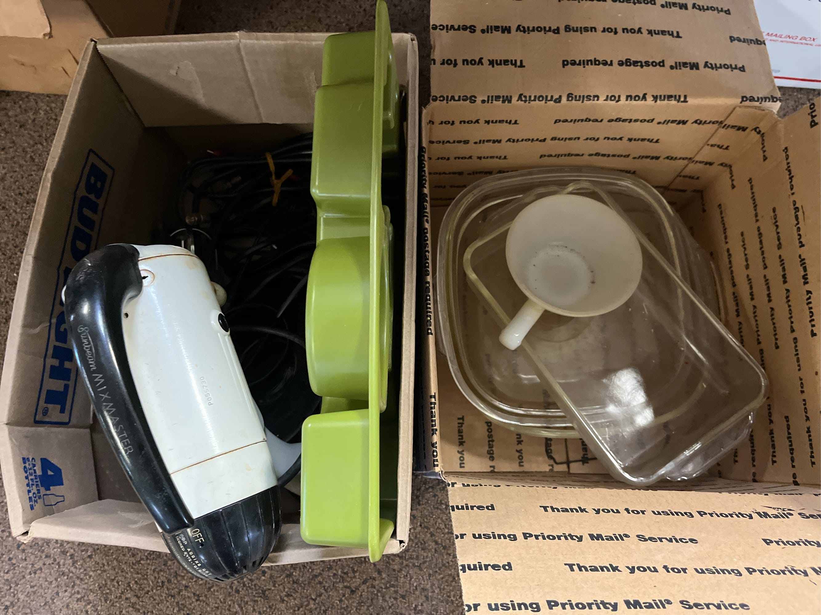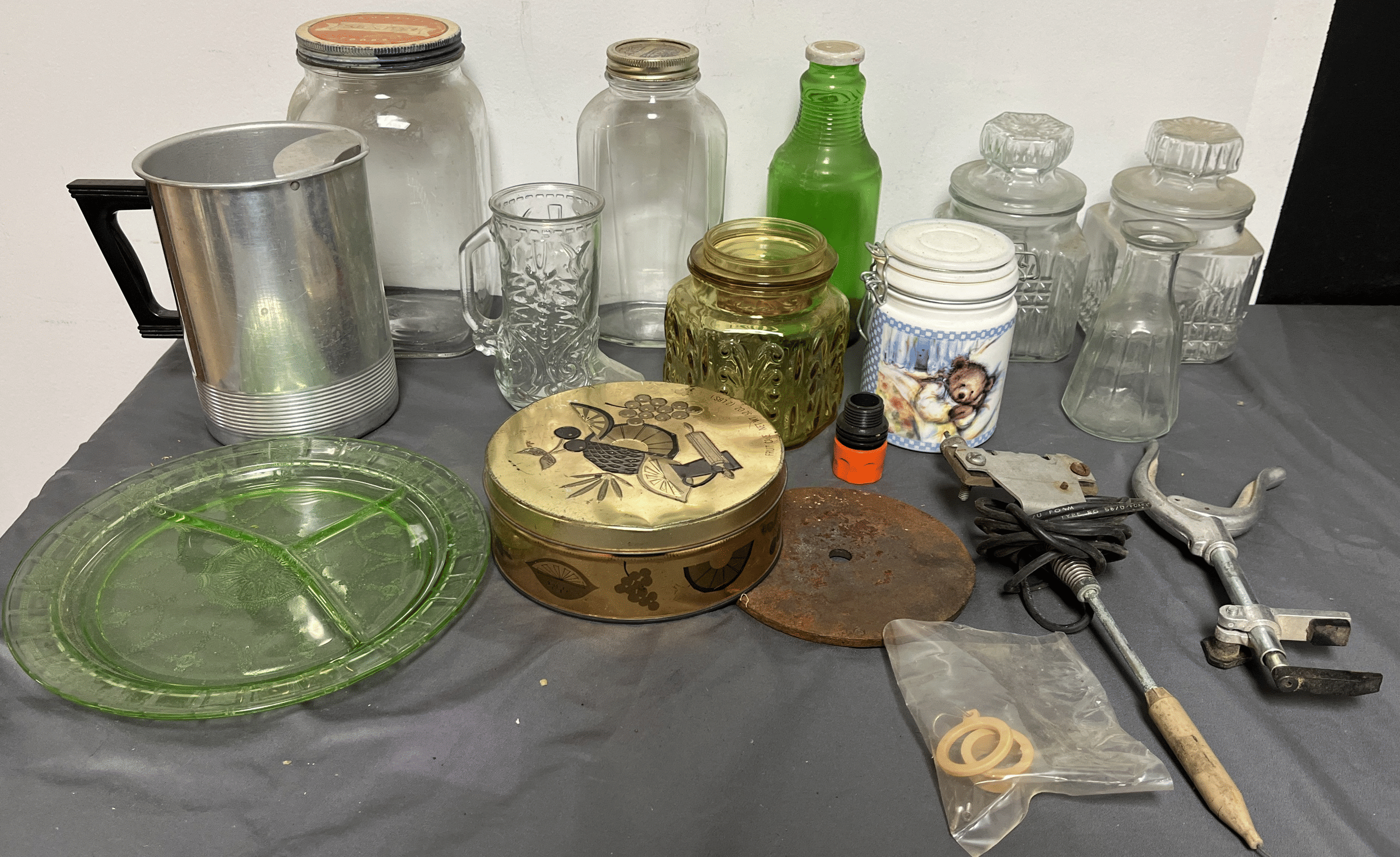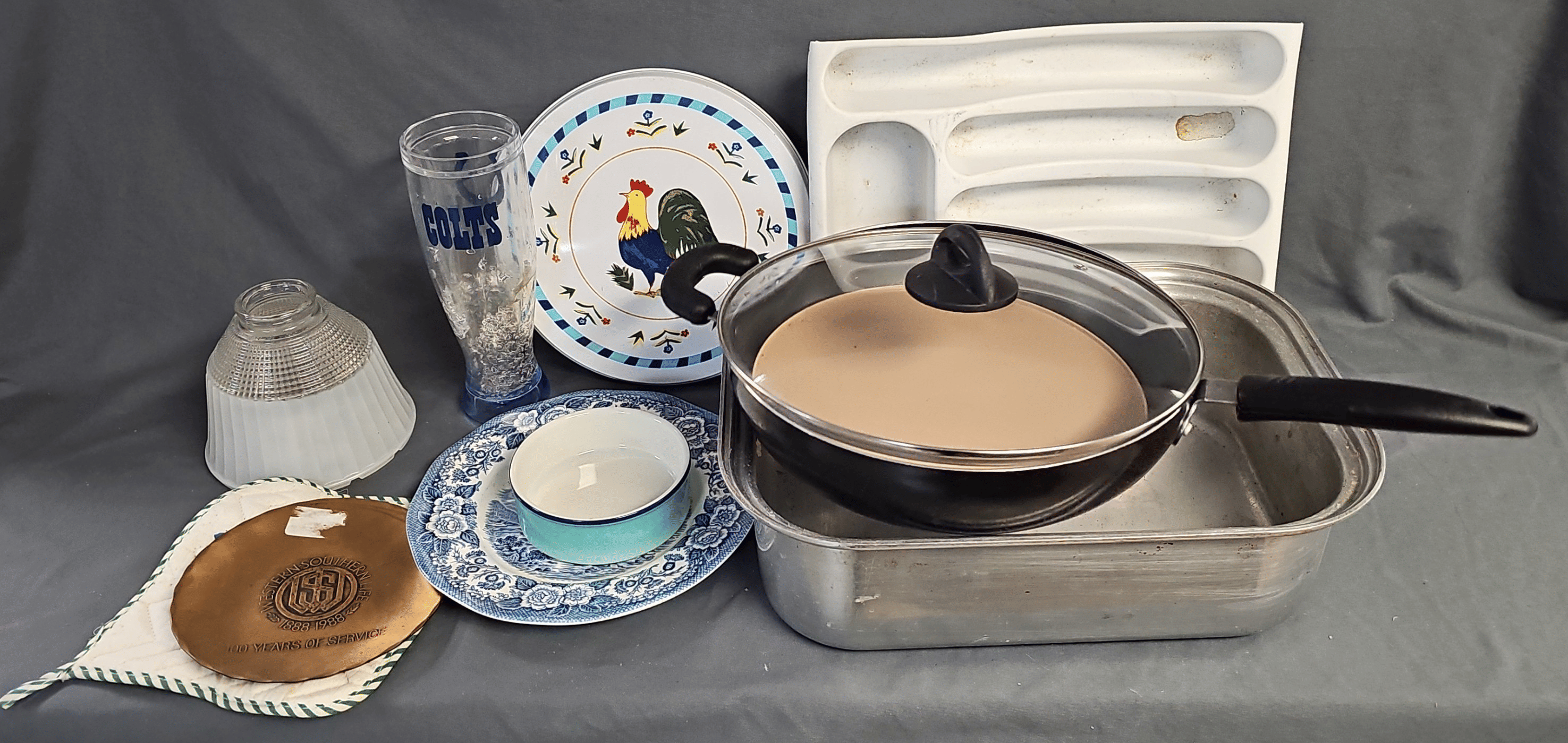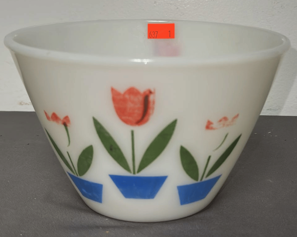1705 Plastic Utensil Organizer, Sunbeam Automatic Mixer, Fire king Baking Dish, Etc.
