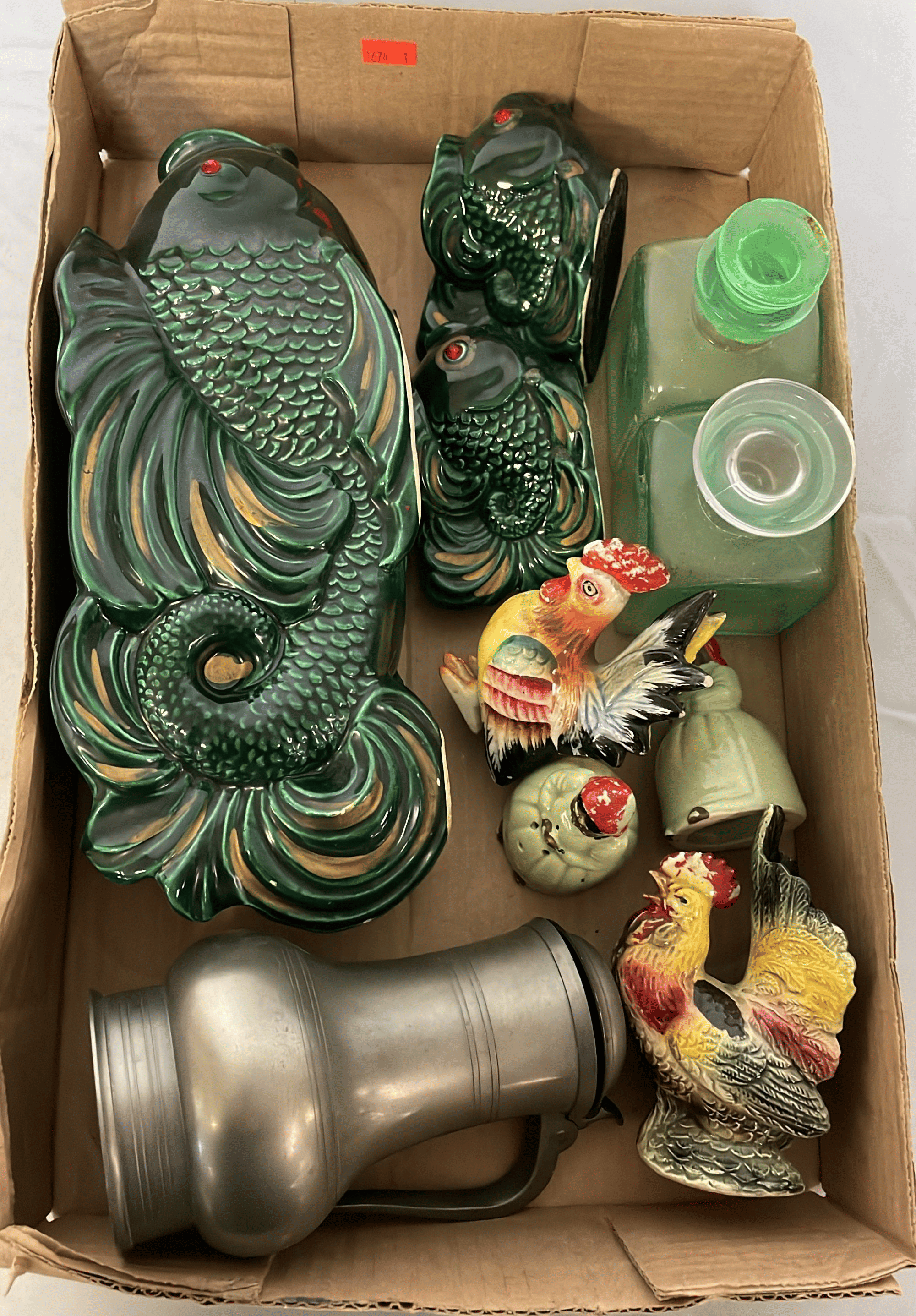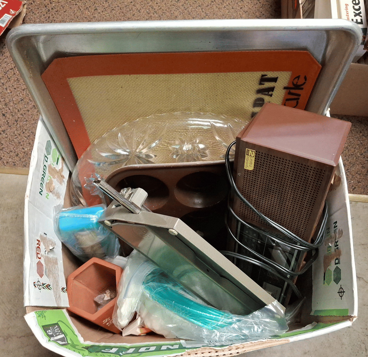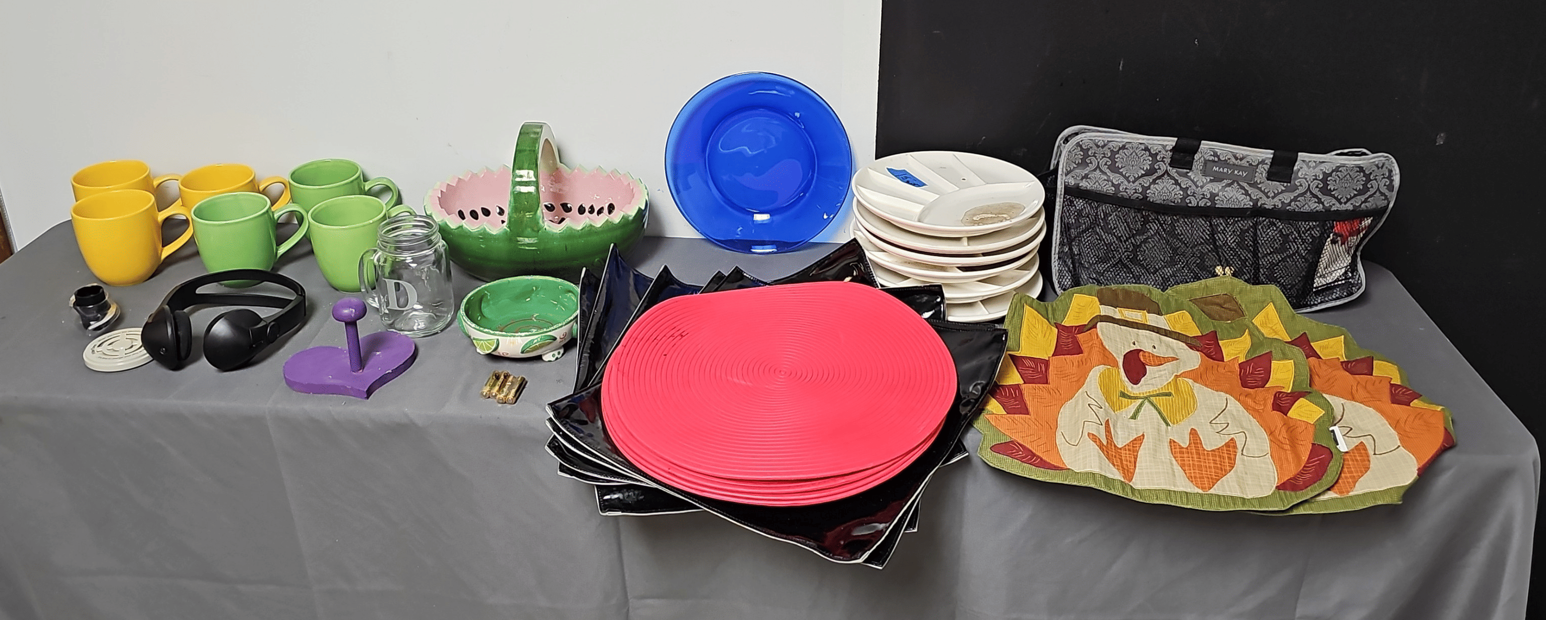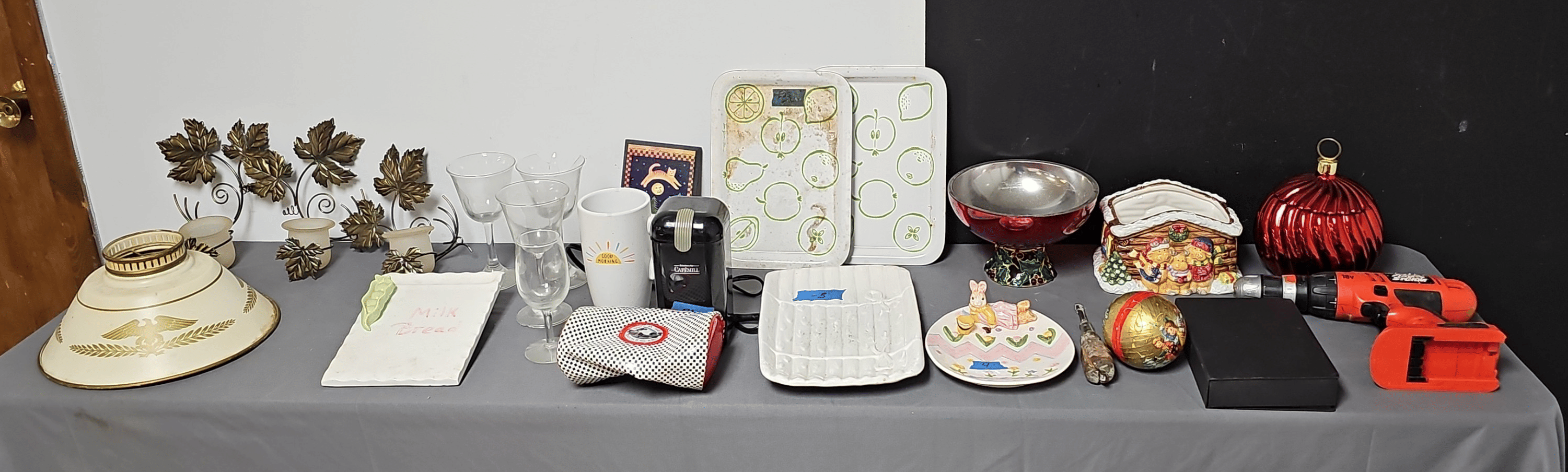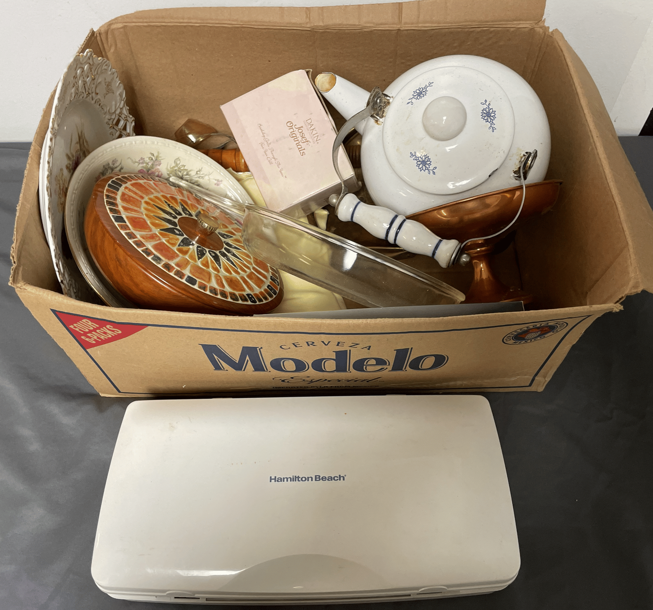 1705 Plastic Utensil Organizer, Sunbeam Automatic Mixer, Fire king Baking Dish, Etc.