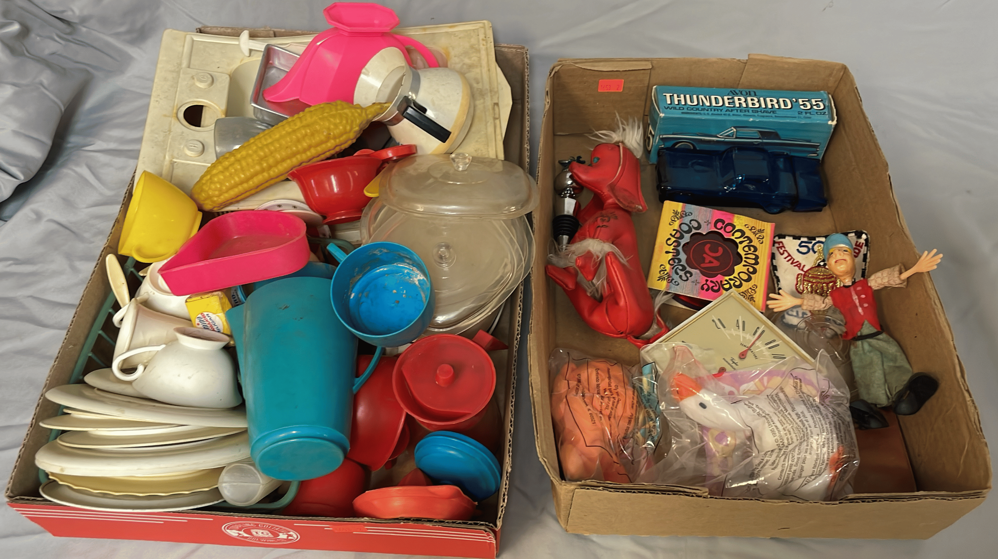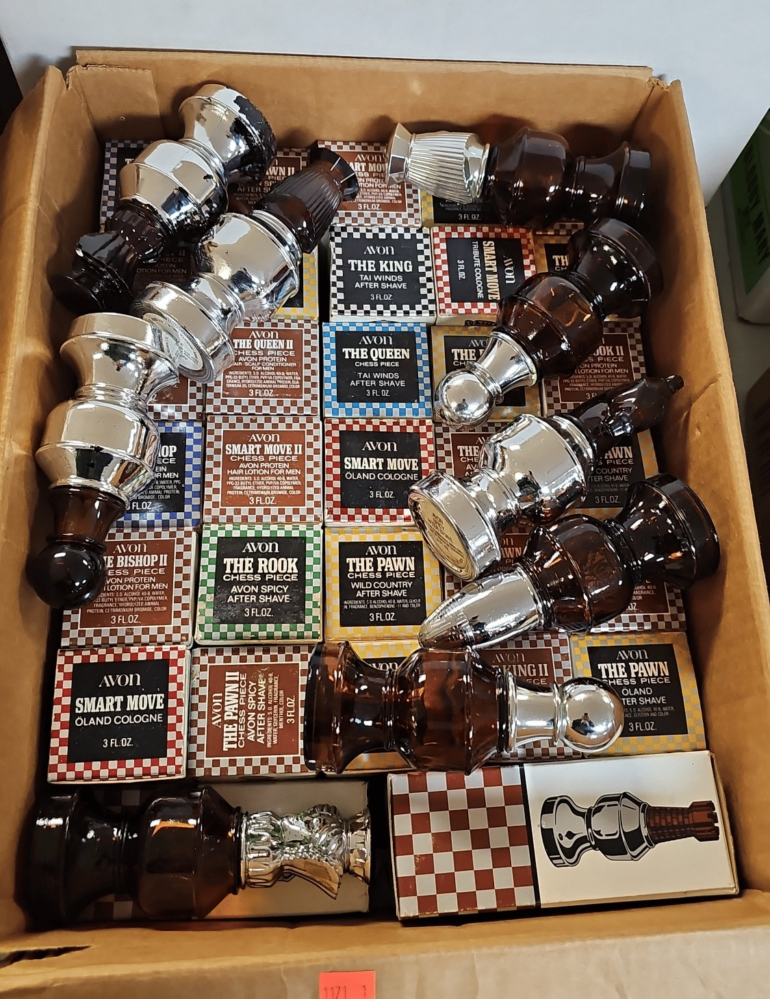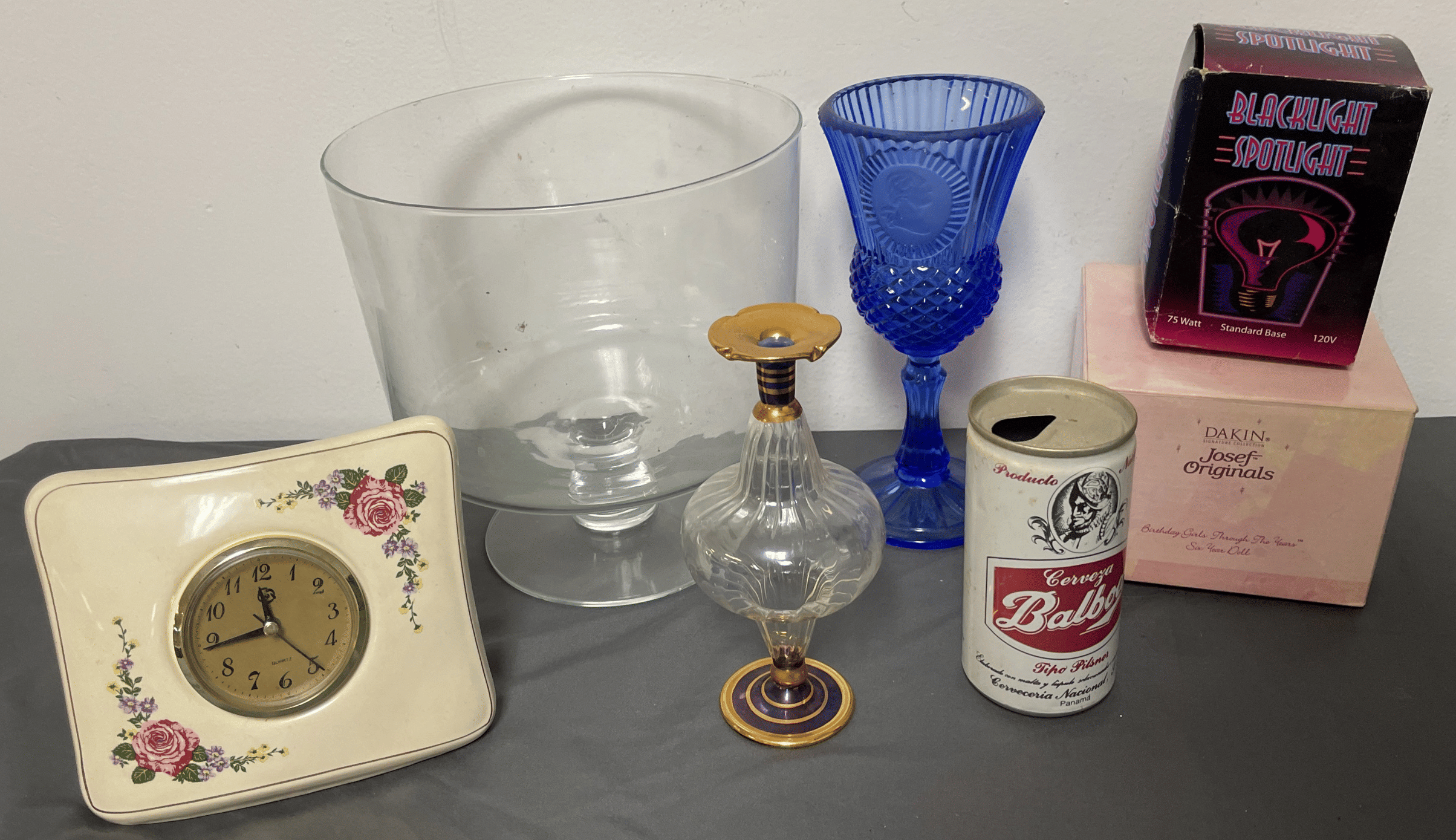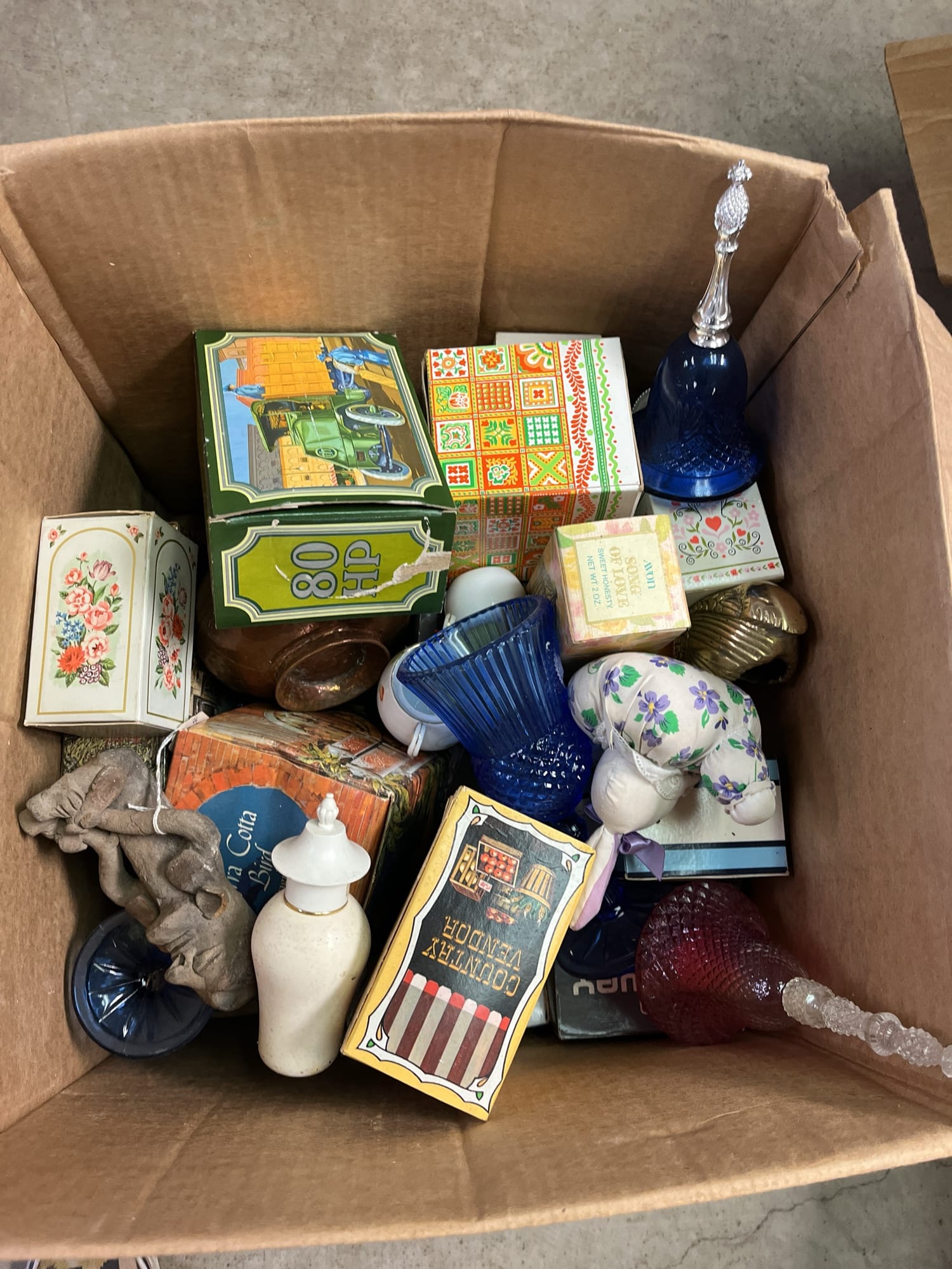 1716 Avon Assortment Inc. “Song of Love Sweet Honesty” “Big Back Oland After Shave” “Country Vendor After Shave”, (2) Cobalt Blue Stemmed Glasses, etc.