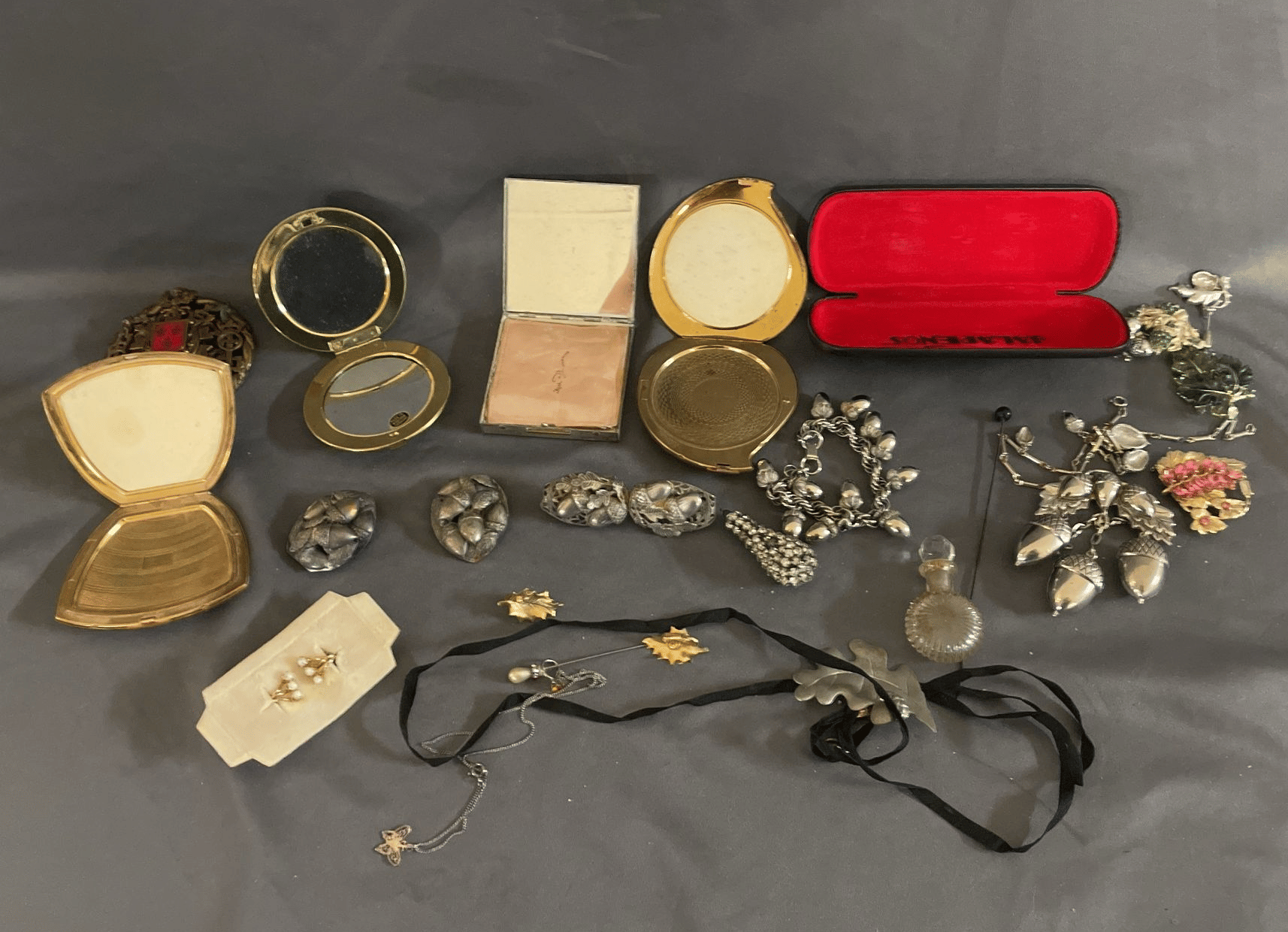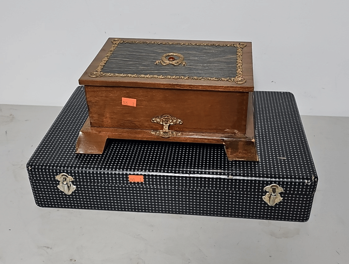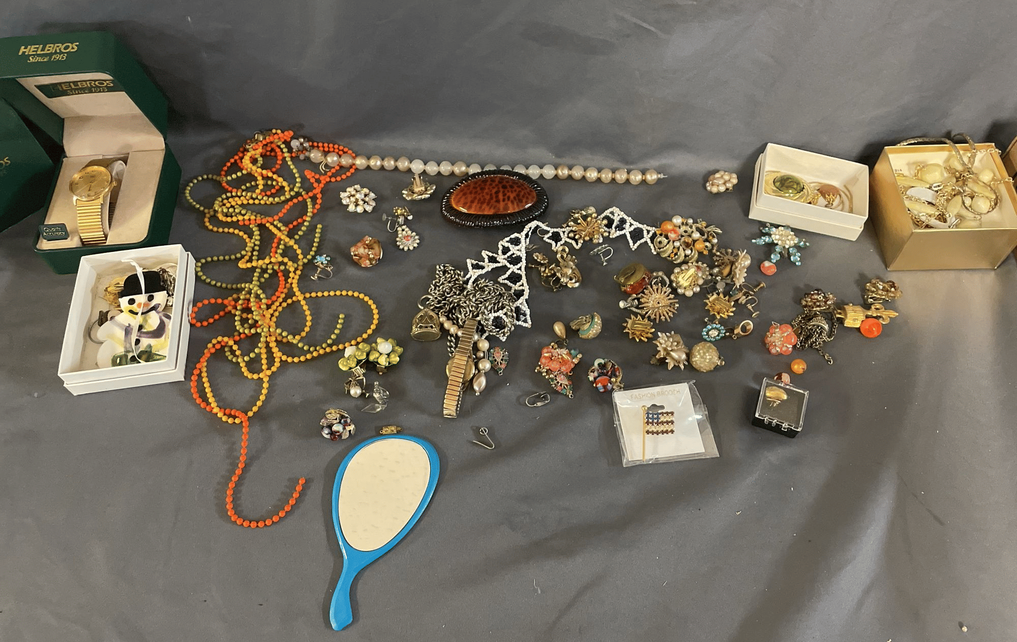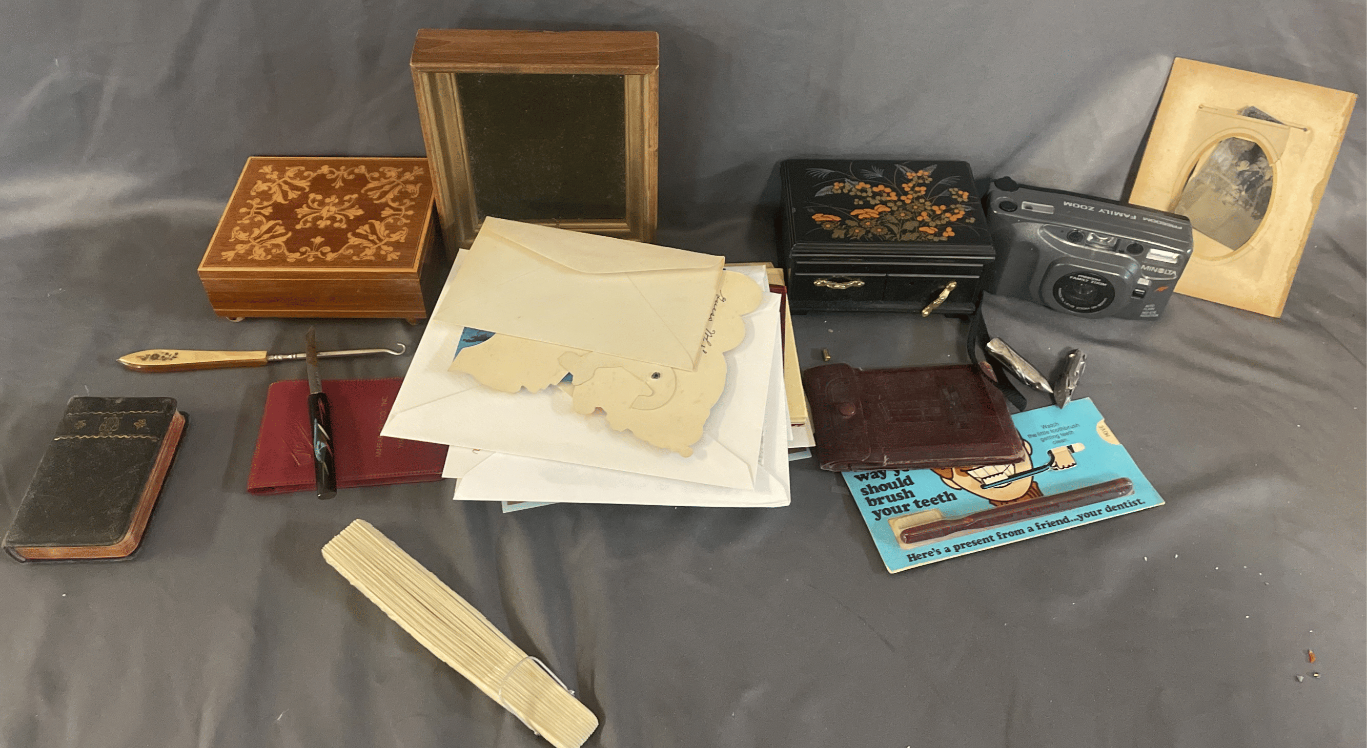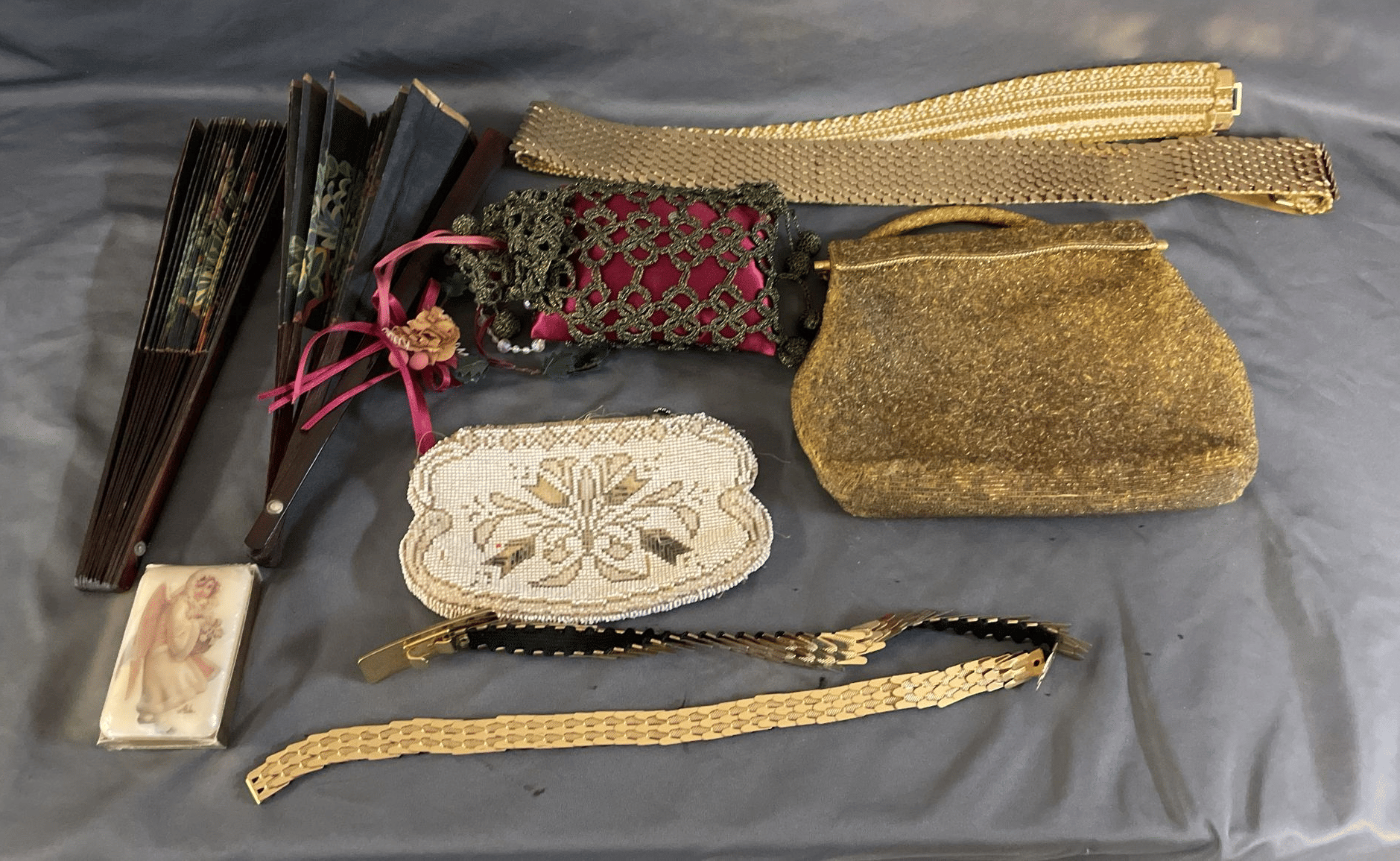 1828 Accordion Fan Assortment, Small Hand Bag, Costume Jewelry Necklace, Wood Jewelry Box