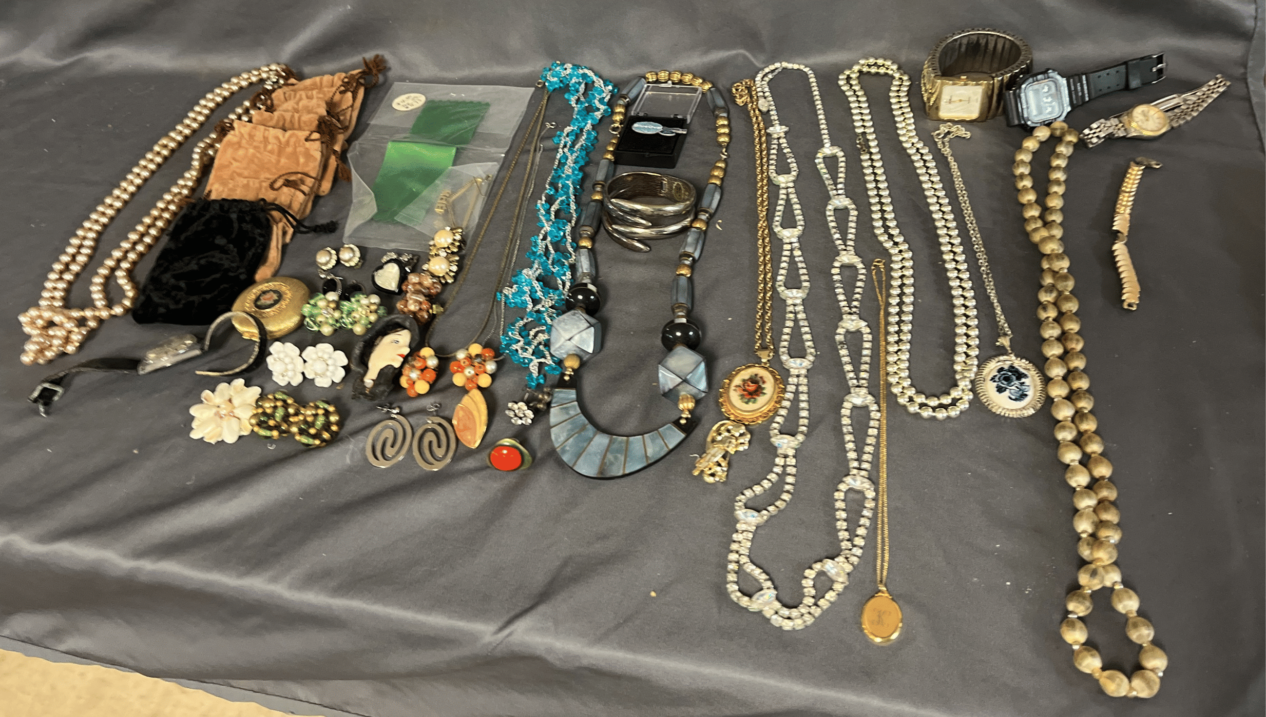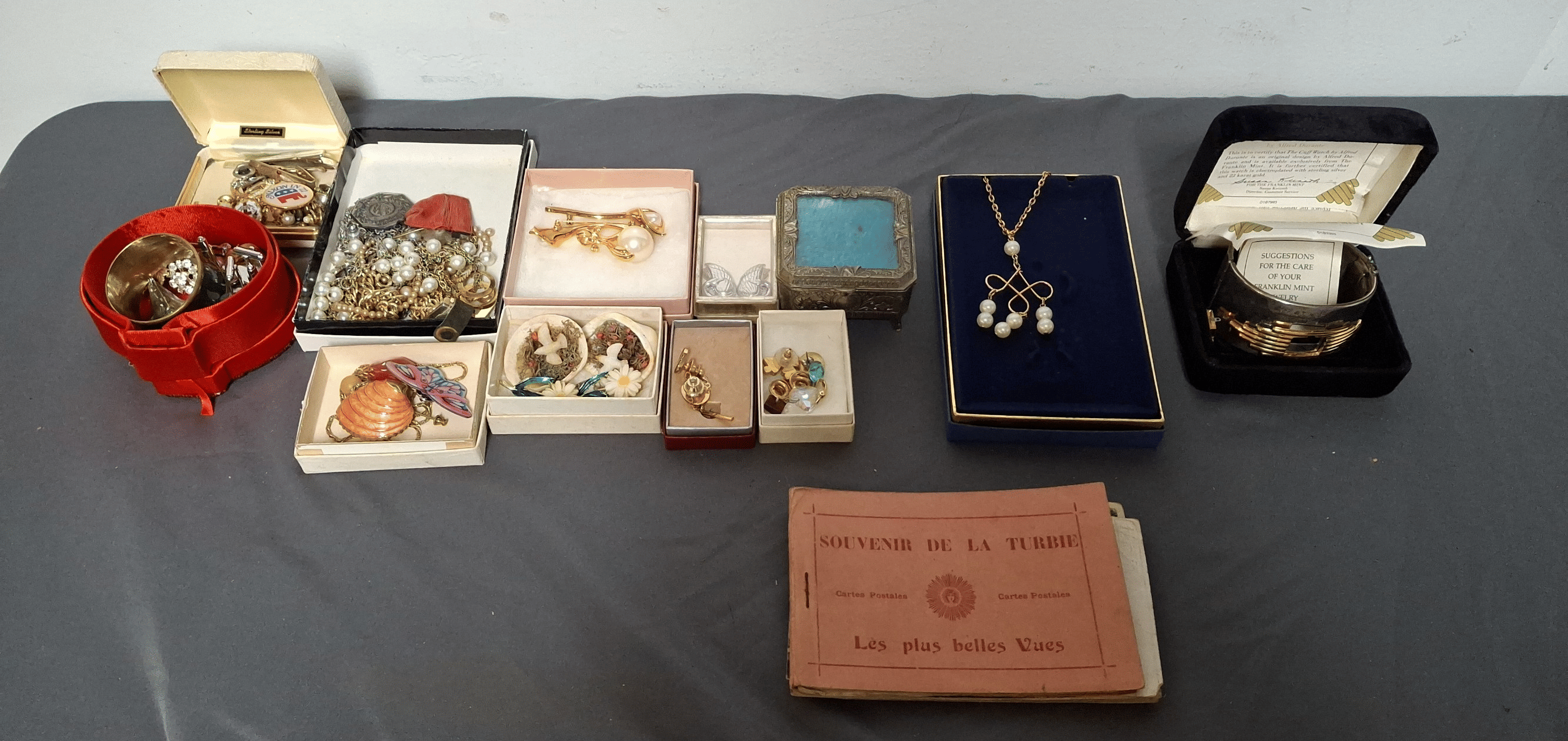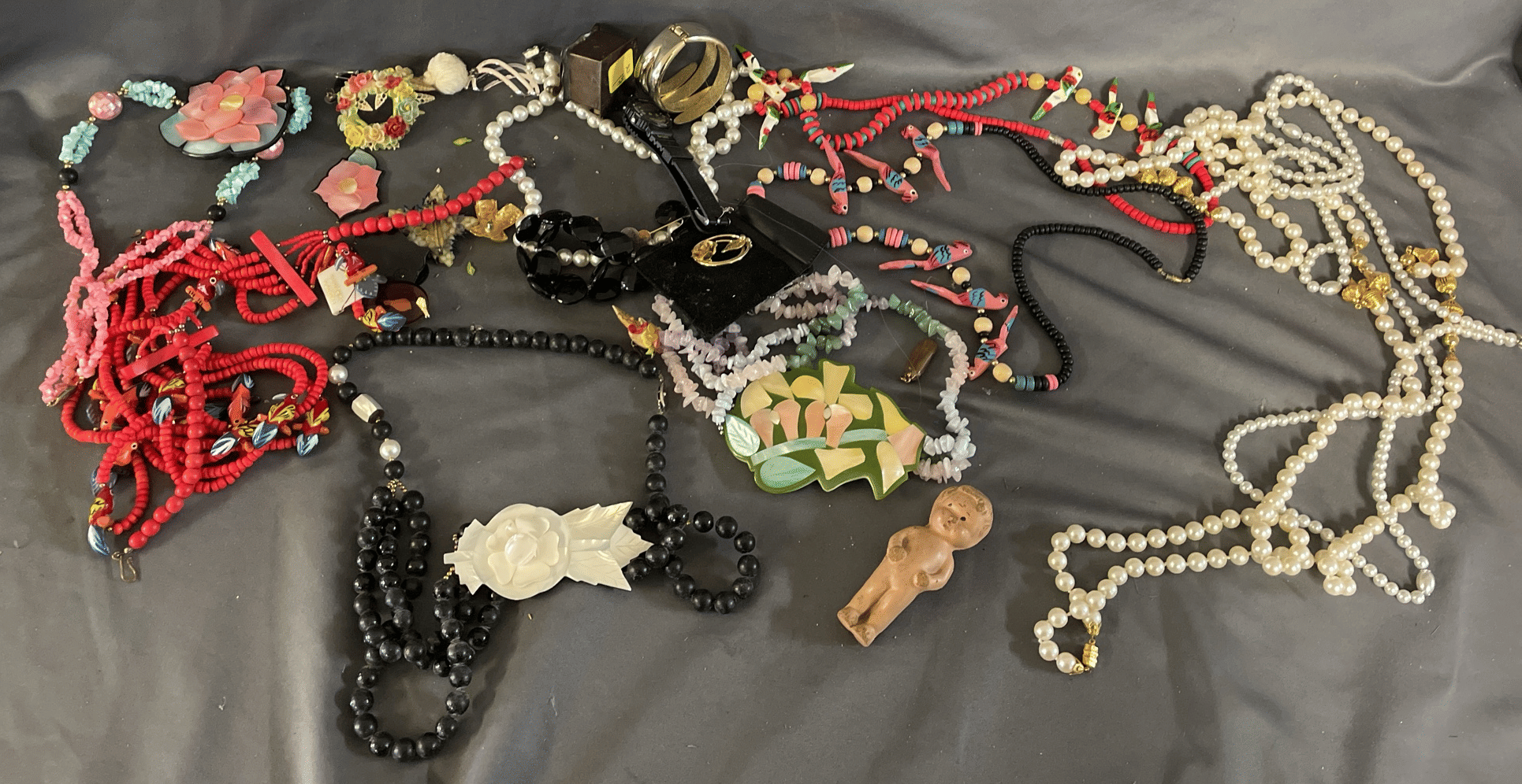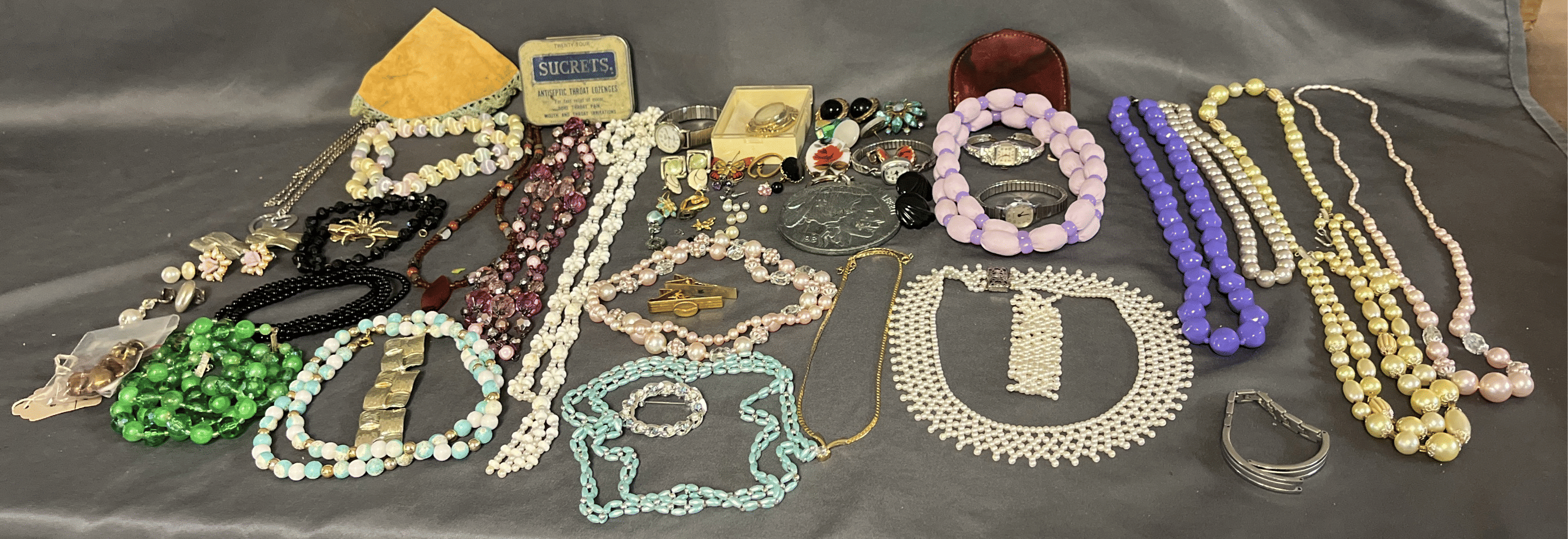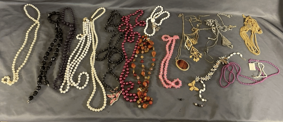 1828 Accordion Fan Assortment, Small Hand Bag, Costume Jewelry Necklace, Wood Jewelry Box