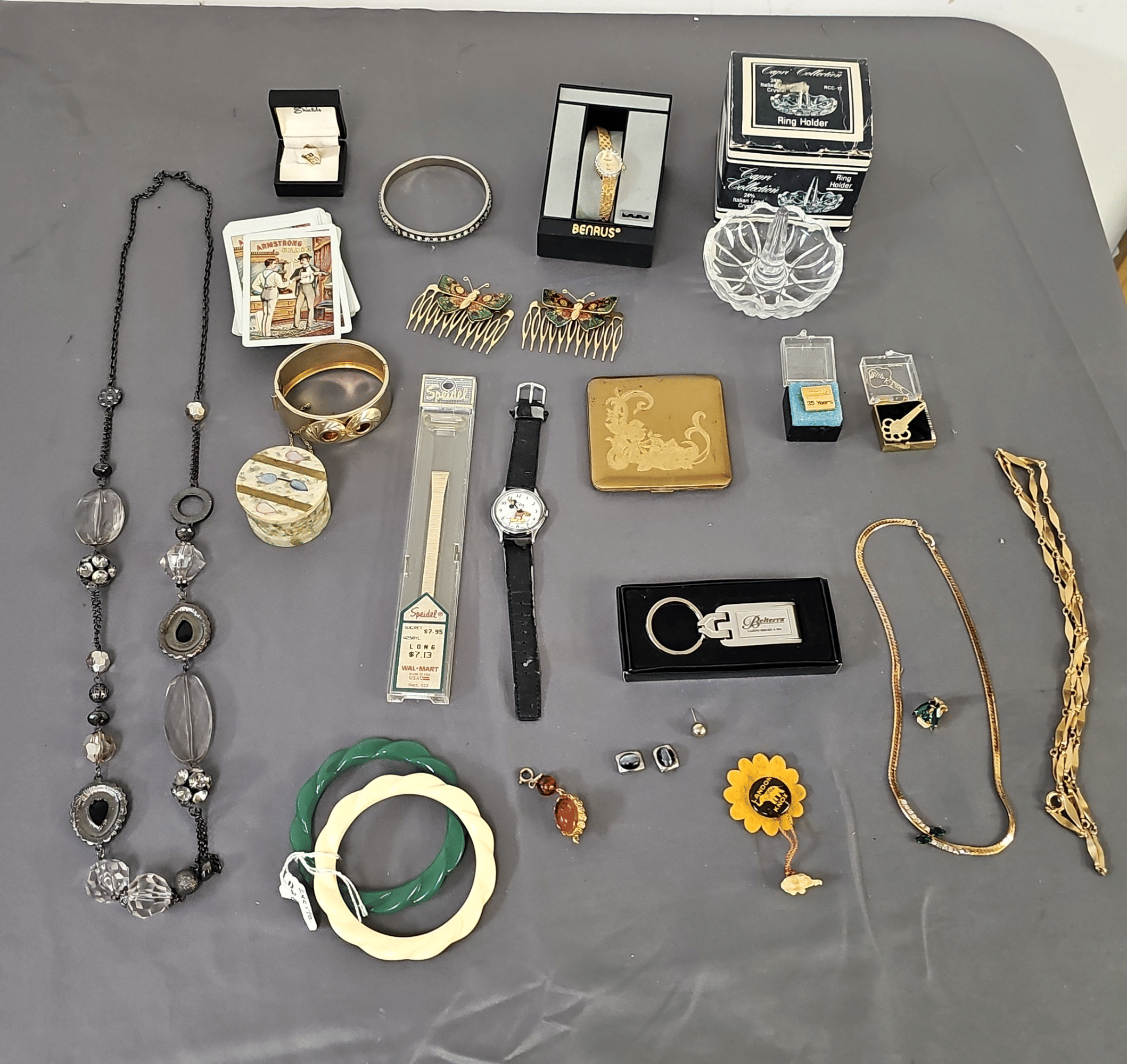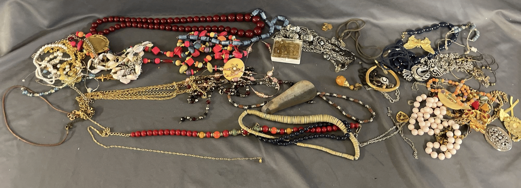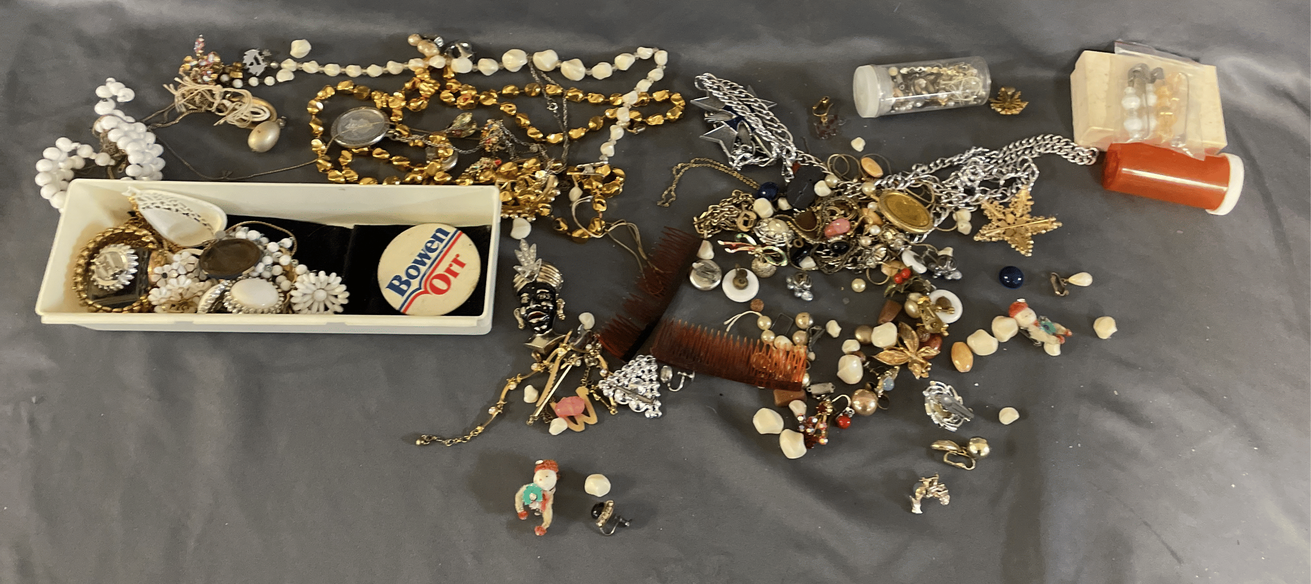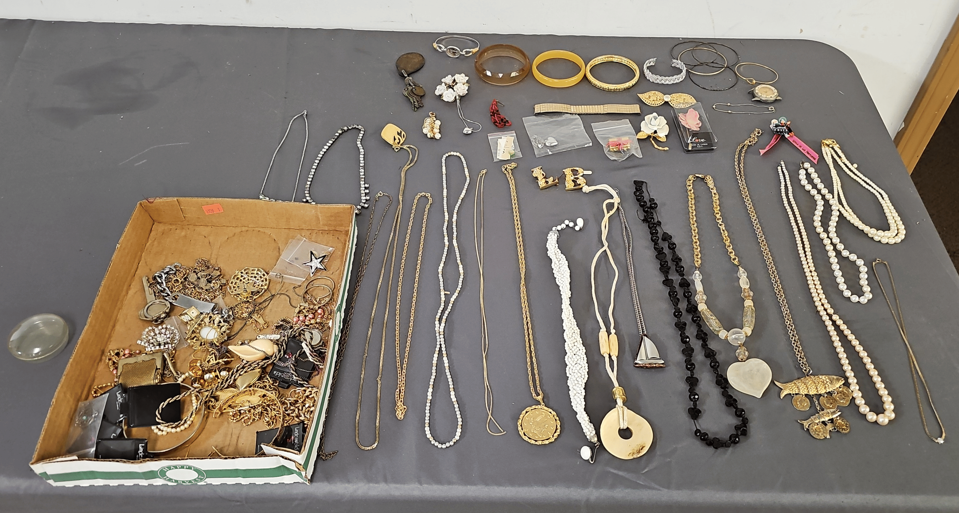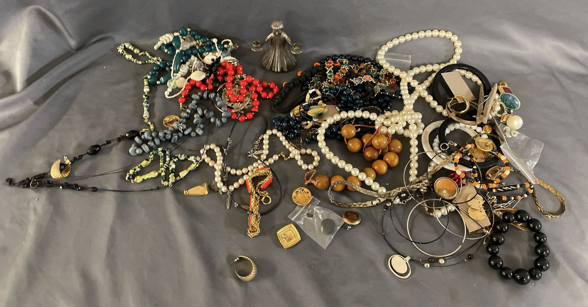 1828 Accordion Fan Assortment, Small Hand Bag, Costume Jewelry Necklace, Wood Jewelry Box