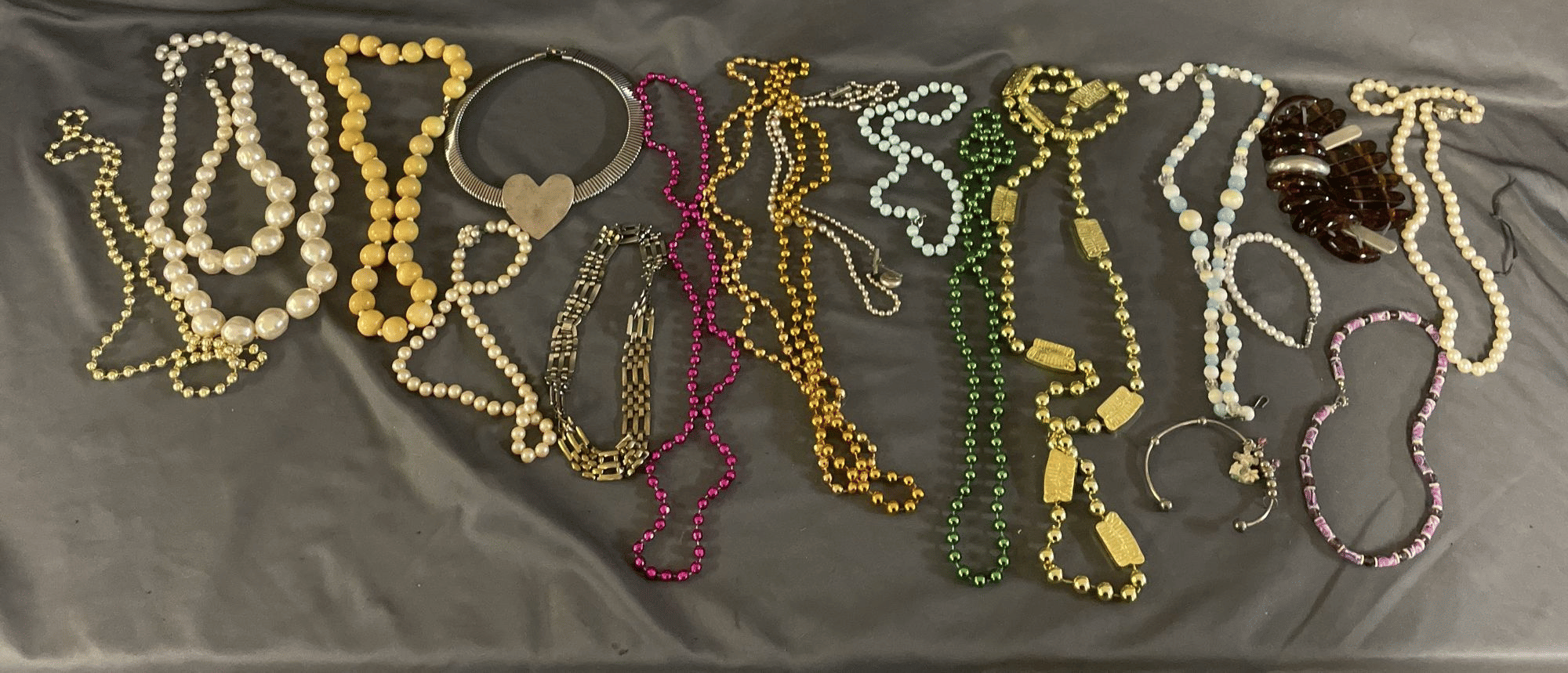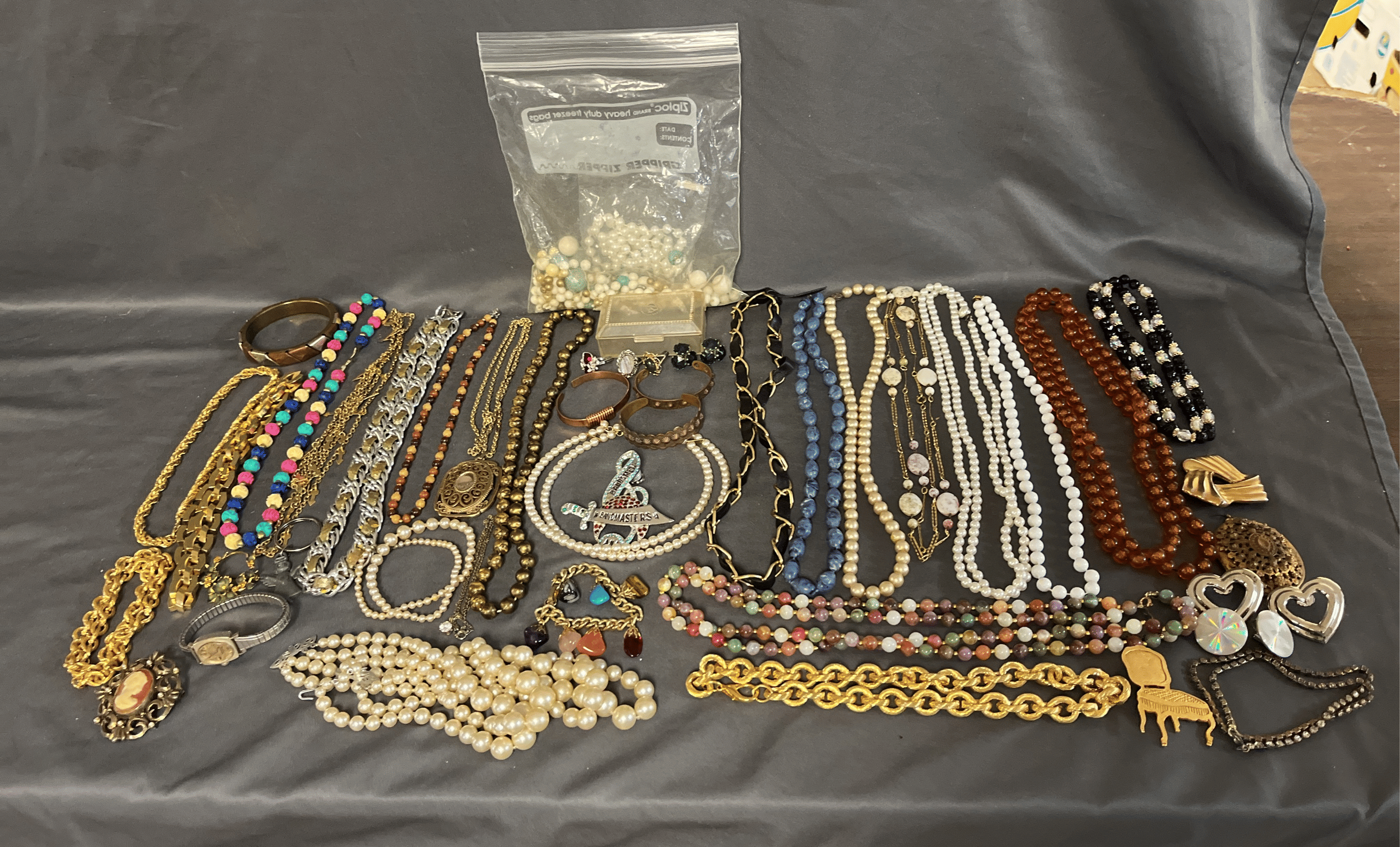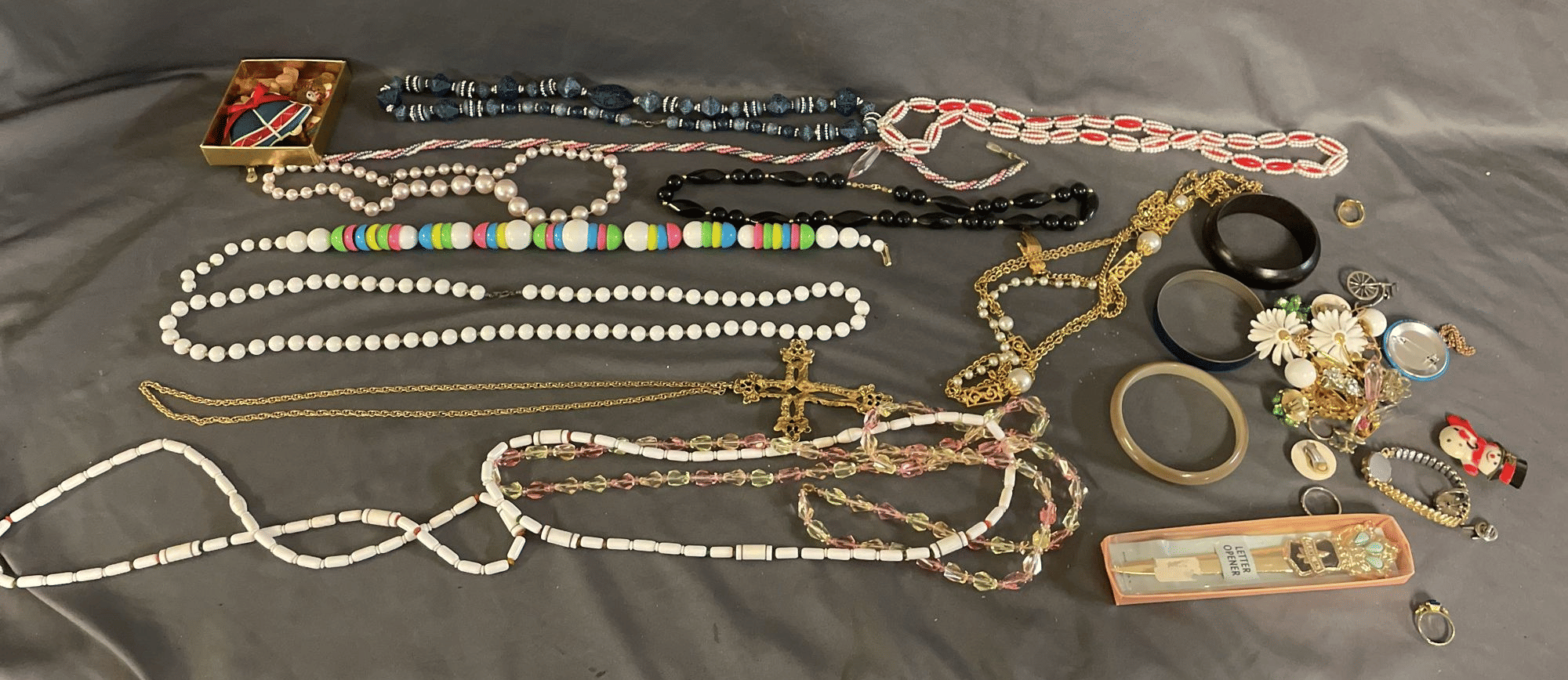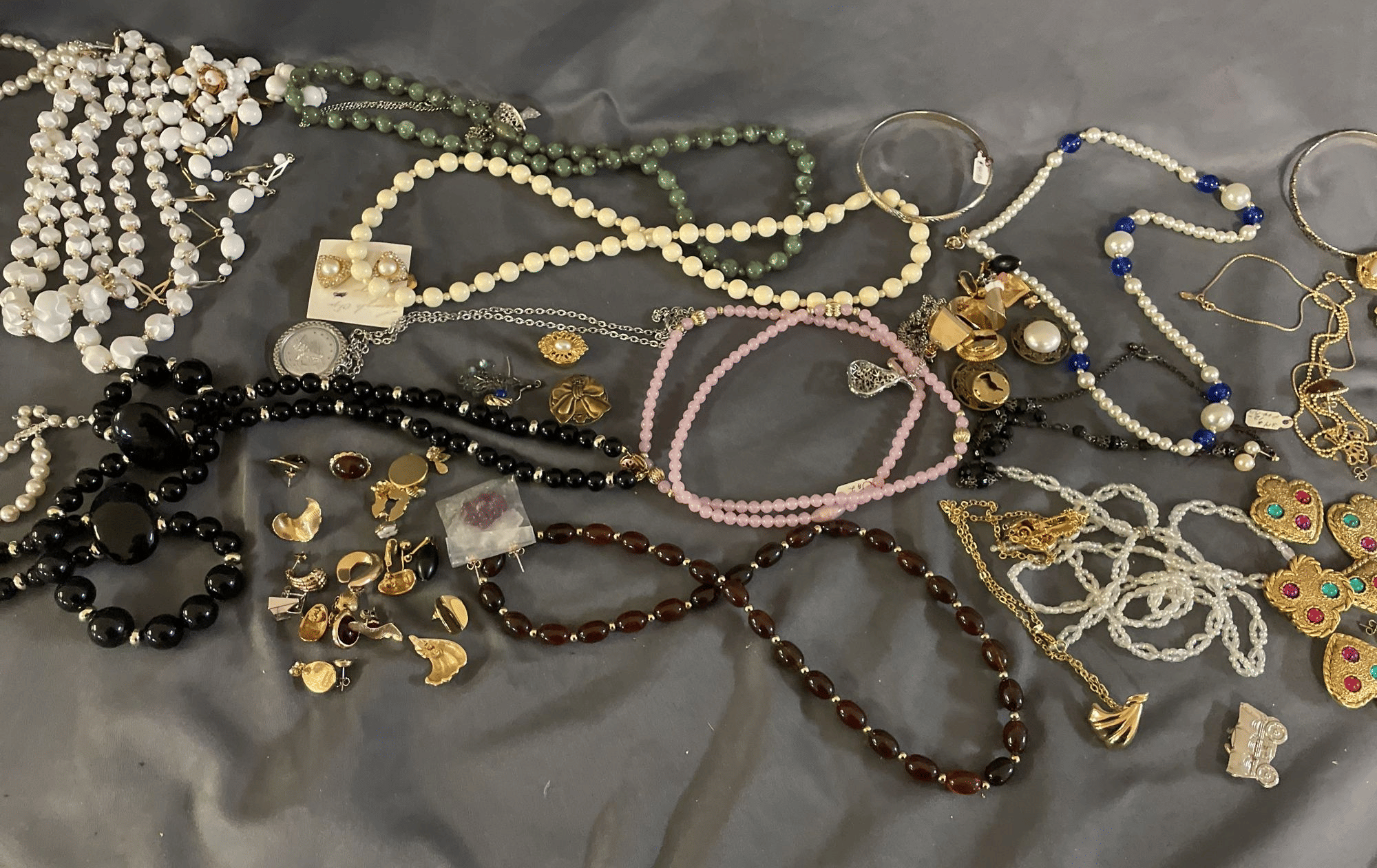1828 Accordion Fan Assortment, Small Hand Bag, Costume Jewelry Necklace, Wood Jewelry Box