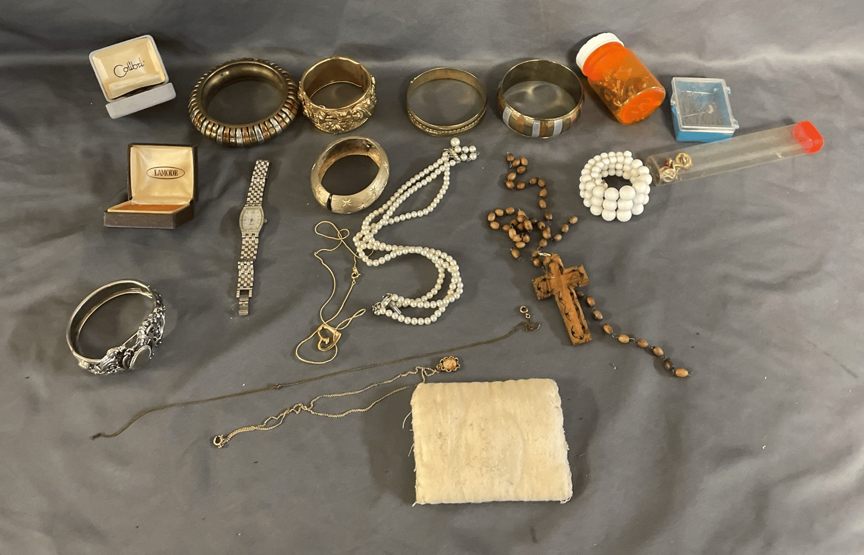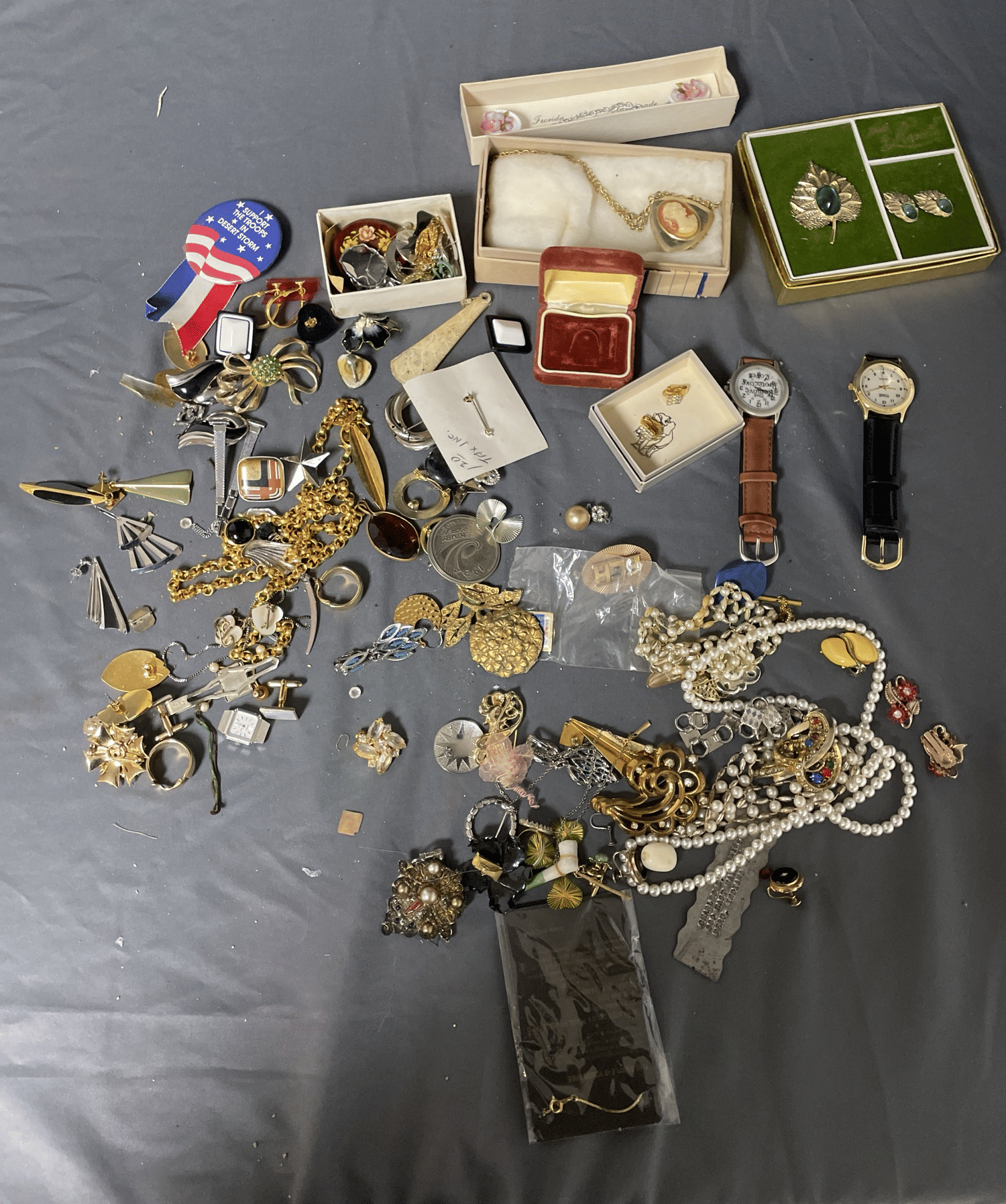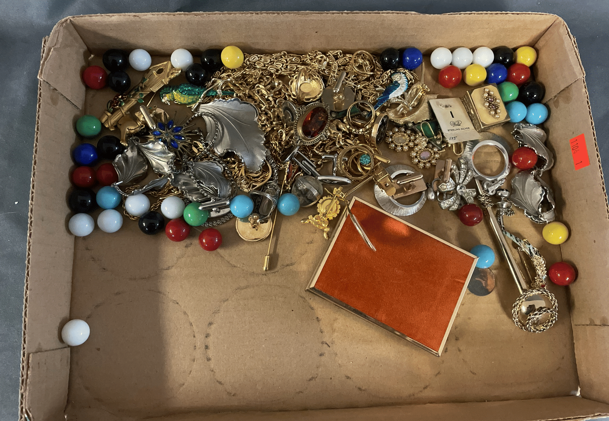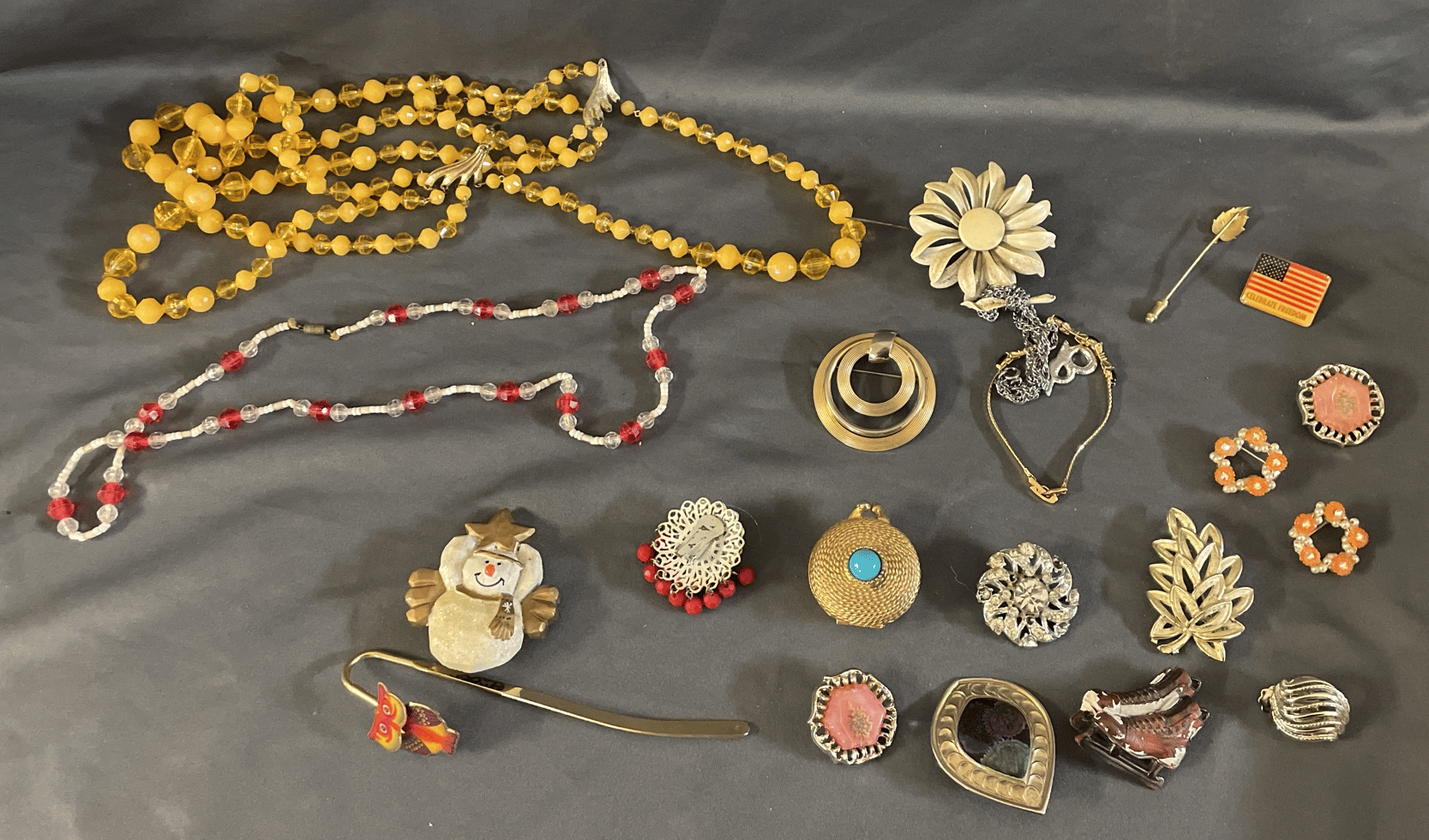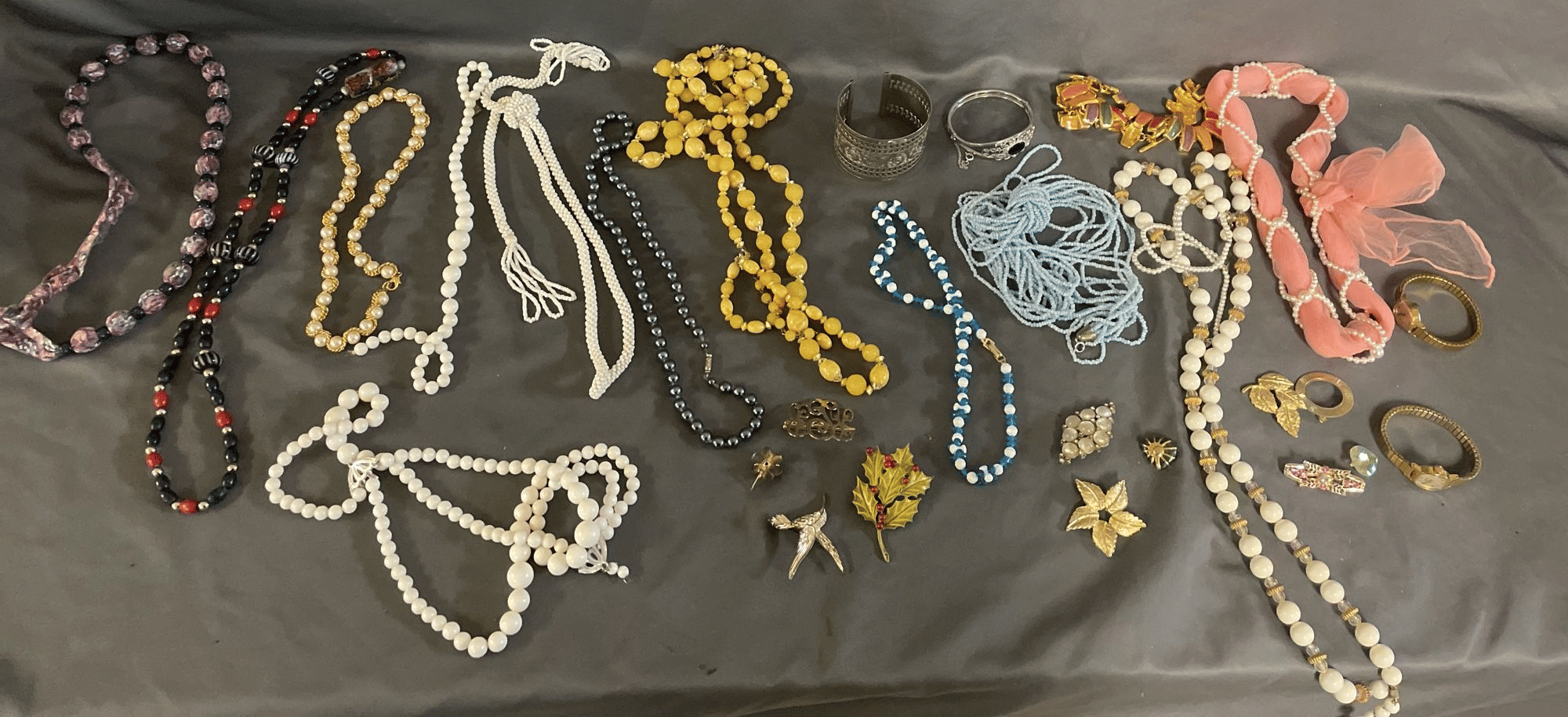 1828 Accordion Fan Assortment, Small Hand Bag, Costume Jewelry Necklace, Wood Jewelry Box