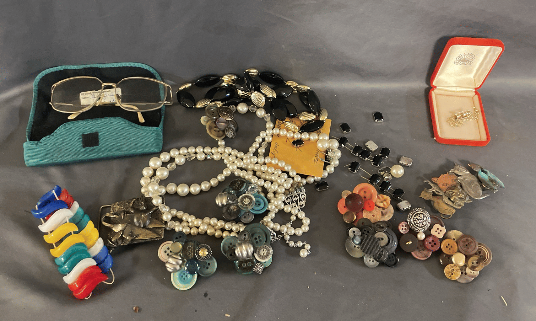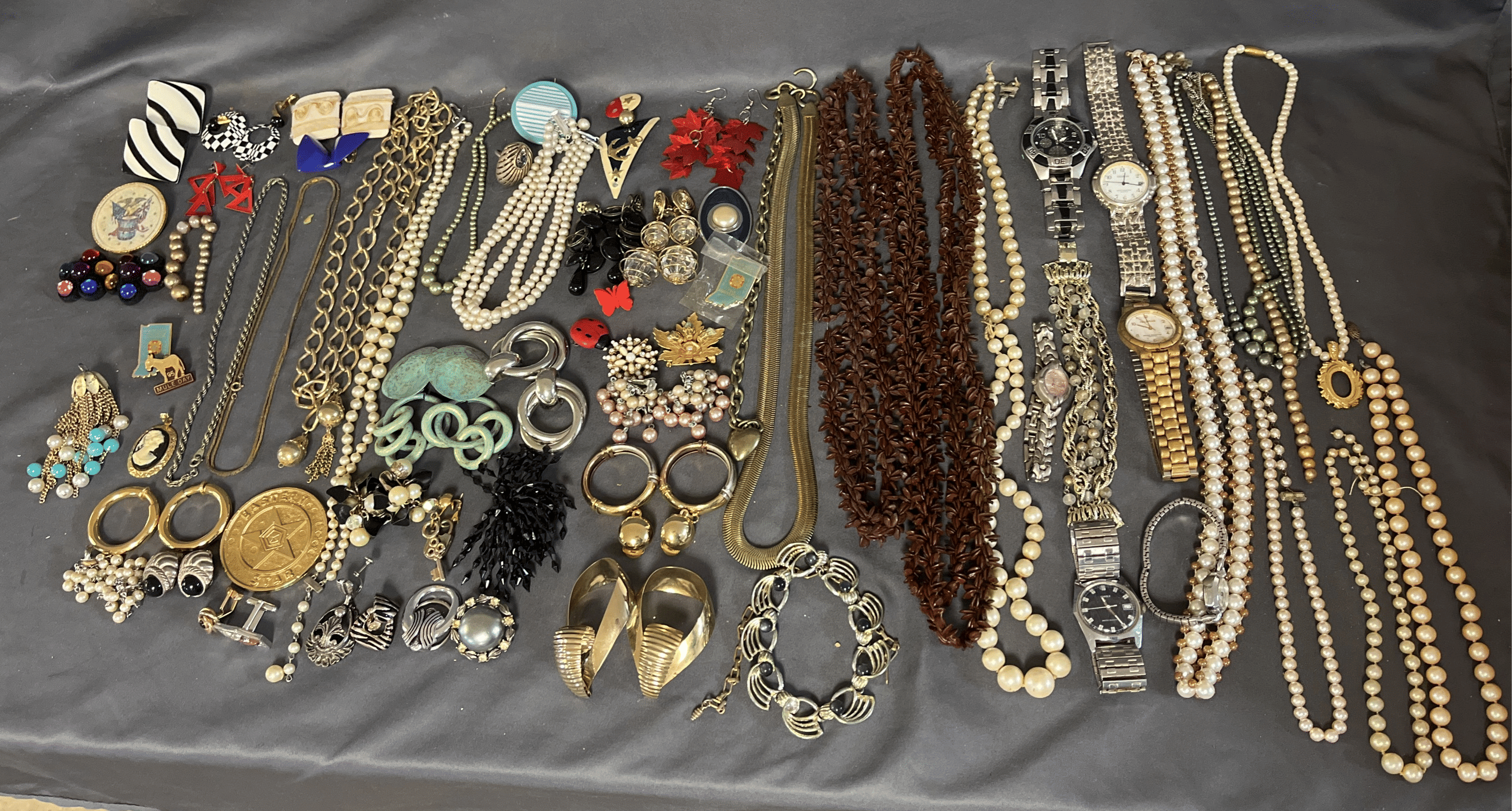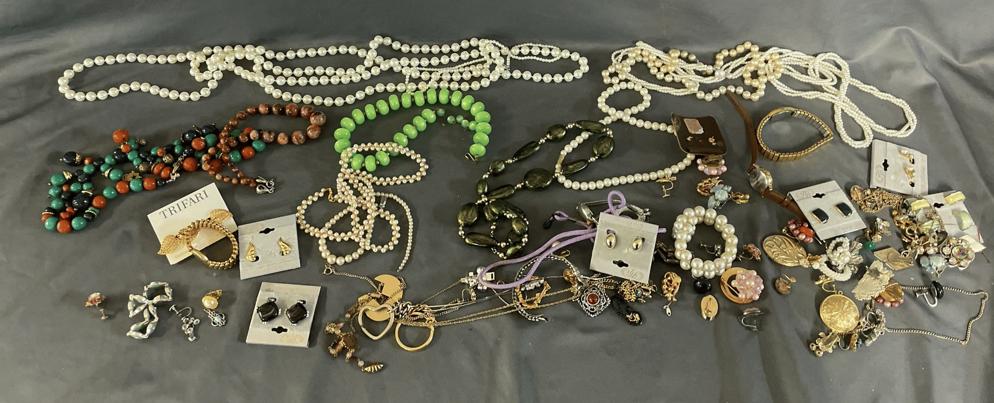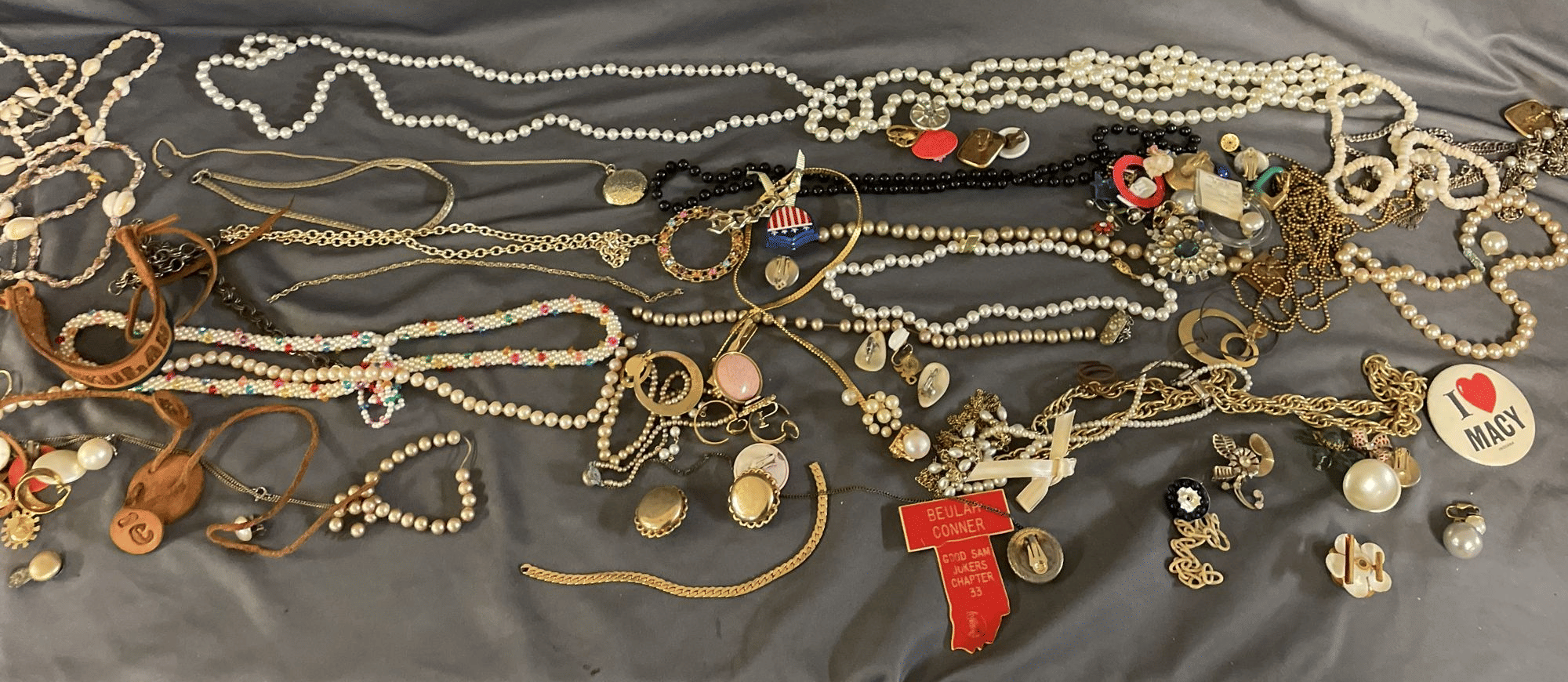 1828 Accordion Fan Assortment, Small Hand Bag, Costume Jewelry Necklace, Wood Jewelry Box