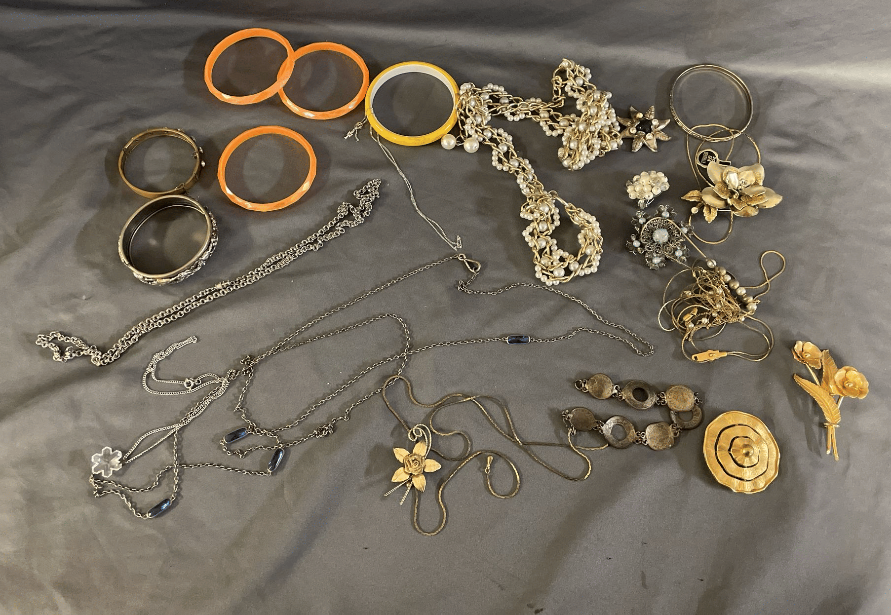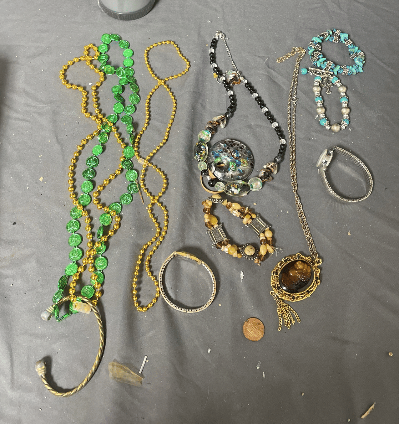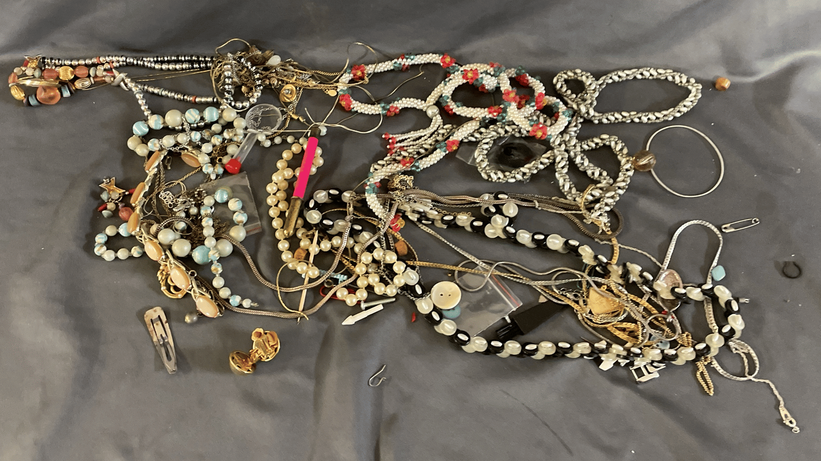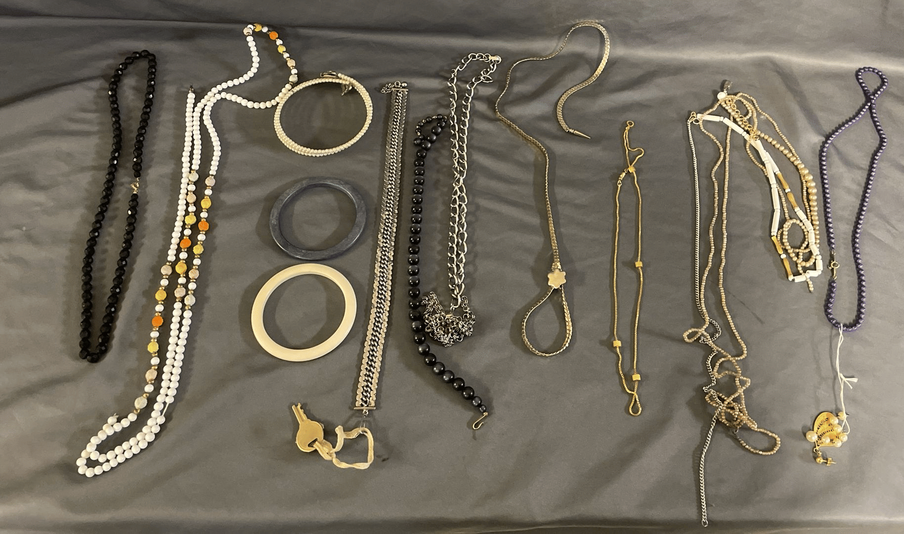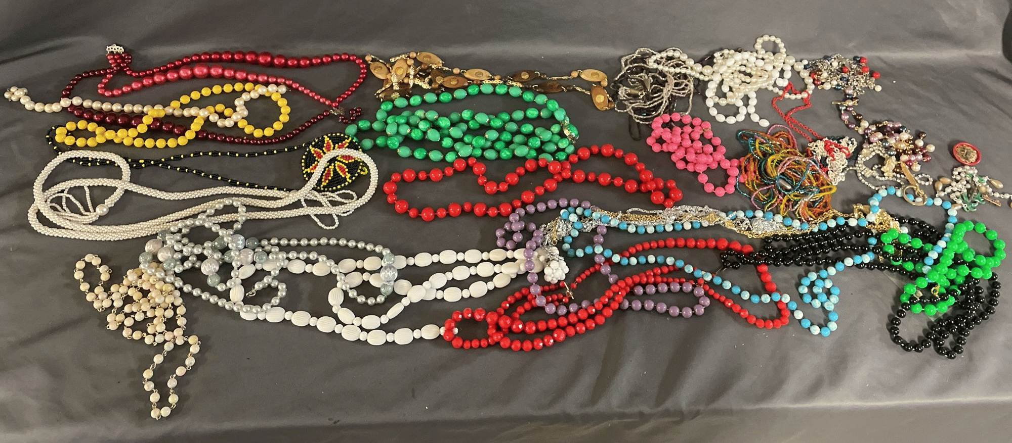 1828 Accordion Fan Assortment, Small Hand Bag, Costume Jewelry Necklace, Wood Jewelry Box