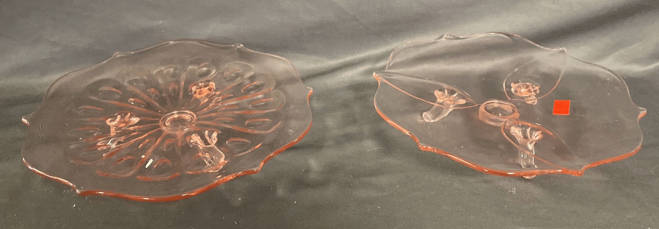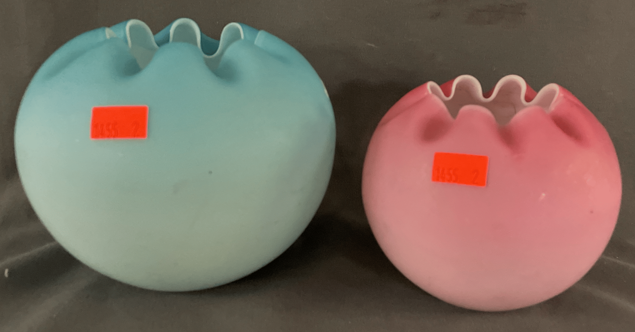1855 Satin Blown Case Edge Rose Bowls (1) Blue 5", (1) Pink 4"