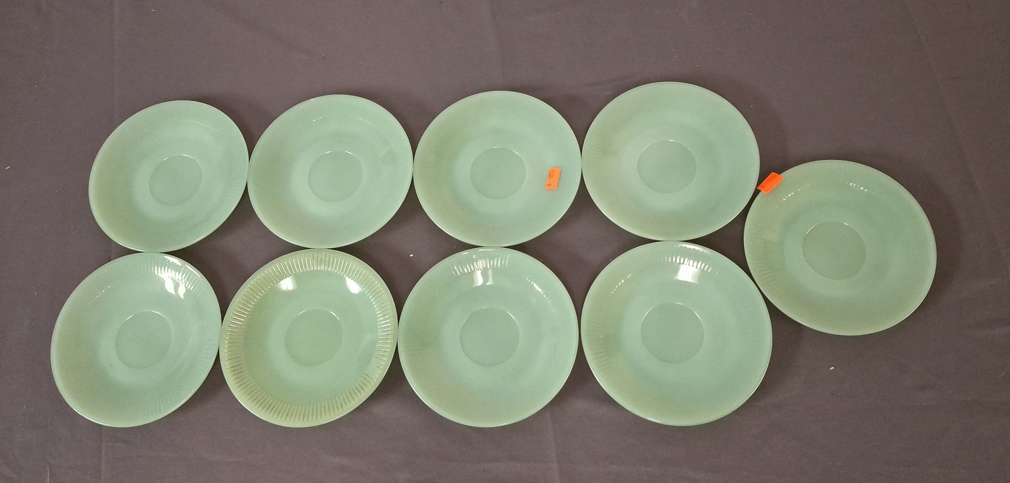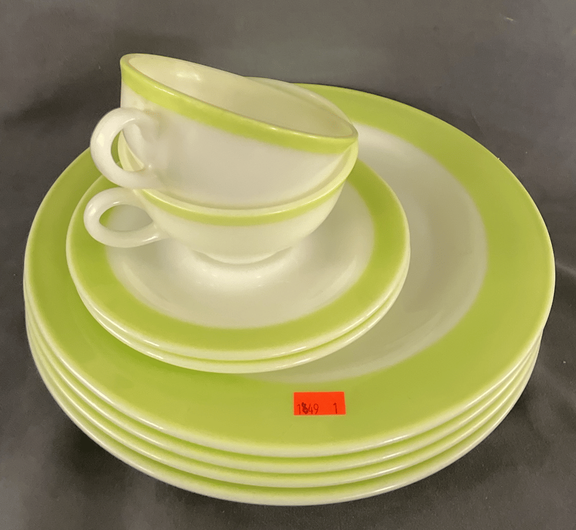 1849 Pyrex Lime Green Rimmed (2) Tea cups & Saucer, (4) Plates 10”