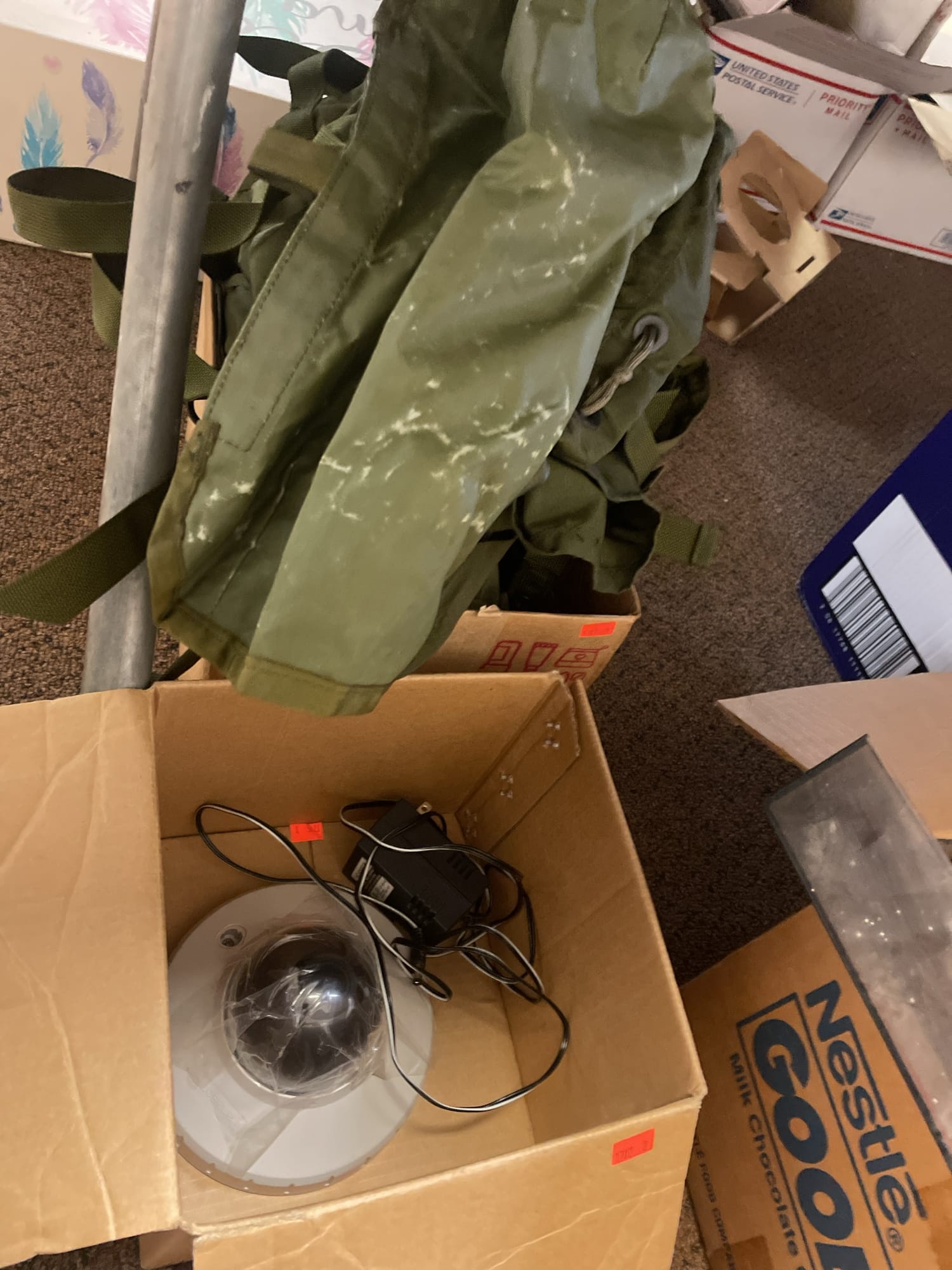 1702 Green tactical backpack, Panasonic color CCTV camera model no. WVCF212