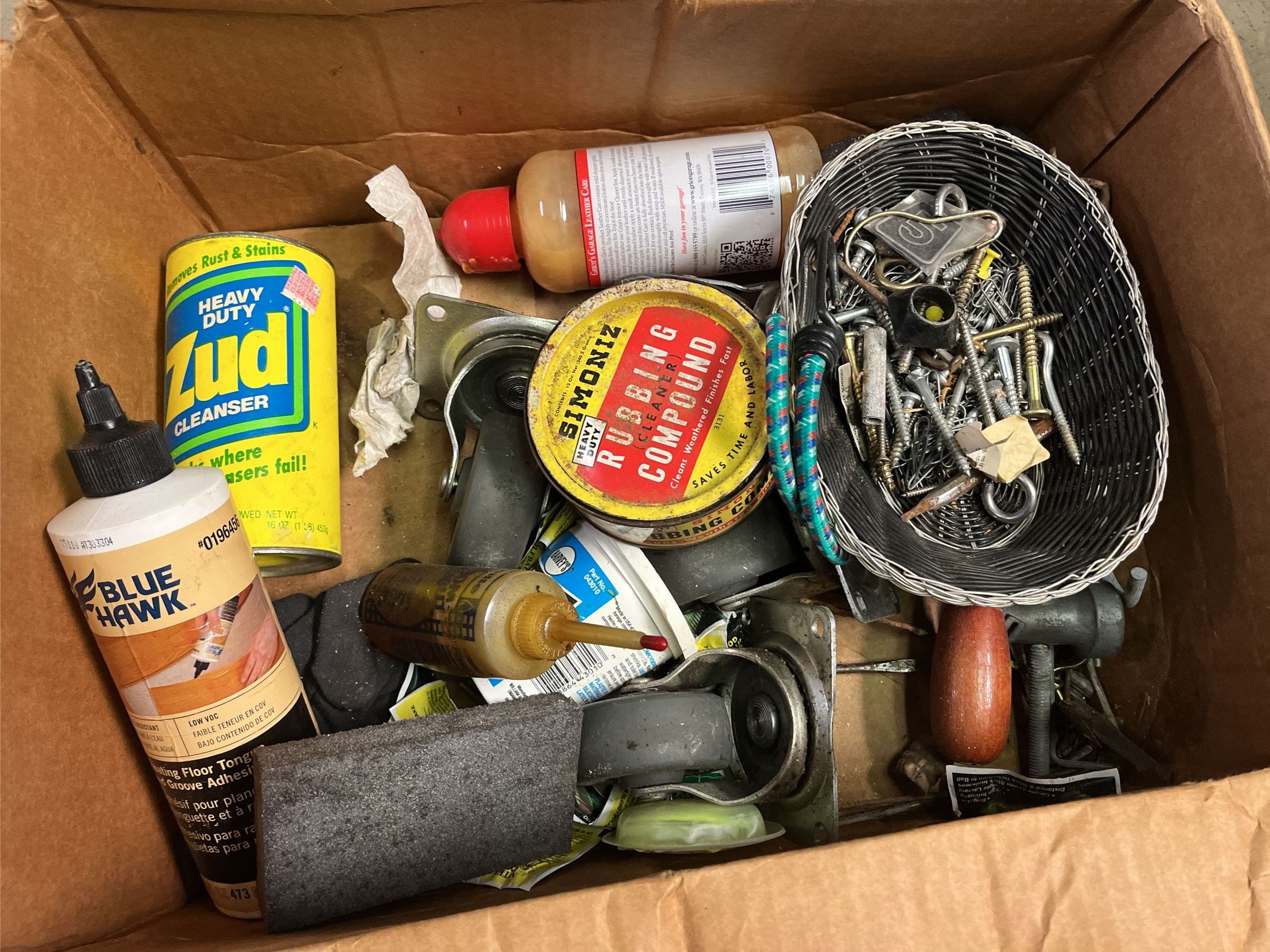 1717 Heavy duty Zud Cleanser, Blue Hawk Floating Floor Tongue and Groove Adhesive, Screw Assortment, Small Wicker Basket
