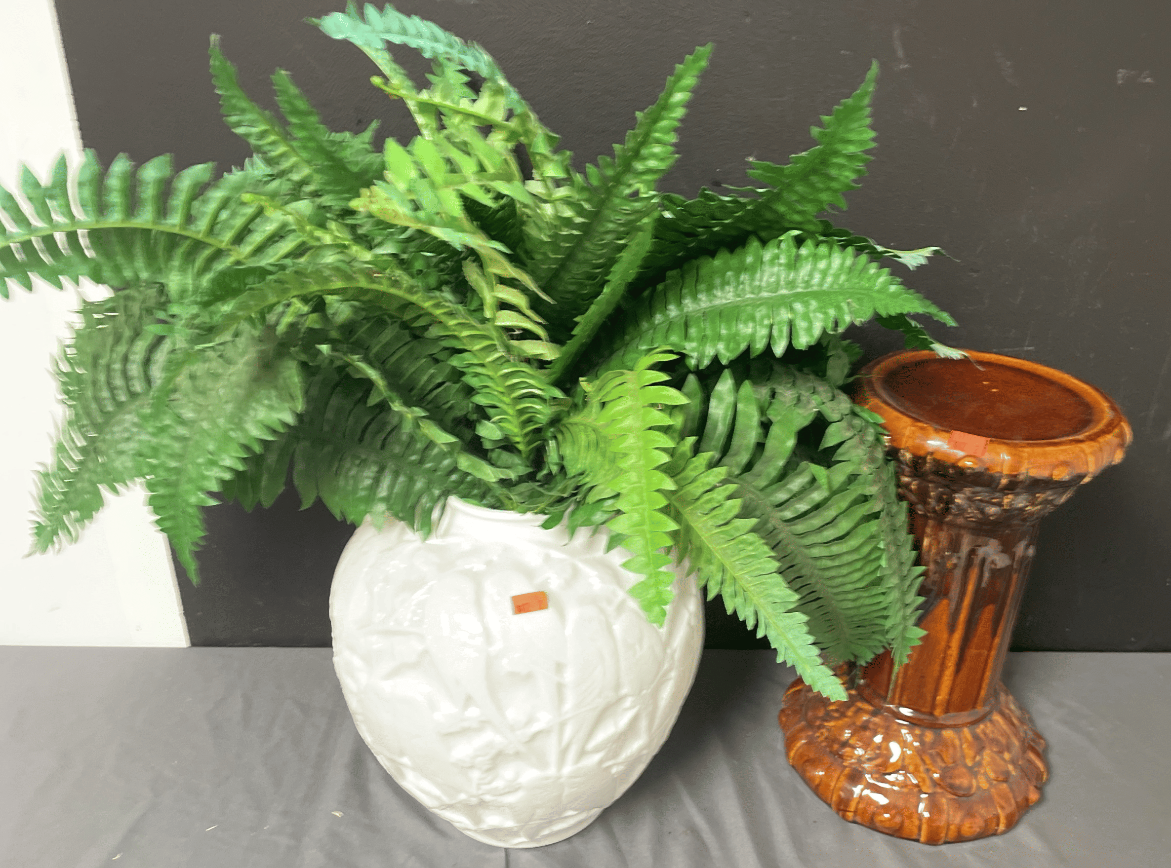 1812 Jardiniere Pedestal, Planter with Artificial Plant 12.5” 20”