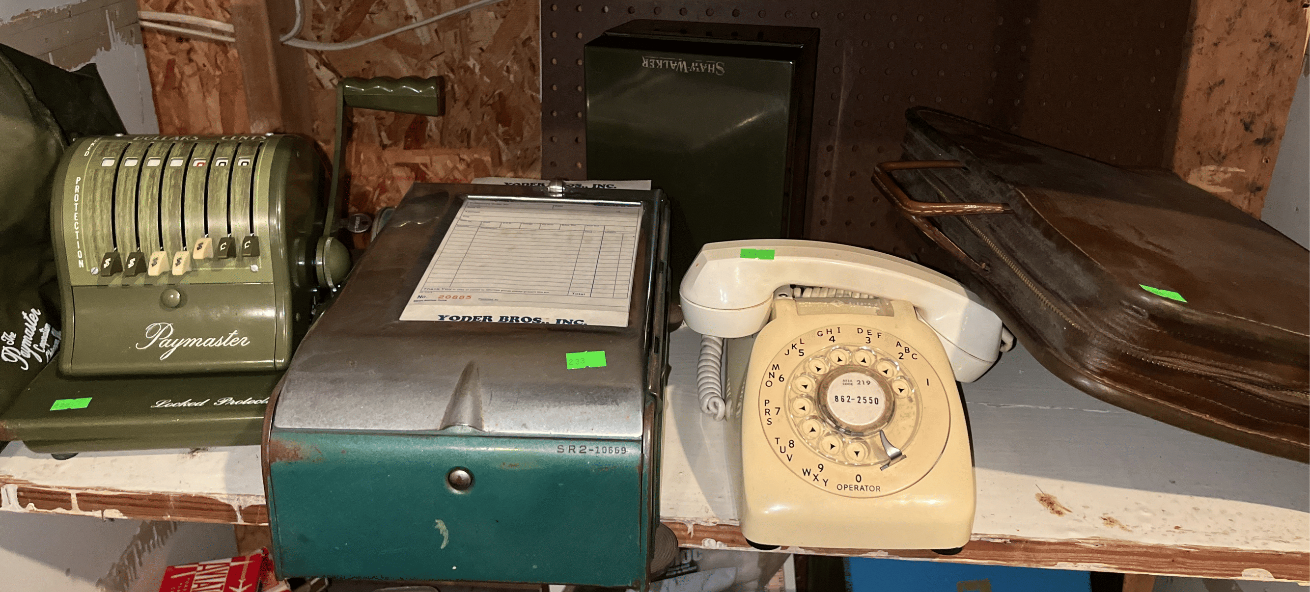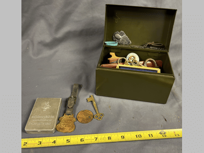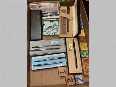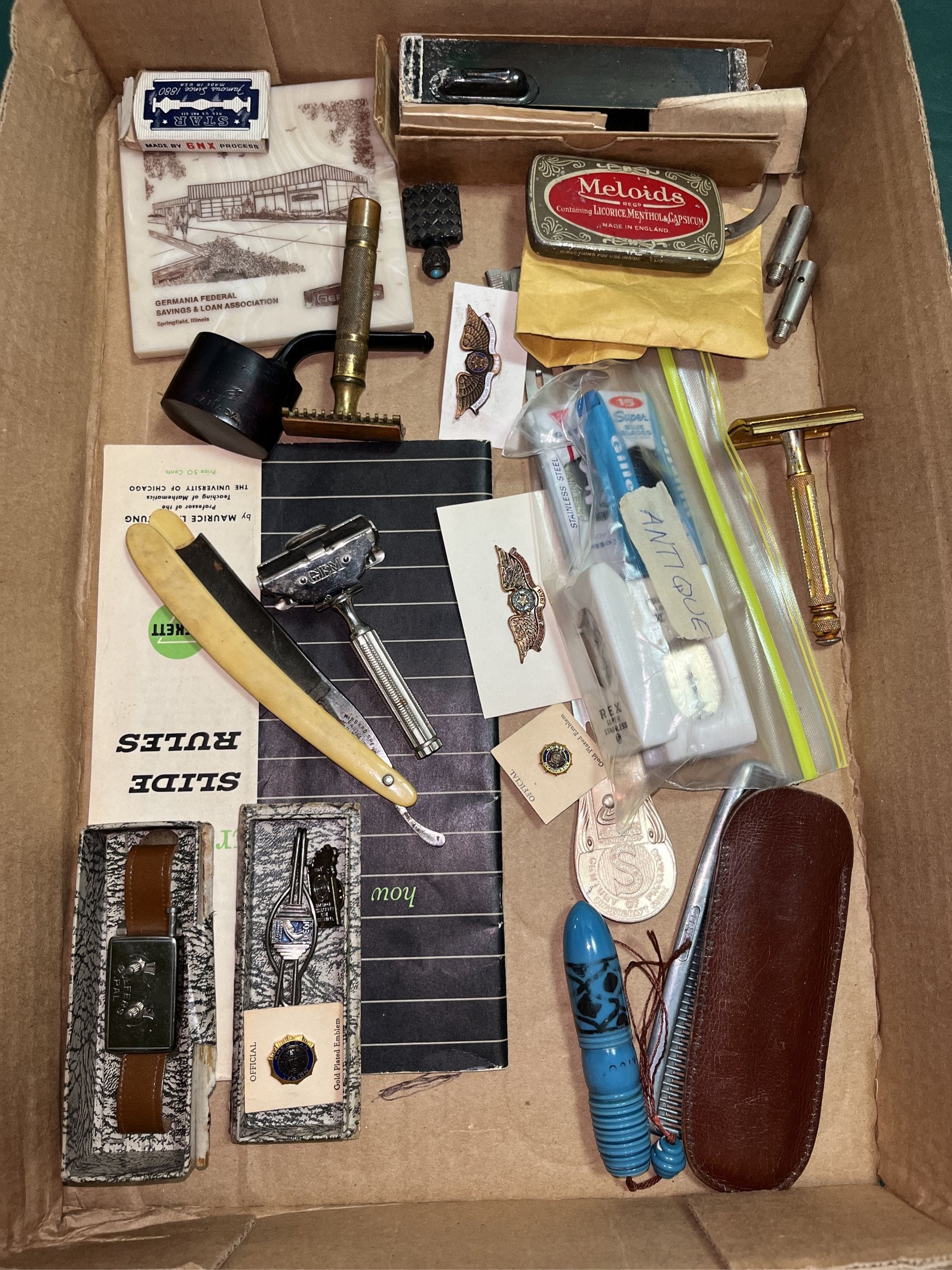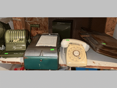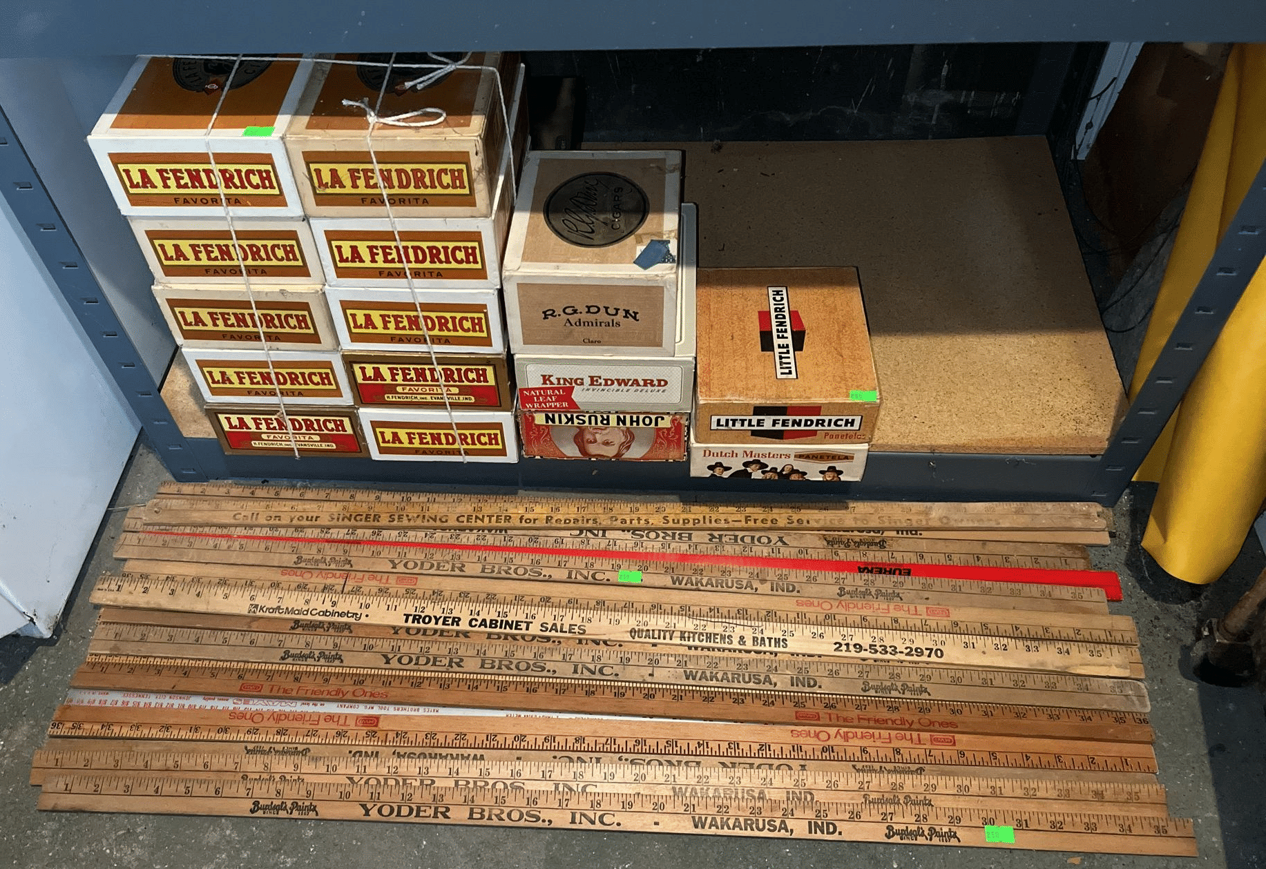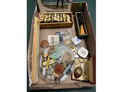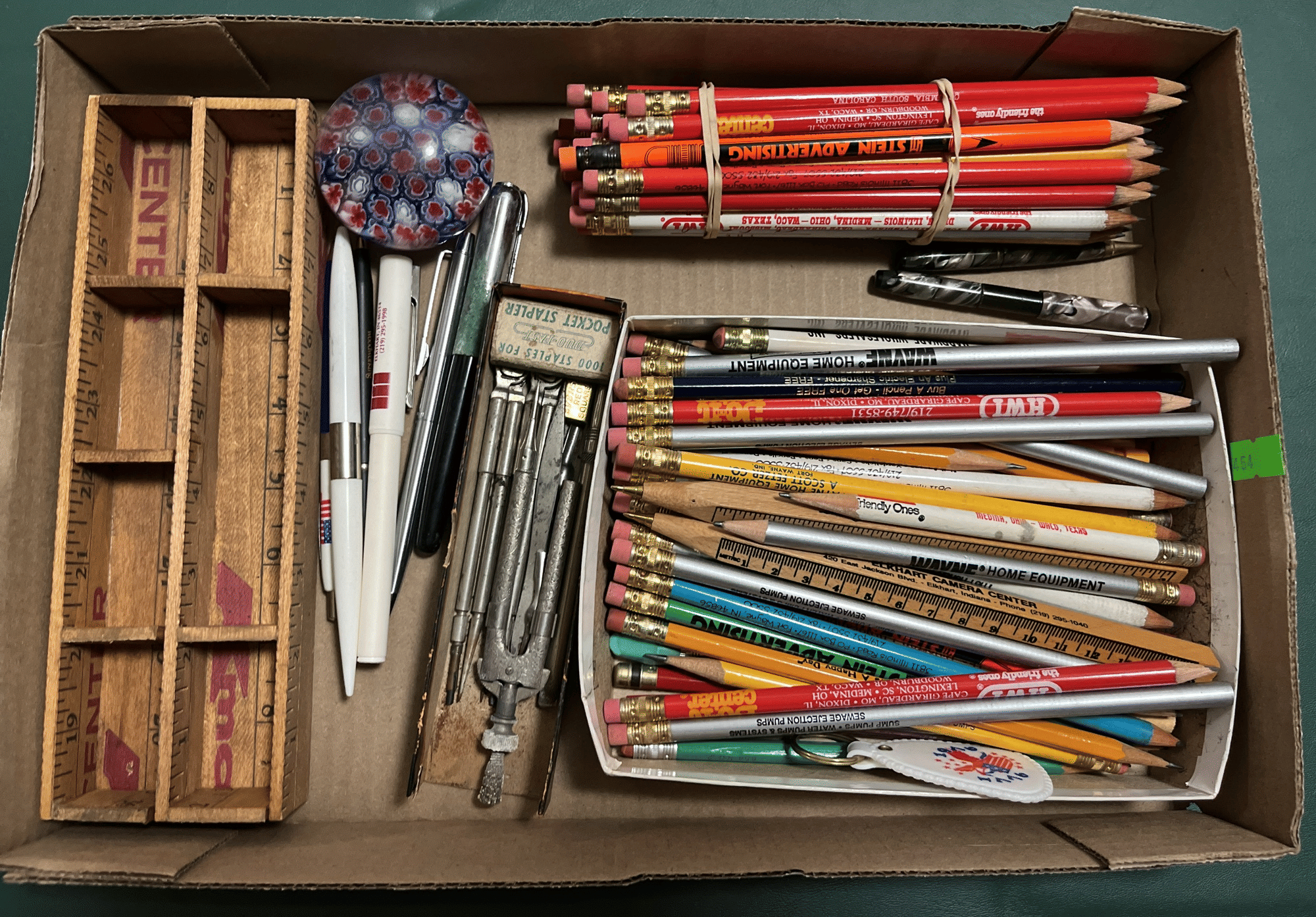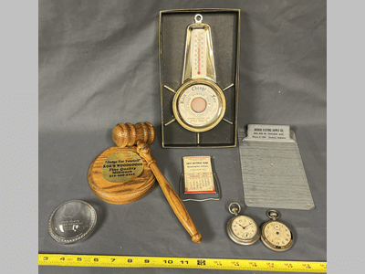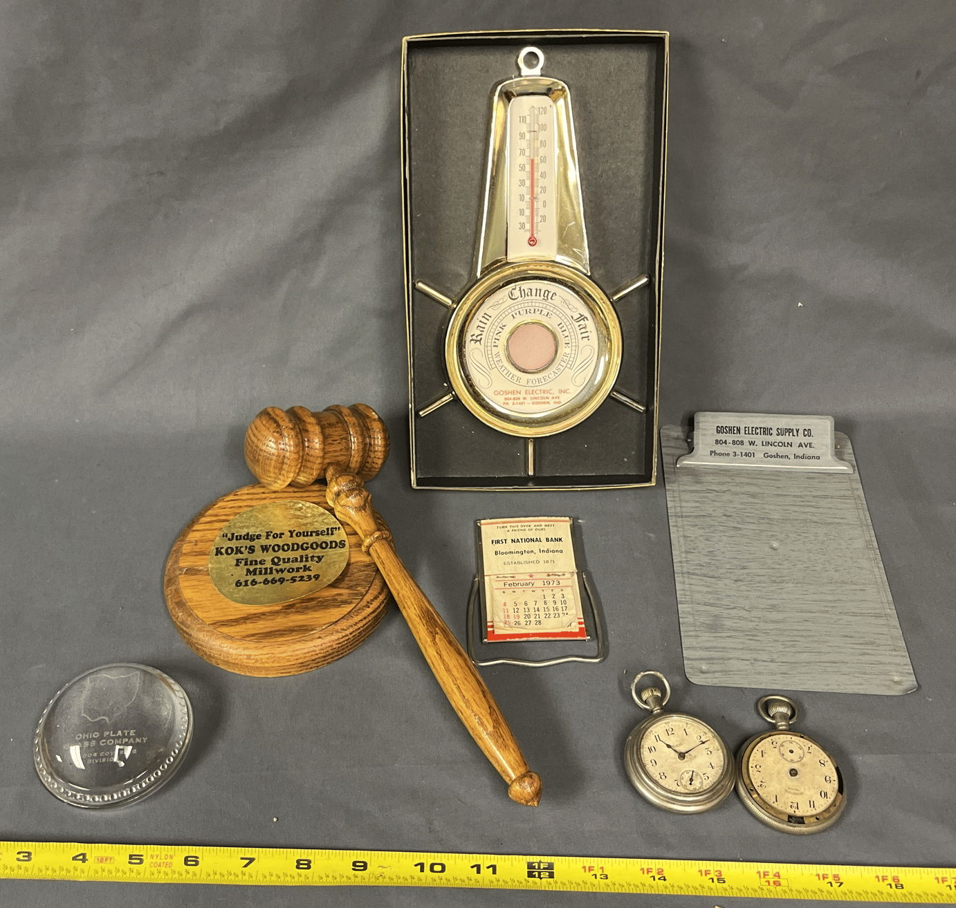 17 Goshen Electric advertising thermometer and clip board, First National Bank calendar 1973, Kok’s Woodgoods advertising gavel, Ohio Plate glass paperweight, New Haven Motor and Ingersoll pocket watches need repaired