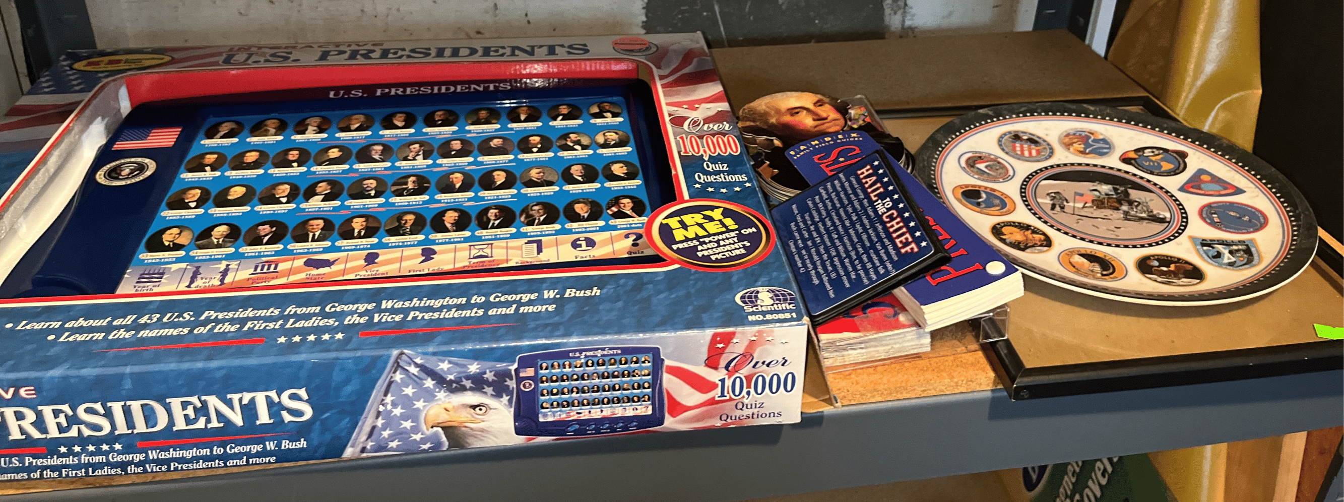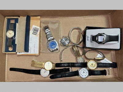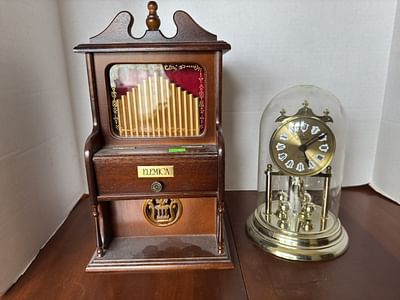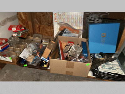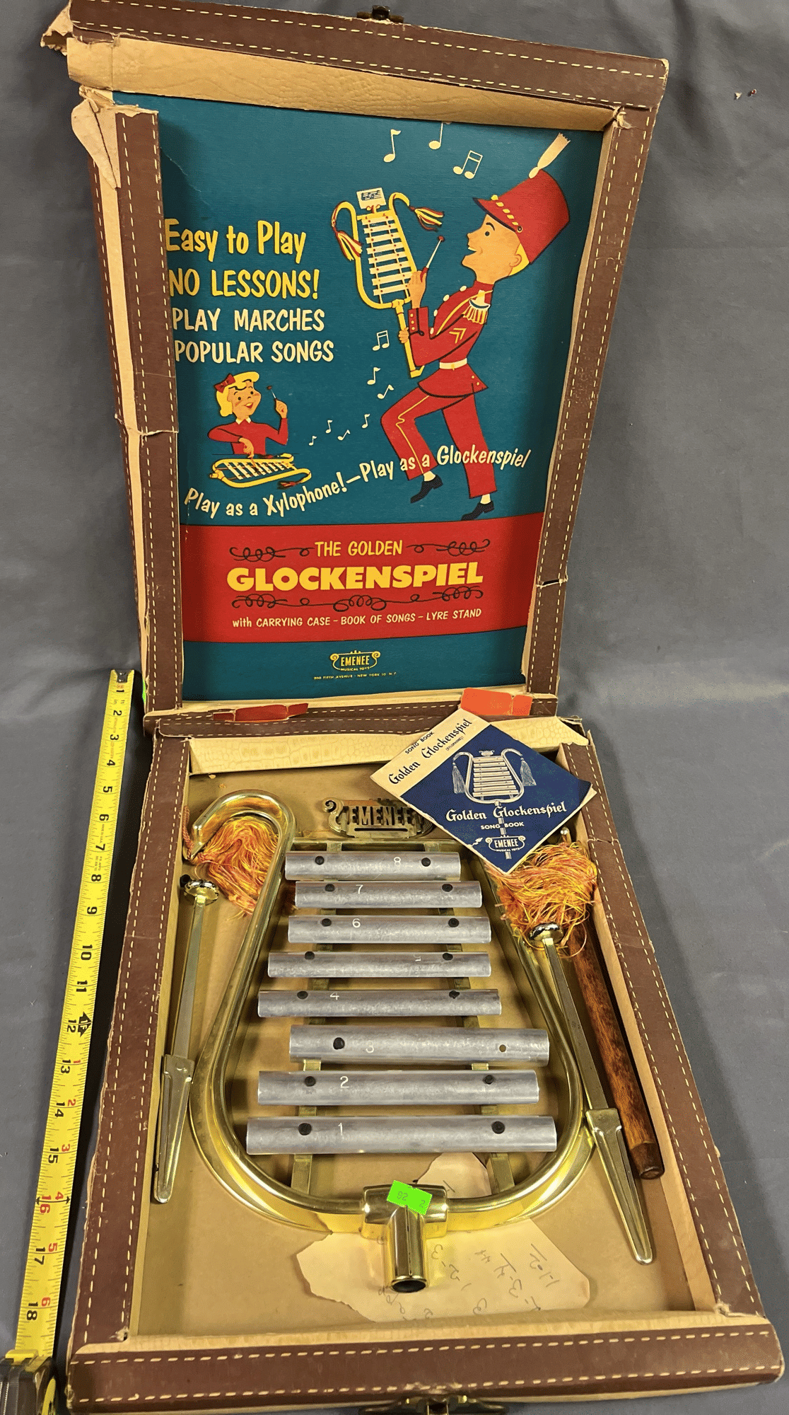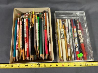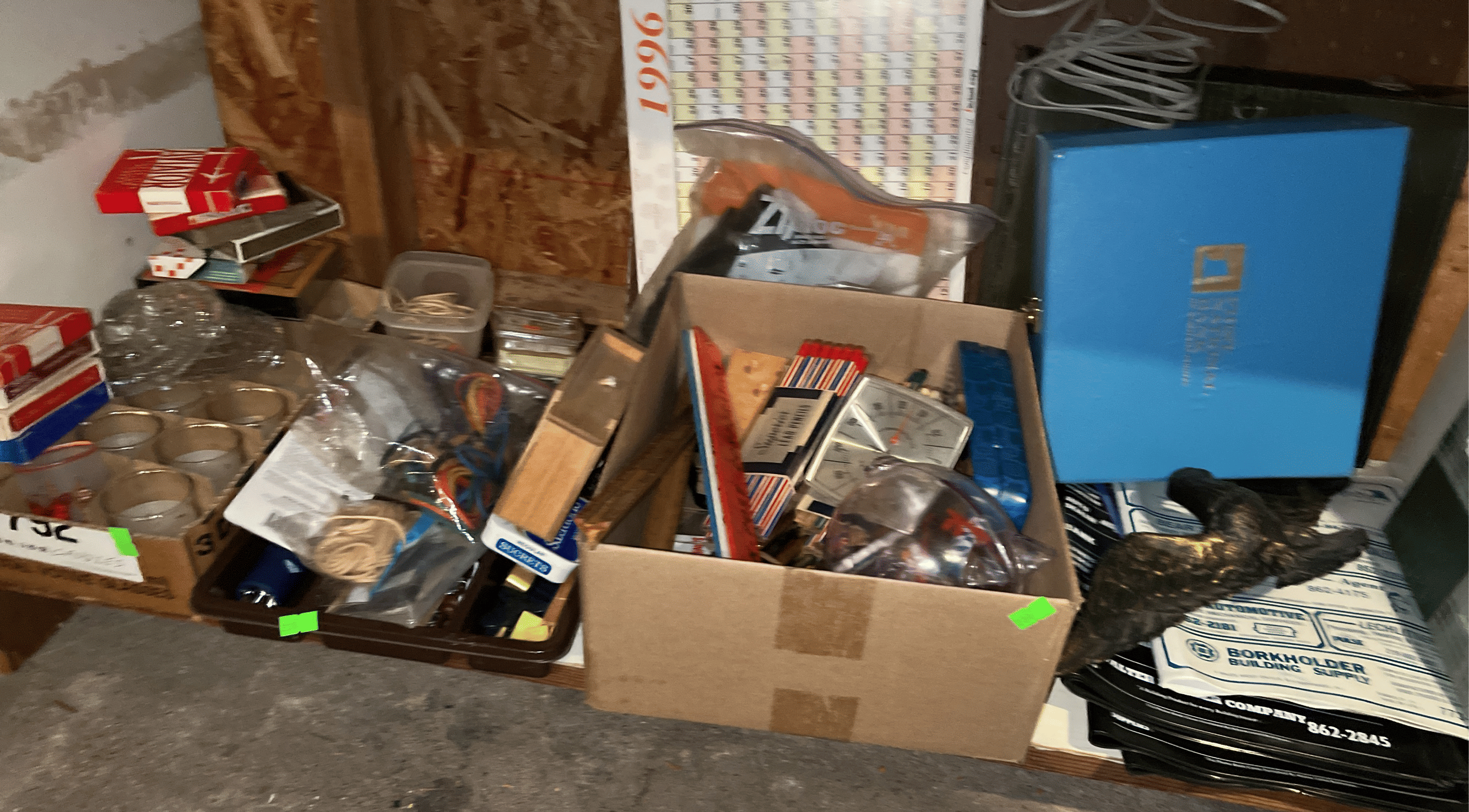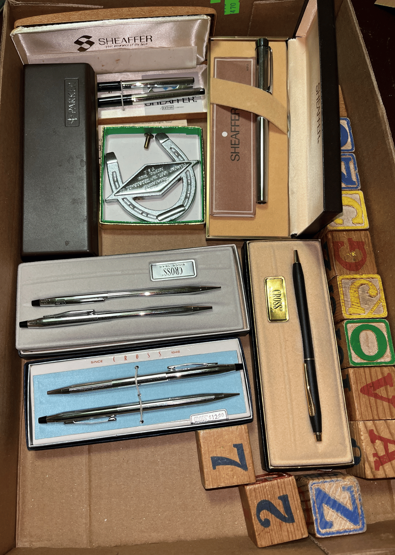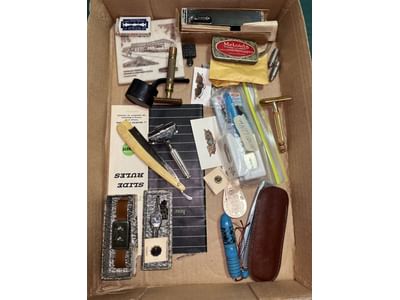 17 Goshen Electric advertising thermometer and clip board, First National Bank calendar 1973, Kok’s Woodgoods advertising gavel, Ohio Plate glass paperweight, New Haven Motor and Ingersoll pocket watches need repaired