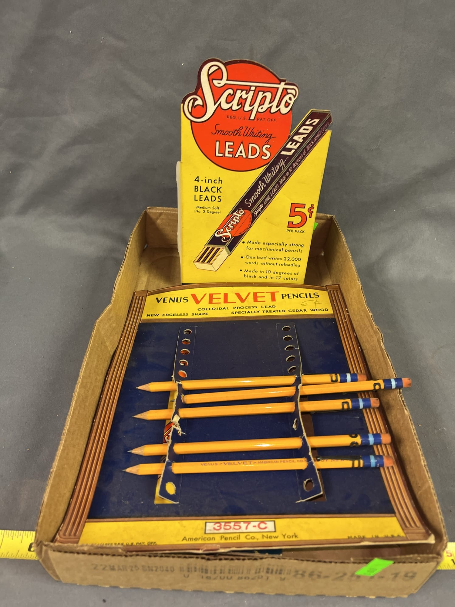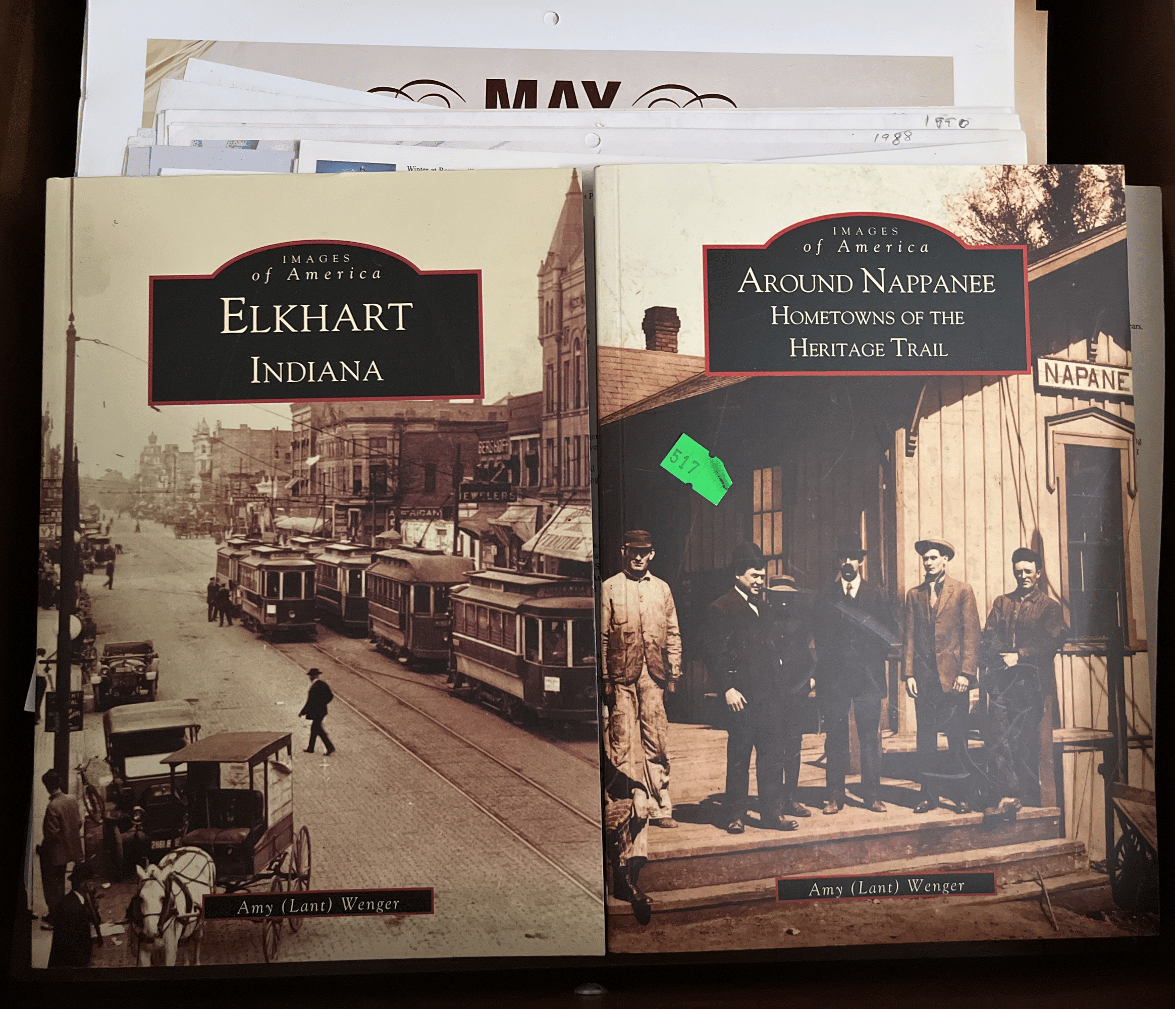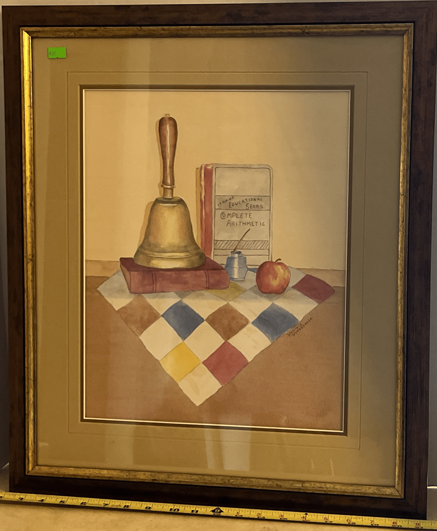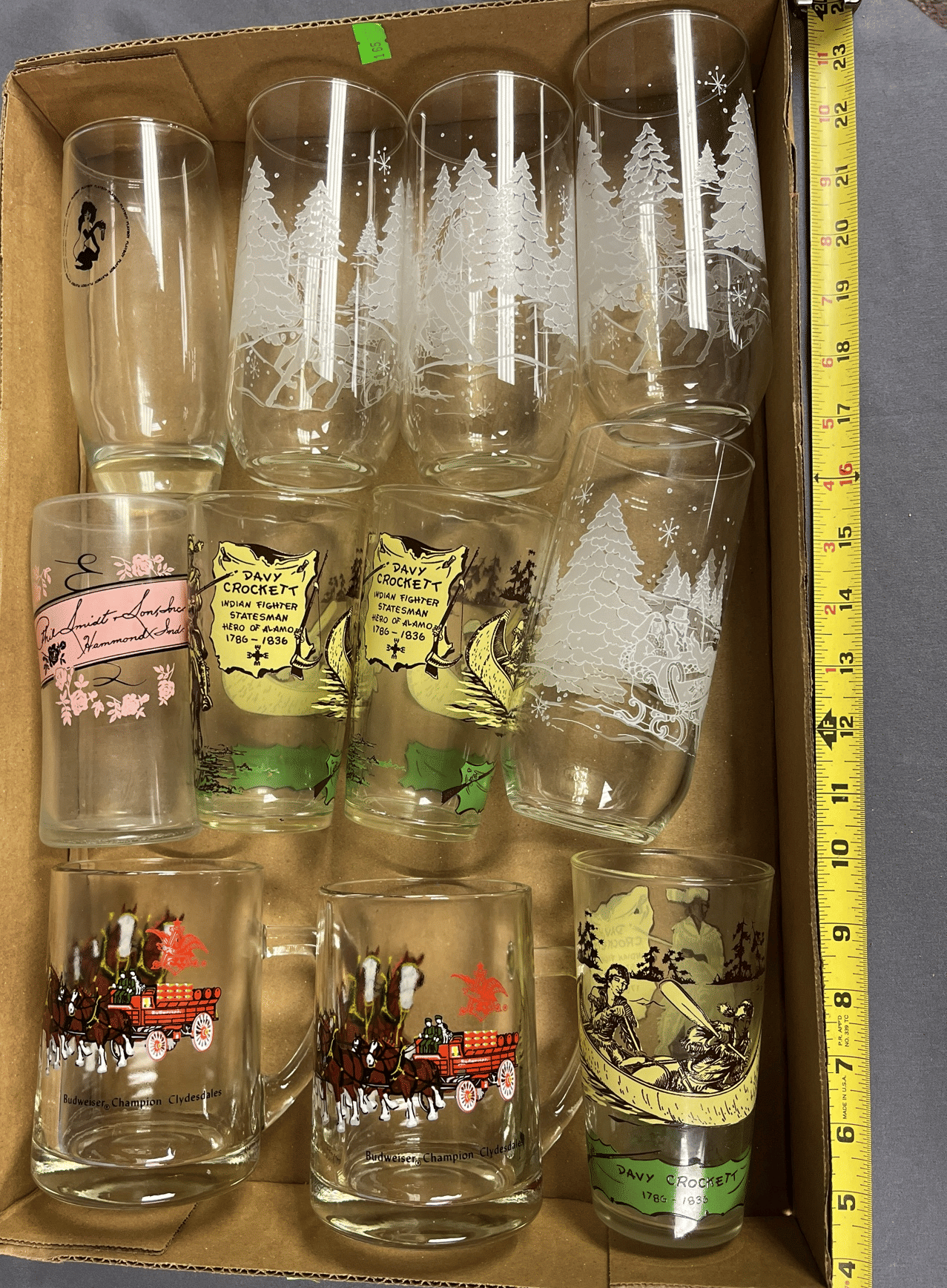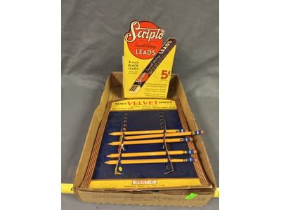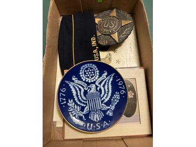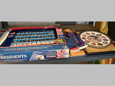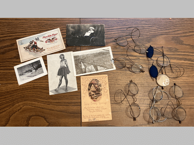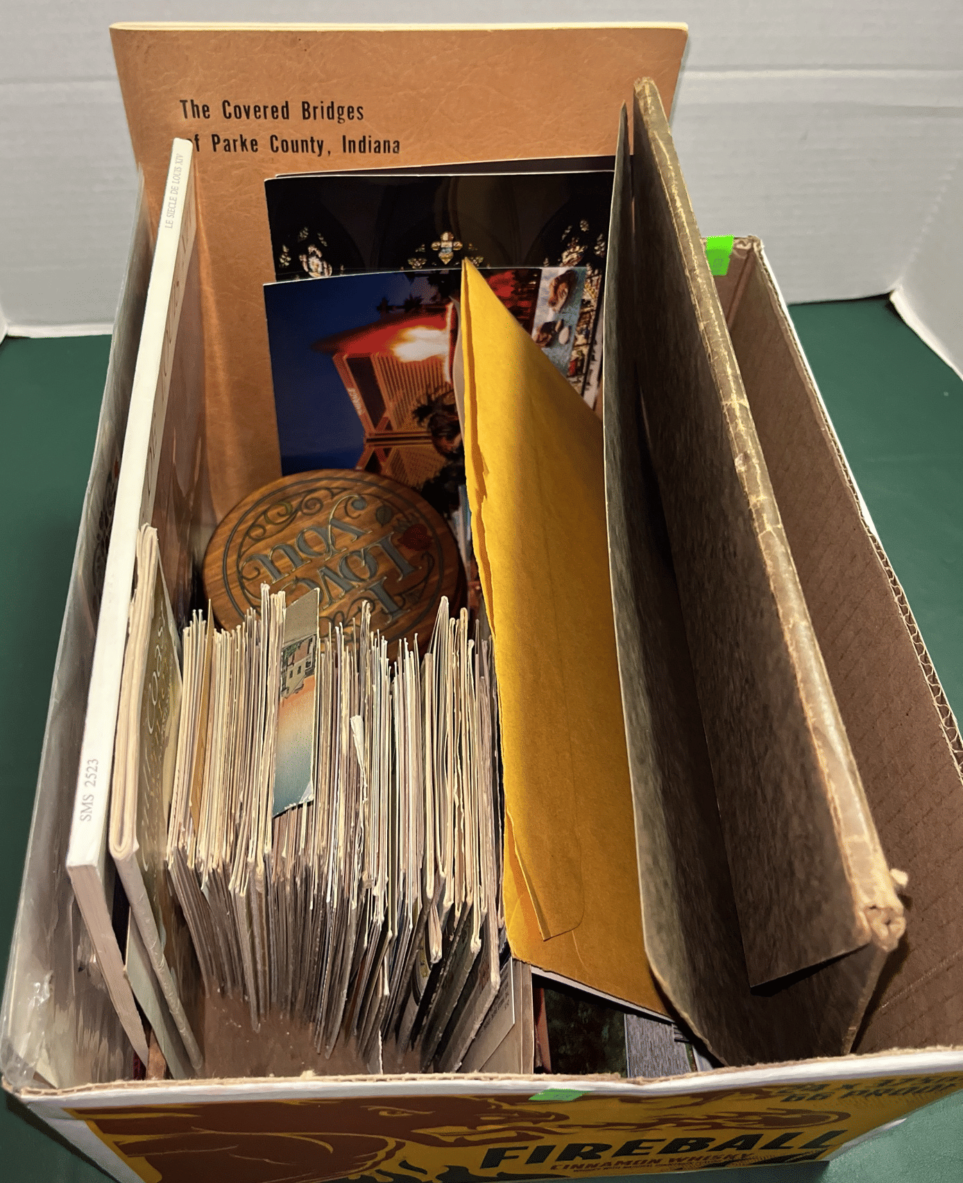 17 Goshen Electric advertising thermometer and clip board, First National Bank calendar 1973, Kok’s Woodgoods advertising gavel, Ohio Plate glass paperweight, New Haven Motor and Ingersoll pocket watches need repaired