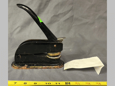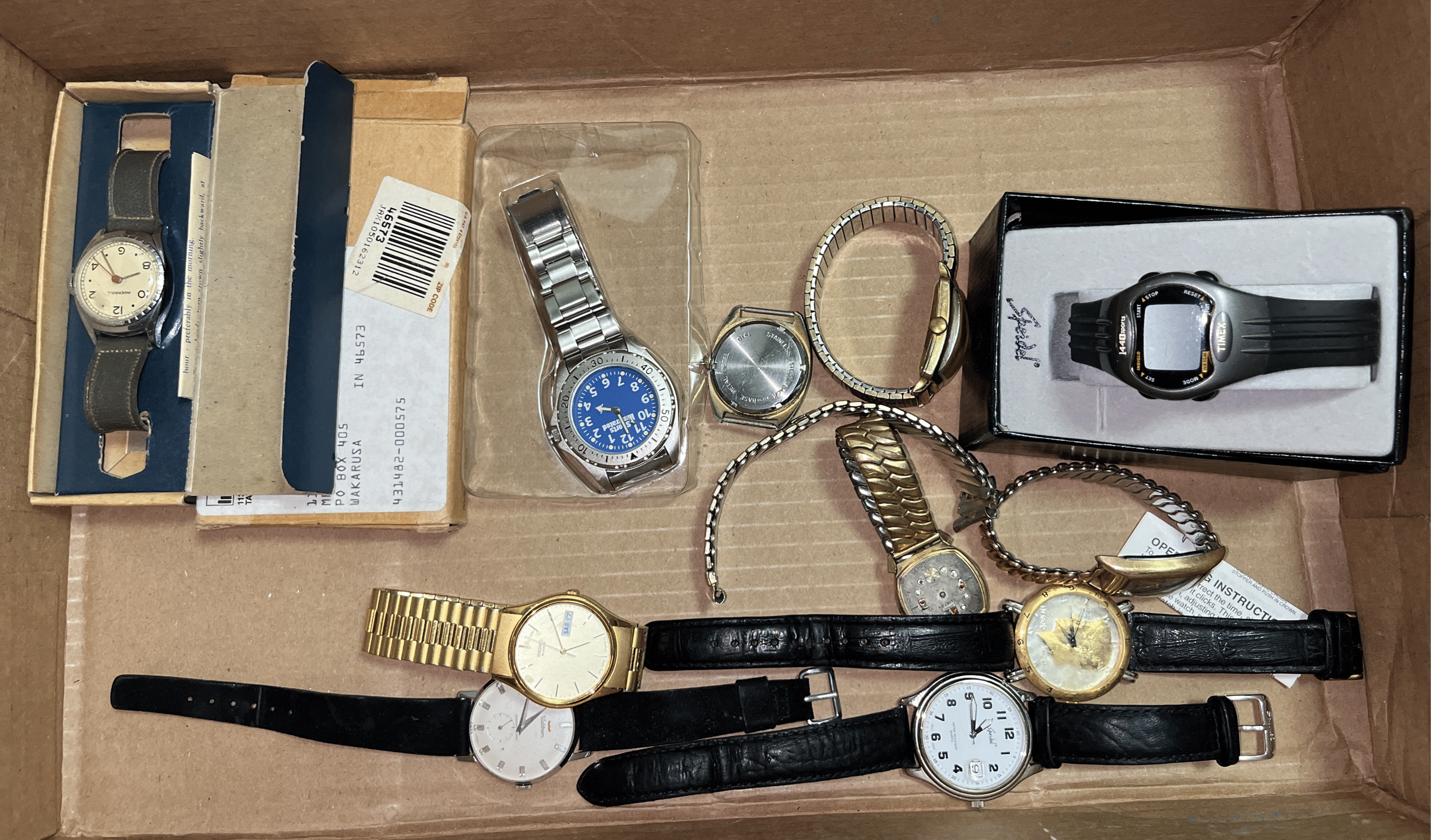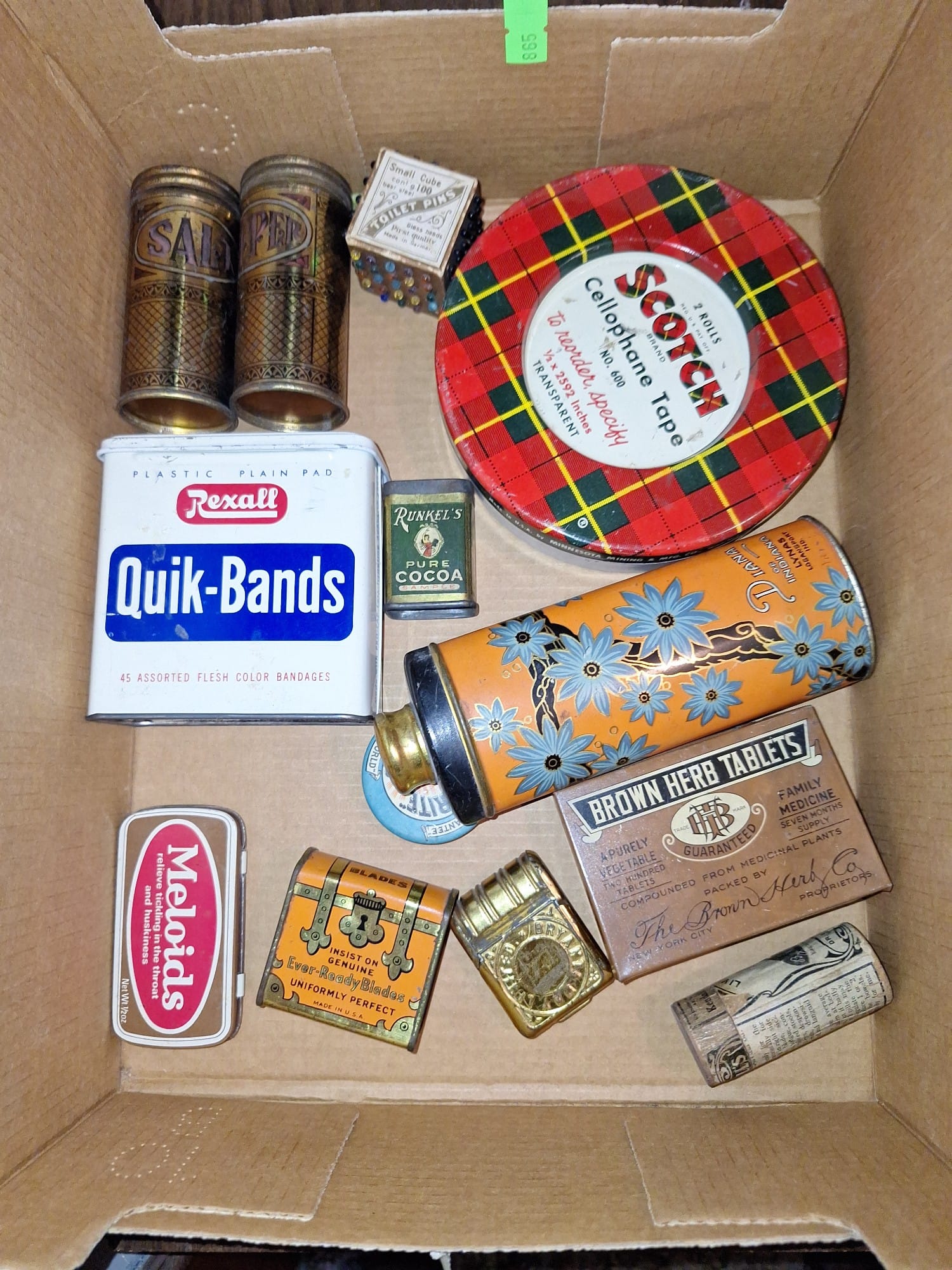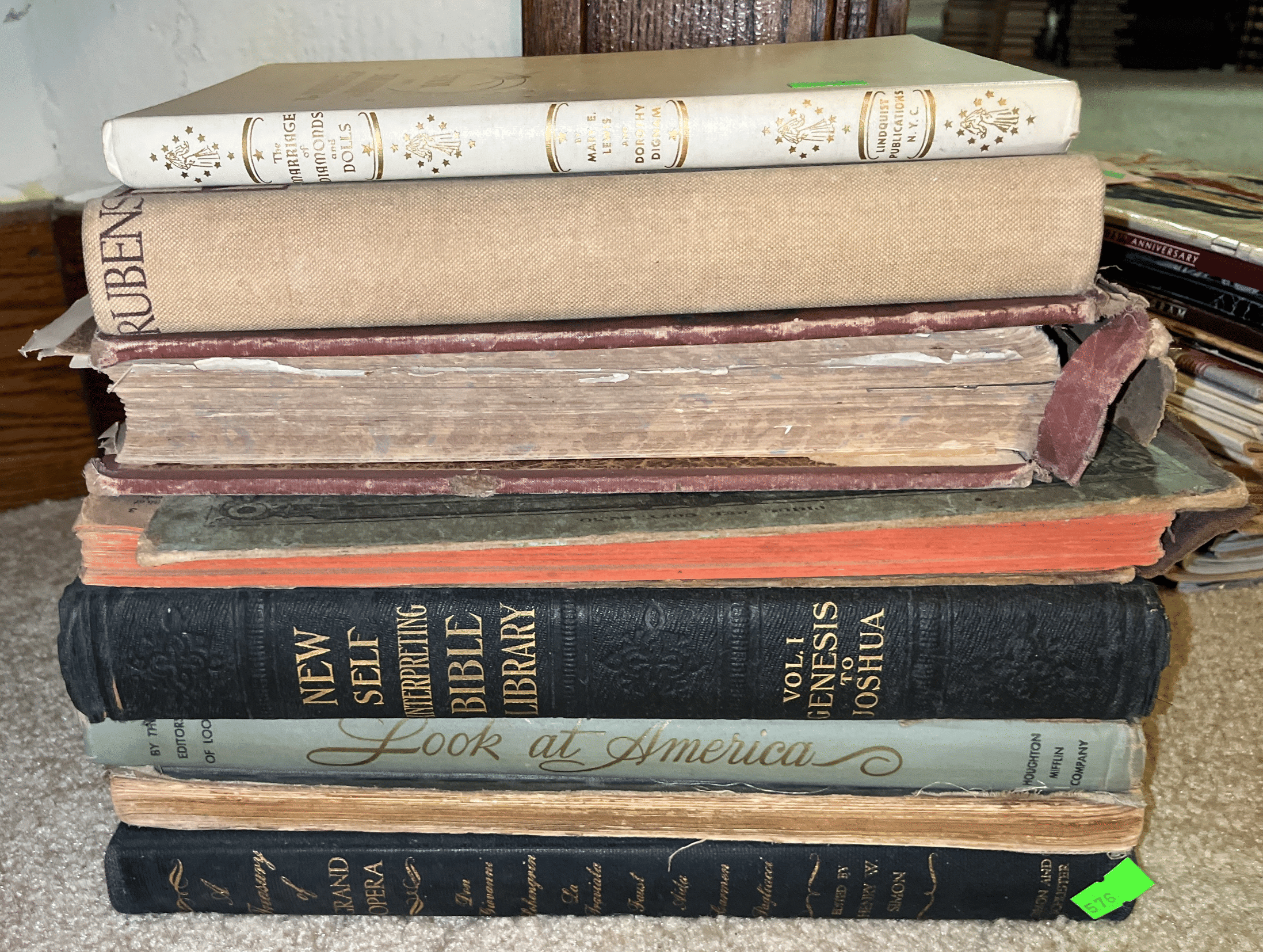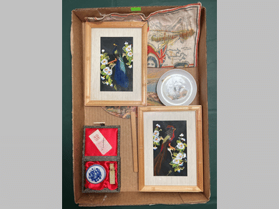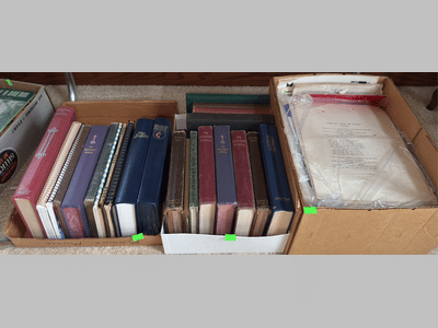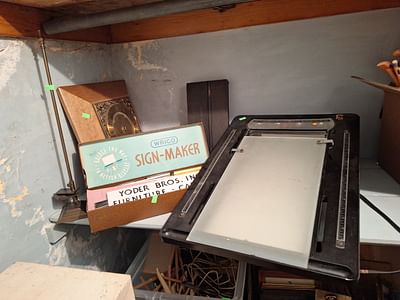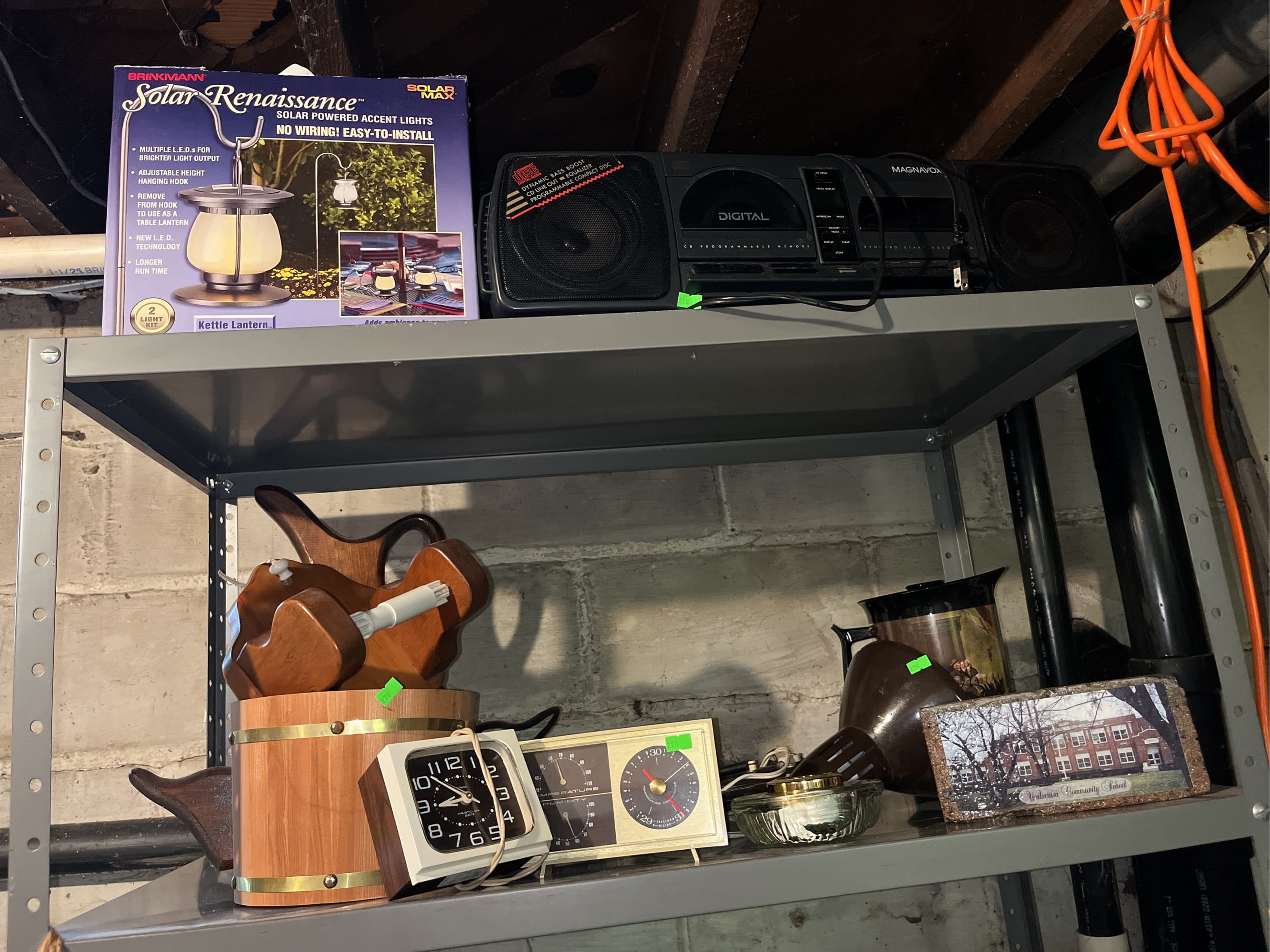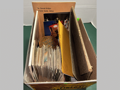 17 Goshen Electric advertising thermometer and clip board, First National Bank calendar 1973, Kok’s Woodgoods advertising gavel, Ohio Plate glass paperweight, New Haven Motor and Ingersoll pocket watches need repaired