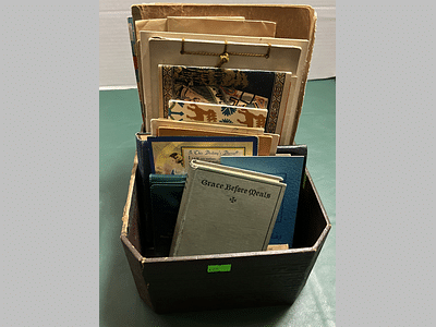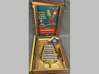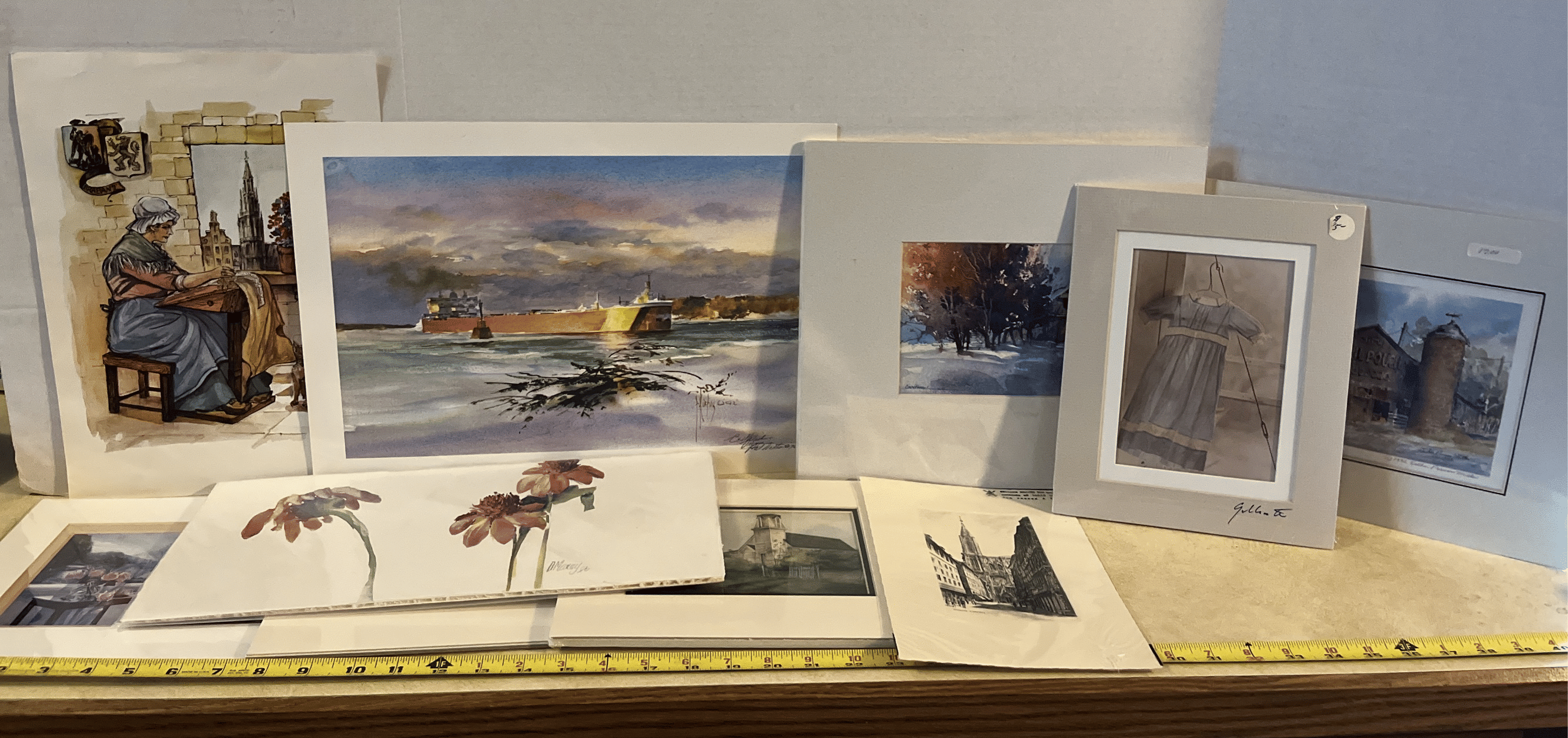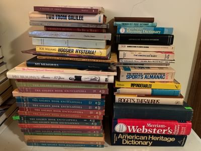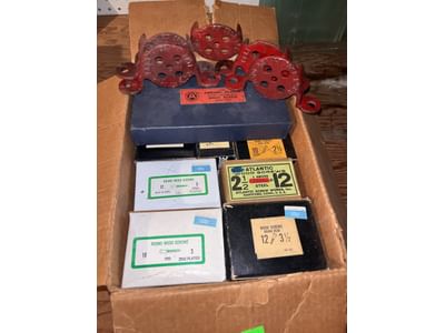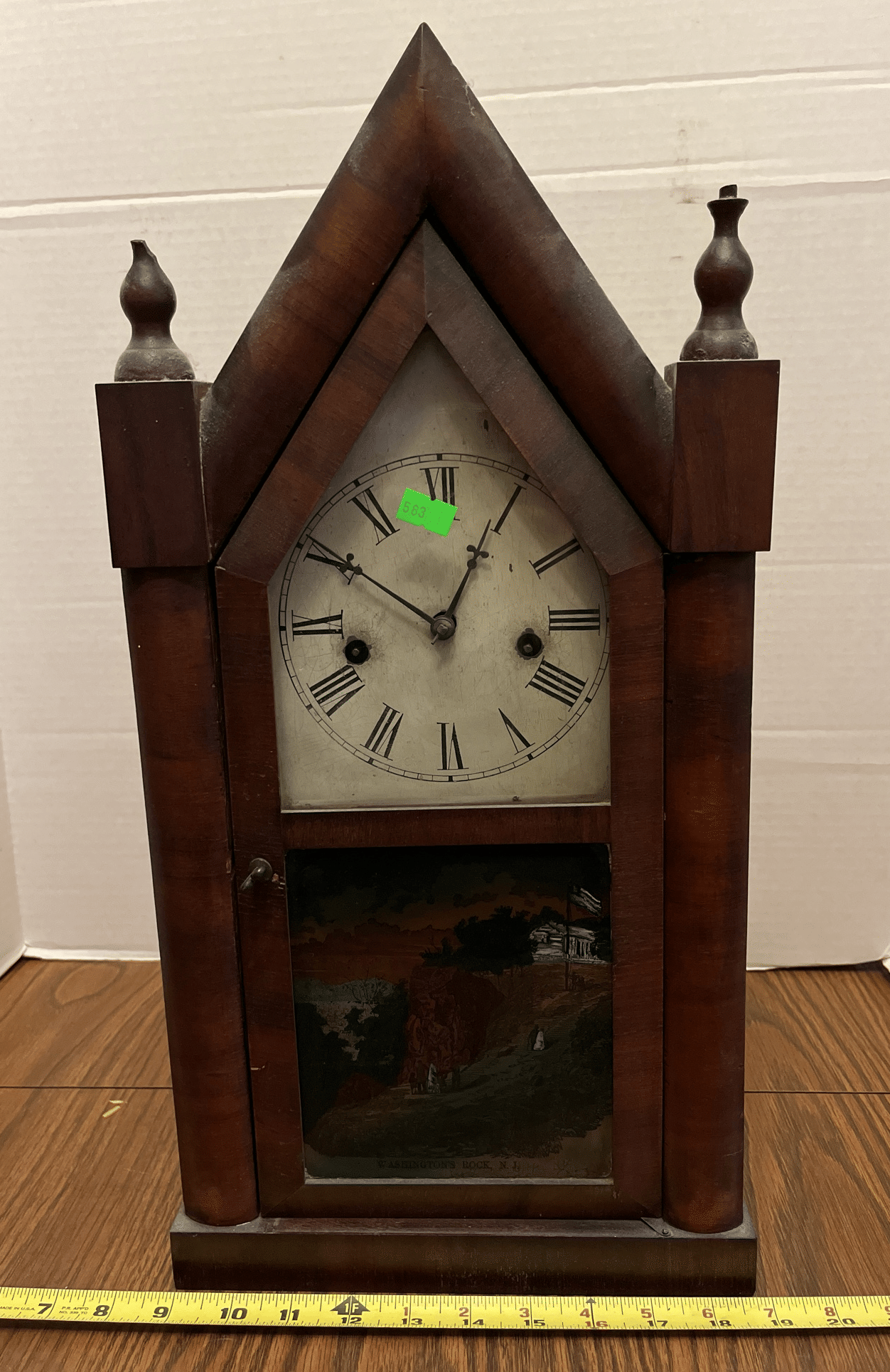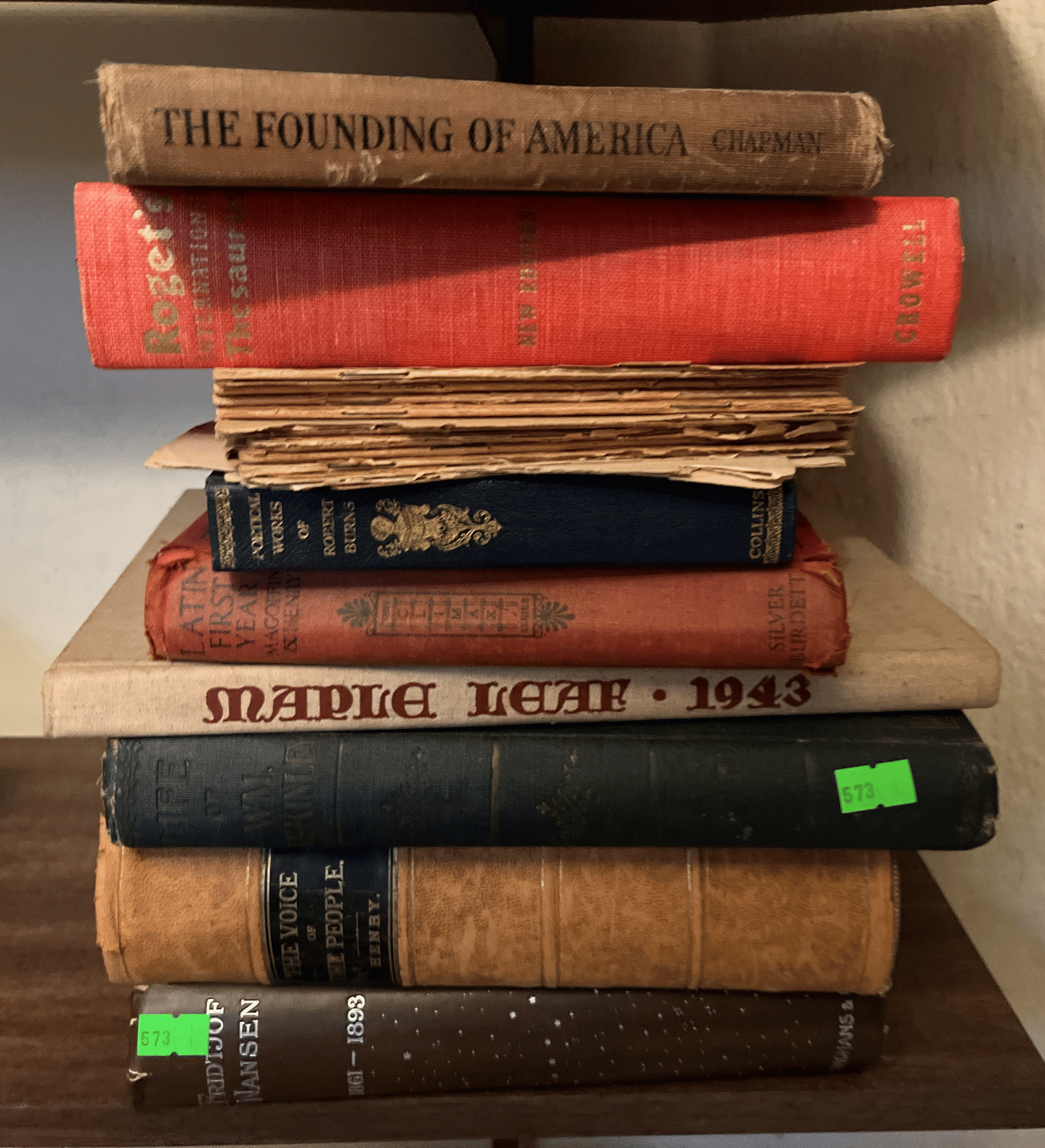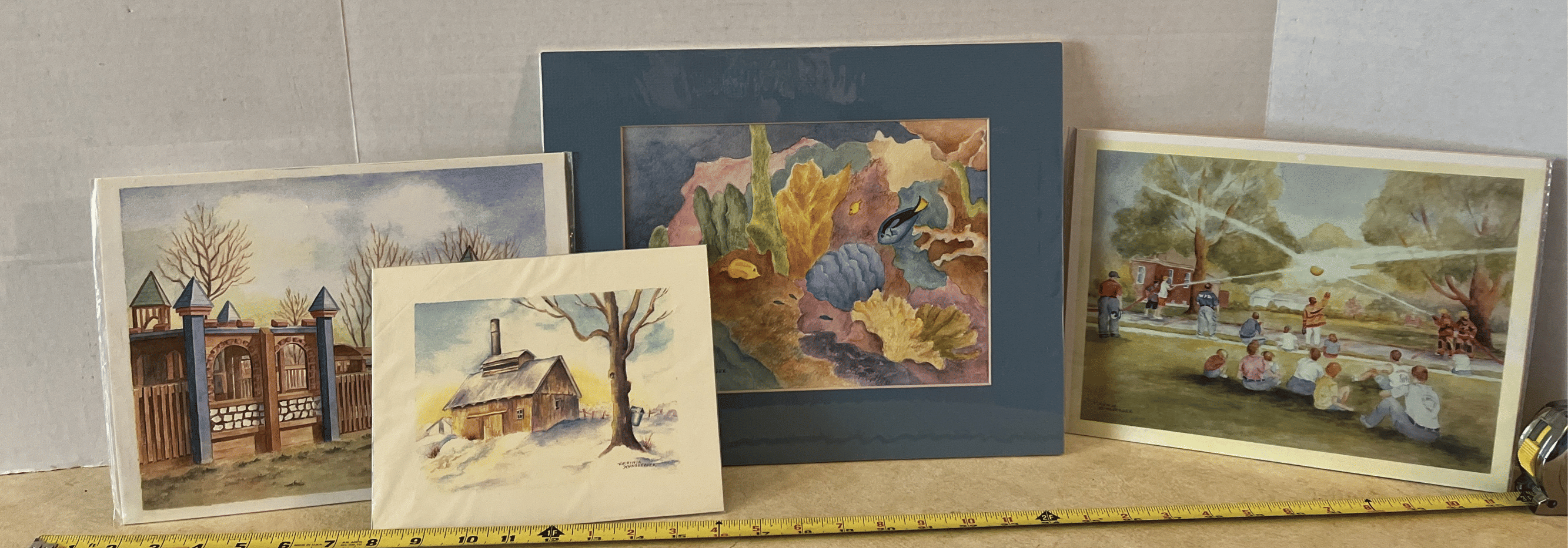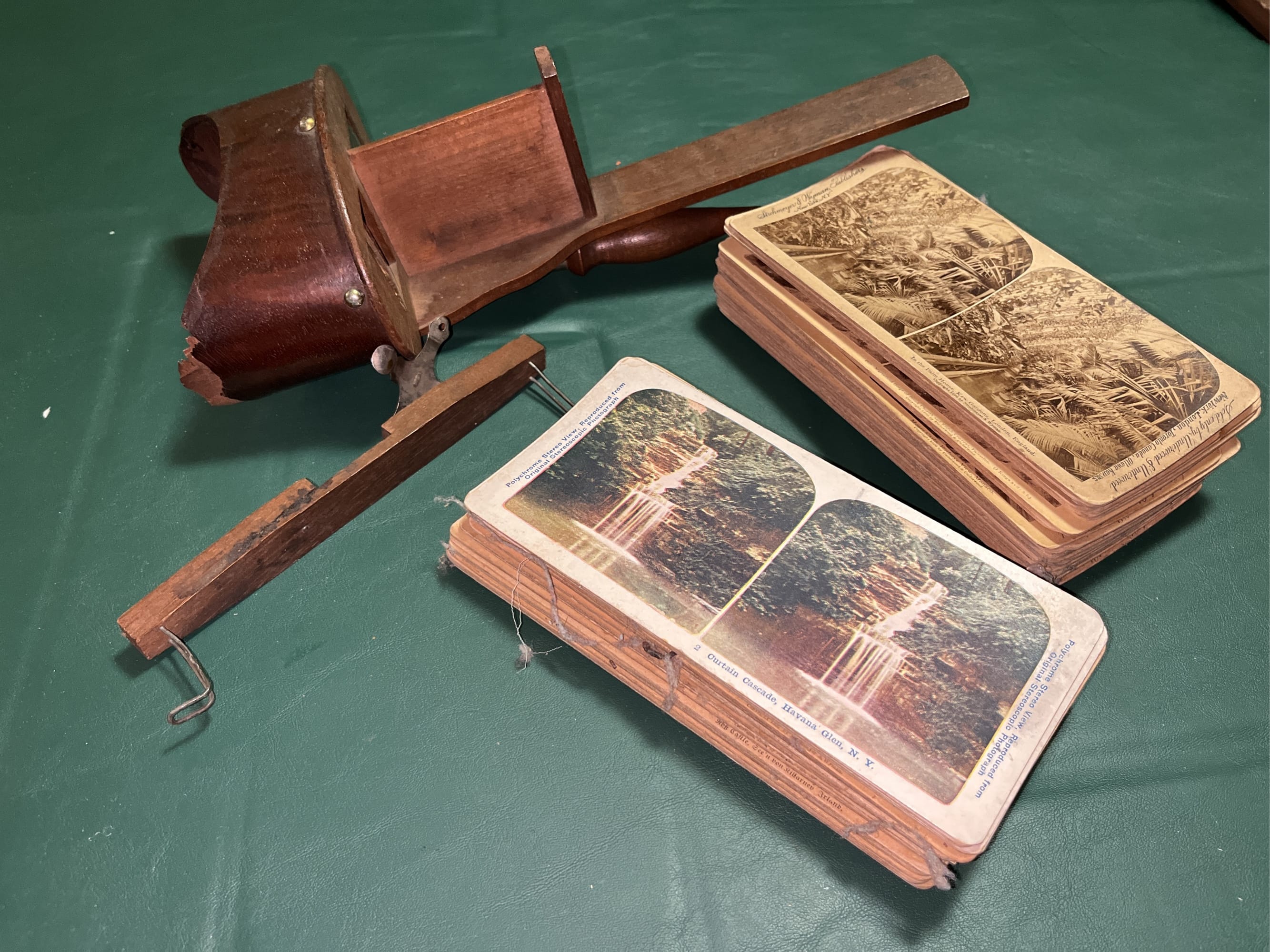 17 Goshen Electric advertising thermometer and clip board, First National Bank calendar 1973, Kok’s Woodgoods advertising gavel, Ohio Plate glass paperweight, New Haven Motor and Ingersoll pocket watches need repaired