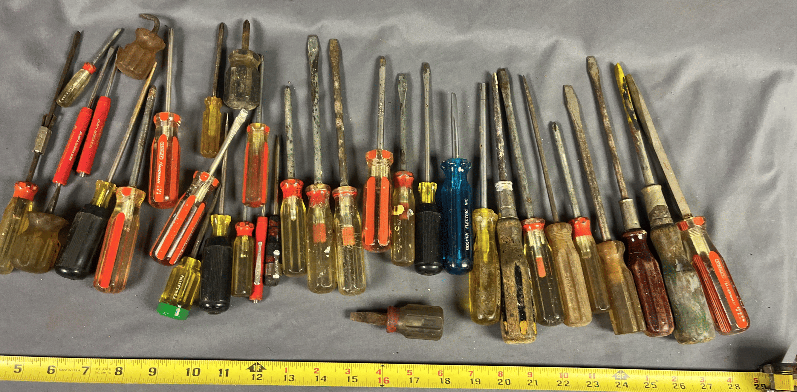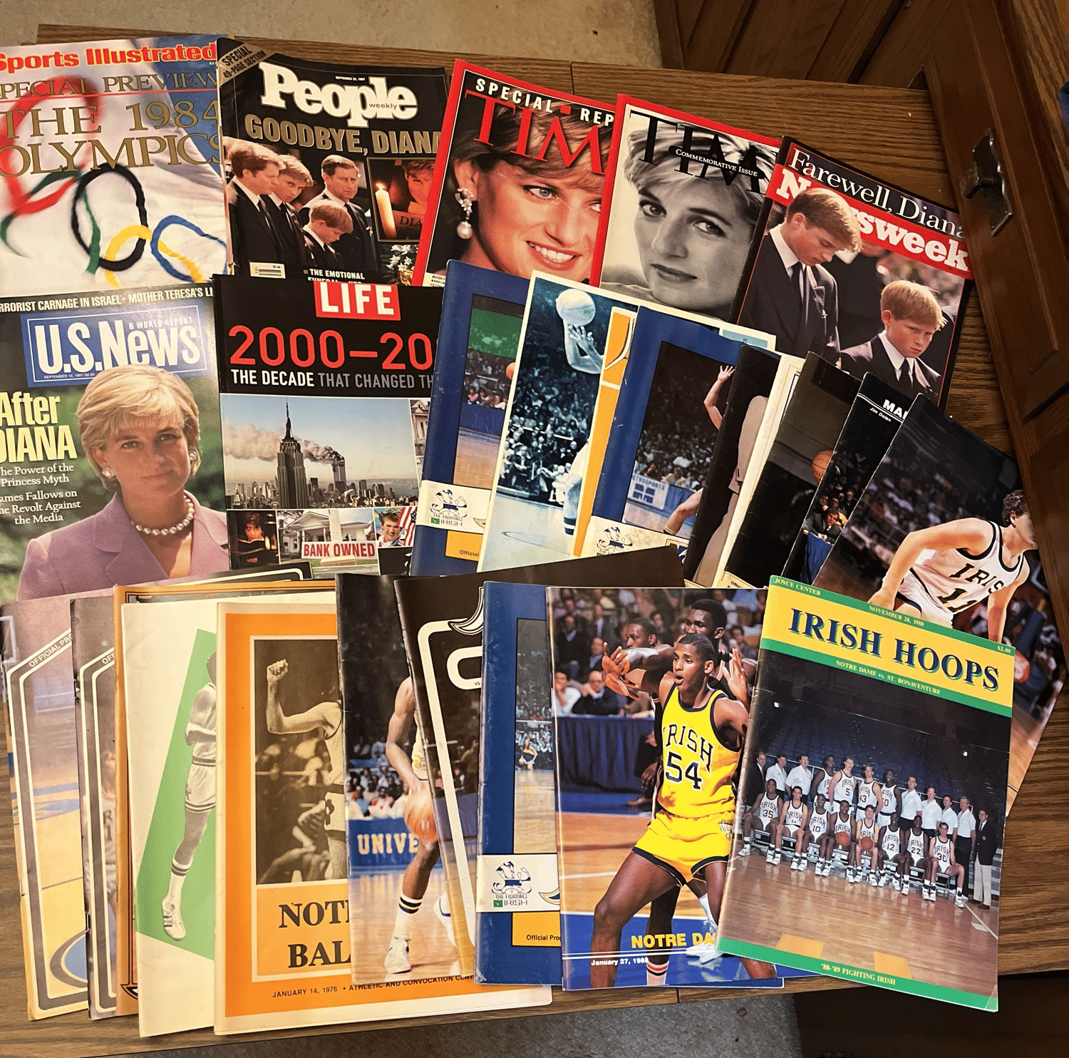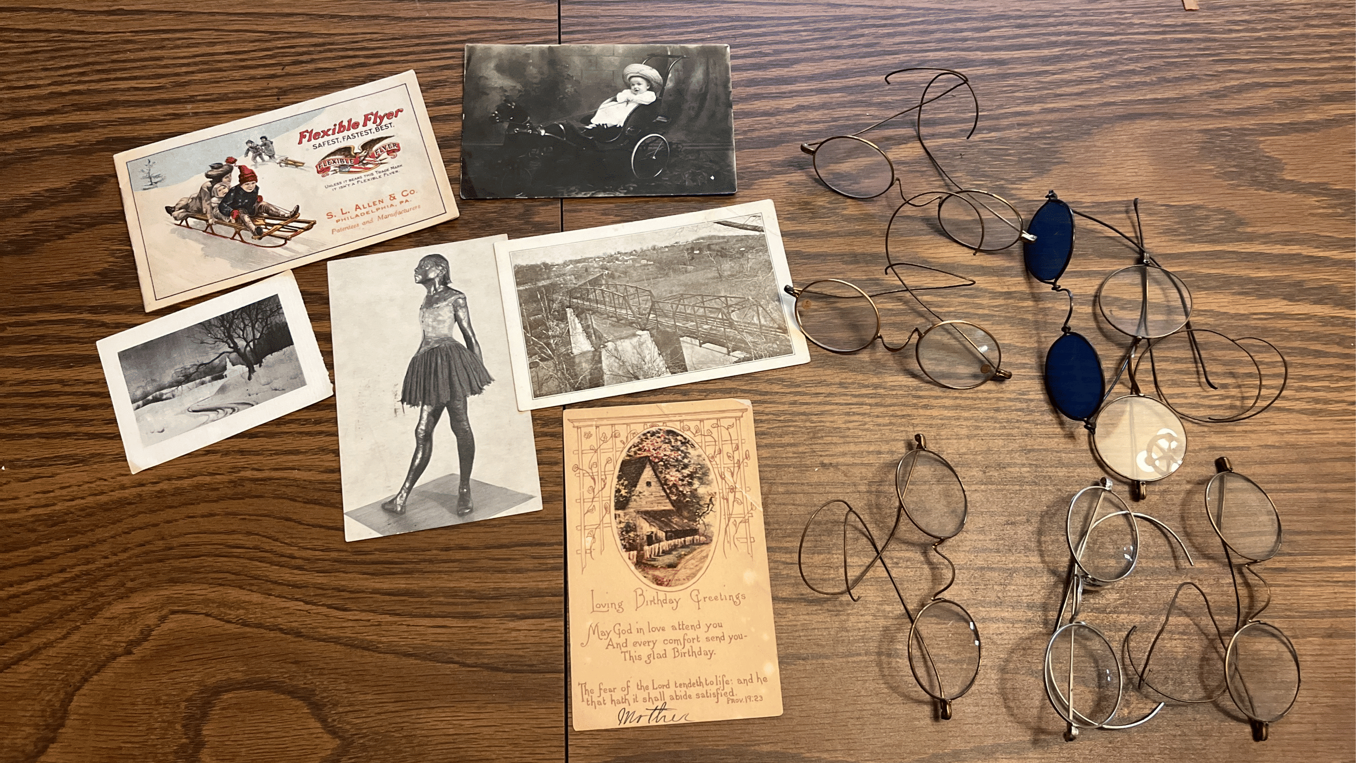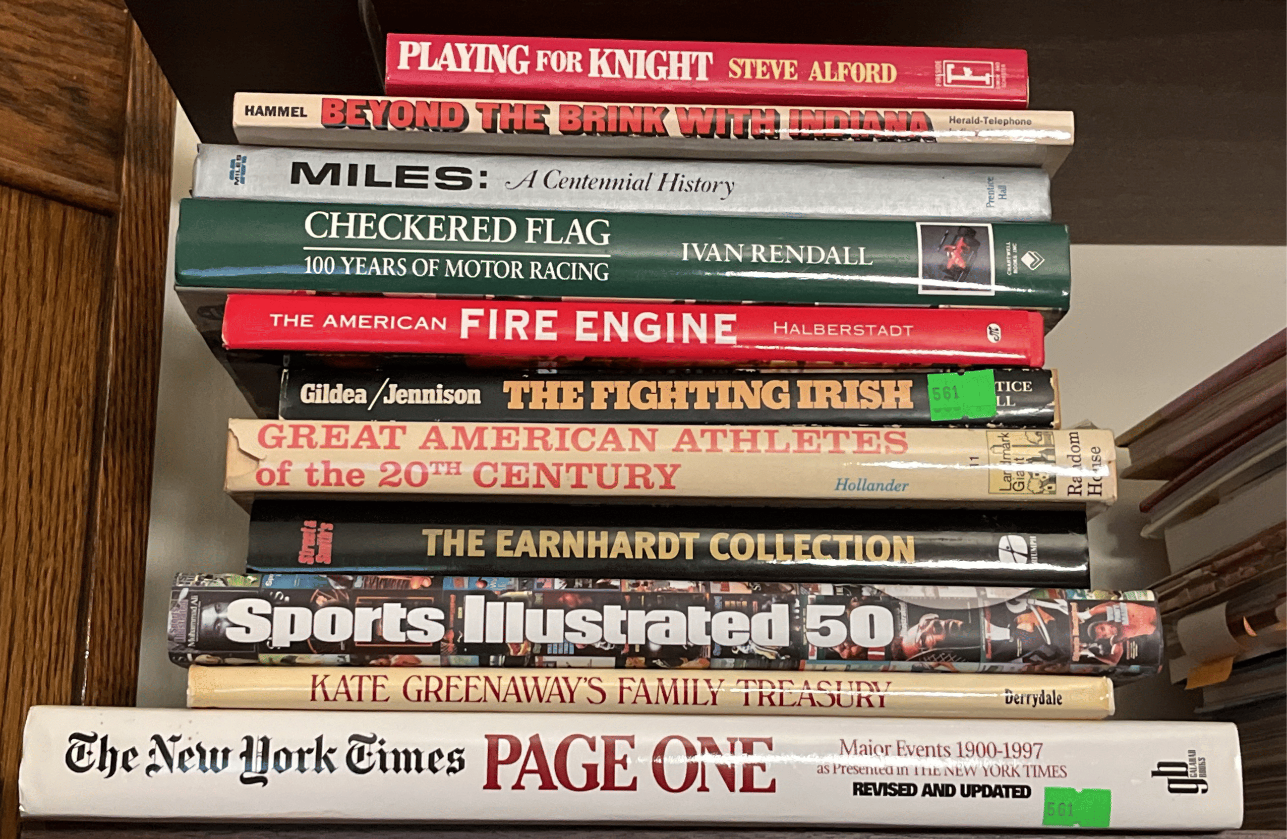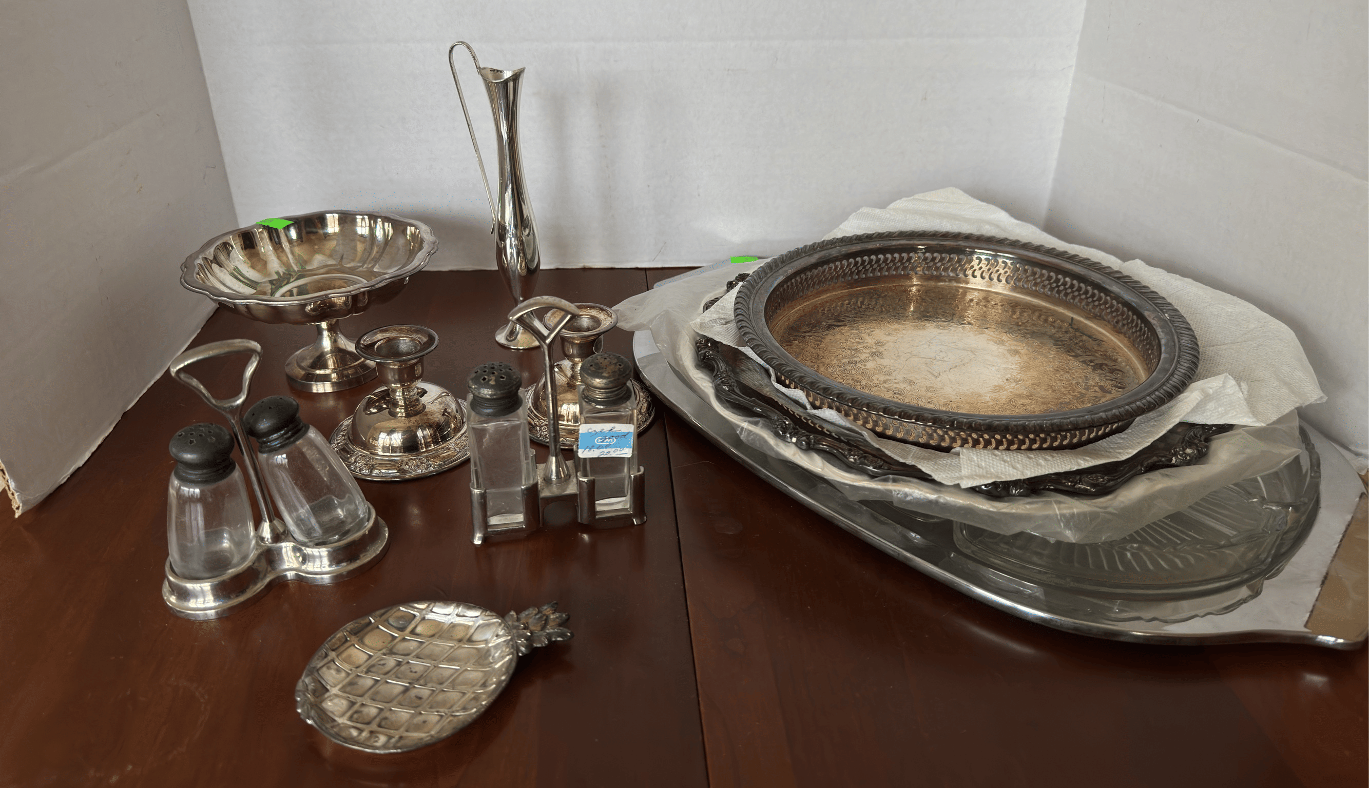 17 Goshen Electric advertising thermometer and clip board, First National Bank calendar 1973, Kok’s Woodgoods advertising gavel, Ohio Plate glass paperweight, New Haven Motor and Ingersoll pocket watches need repaired