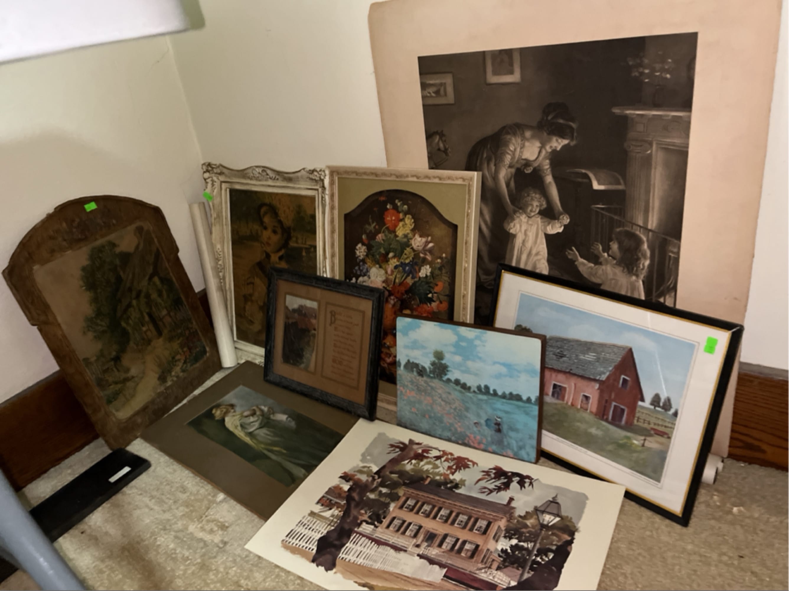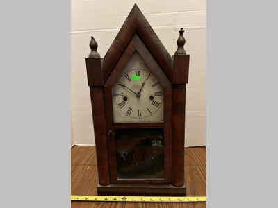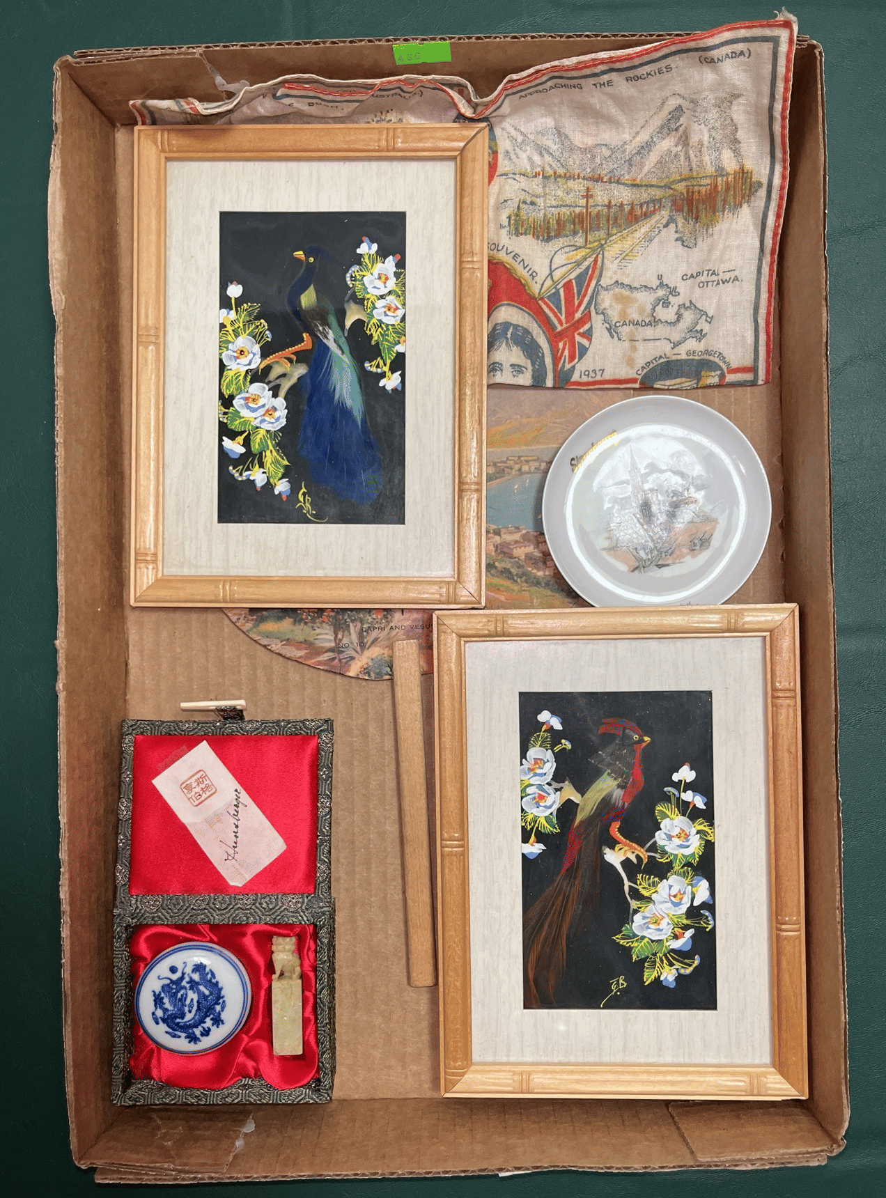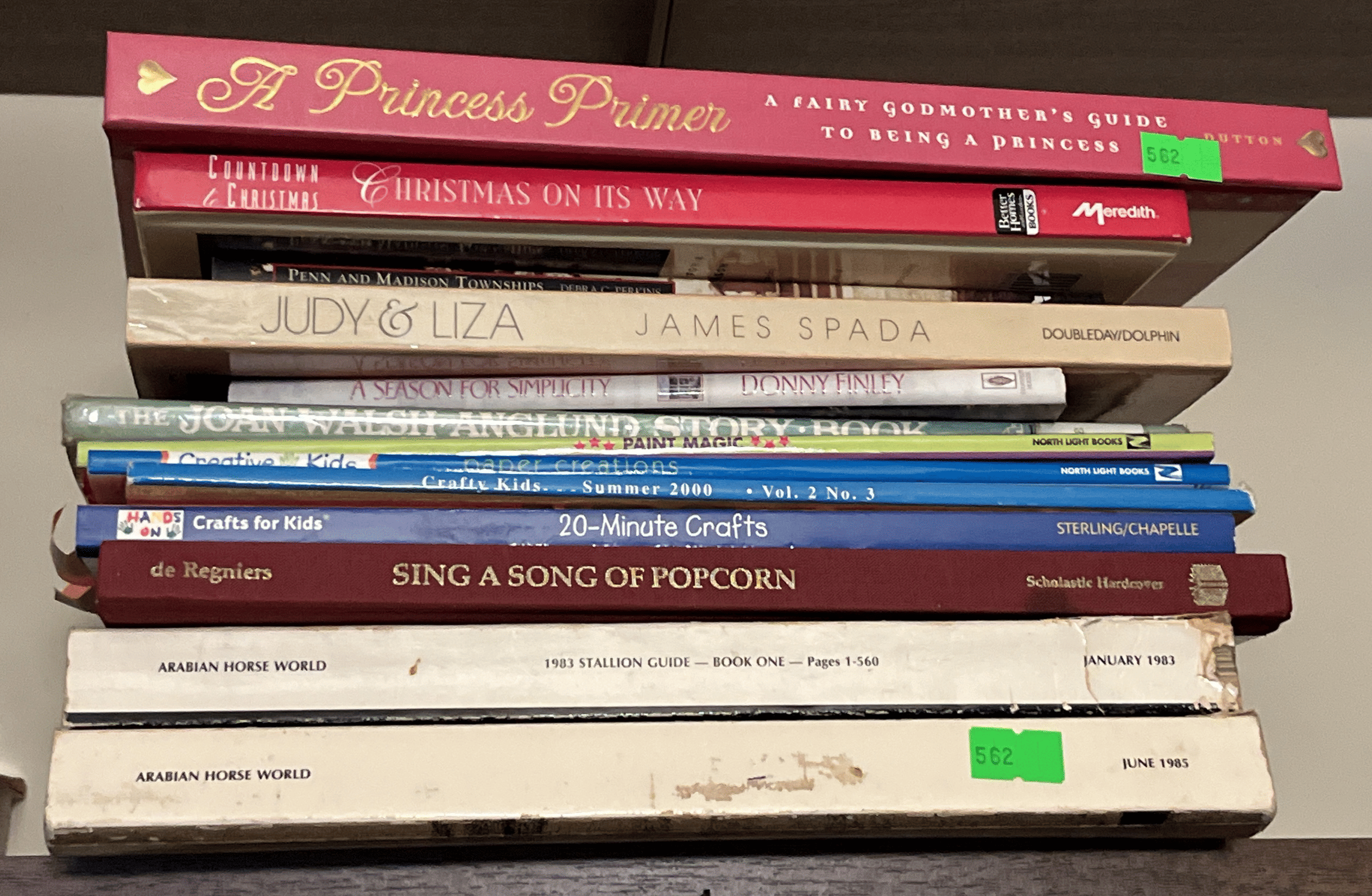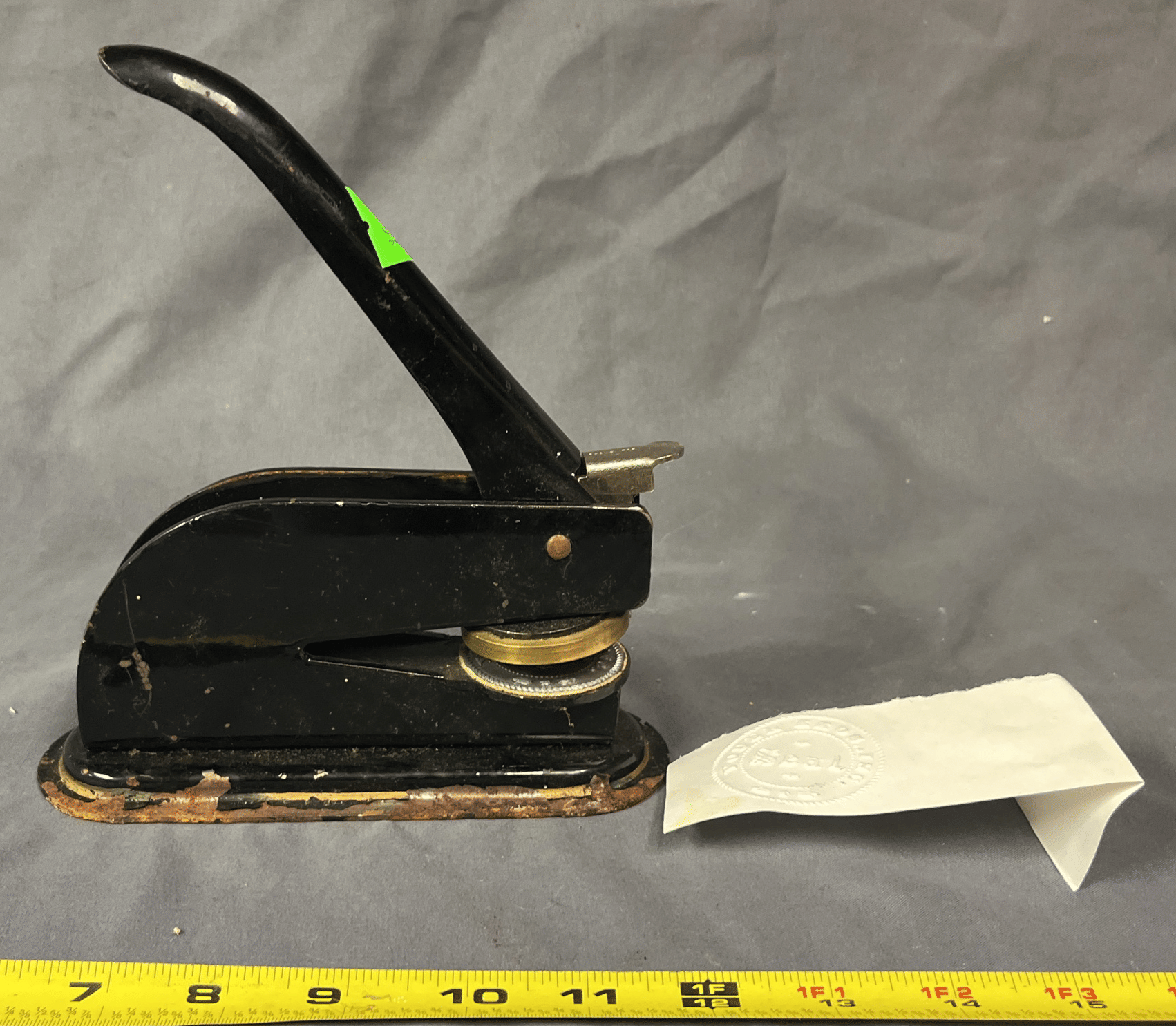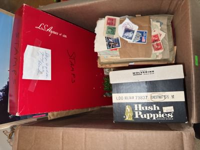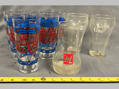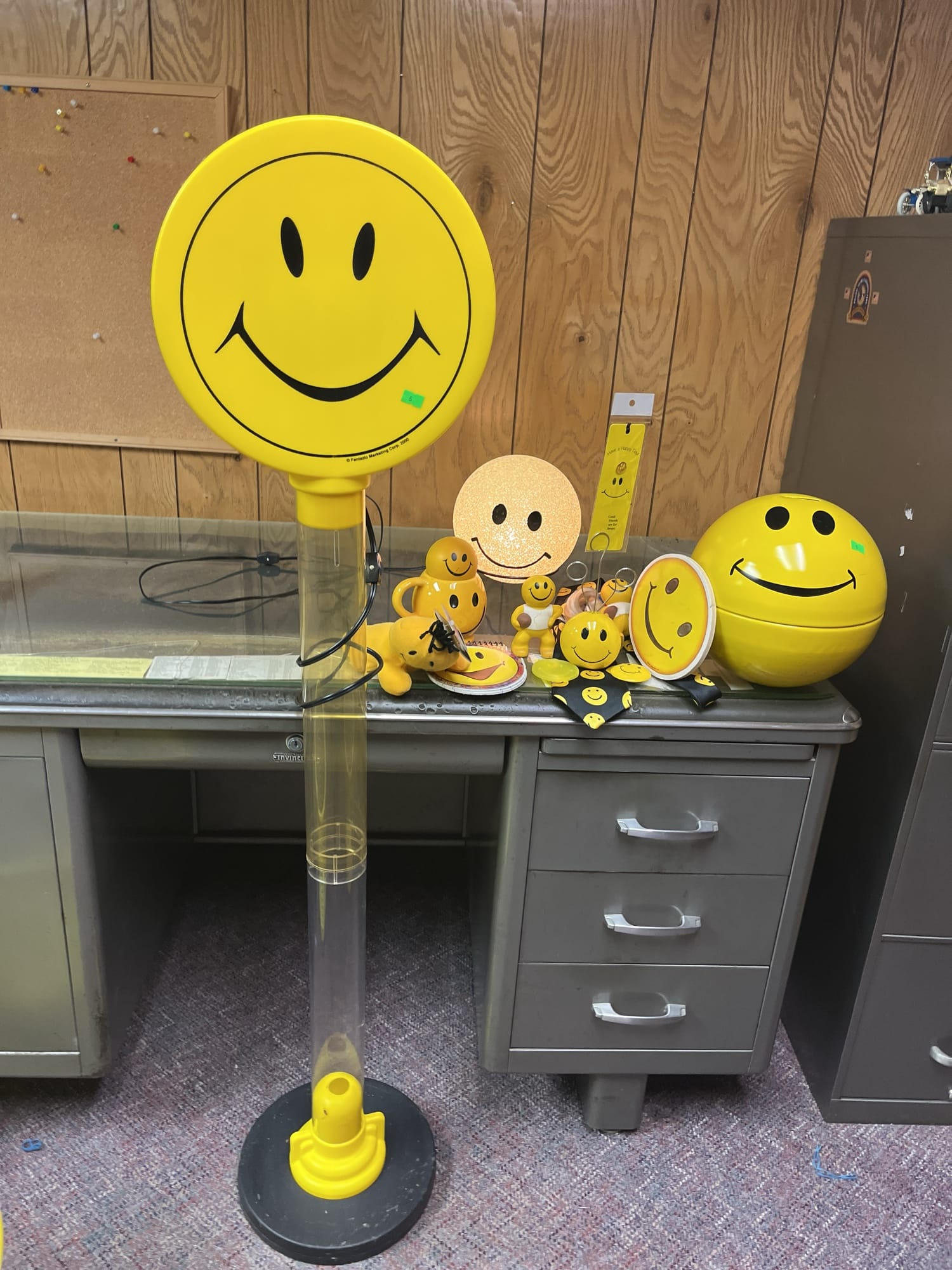 17 Goshen Electric advertising thermometer and clip board, First National Bank calendar 1973, Kok’s Woodgoods advertising gavel, Ohio Plate glass paperweight, New Haven Motor and Ingersoll pocket watches need repaired