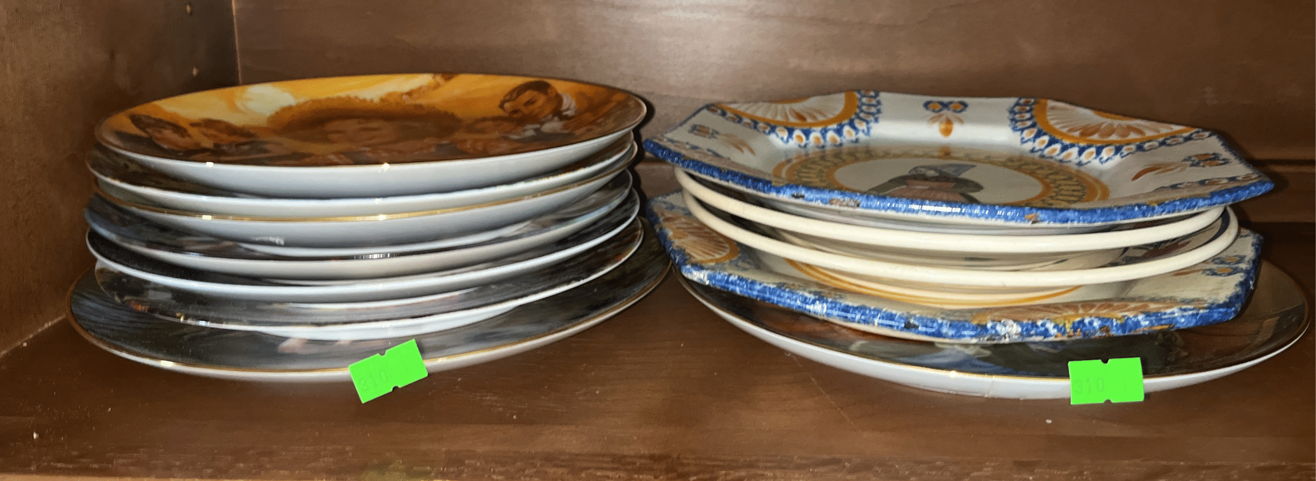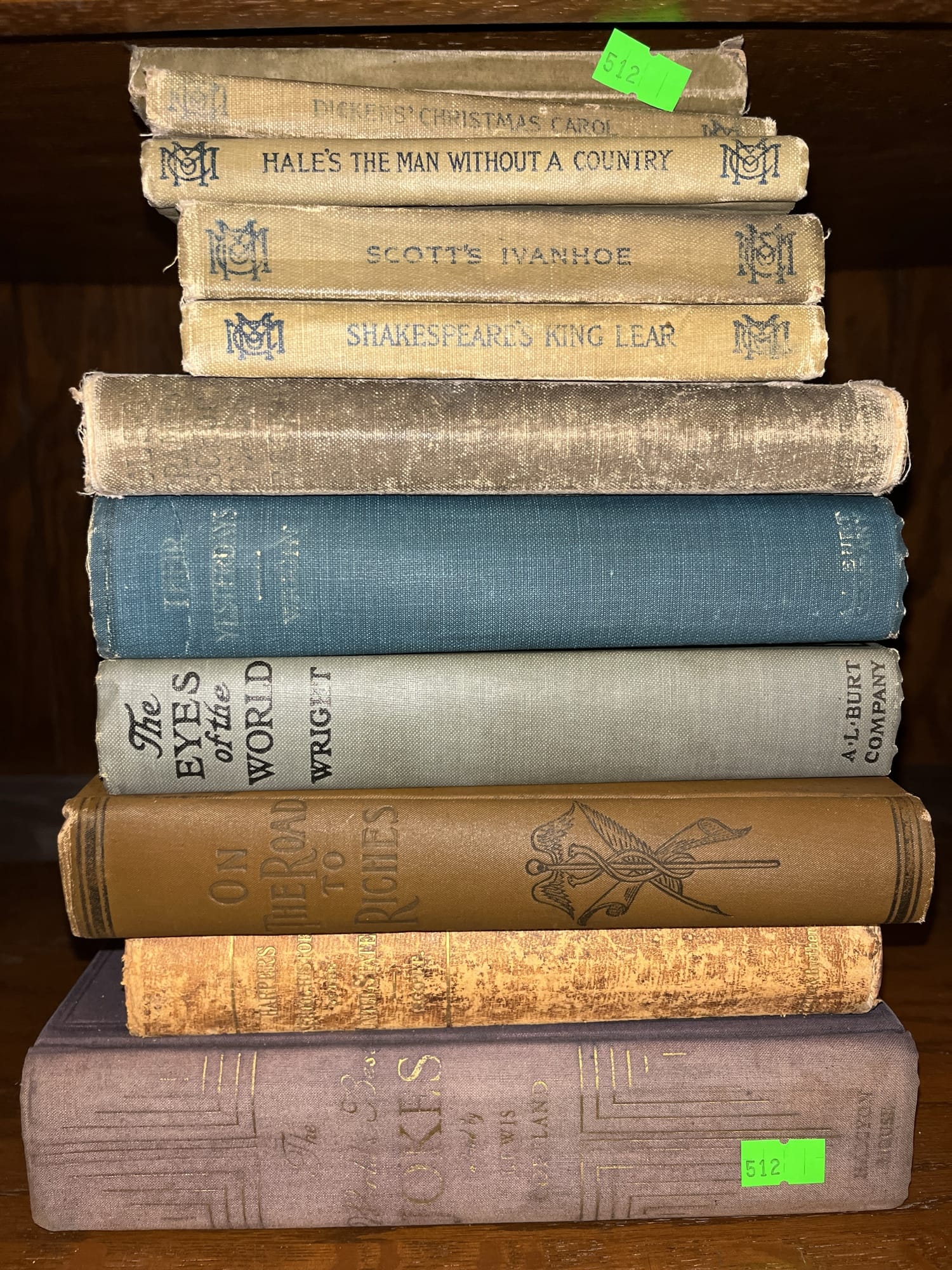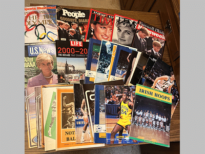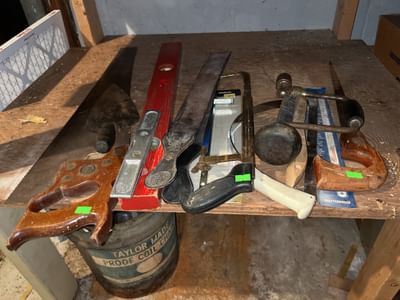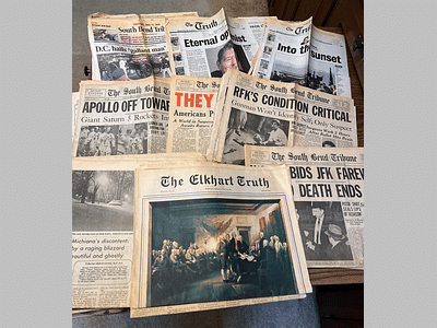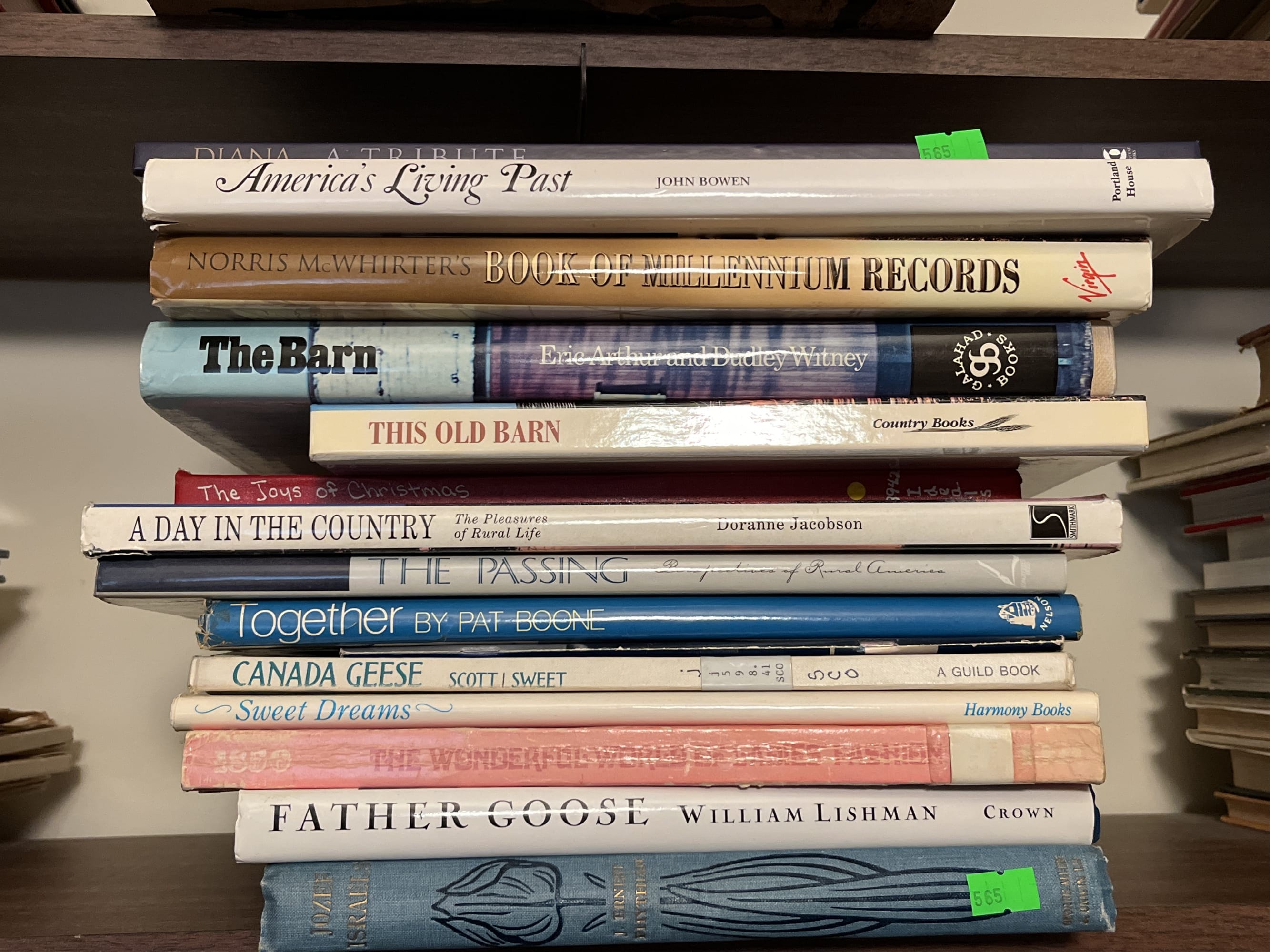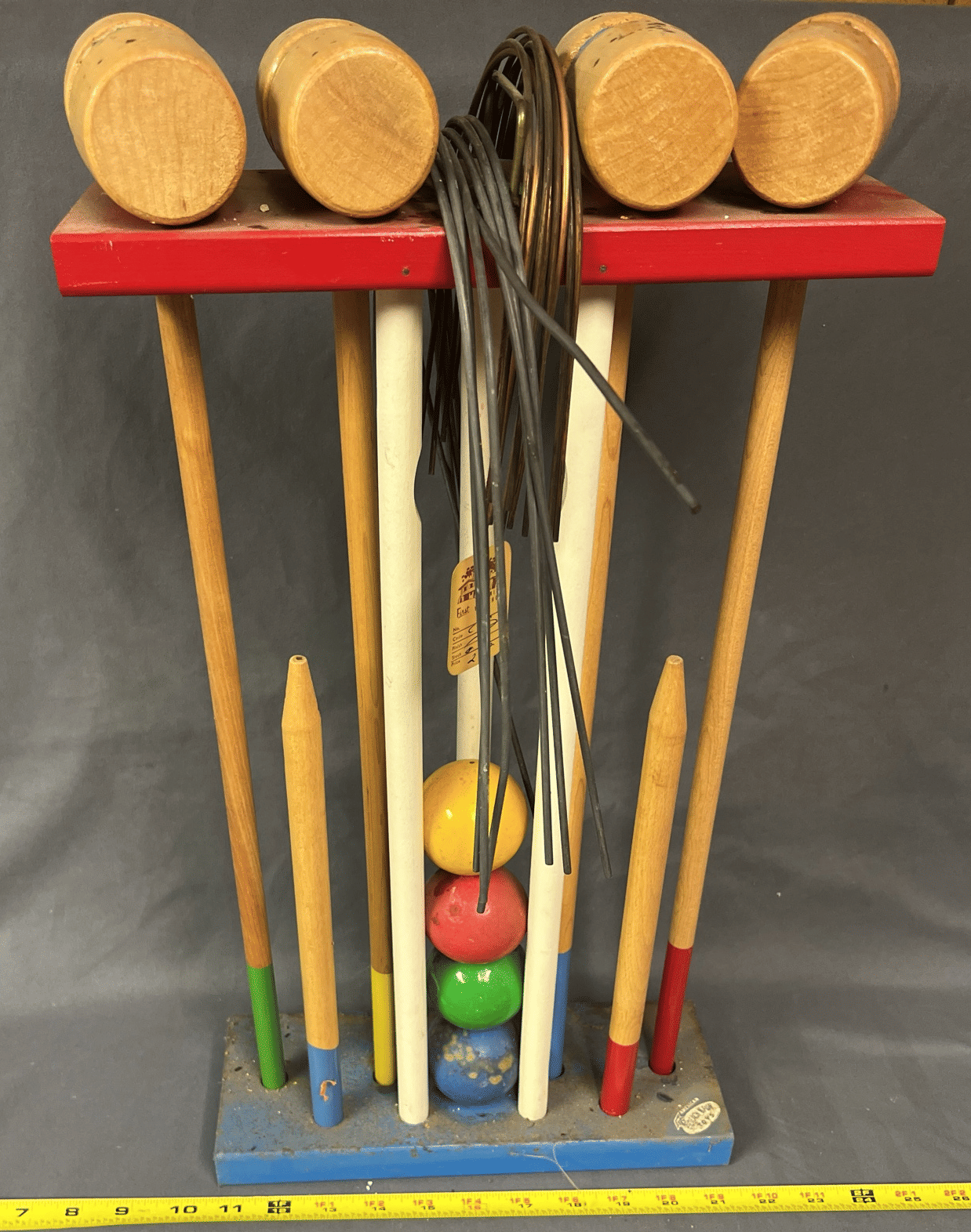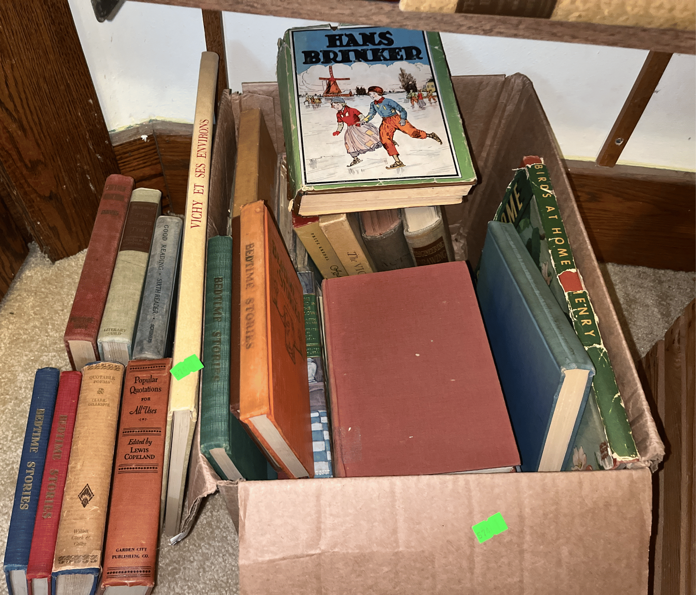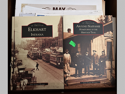 17 Goshen Electric advertising thermometer and clip board, First National Bank calendar 1973, Kok’s Woodgoods advertising gavel, Ohio Plate glass paperweight, New Haven Motor and Ingersoll pocket watches need repaired