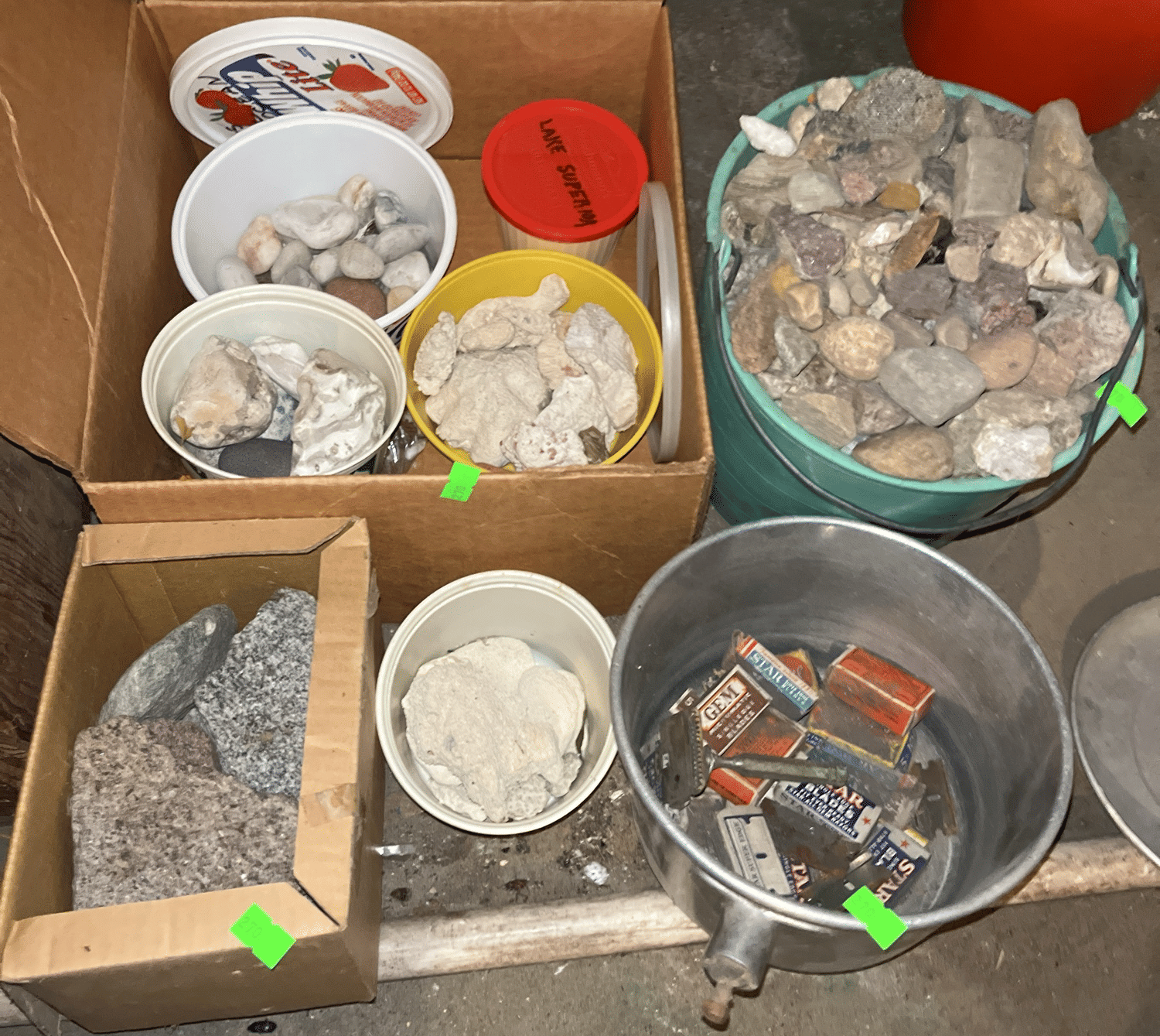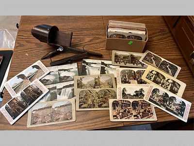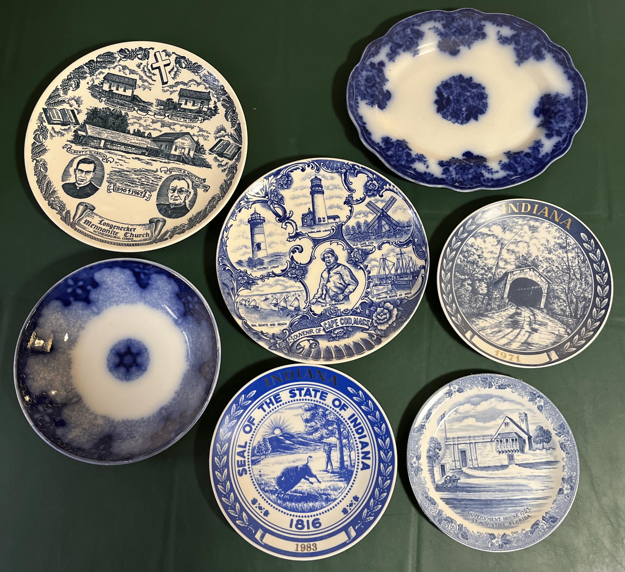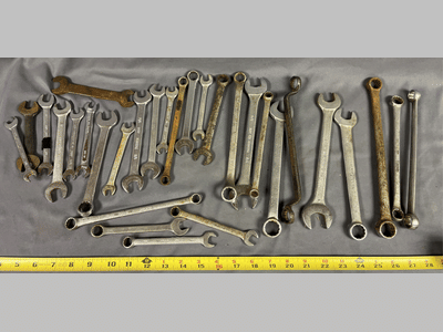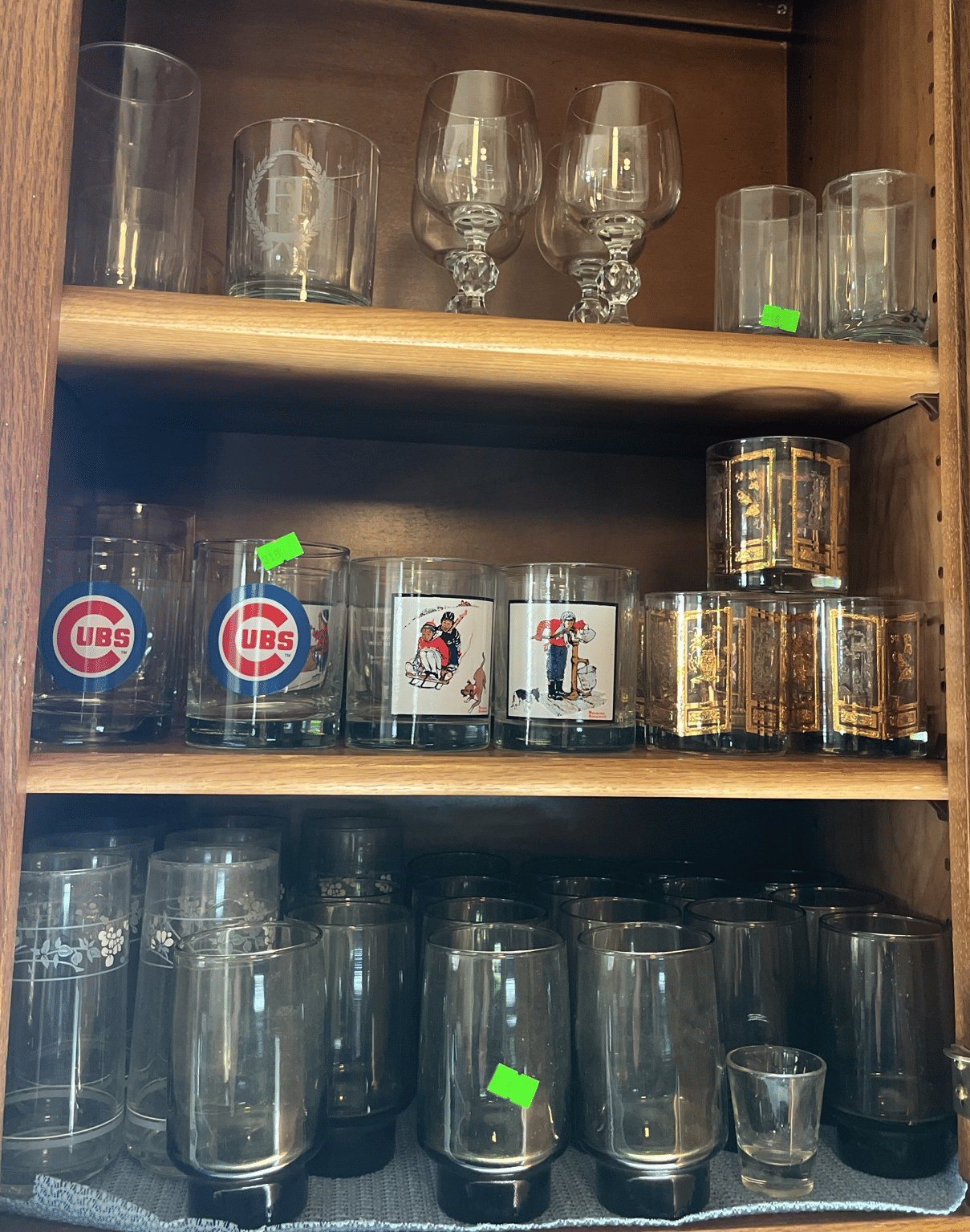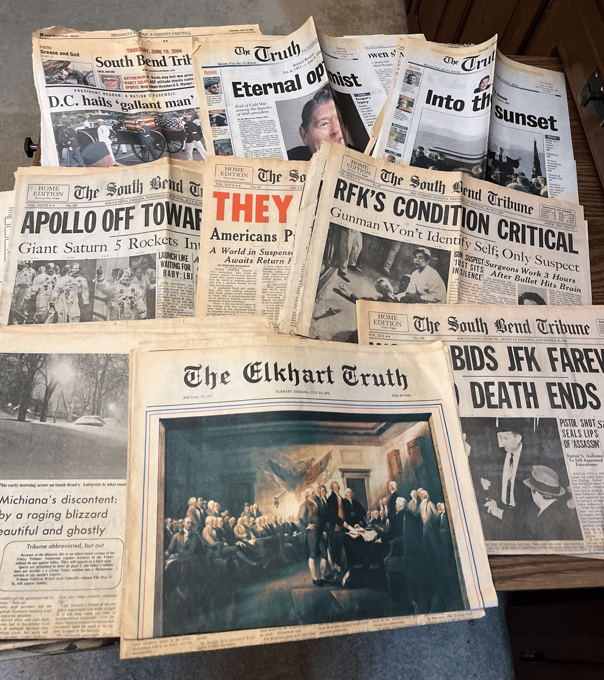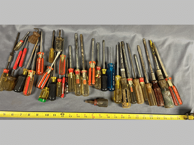 17 Goshen Electric advertising thermometer and clip board, First National Bank calendar 1973, Kok’s Woodgoods advertising gavel, Ohio Plate glass paperweight, New Haven Motor and Ingersoll pocket watches need repaired