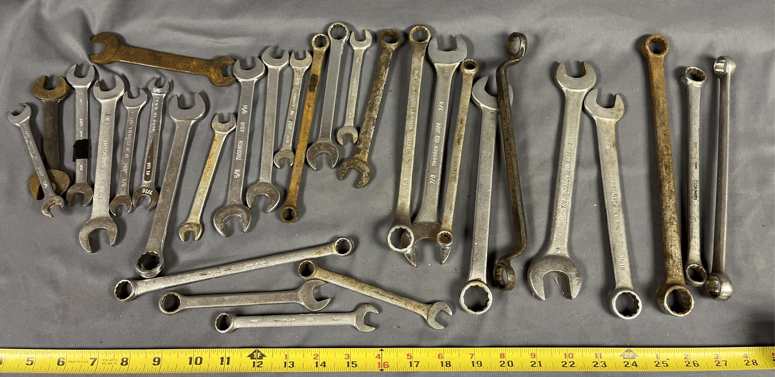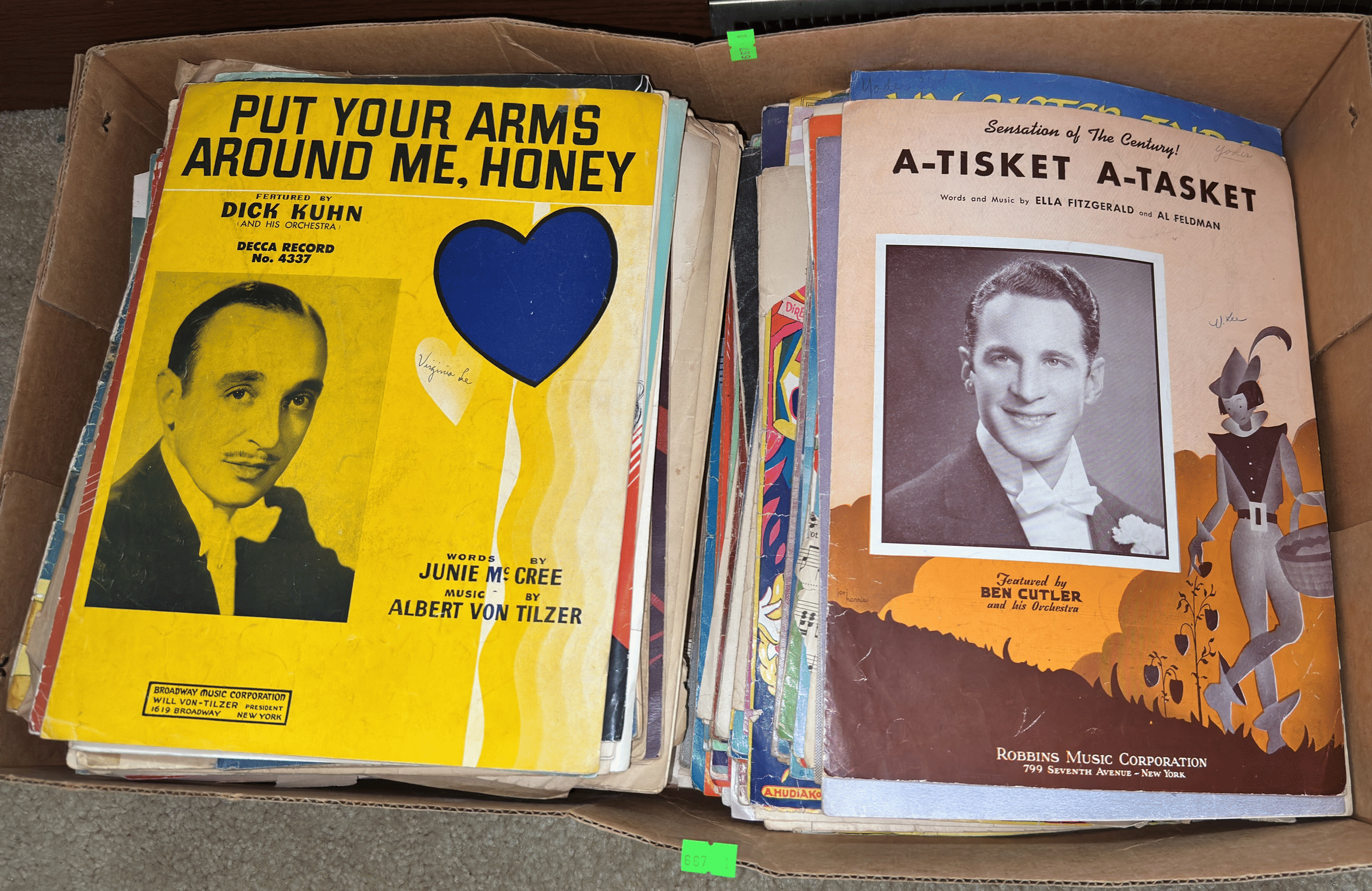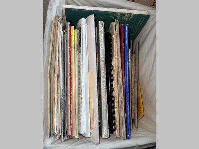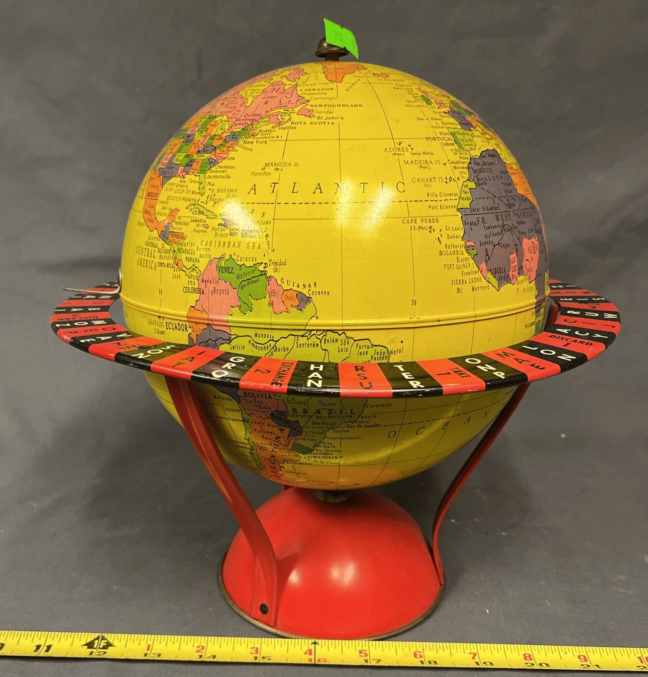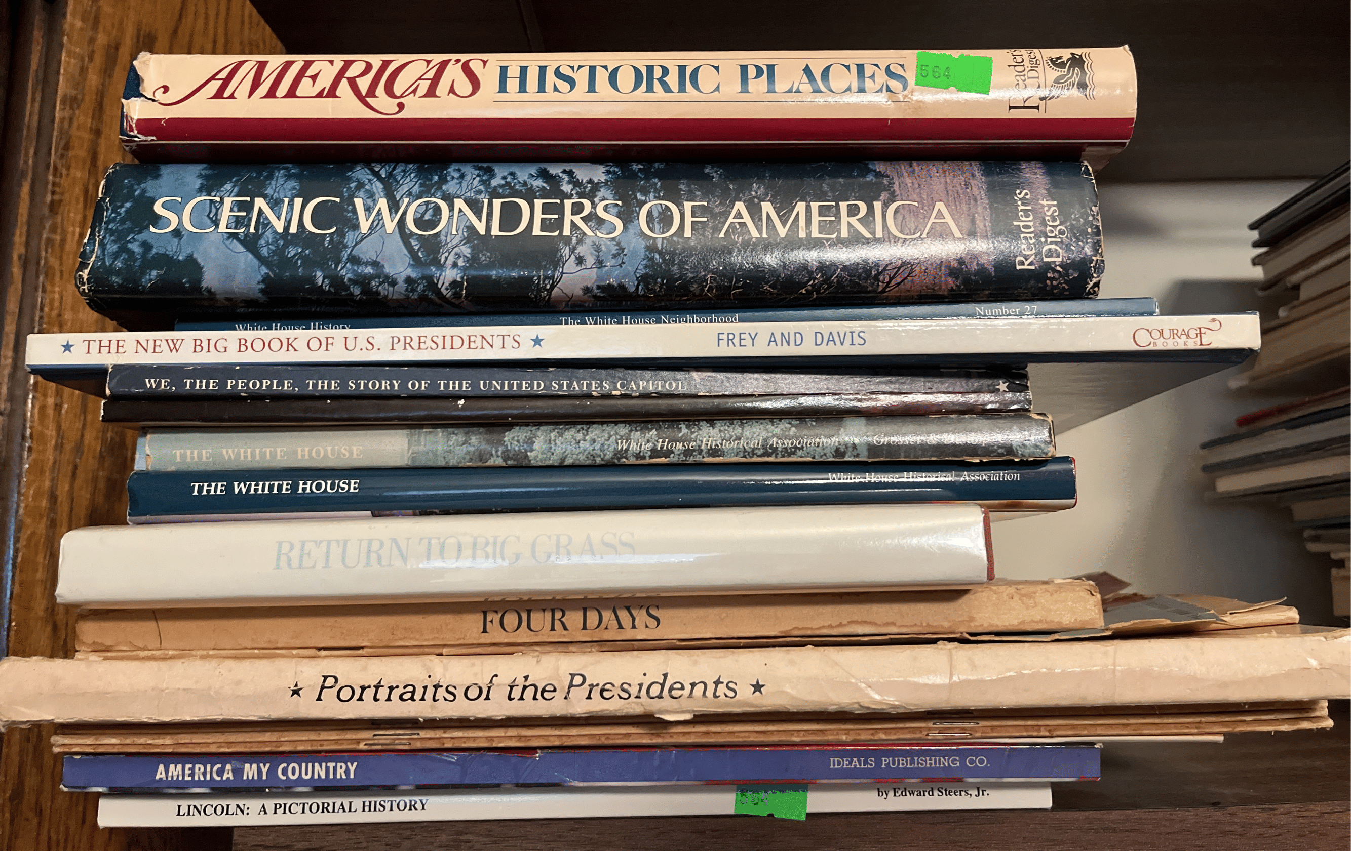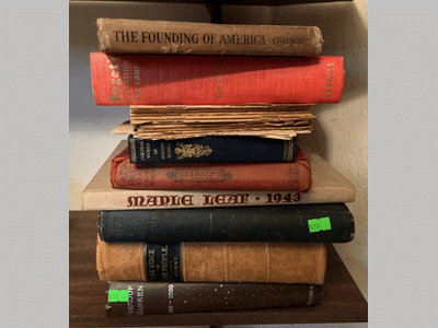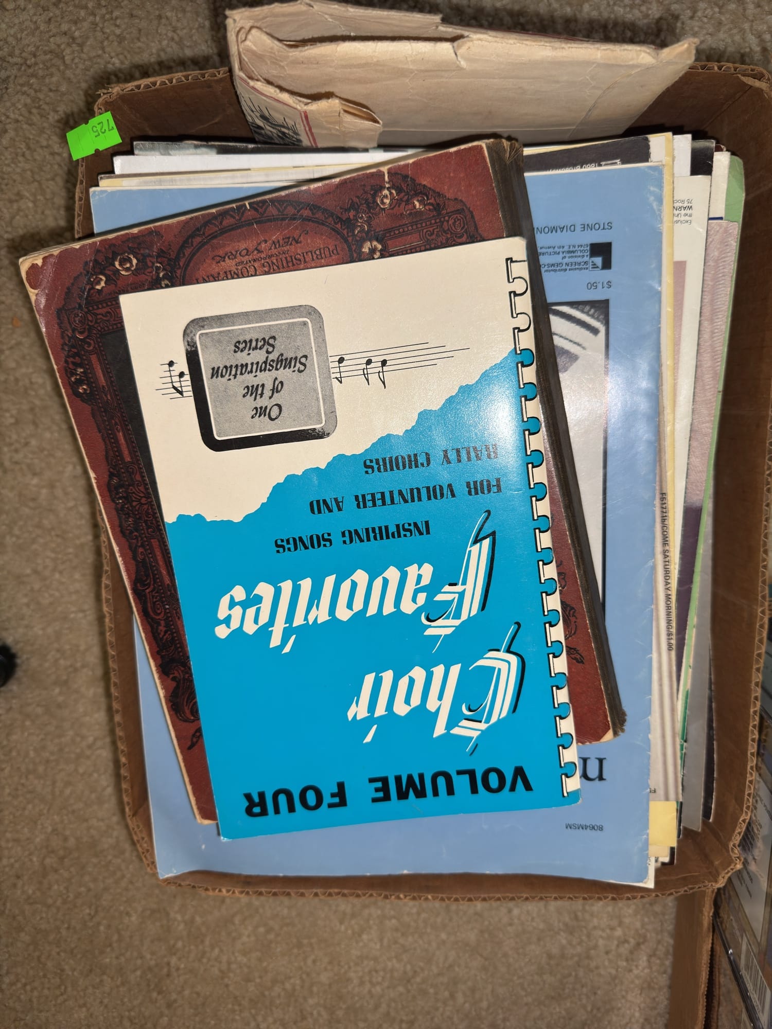17 Goshen Electric advertising thermometer and clip board, First National Bank calendar 1973, Kok’s Woodgoods advertising gavel, Ohio Plate glass paperweight, New Haven Motor and Ingersoll pocket watches need repaired