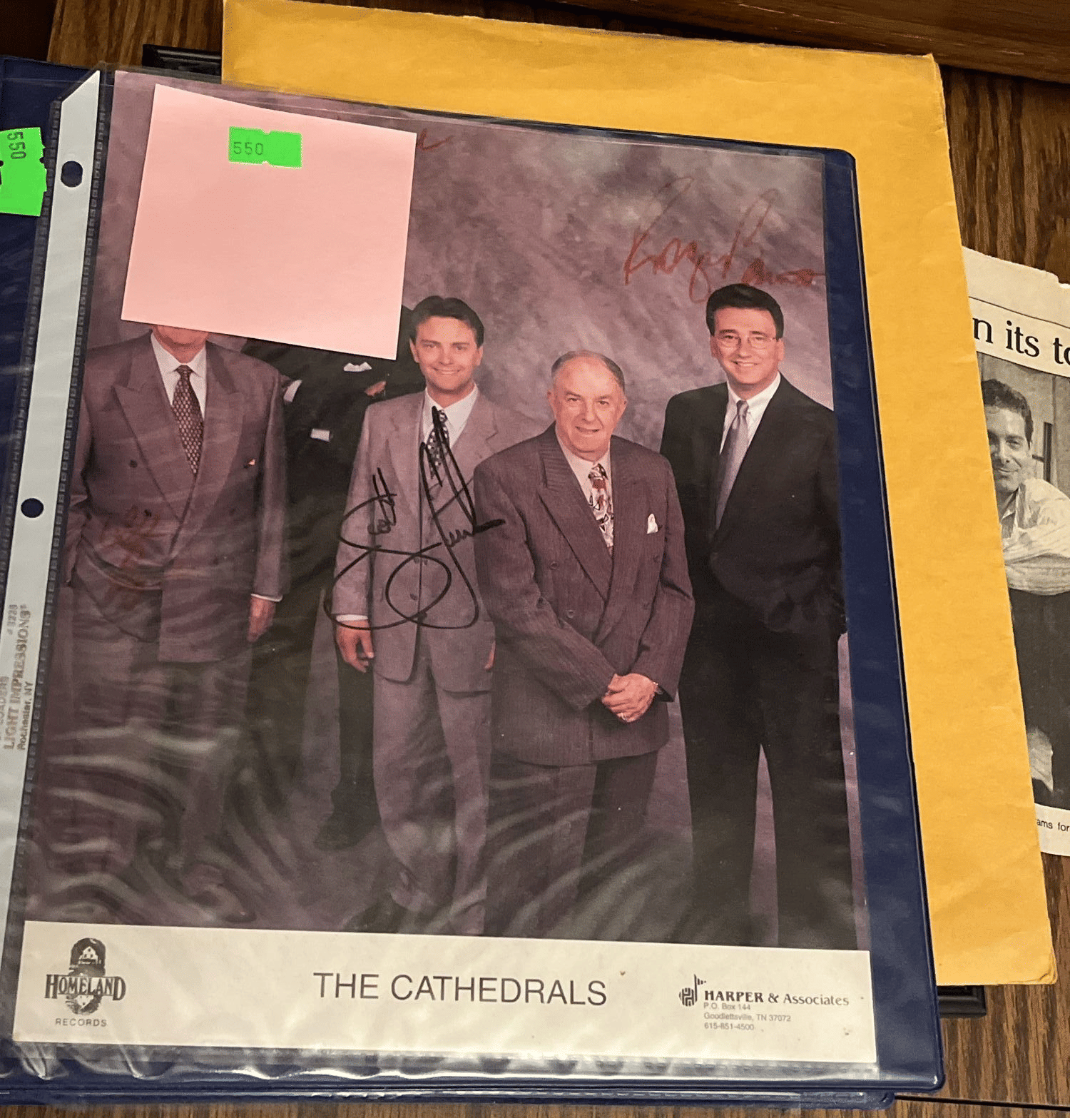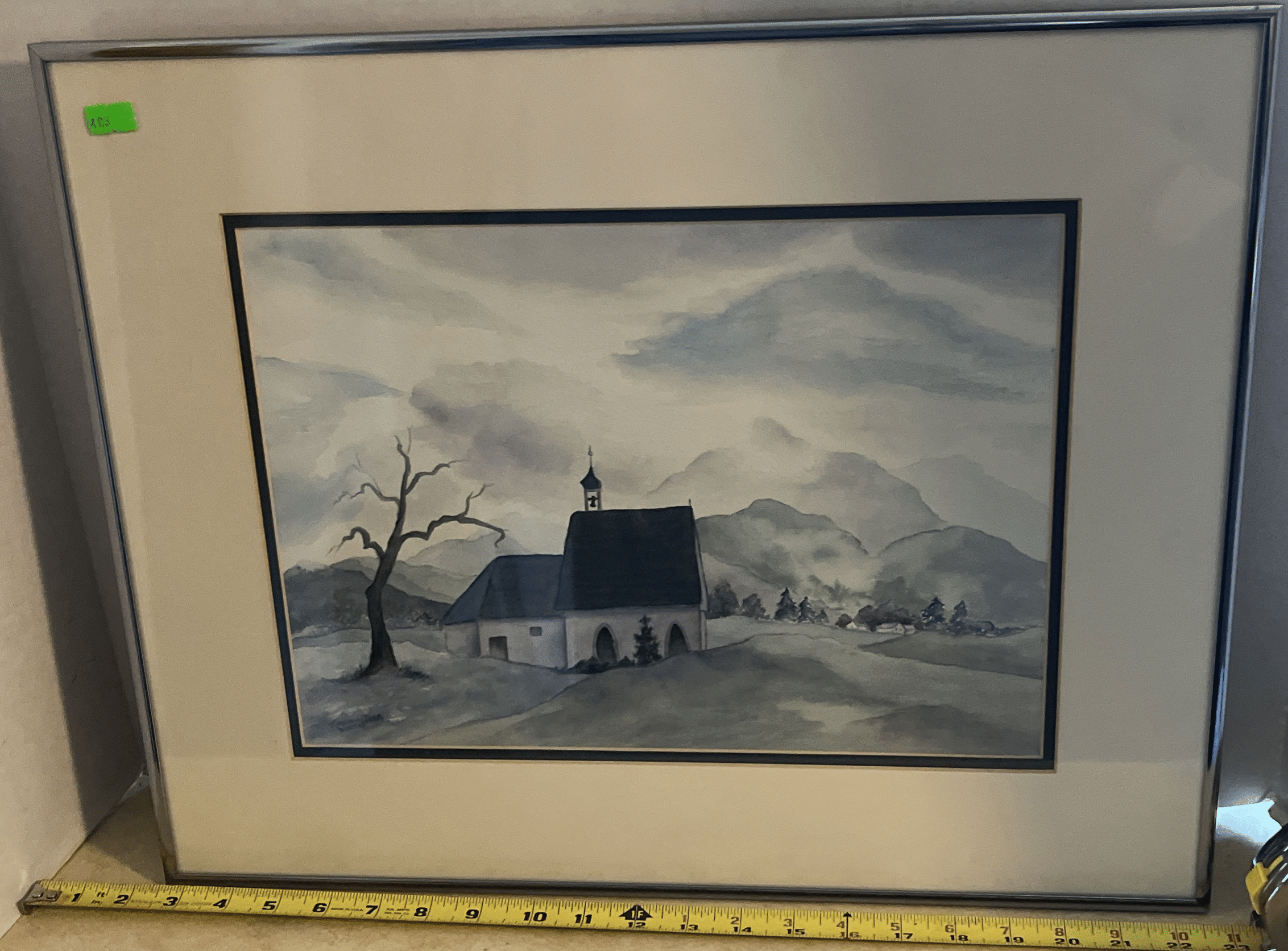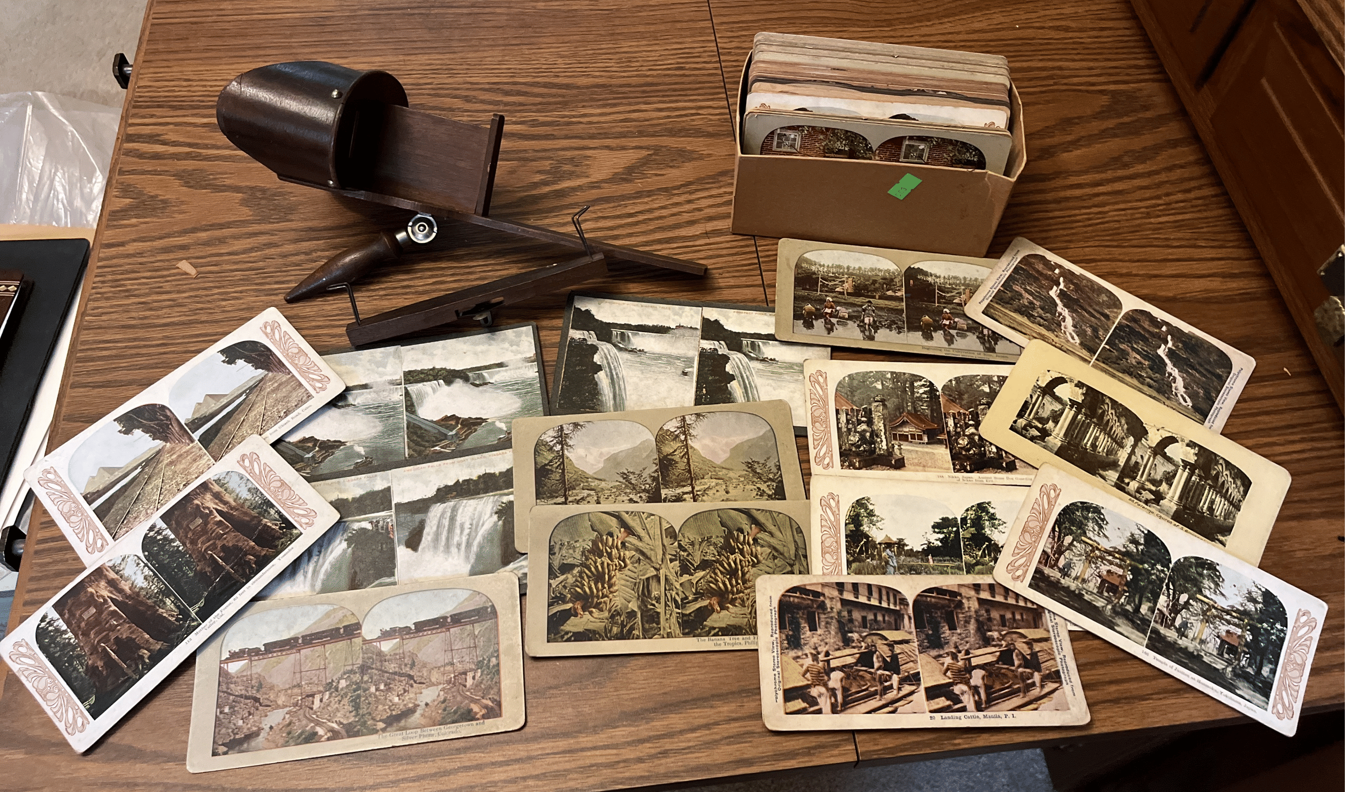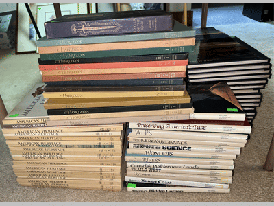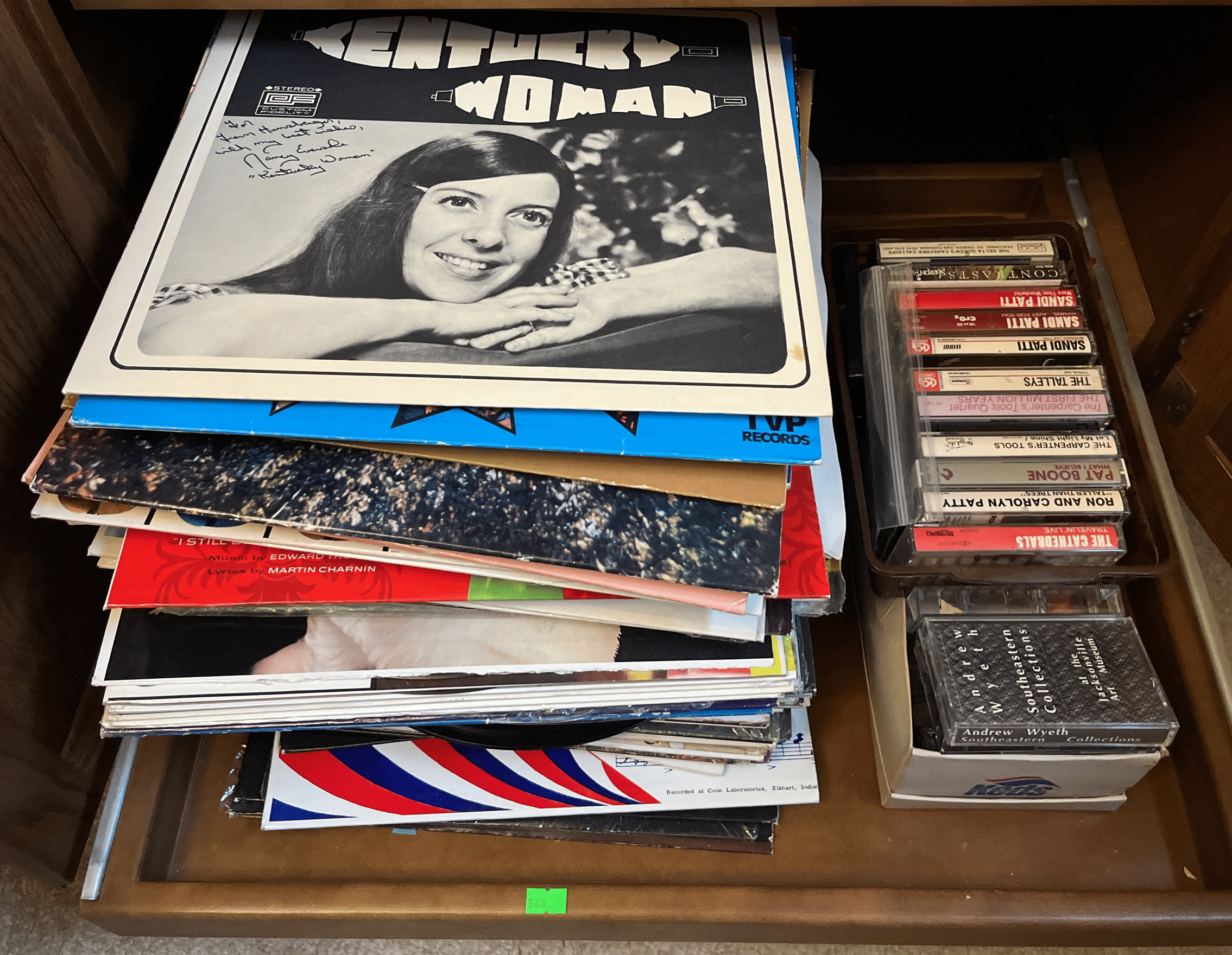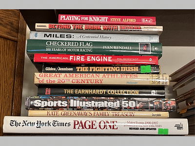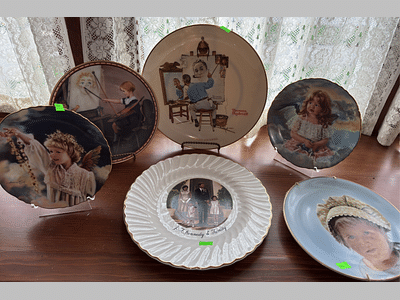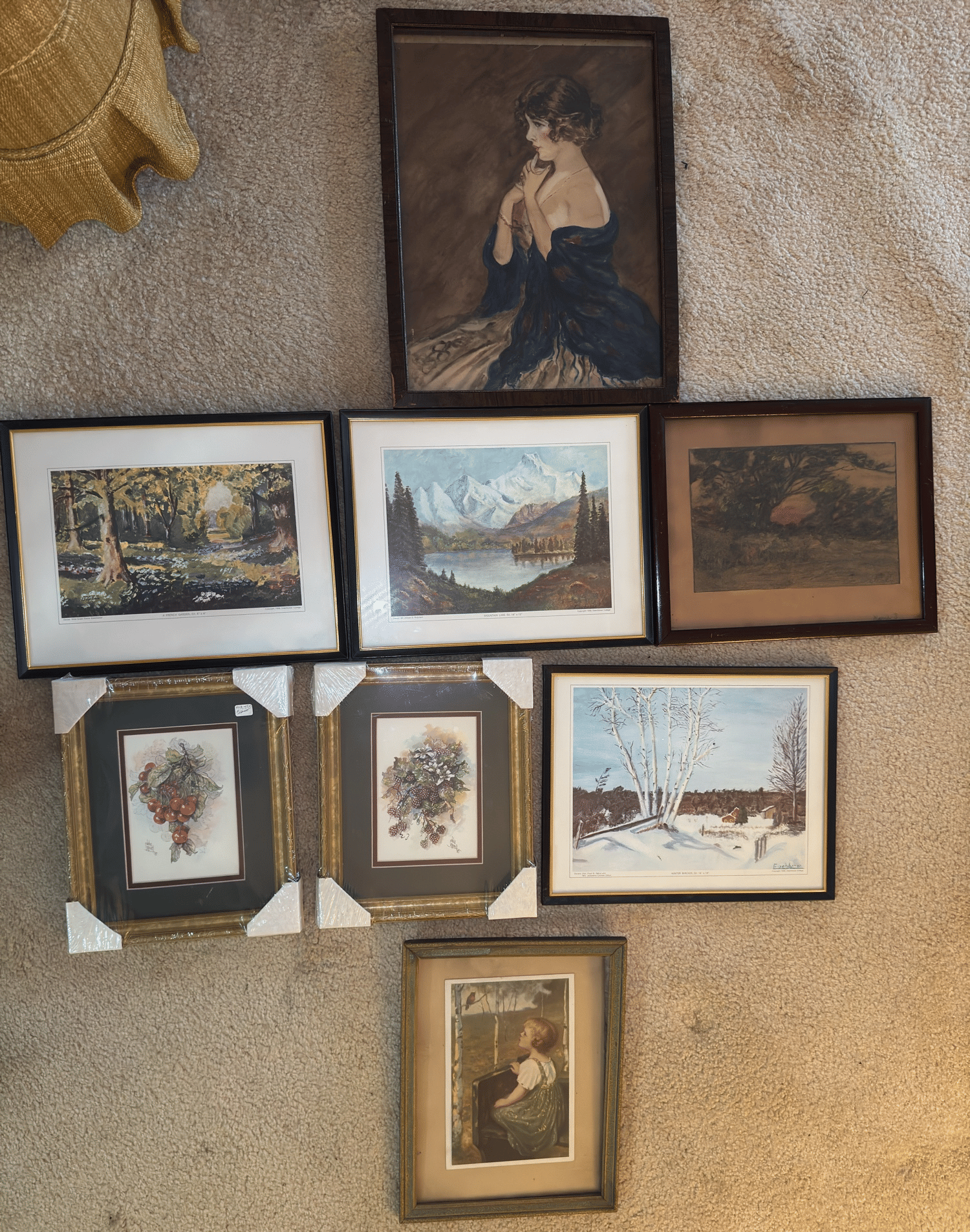 17 Goshen Electric advertising thermometer and clip board, First National Bank calendar 1973, Kok’s Woodgoods advertising gavel, Ohio Plate glass paperweight, New Haven Motor and Ingersoll pocket watches need repaired