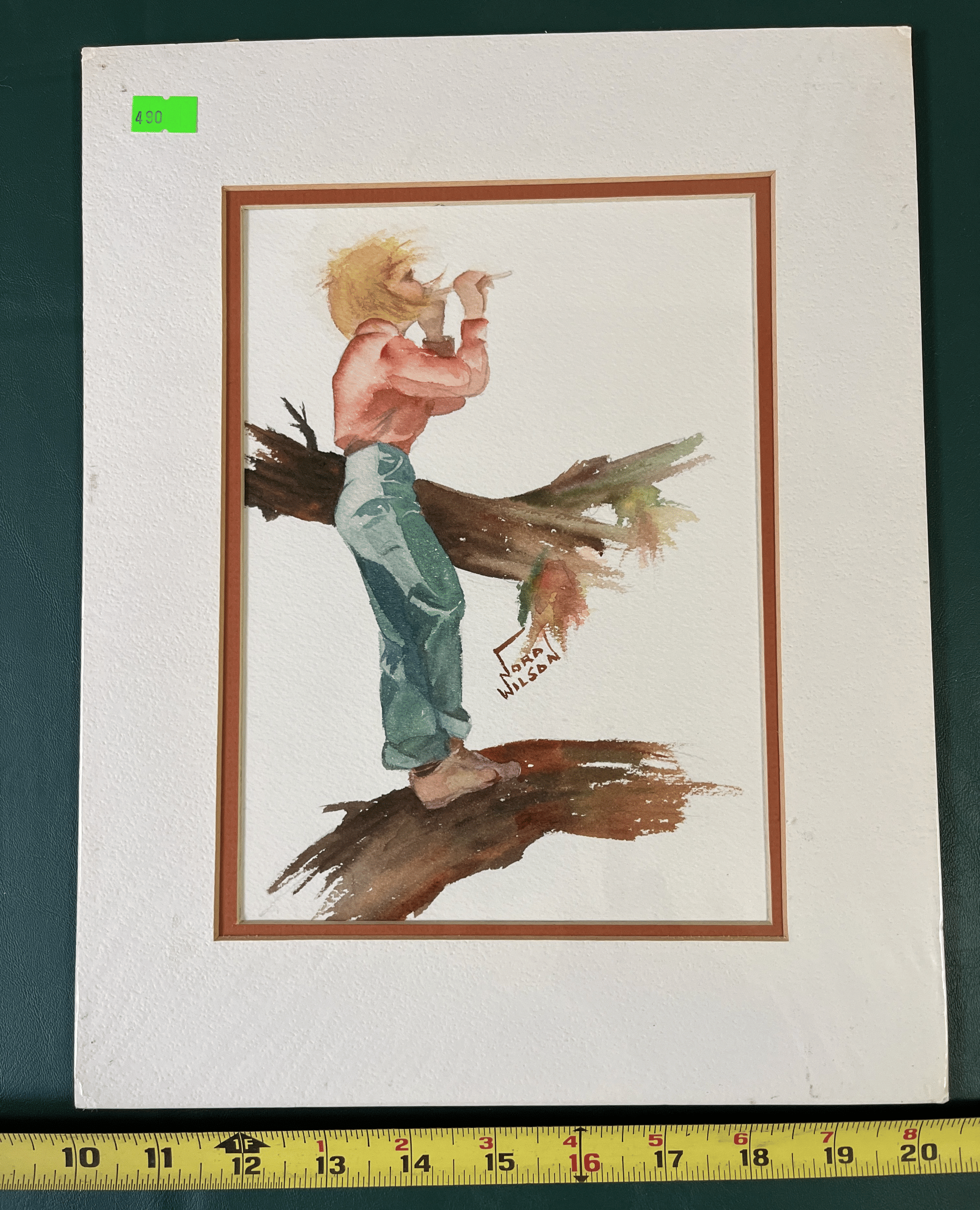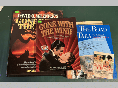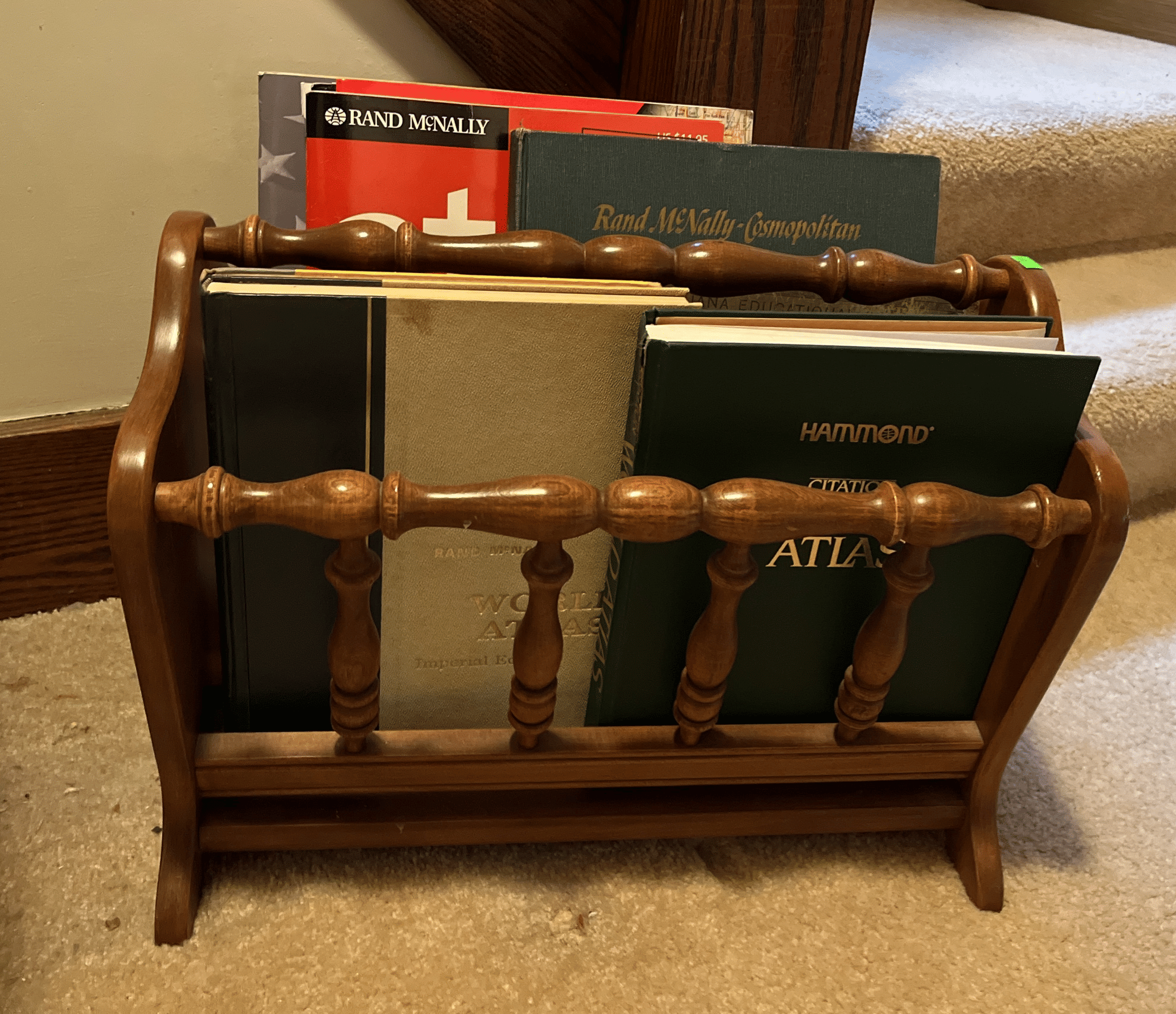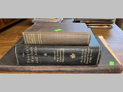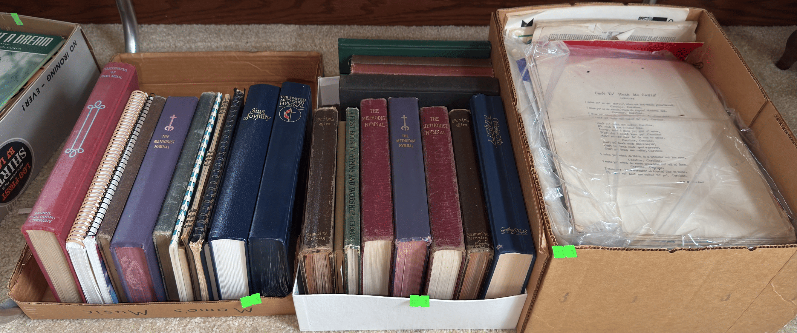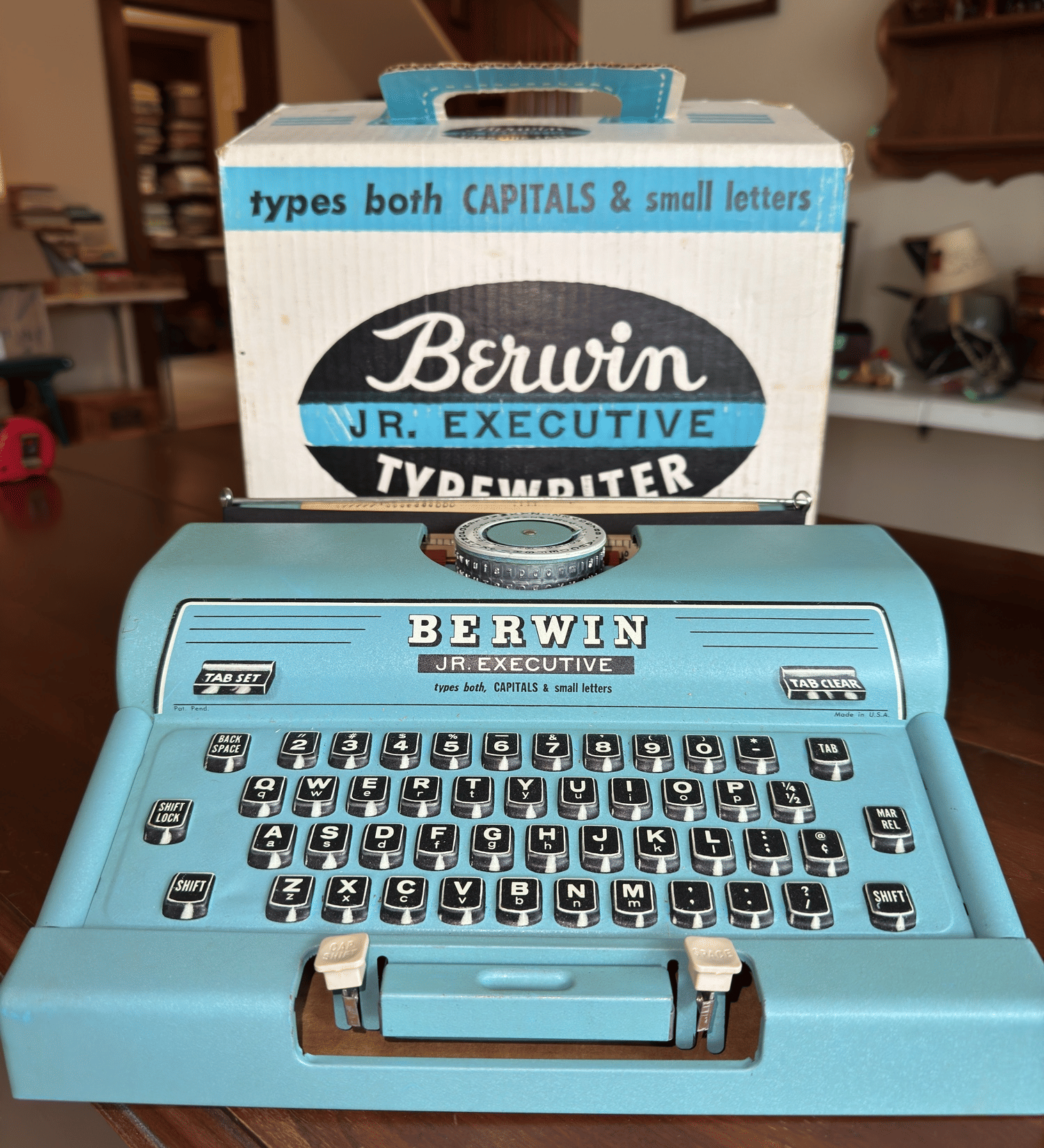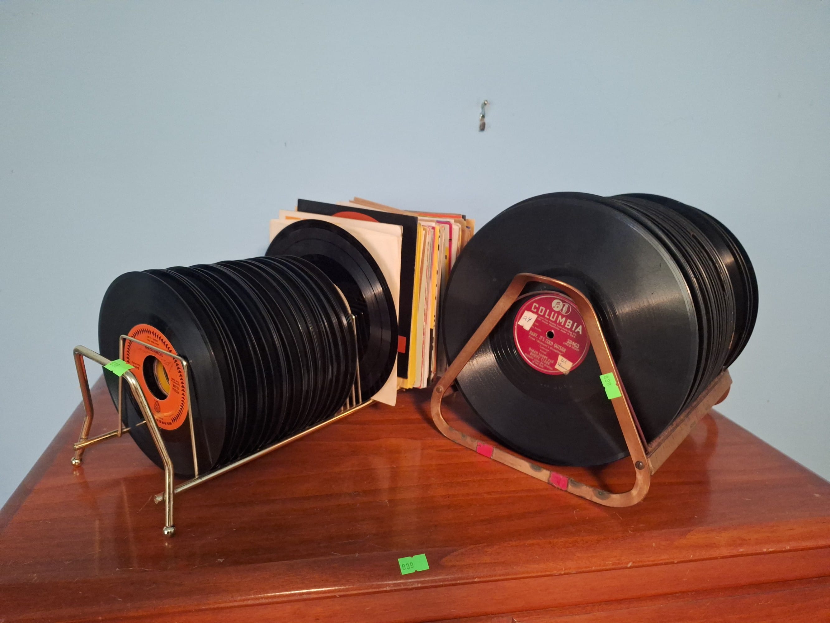 17 Goshen Electric advertising thermometer and clip board, First National Bank calendar 1973, Kok’s Woodgoods advertising gavel, Ohio Plate glass paperweight, New Haven Motor and Ingersoll pocket watches need repaired
