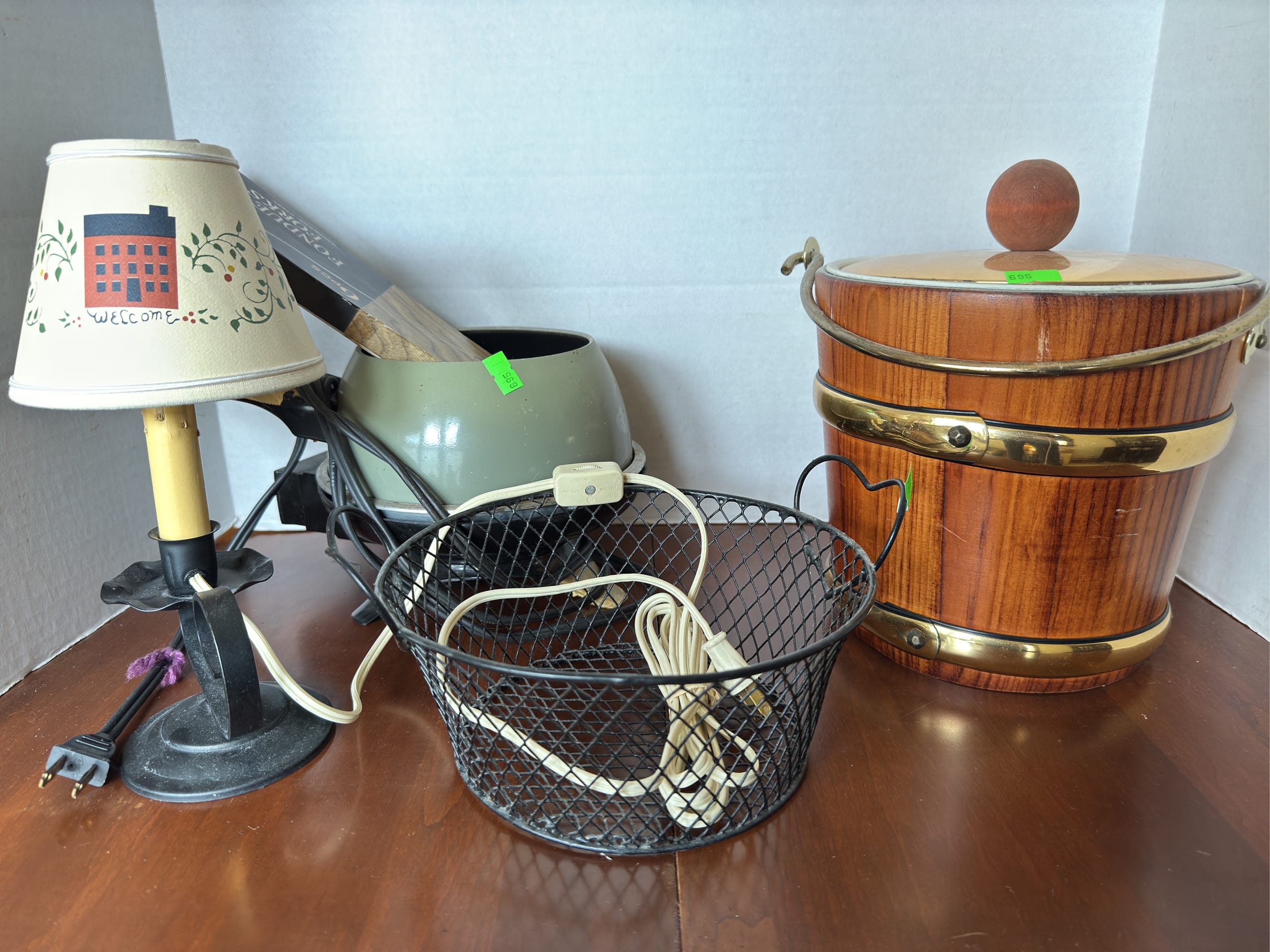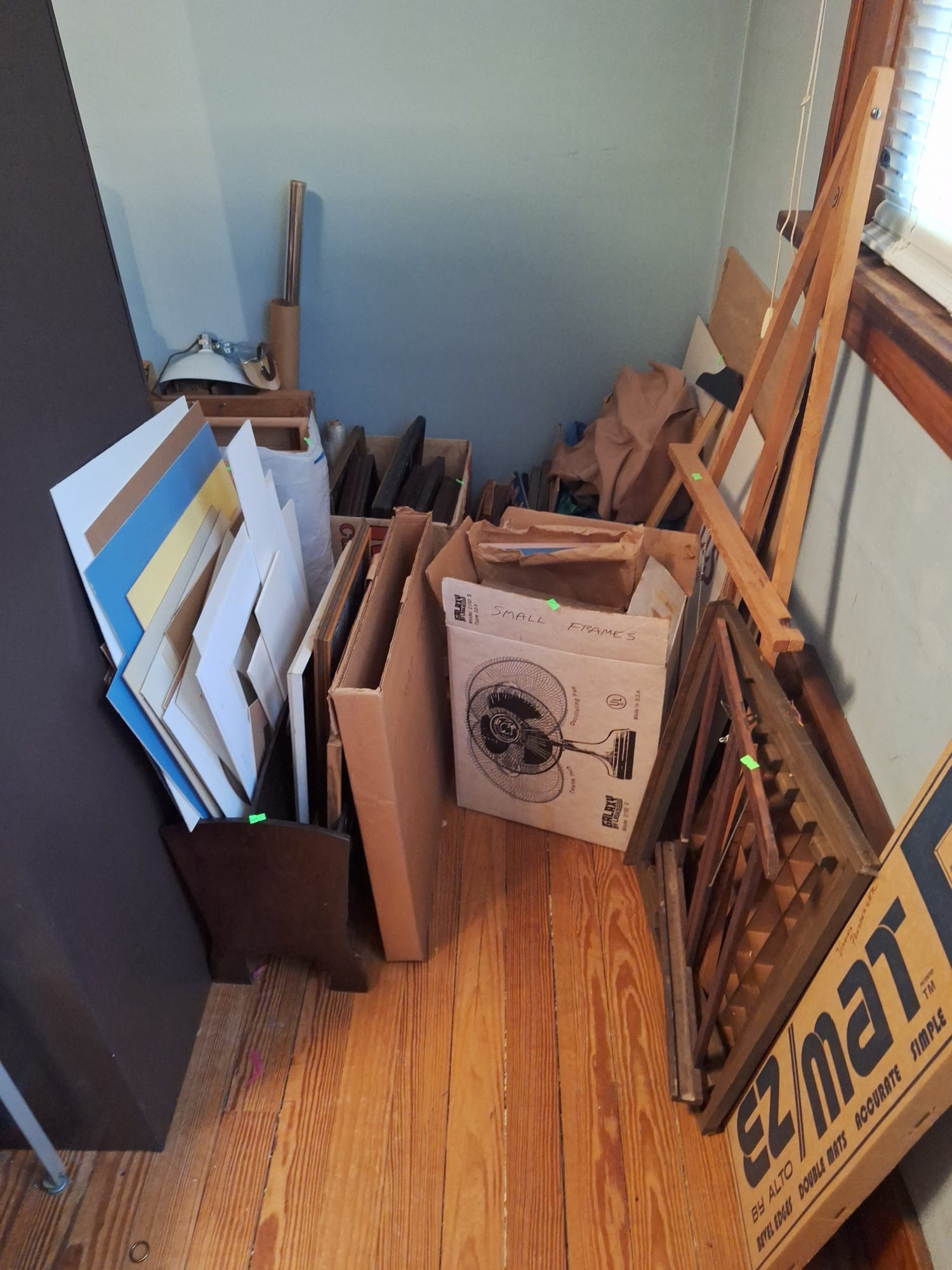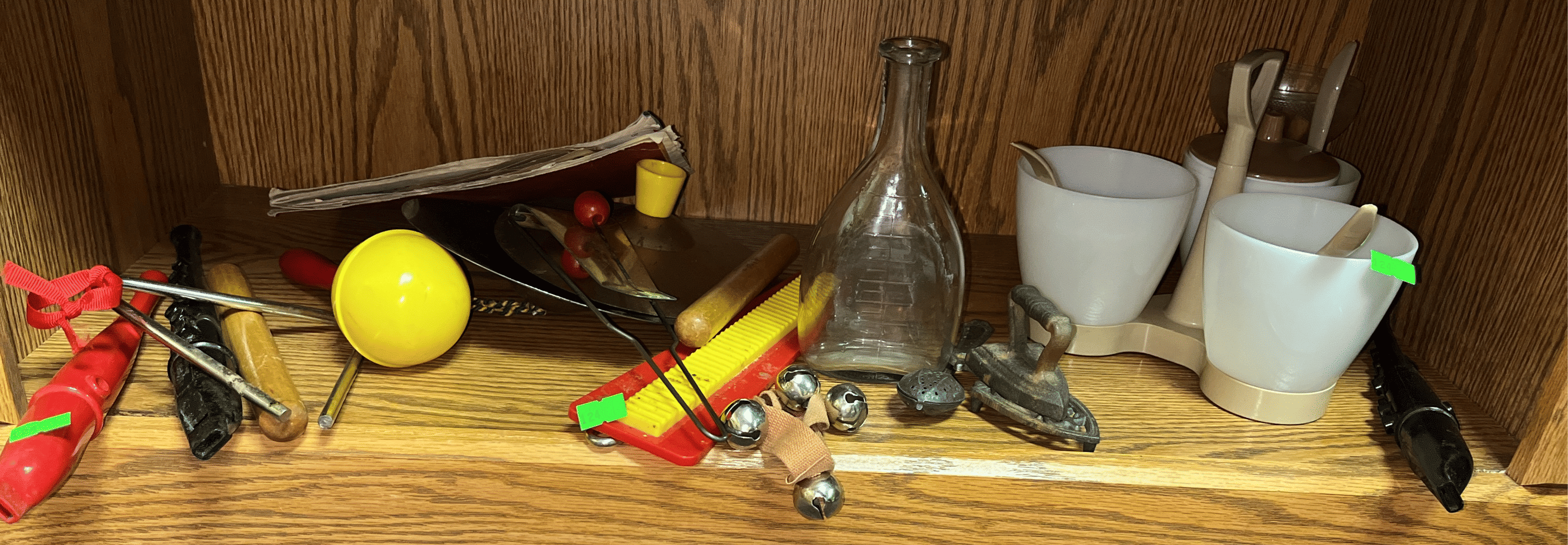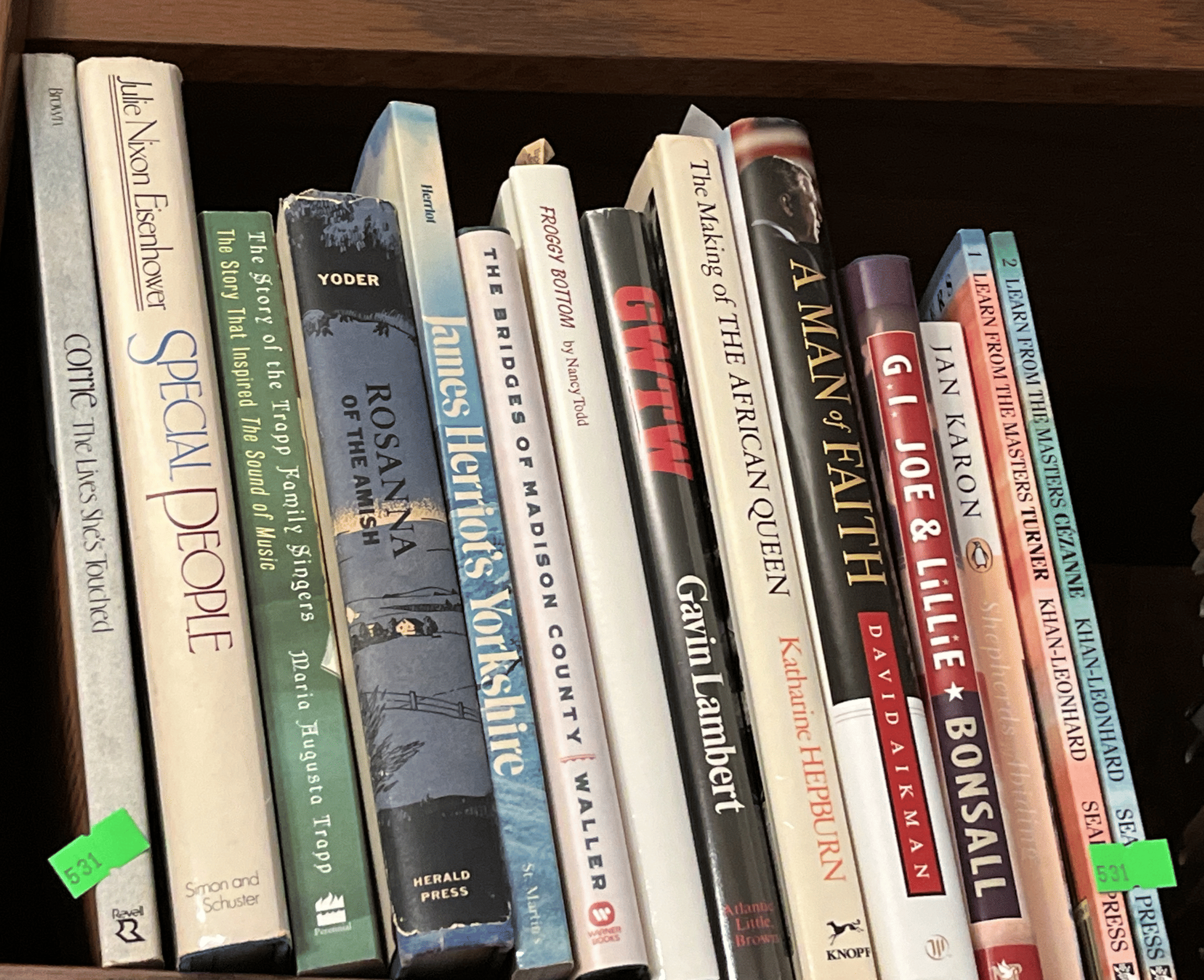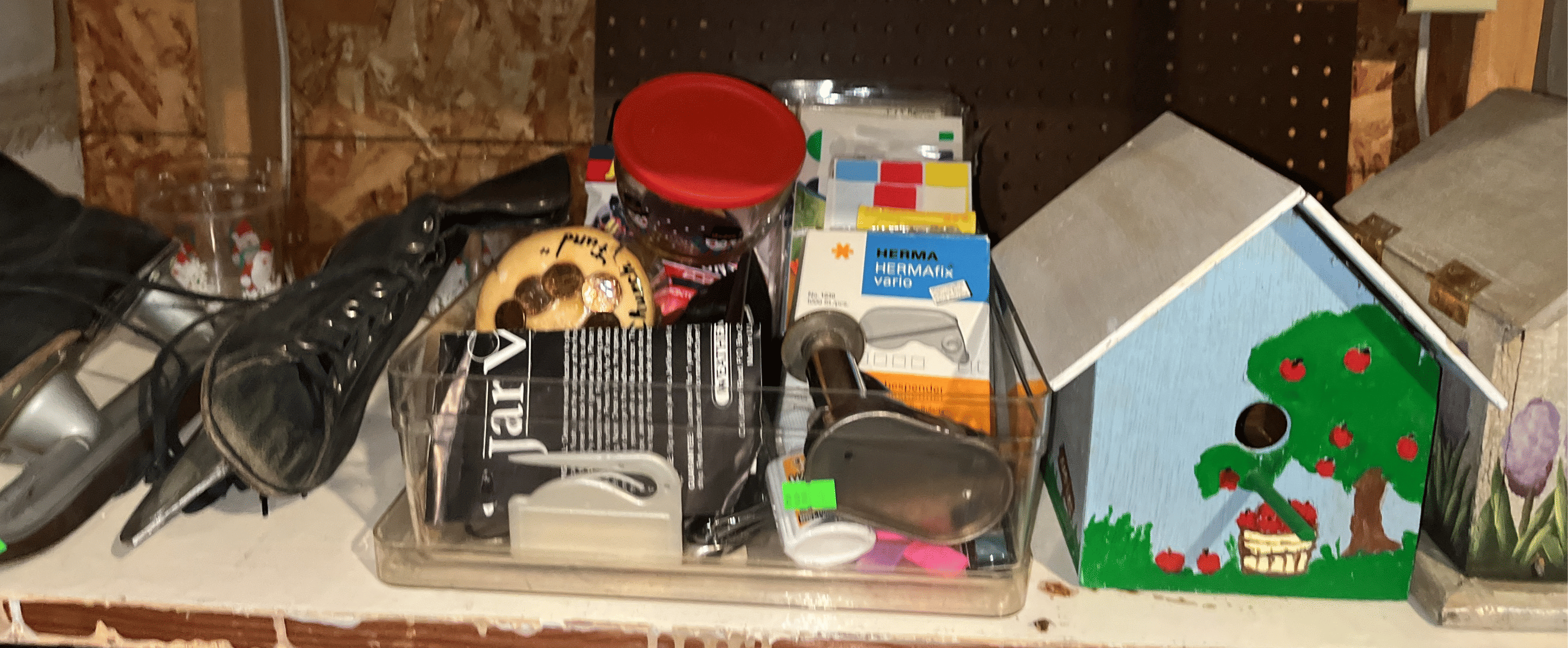 17 Goshen Electric advertising thermometer and clip board, First National Bank calendar 1973, Kok’s Woodgoods advertising gavel, Ohio Plate glass paperweight, New Haven Motor and Ingersoll pocket watches need repaired