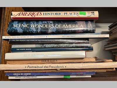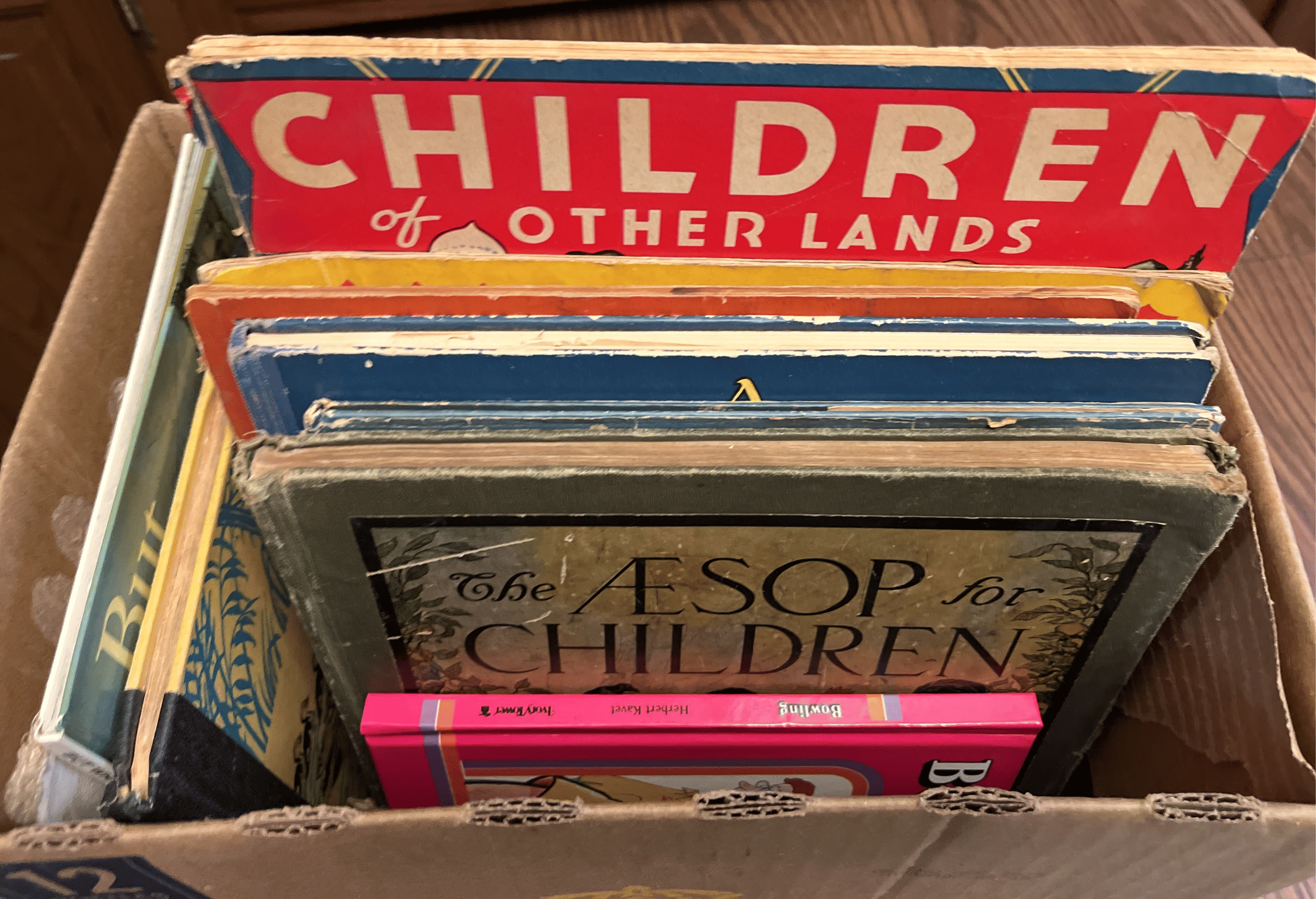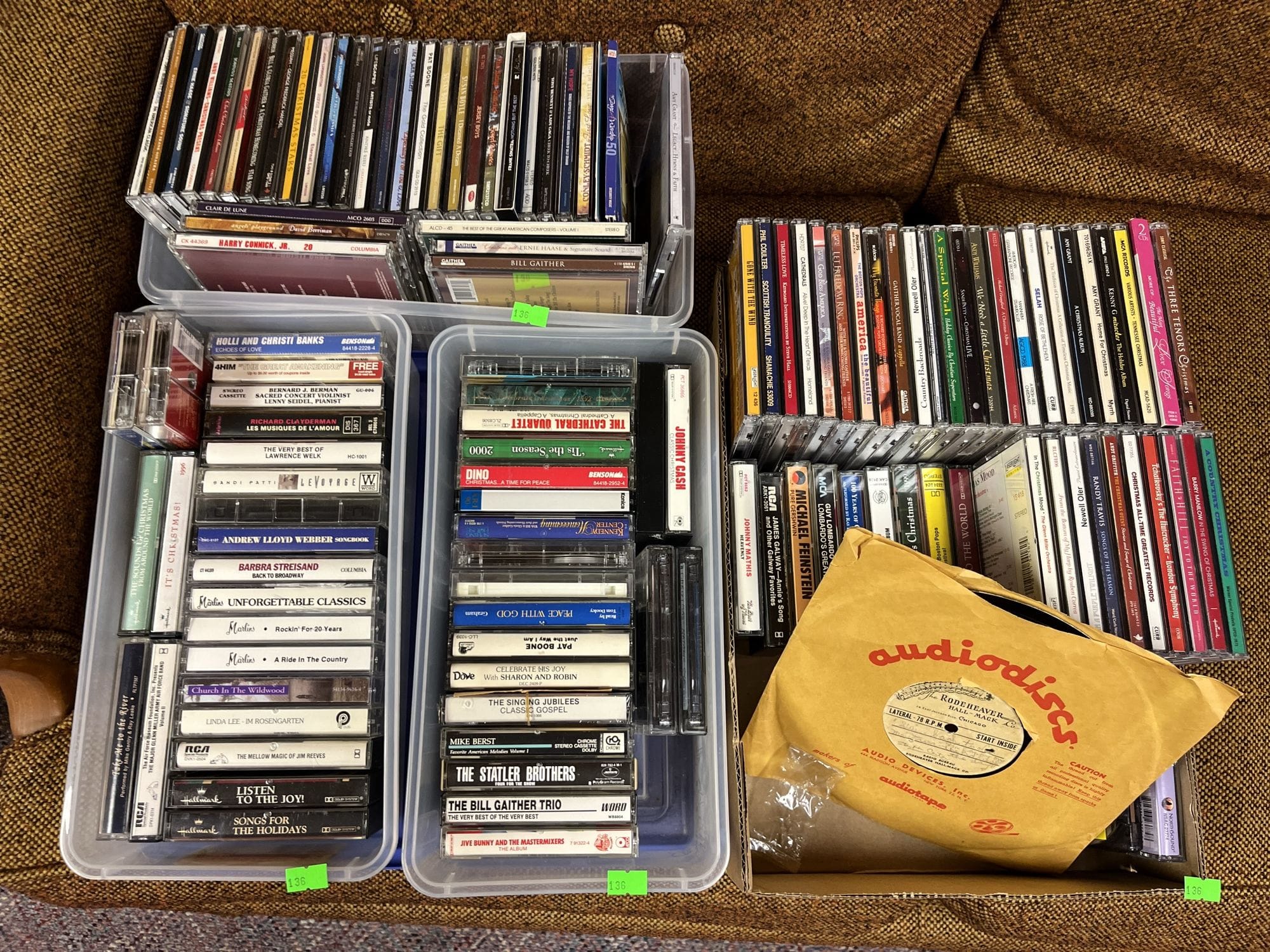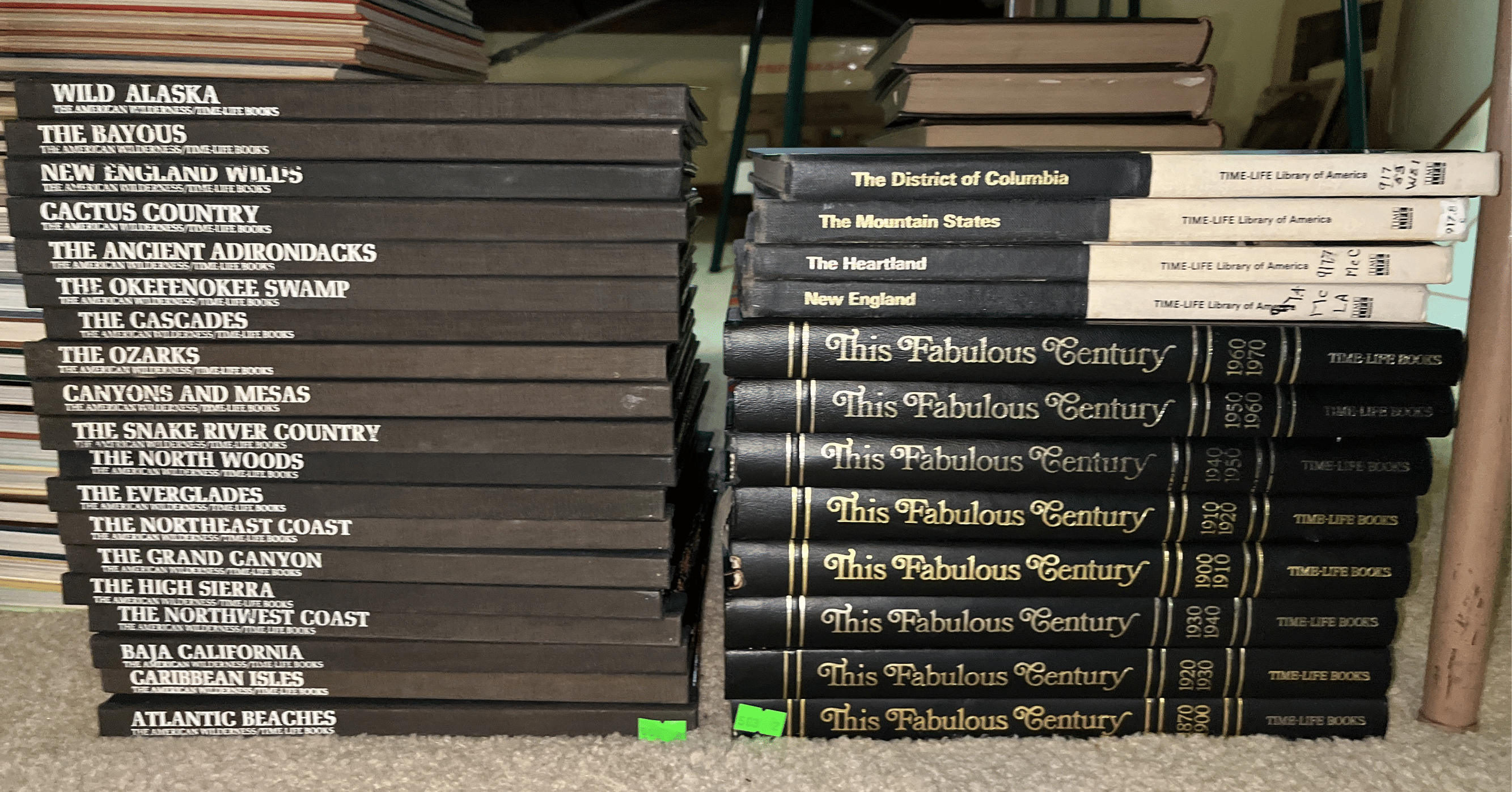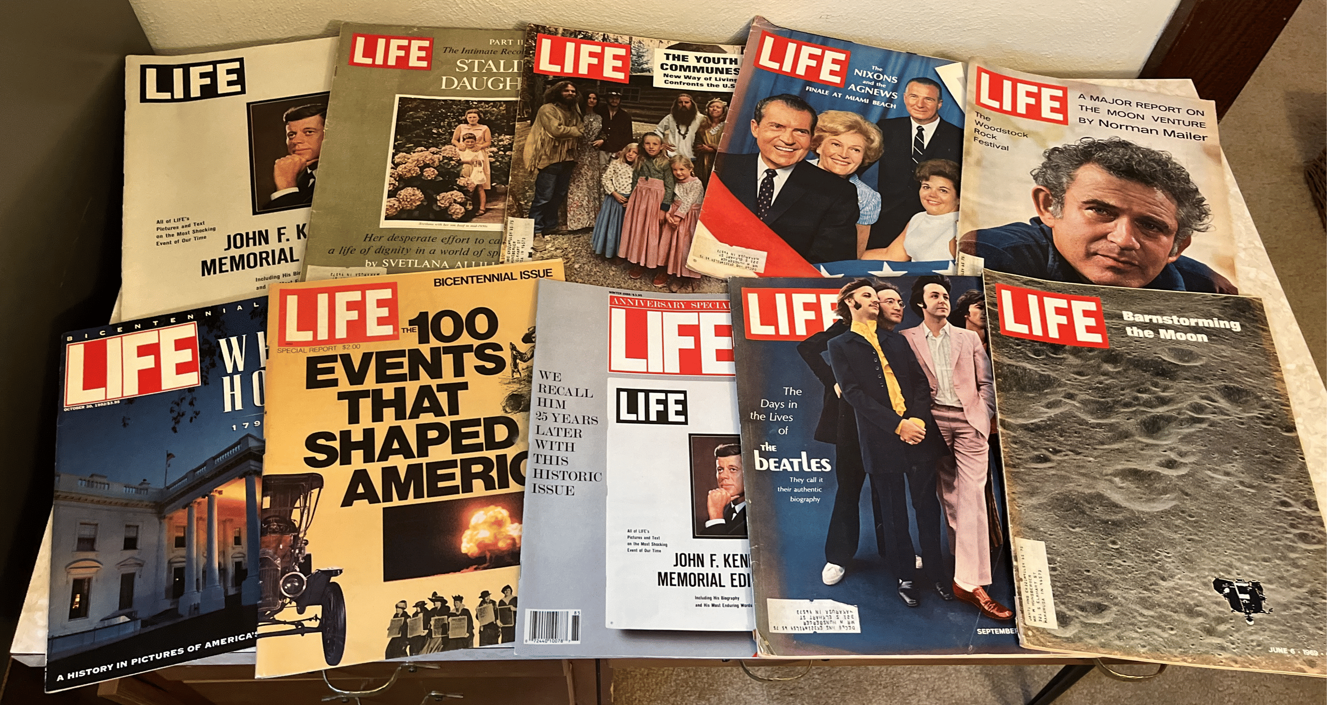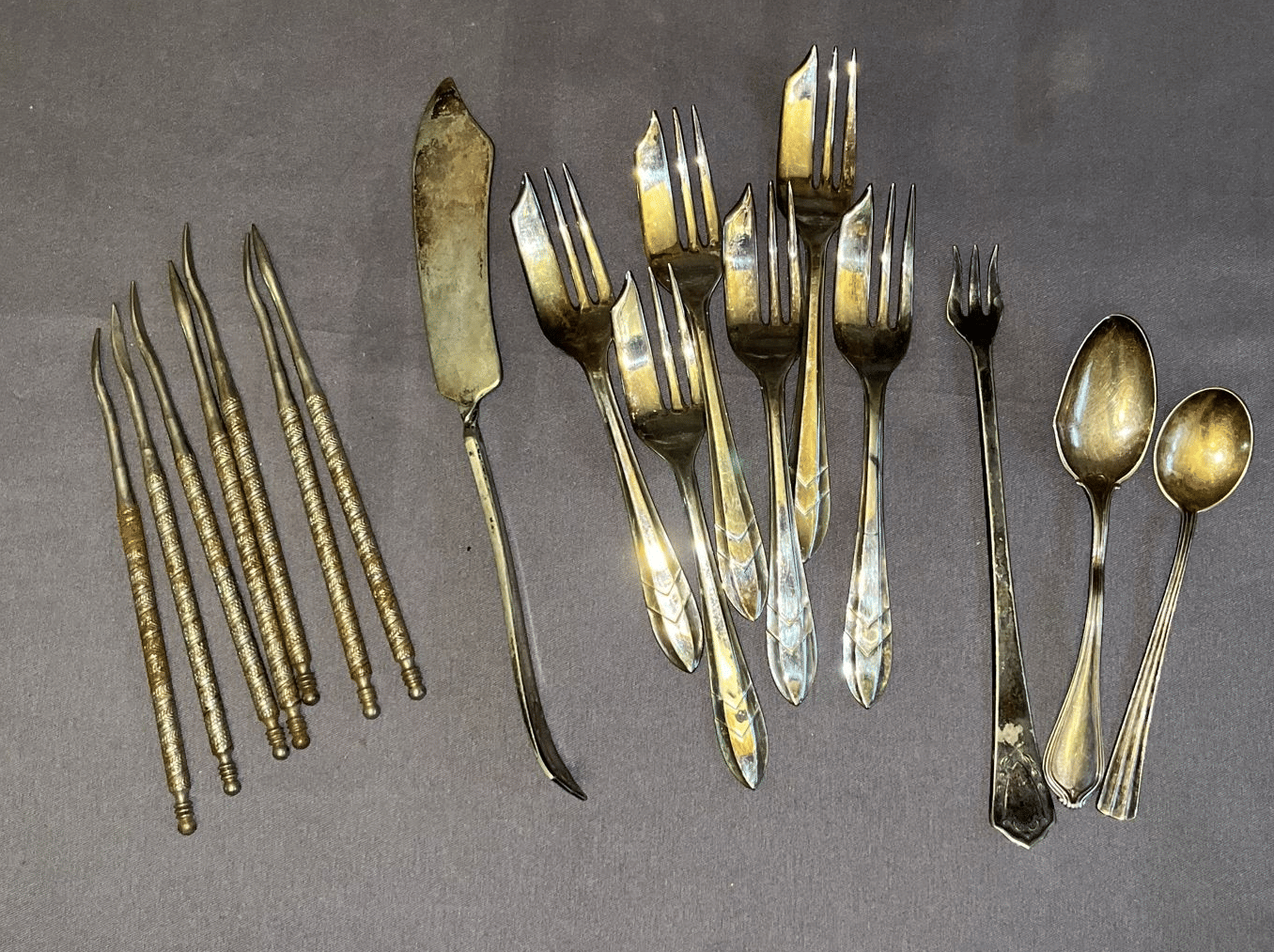 17 Goshen Electric advertising thermometer and clip board, First National Bank calendar 1973, Kok’s Woodgoods advertising gavel, Ohio Plate glass paperweight, New Haven Motor and Ingersoll pocket watches need repaired