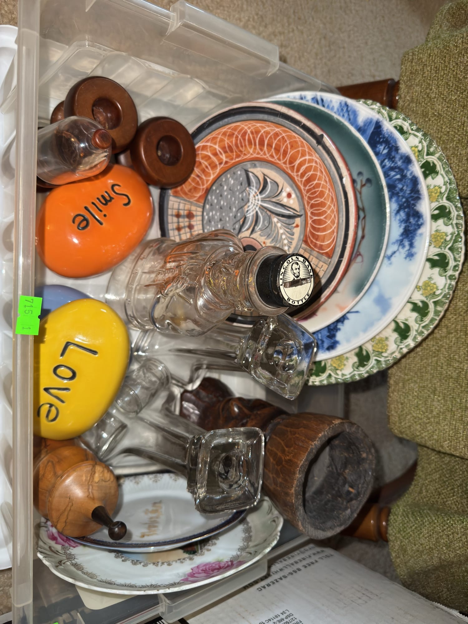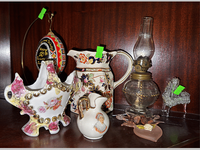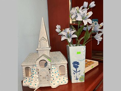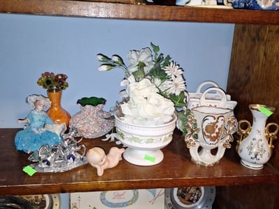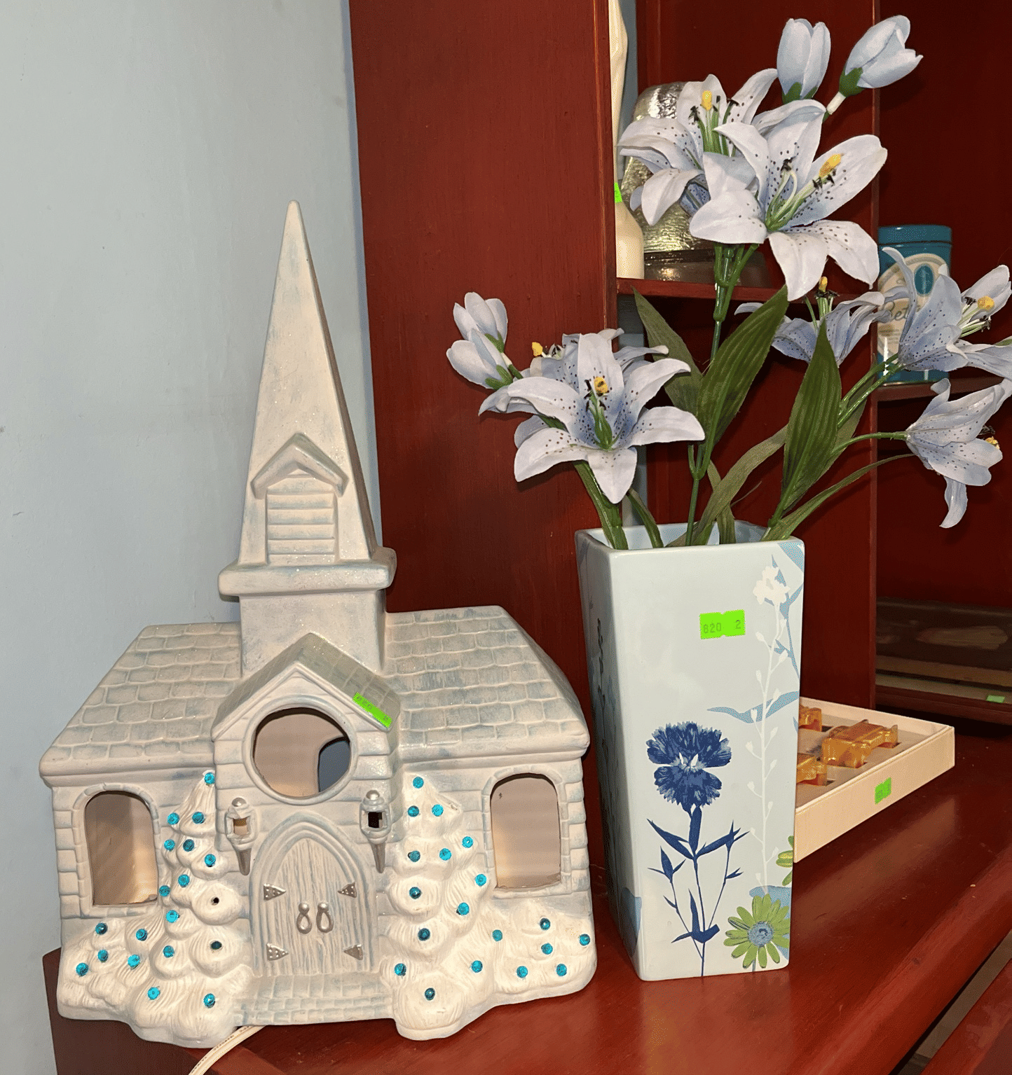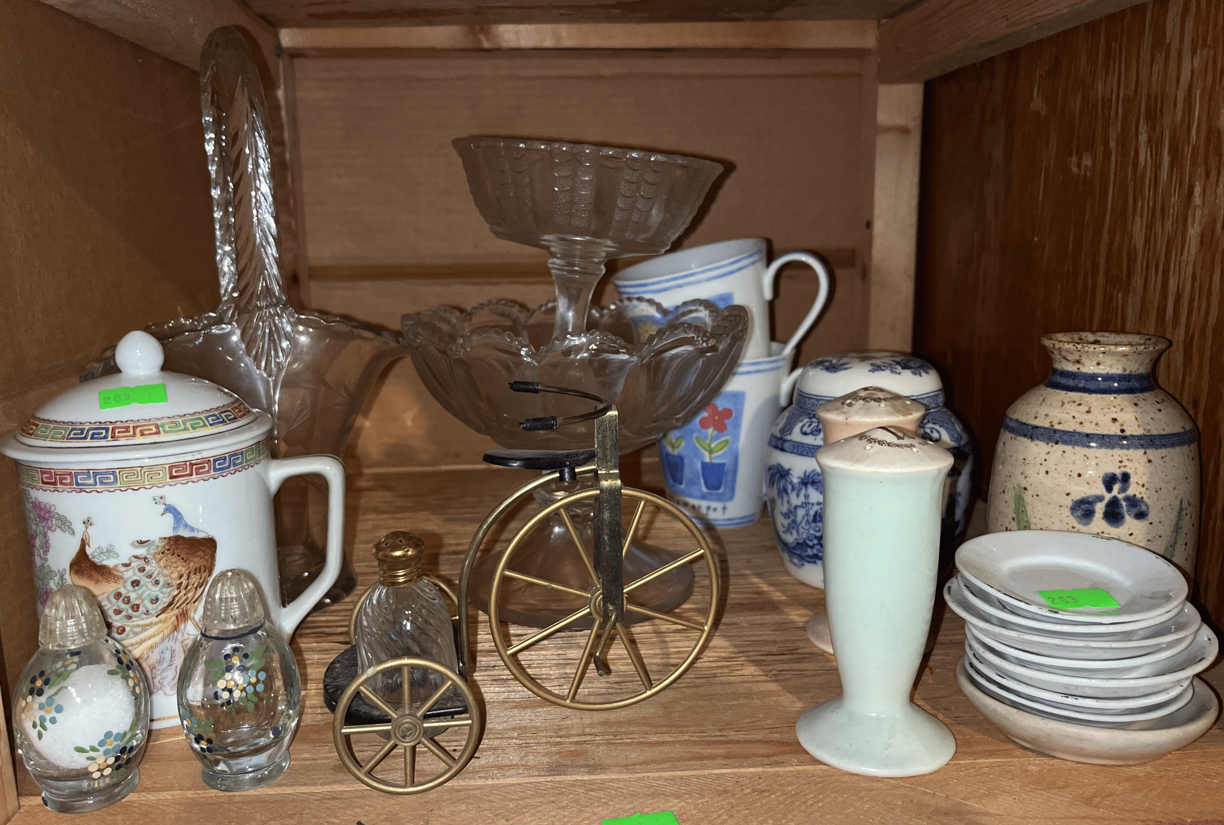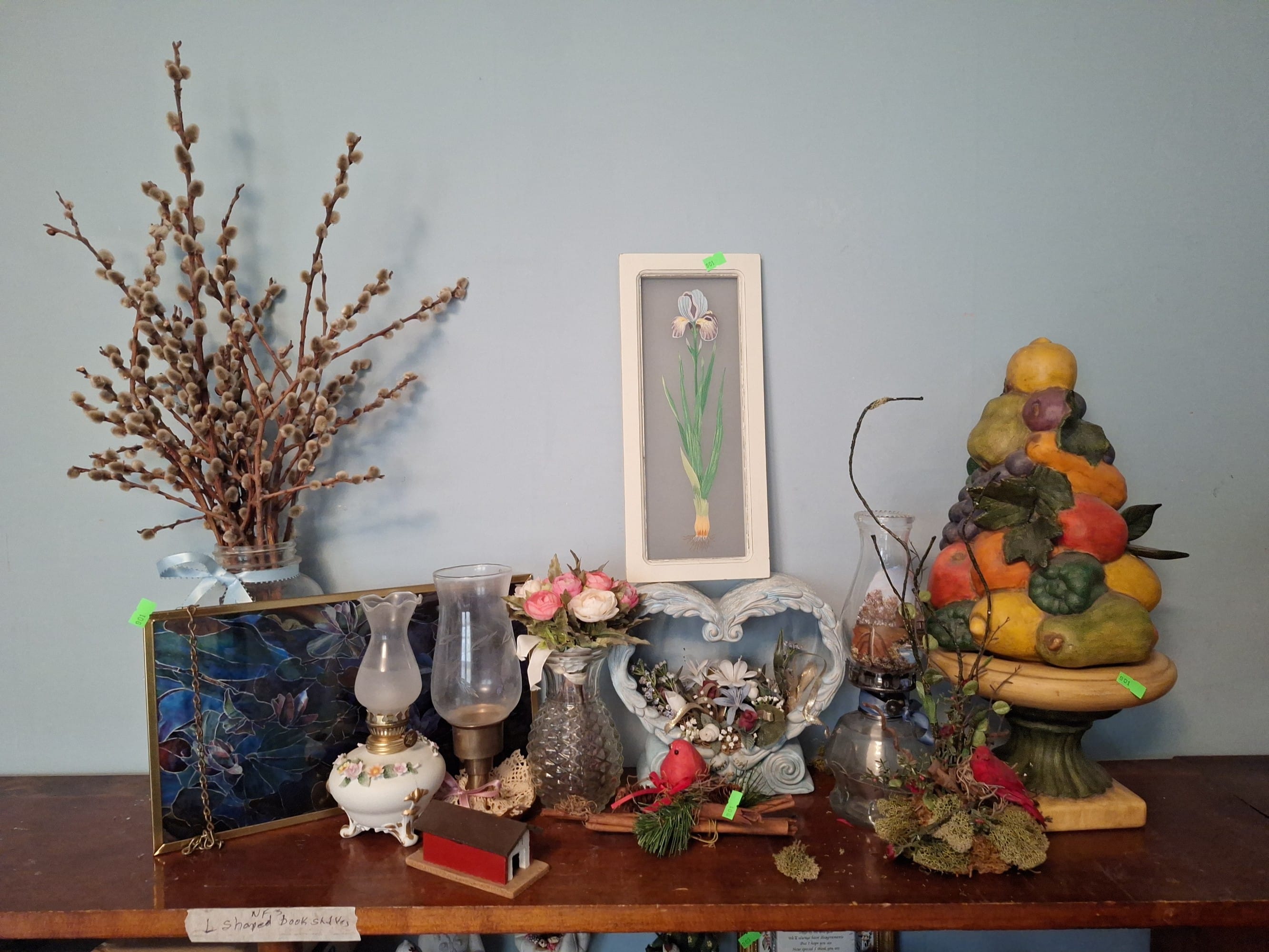 901 Vases, mini oil lamp, ceramic heart and fruit, painted window