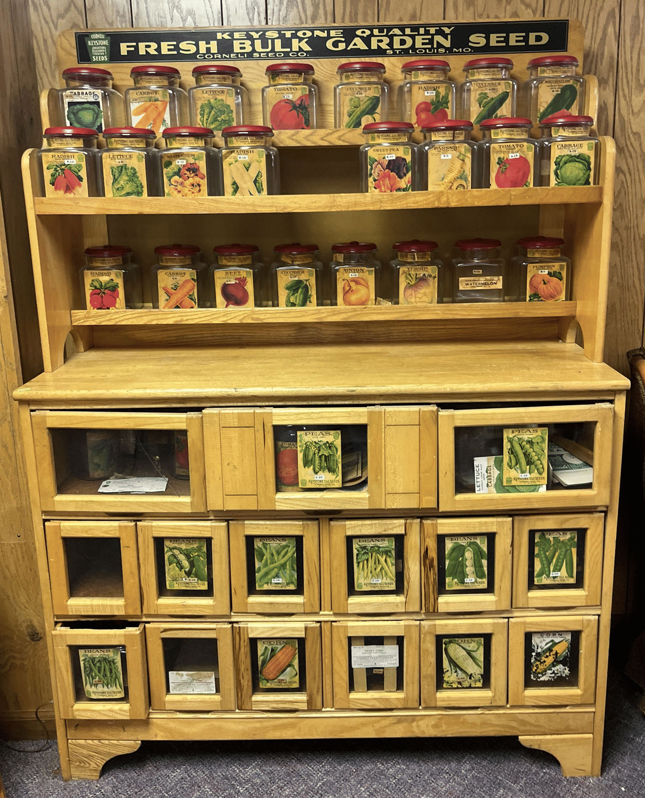 35 Keystone quality Fresh Bulk seed display cabinet with canisters, 1 drawer glass cracked 45x17x62"