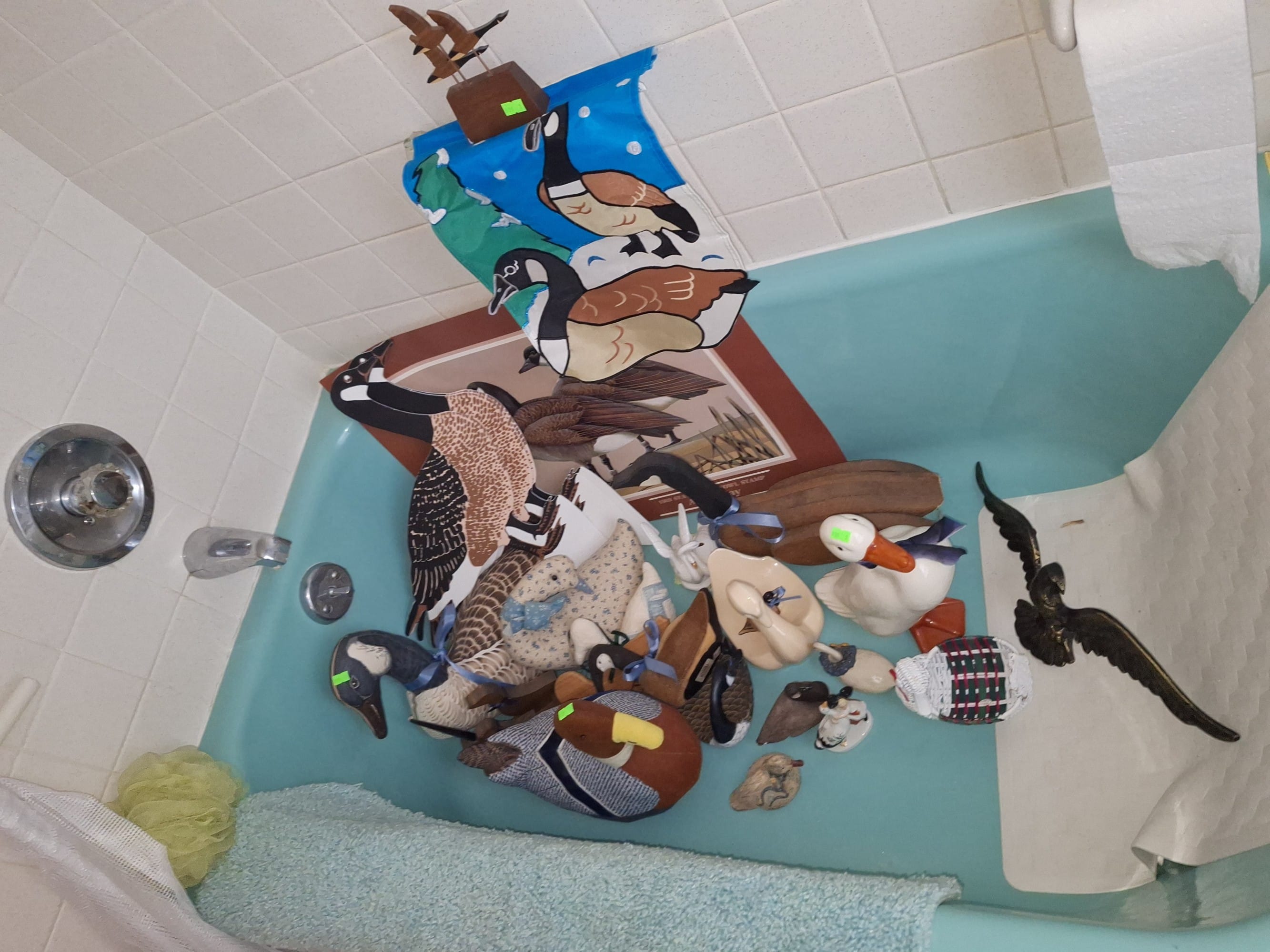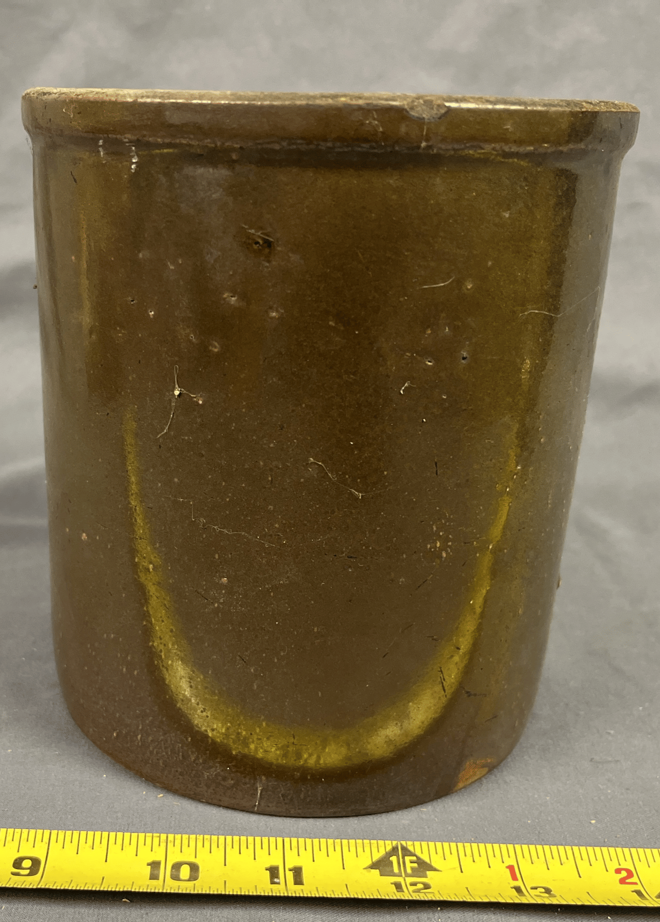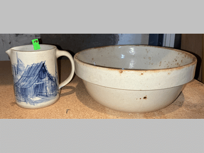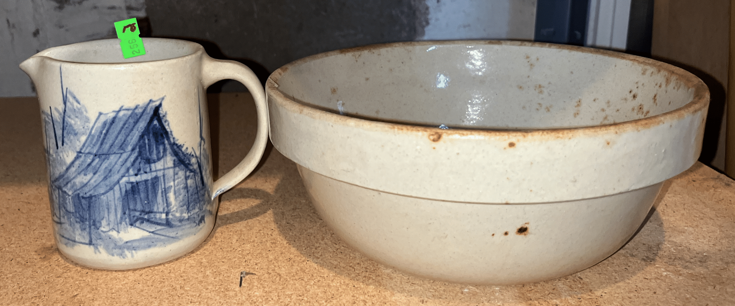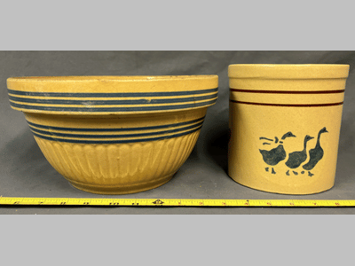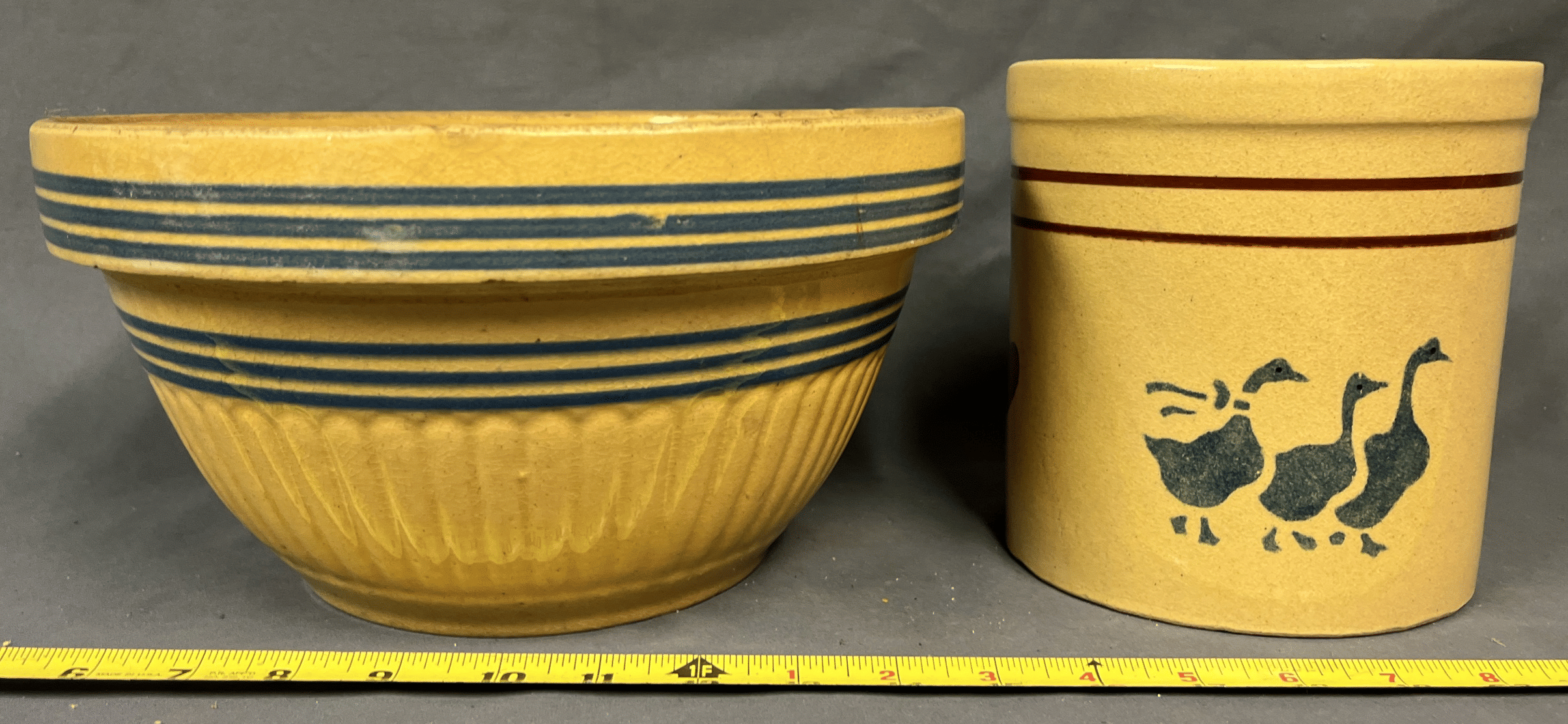 74 RRP crock with blue goose design 6" and stoneware bowl with crack 10"