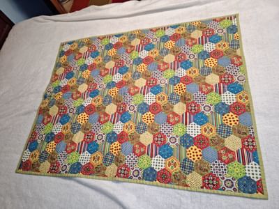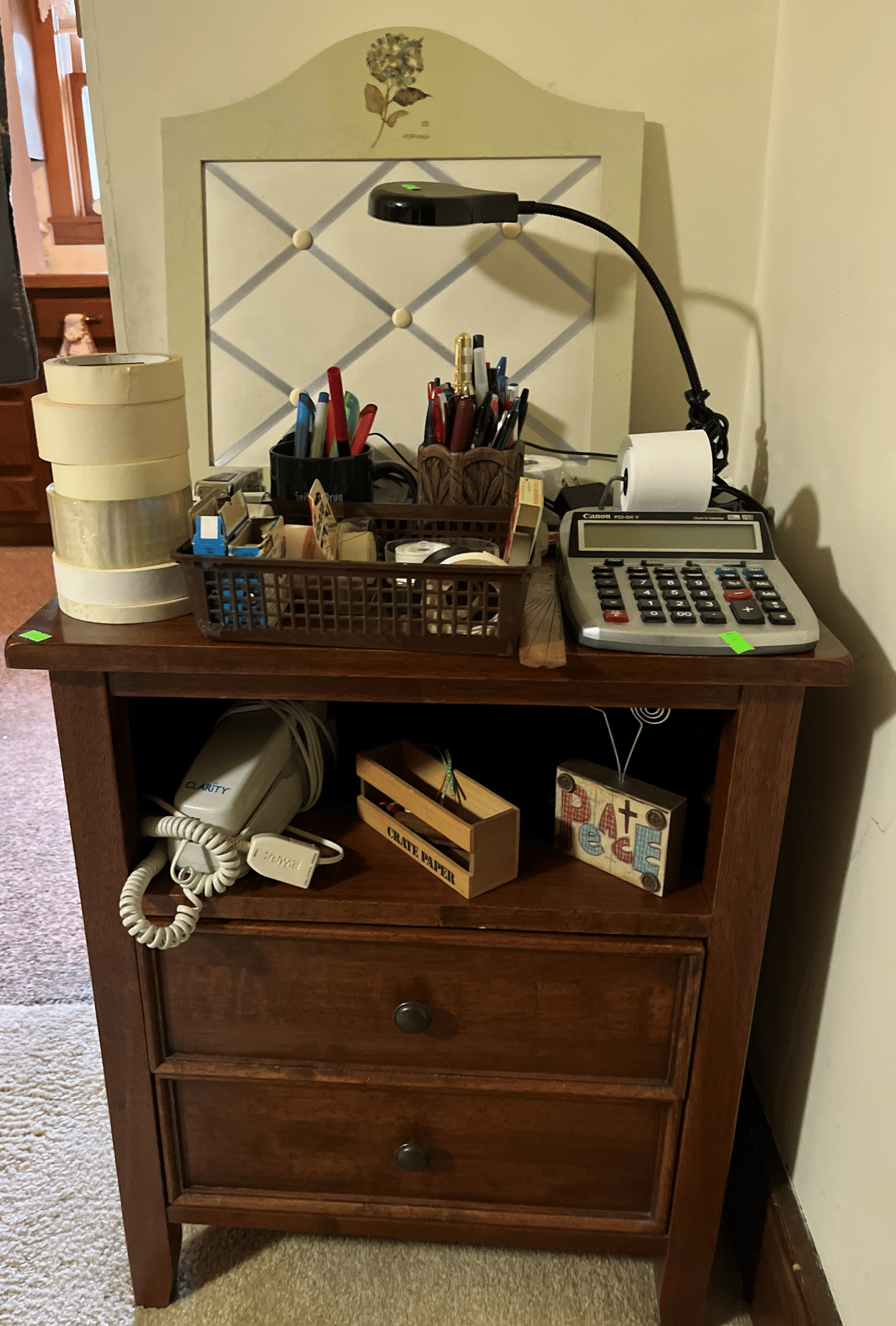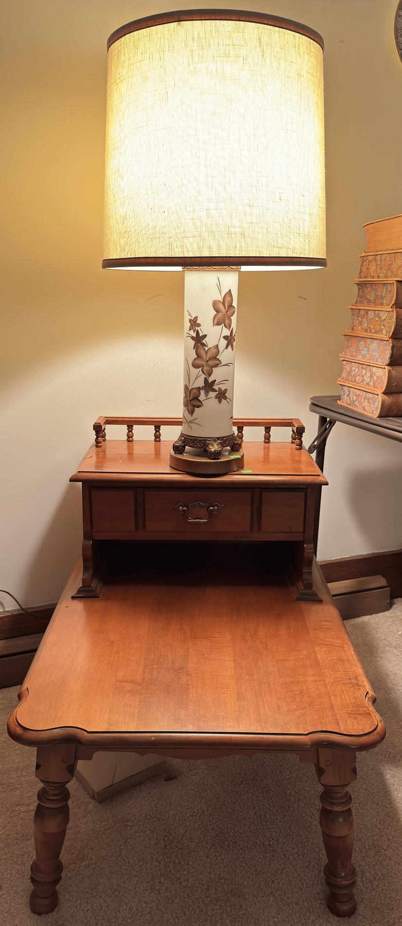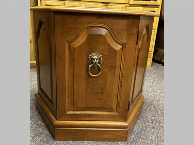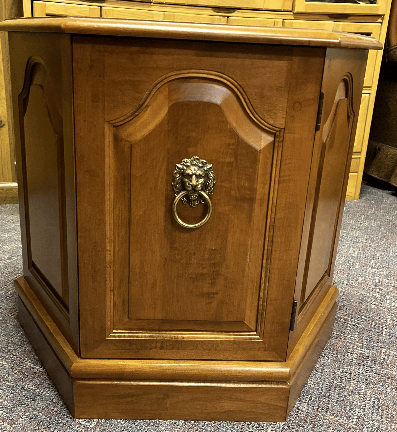 77 Hexagonal end stand with lower storage, has wear 21x21"