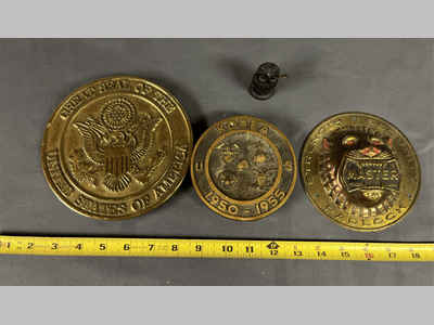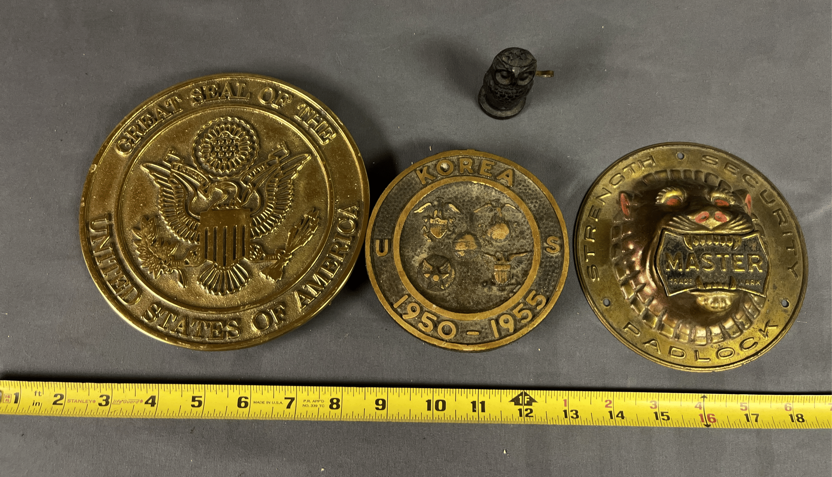86 Great Seal of the USA trivet, Korea 1950-1955 token, master padlock token, cast owl figurine