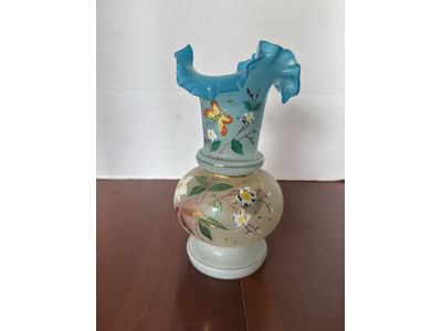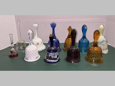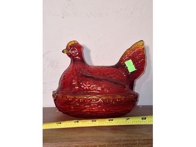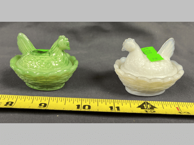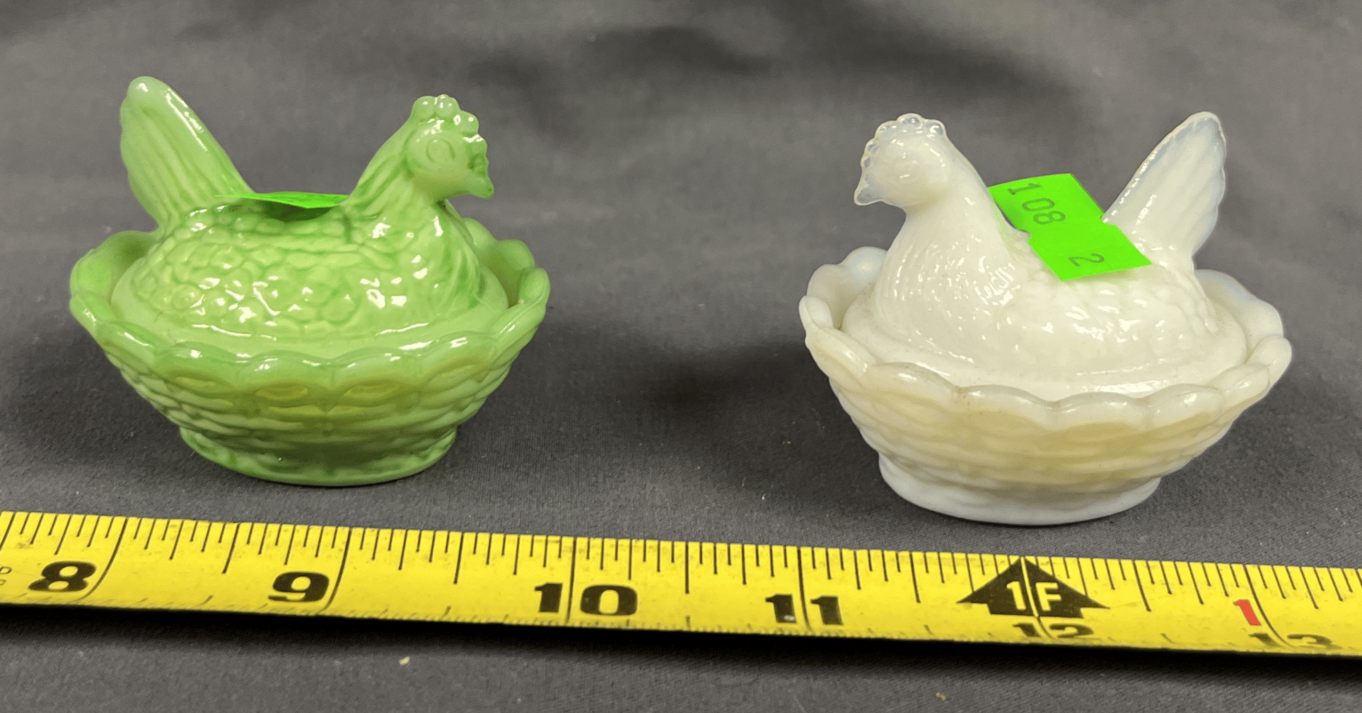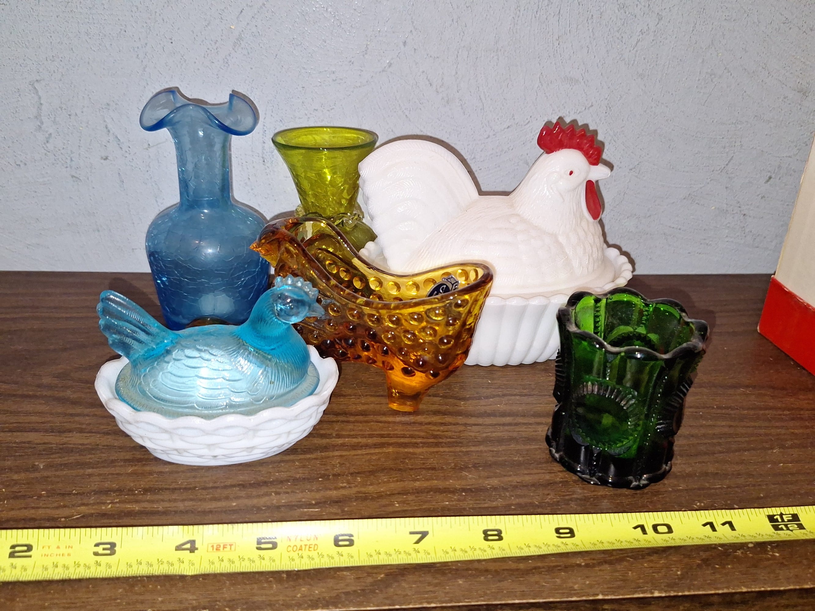 866 Westmoreland hen on nest regular size and mini, crackle vases, Fenton glass boot, green glass toothpick holder