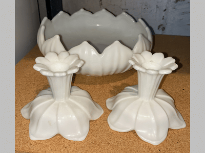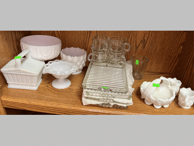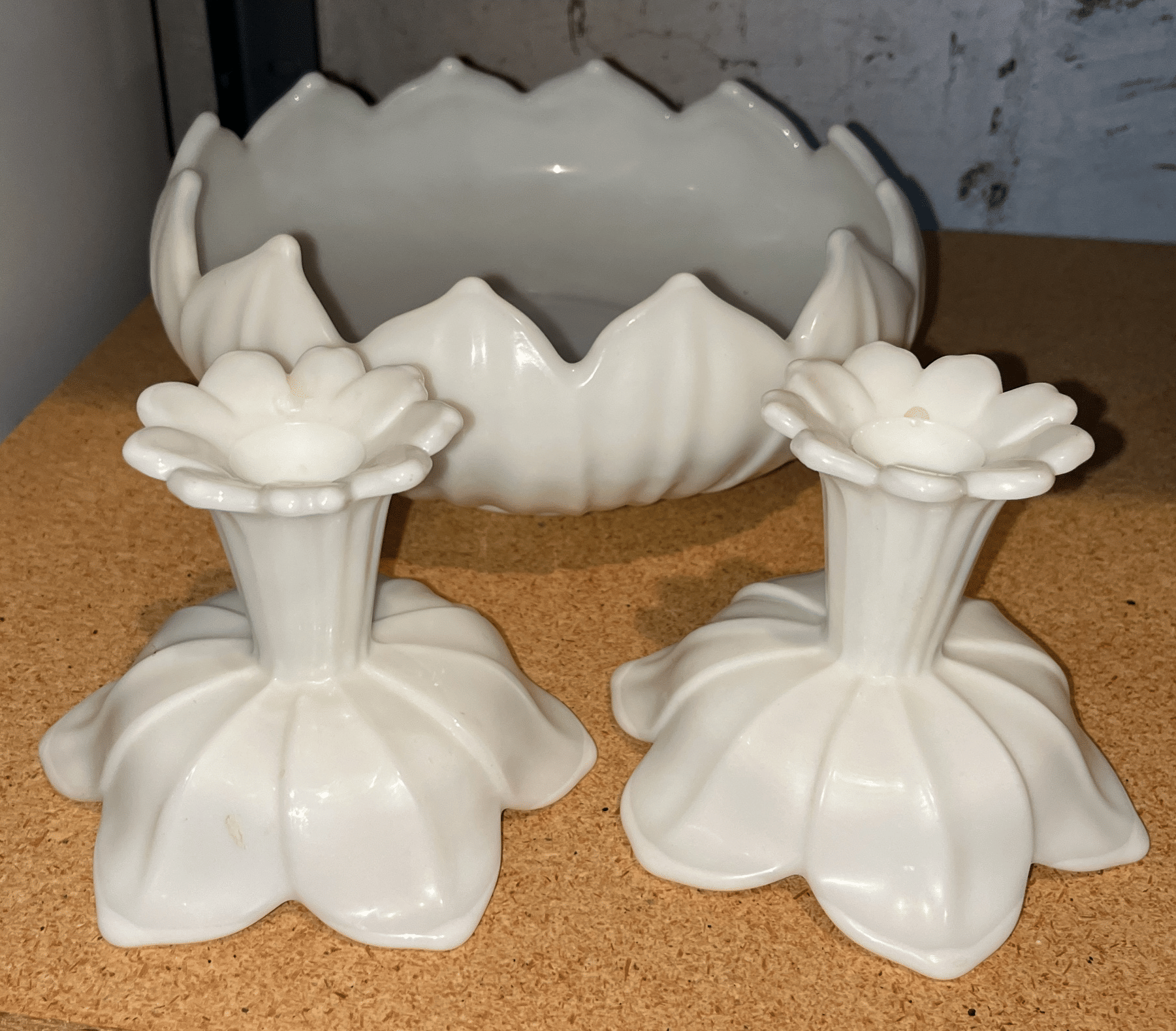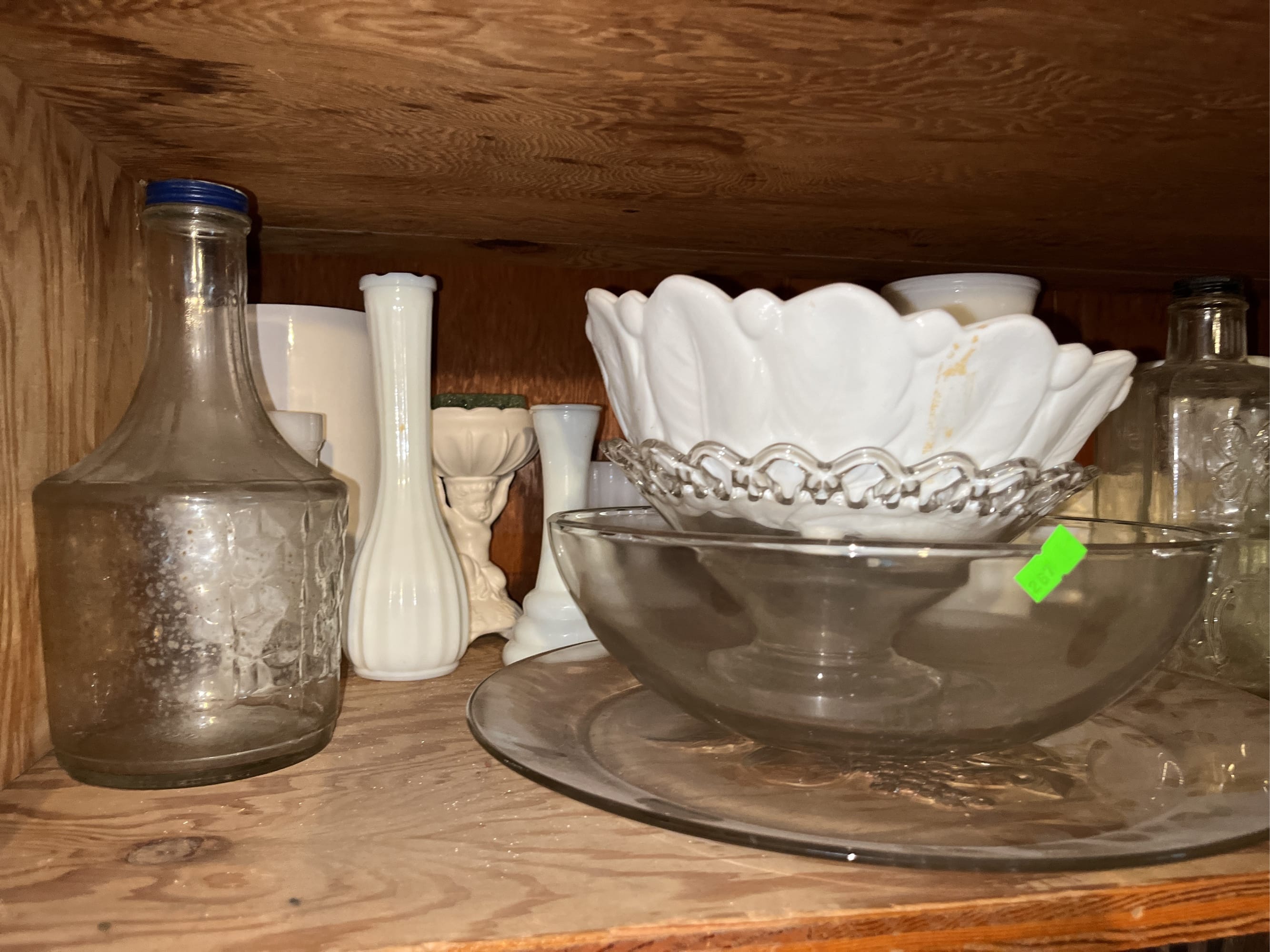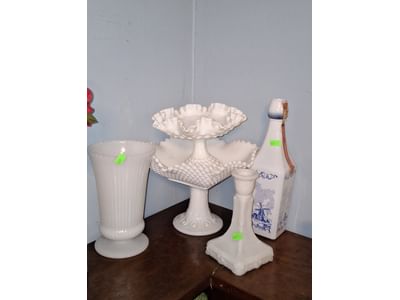 907 Milk glass pedestal dishes, white glass vase and candle holder, bottle