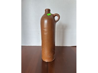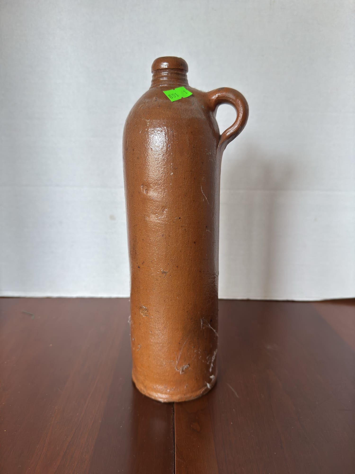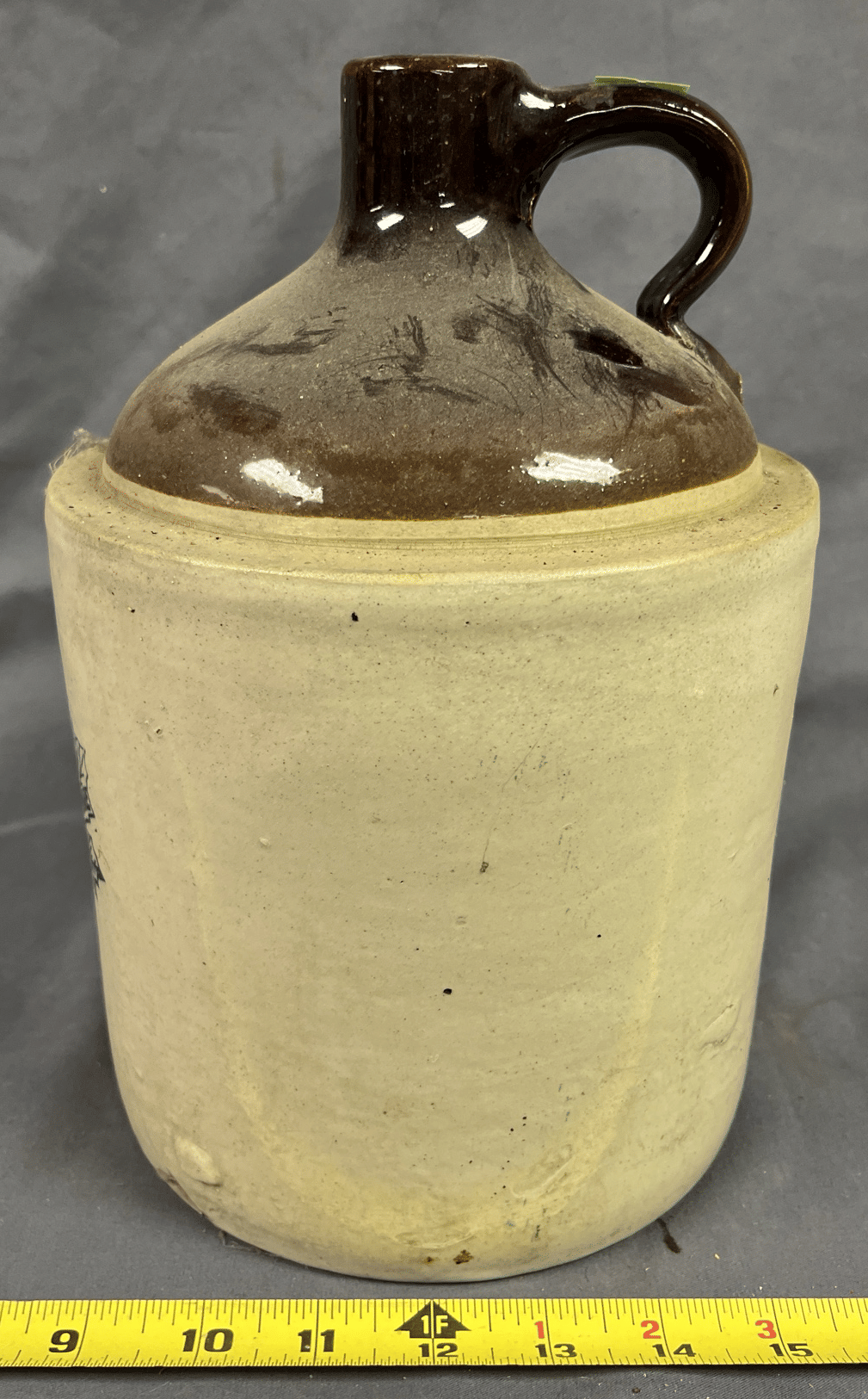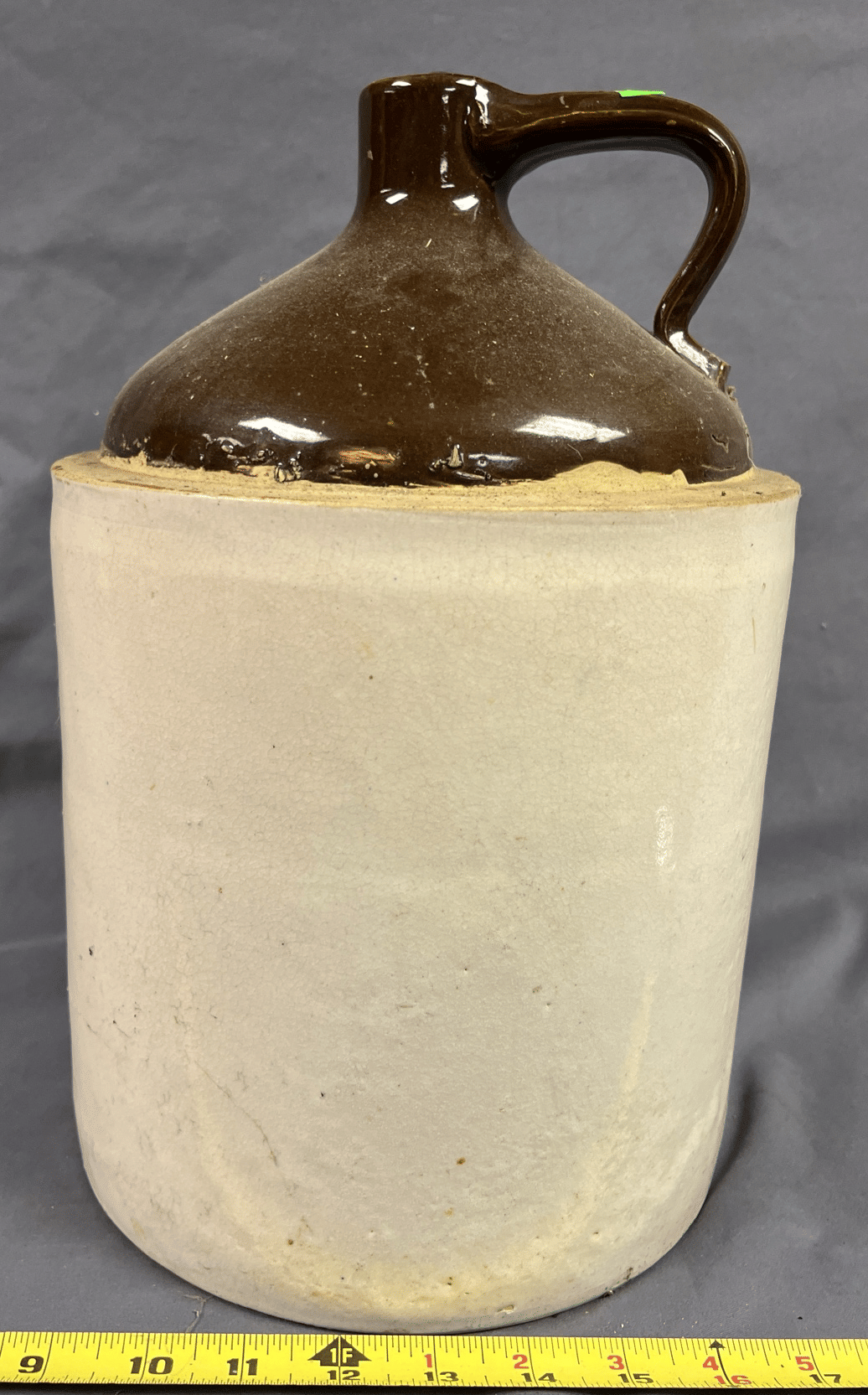 906 G M T & Bros Stein, brass candle holder and planter, bottles, spool