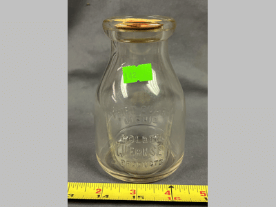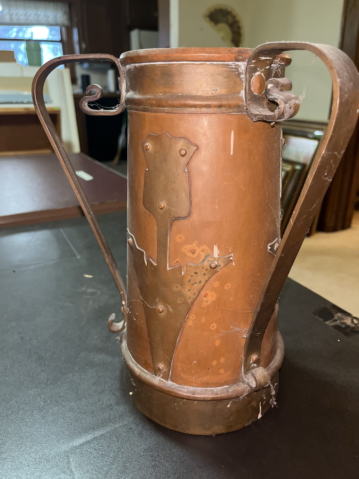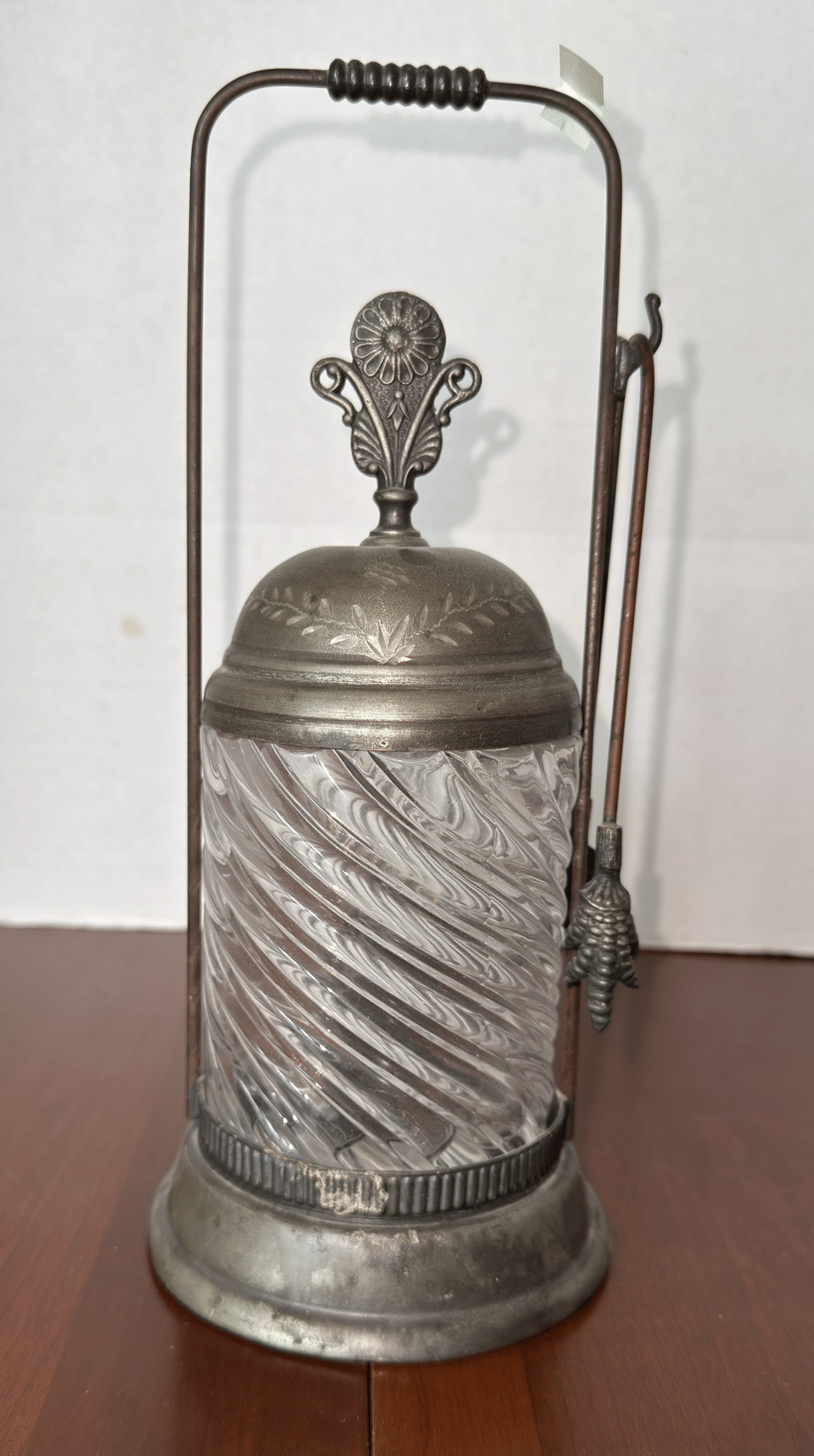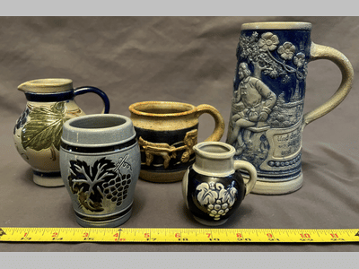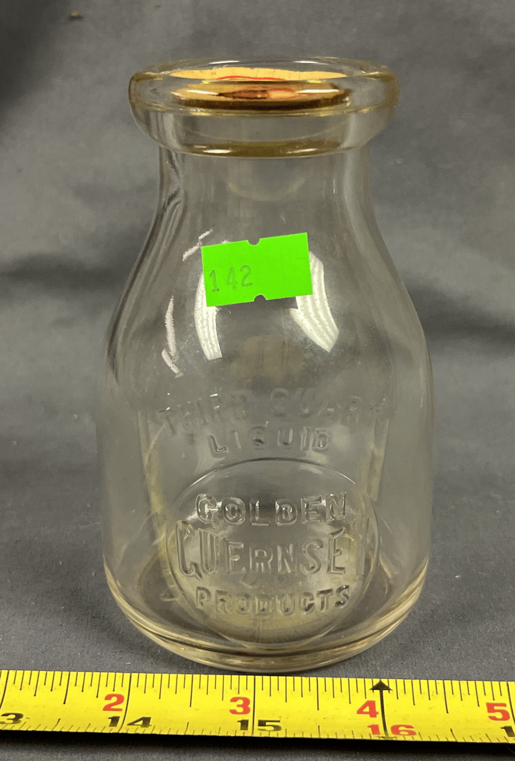 906 G M T & Bros Stein, brass candle holder and planter, bottles, spool