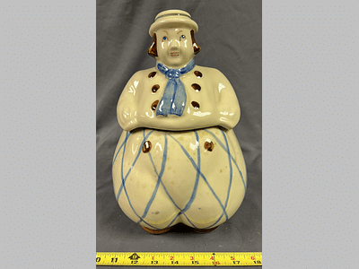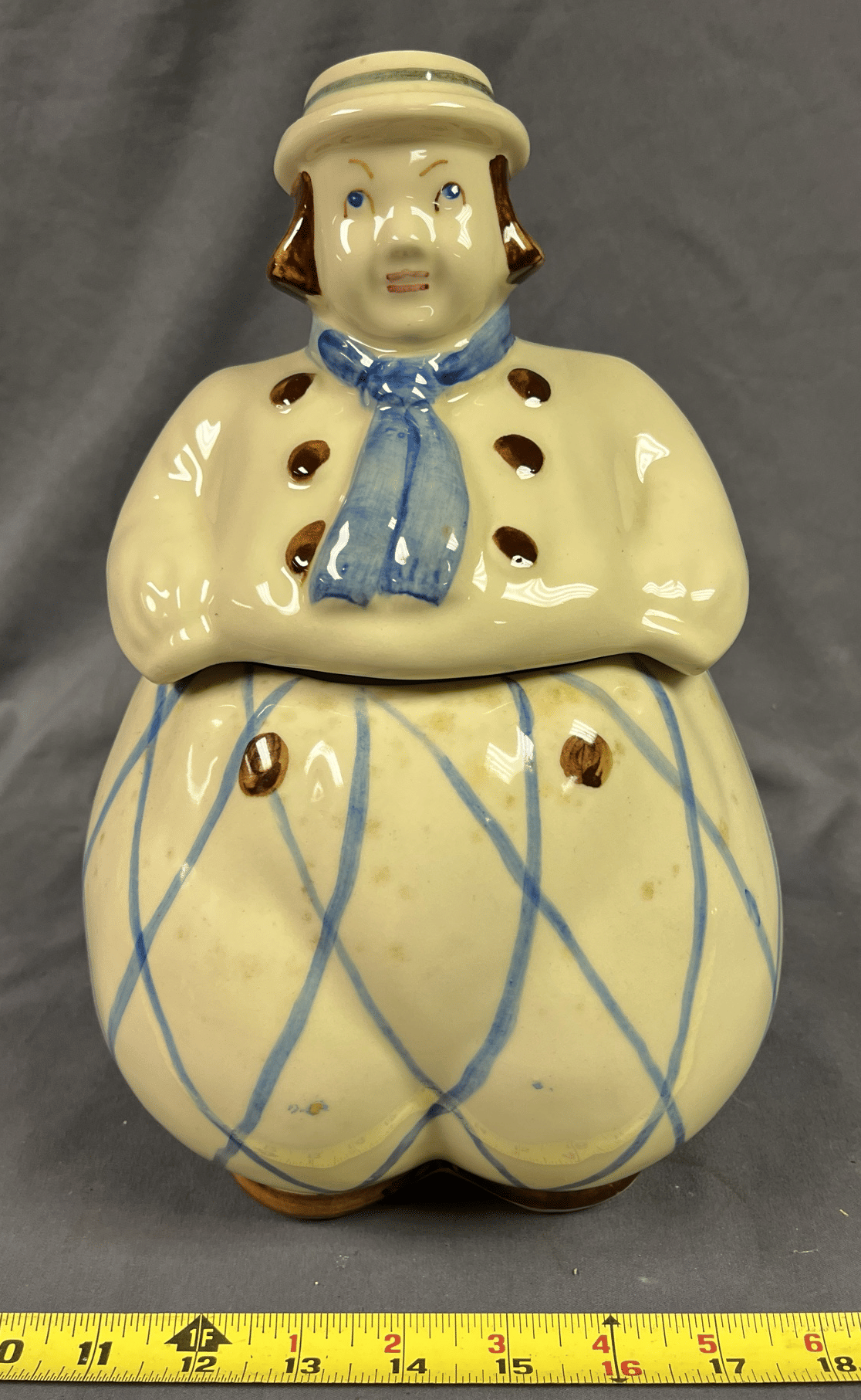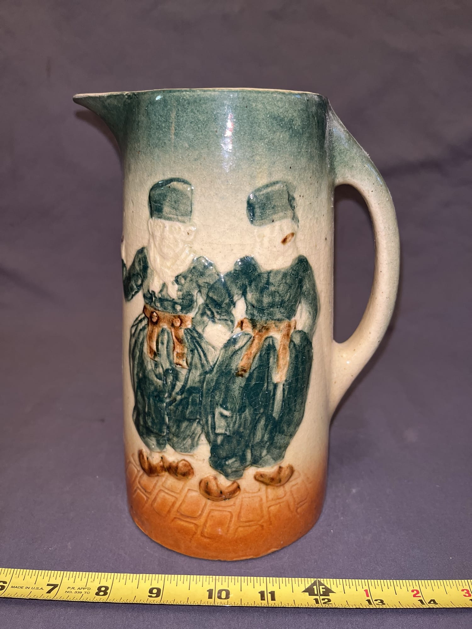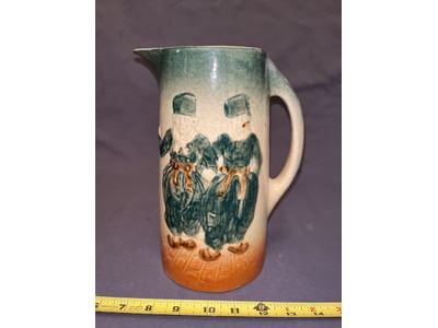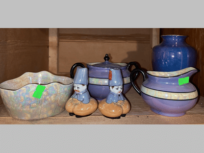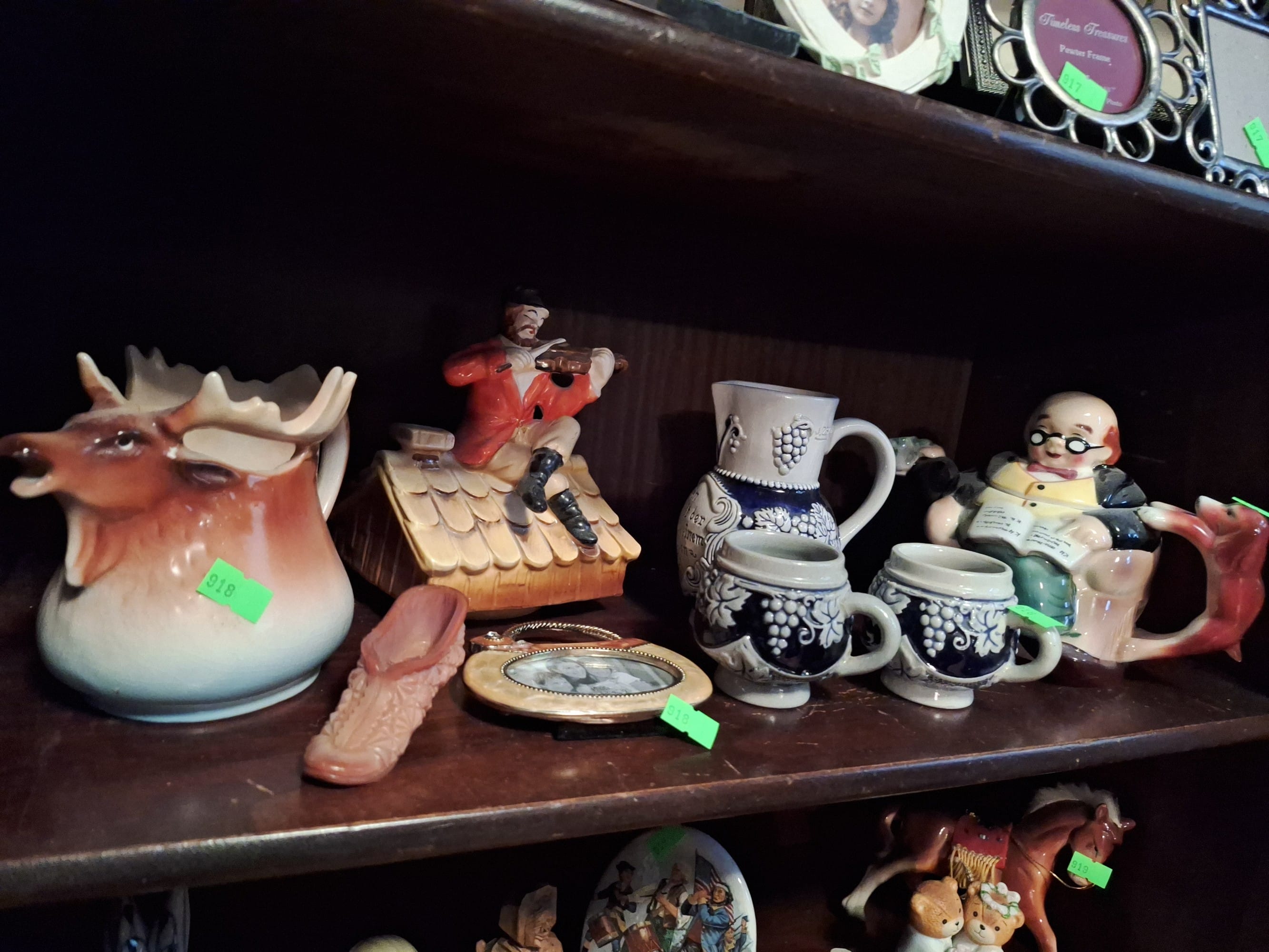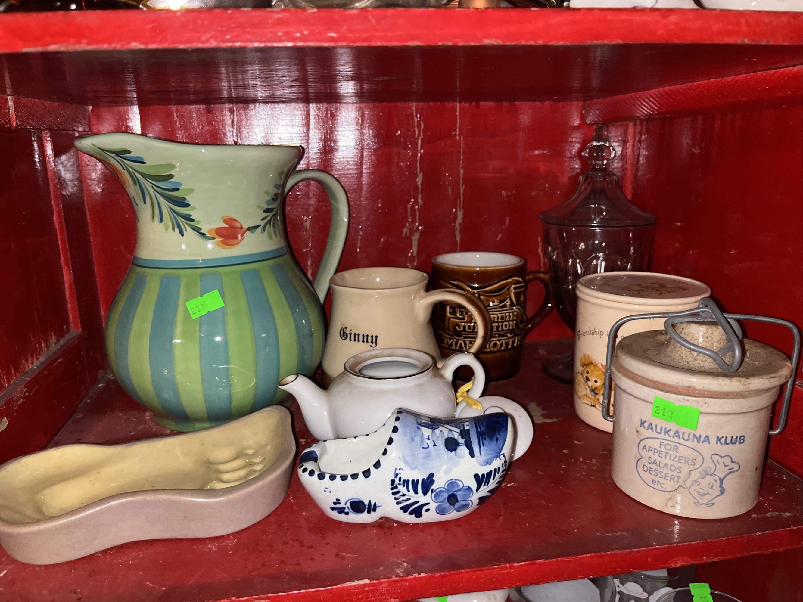 918 Ceramic teapot, pottery pitcher and mugs, jar top, moose creamer, glass boot