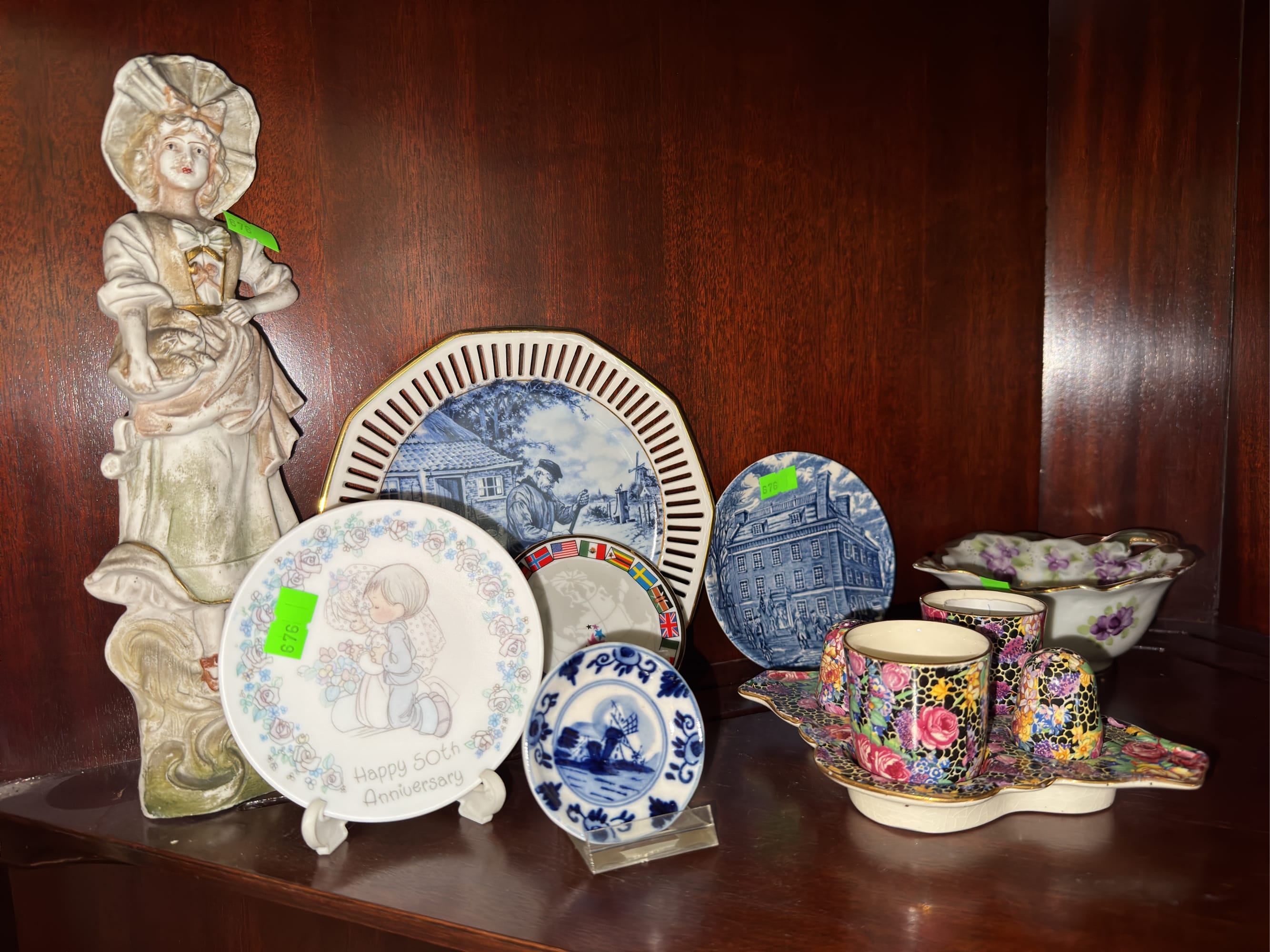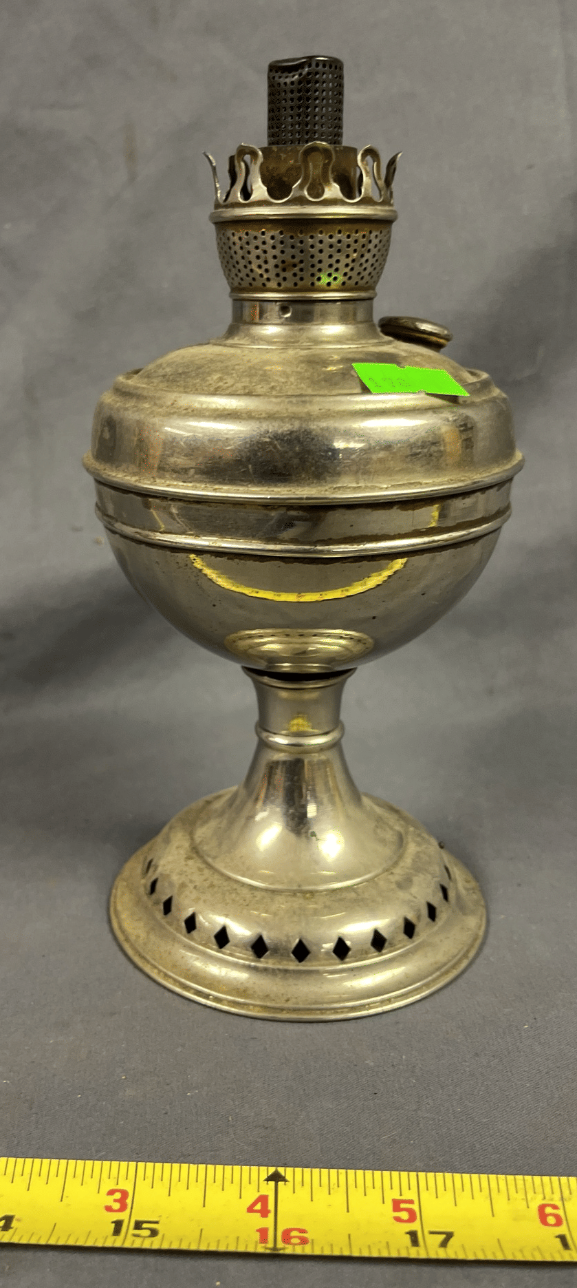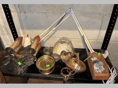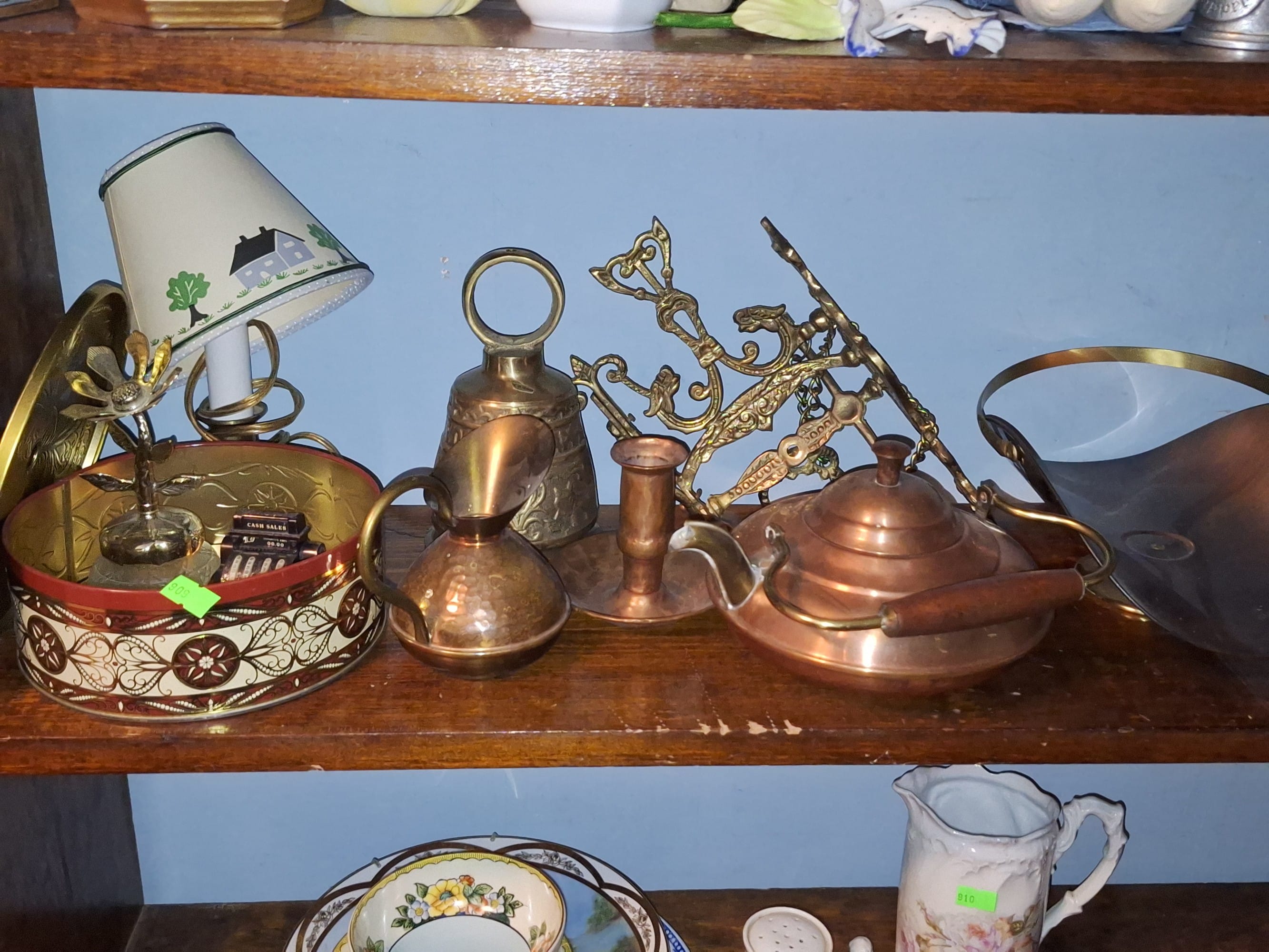 912 Candle lamp, chimneys, Delft dish, figurine, pottery cream and sugar, brass candle snuffer and bell