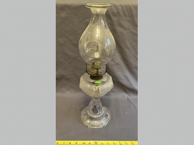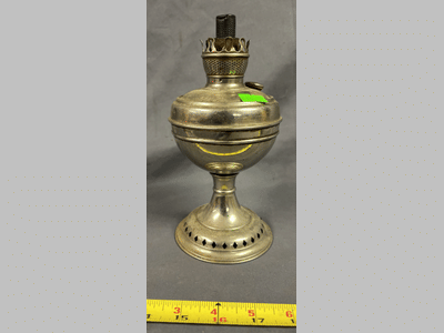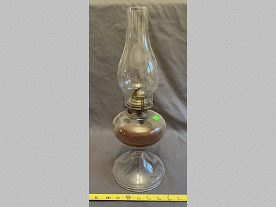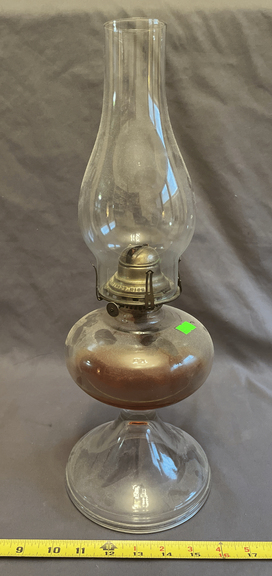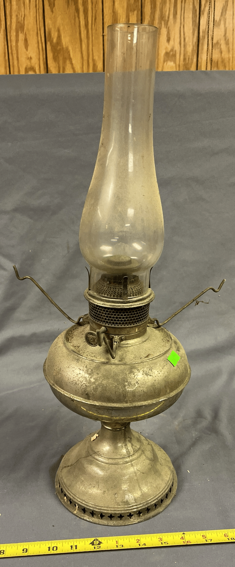 912 Candle lamp, chimneys, Delft dish, figurine, pottery cream and sugar, brass candle snuffer and bell