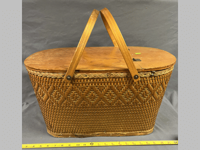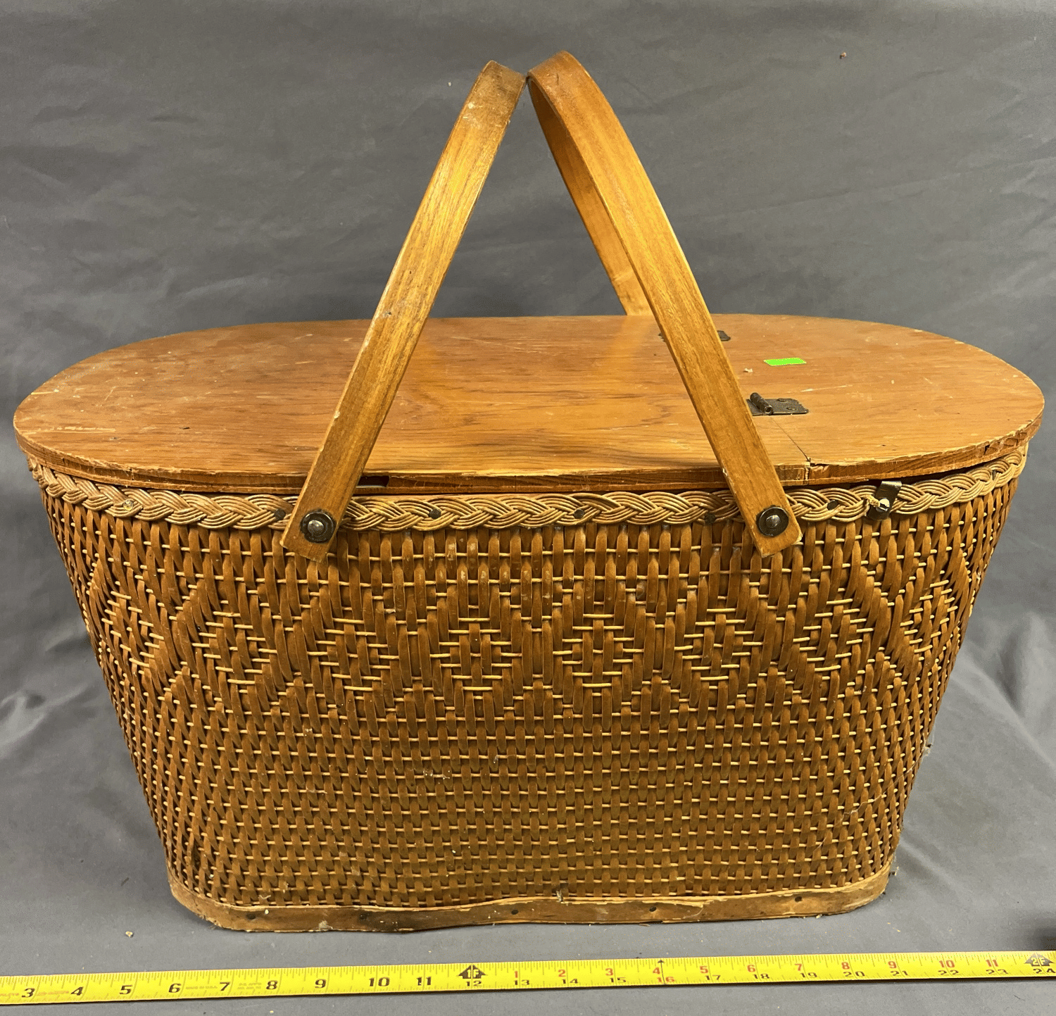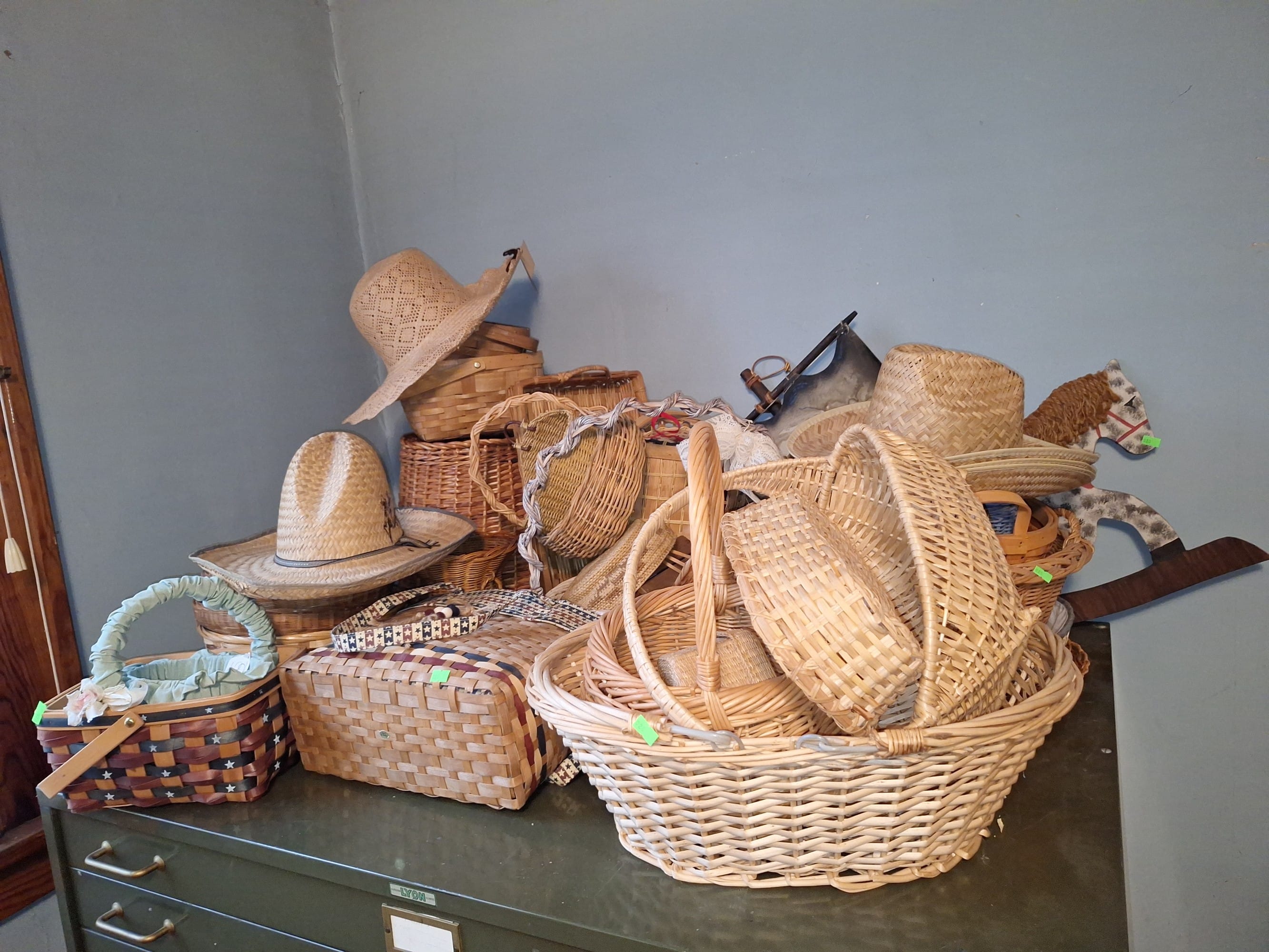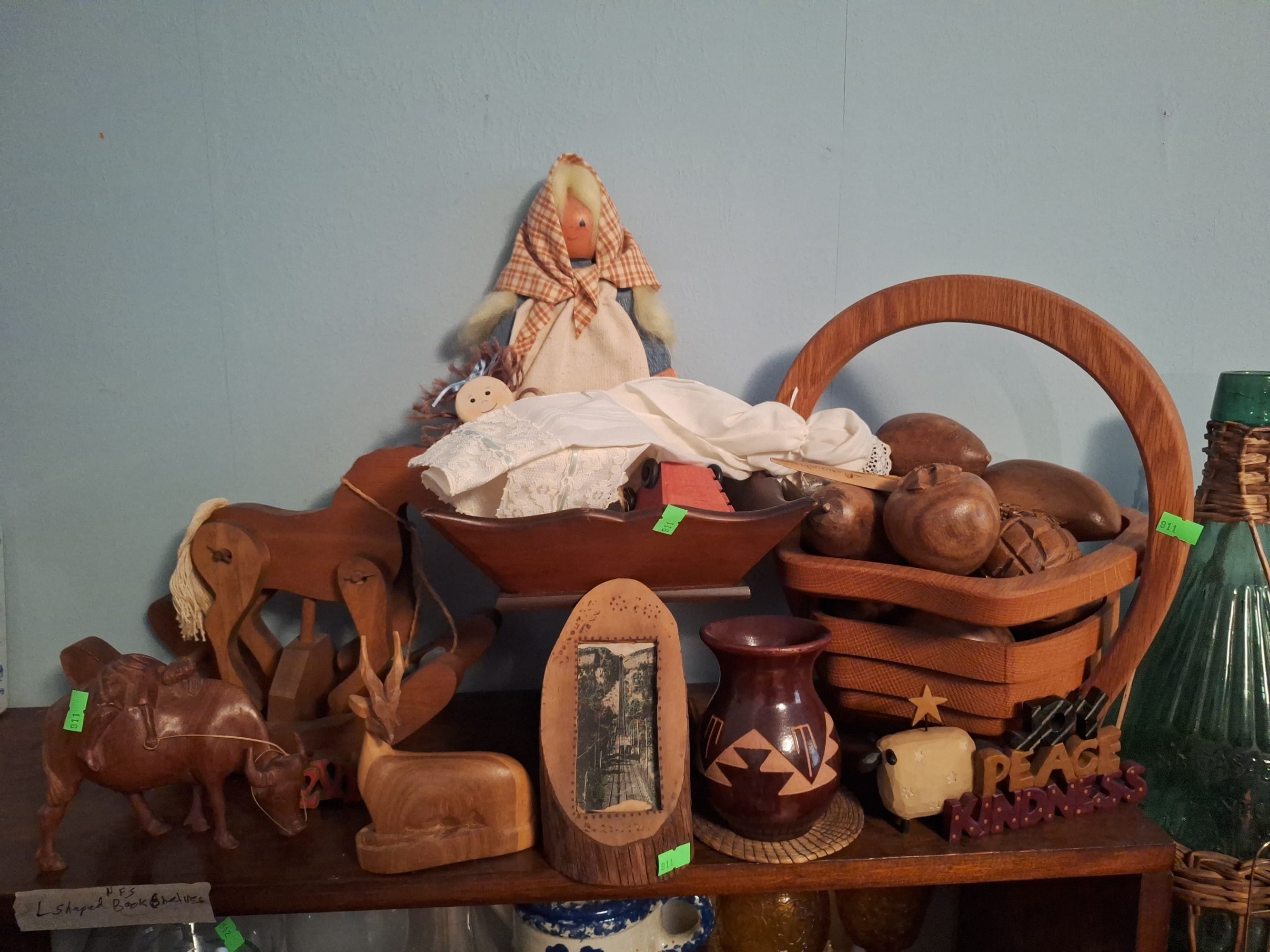 911 Wood animals, baskets, pedestal bowl and picture frame, Sioux pottery vase