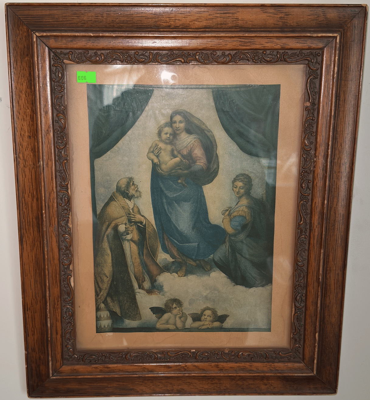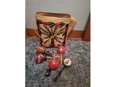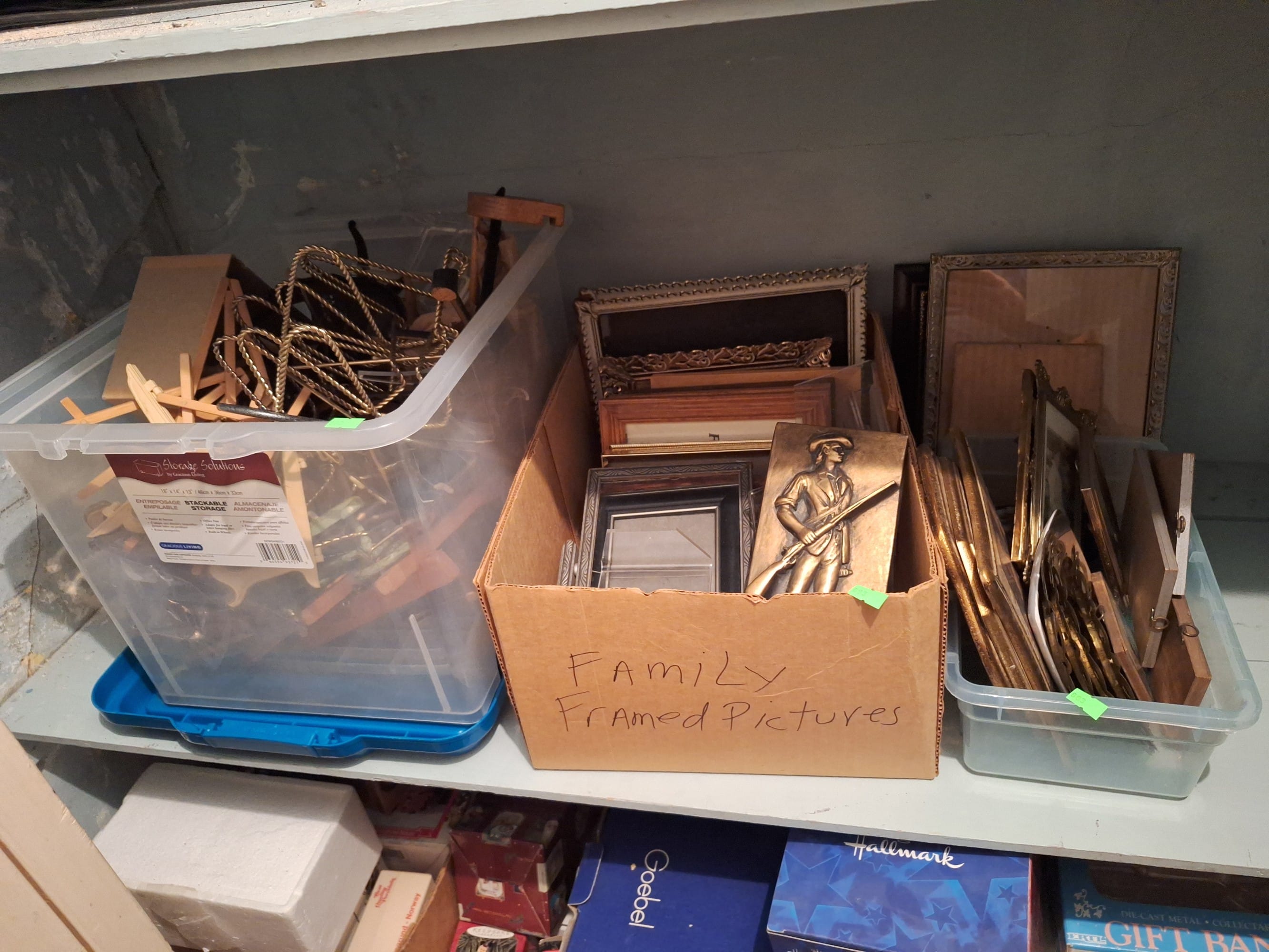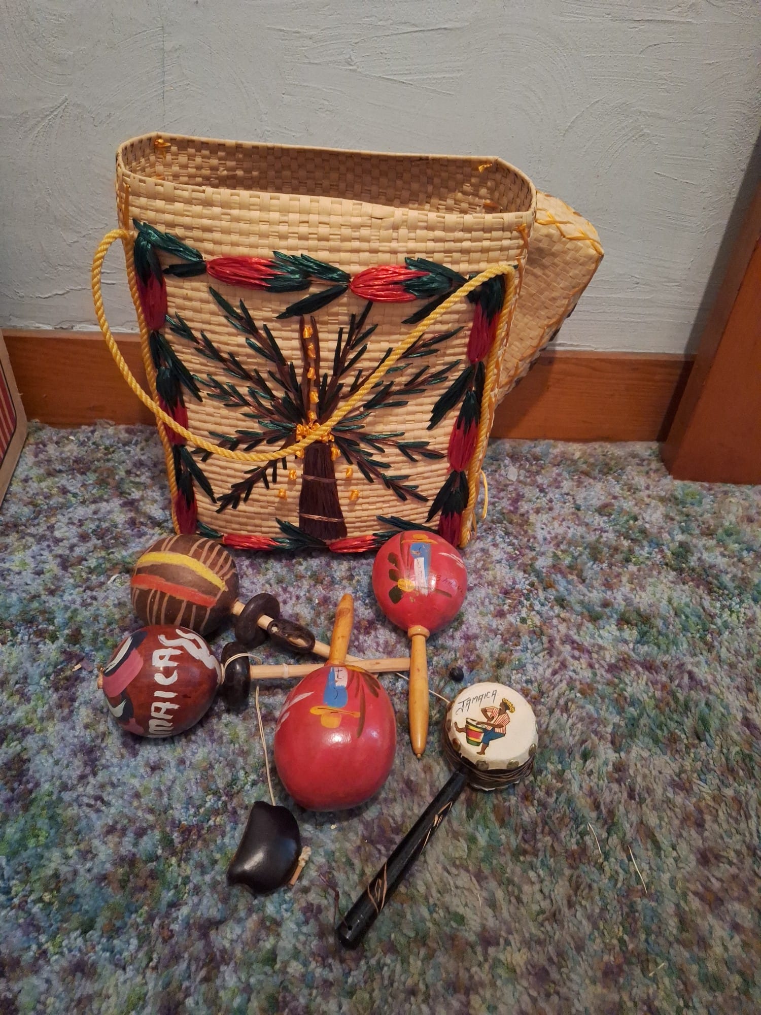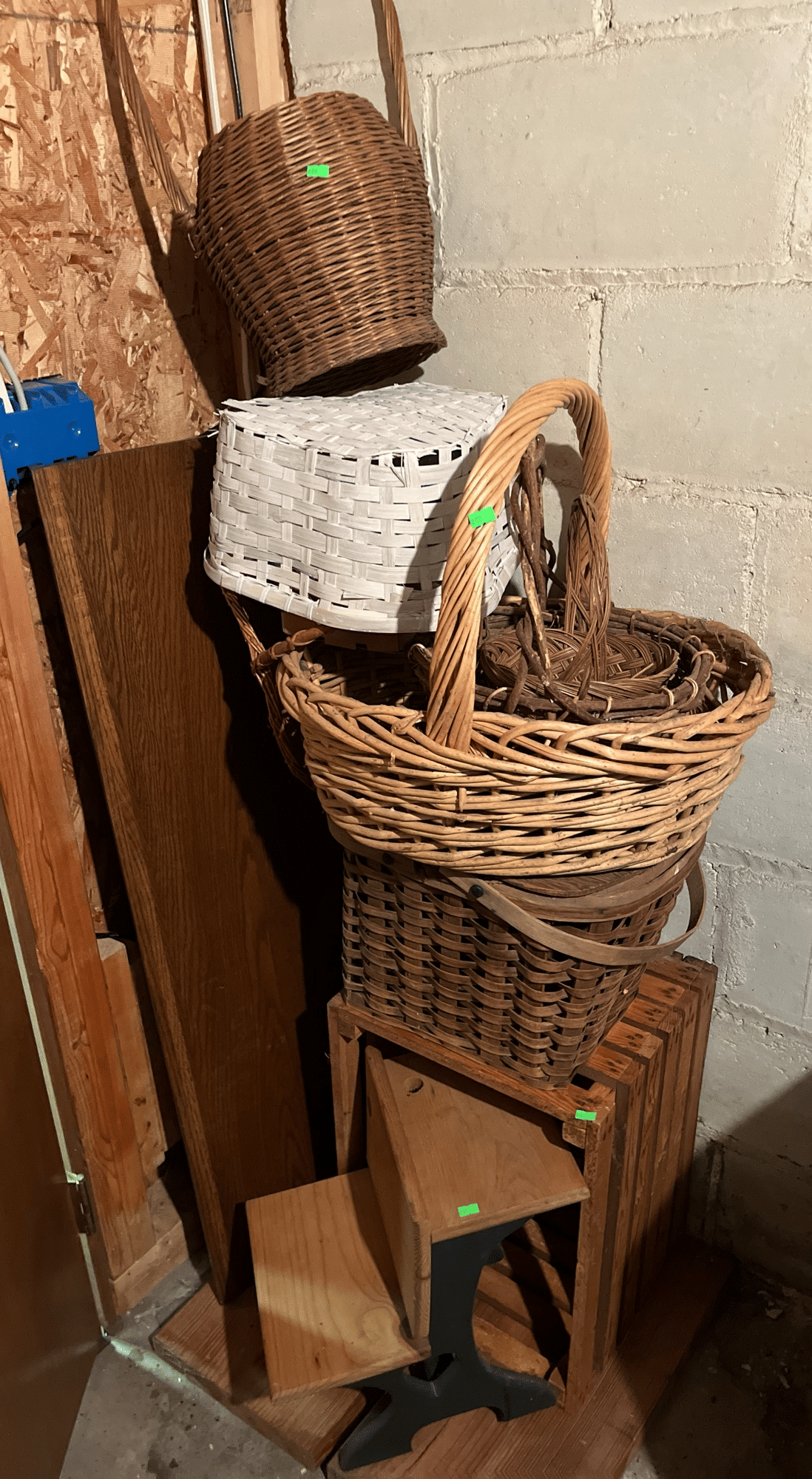 911 Wood animals, baskets, pedestal bowl and picture frame, Sioux pottery vase